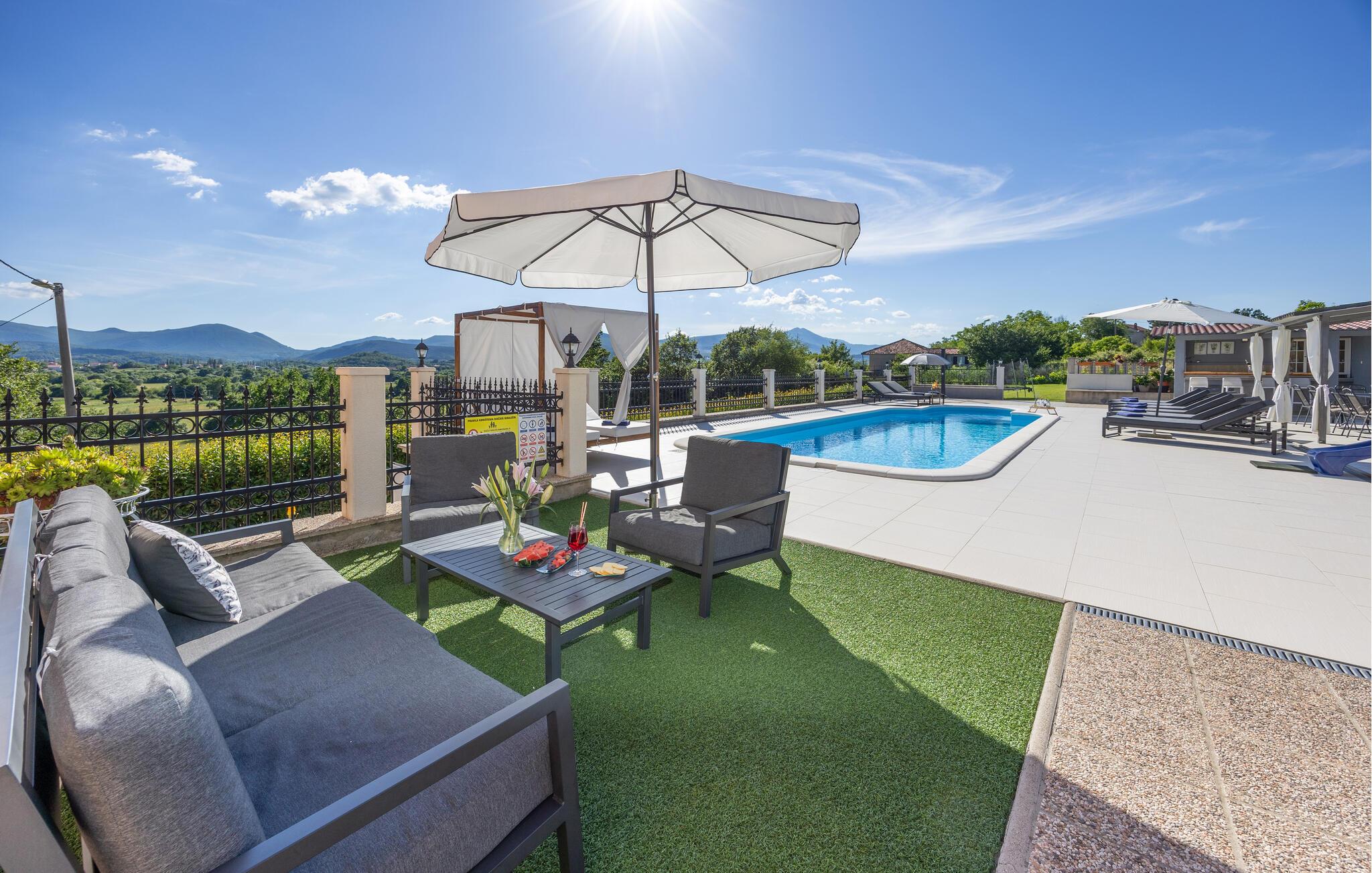 På en lille bakke med udsigt over floden Cetina og Sinjs marker, ligger dette feriehus med privat pool. Svøm en forfriskende tur i poolen og sid bagefter i whirlpoolen og nyd massagen af tusinder af bobler og tør bagefter i solen, liggende på en behagelig stol. Der er også legeredskaber til familiens små. I omgivelserne er der et stort udvalg af cykel- og vandrestier og mulighed for både at fiske og sejle i kajak. Besøg den lille by Sinj, kendt for sine autentiske ridderspil på hesteryg - Sinjska Alka og den verdensberømte by Split, med sine utallige former for kulturelle og historiske seværdigheder og mange traditionsrige restauranter.
