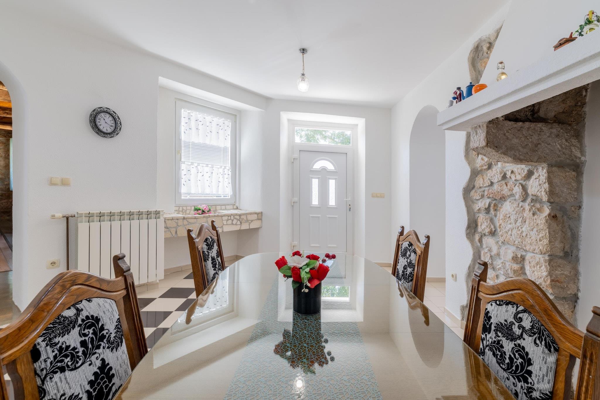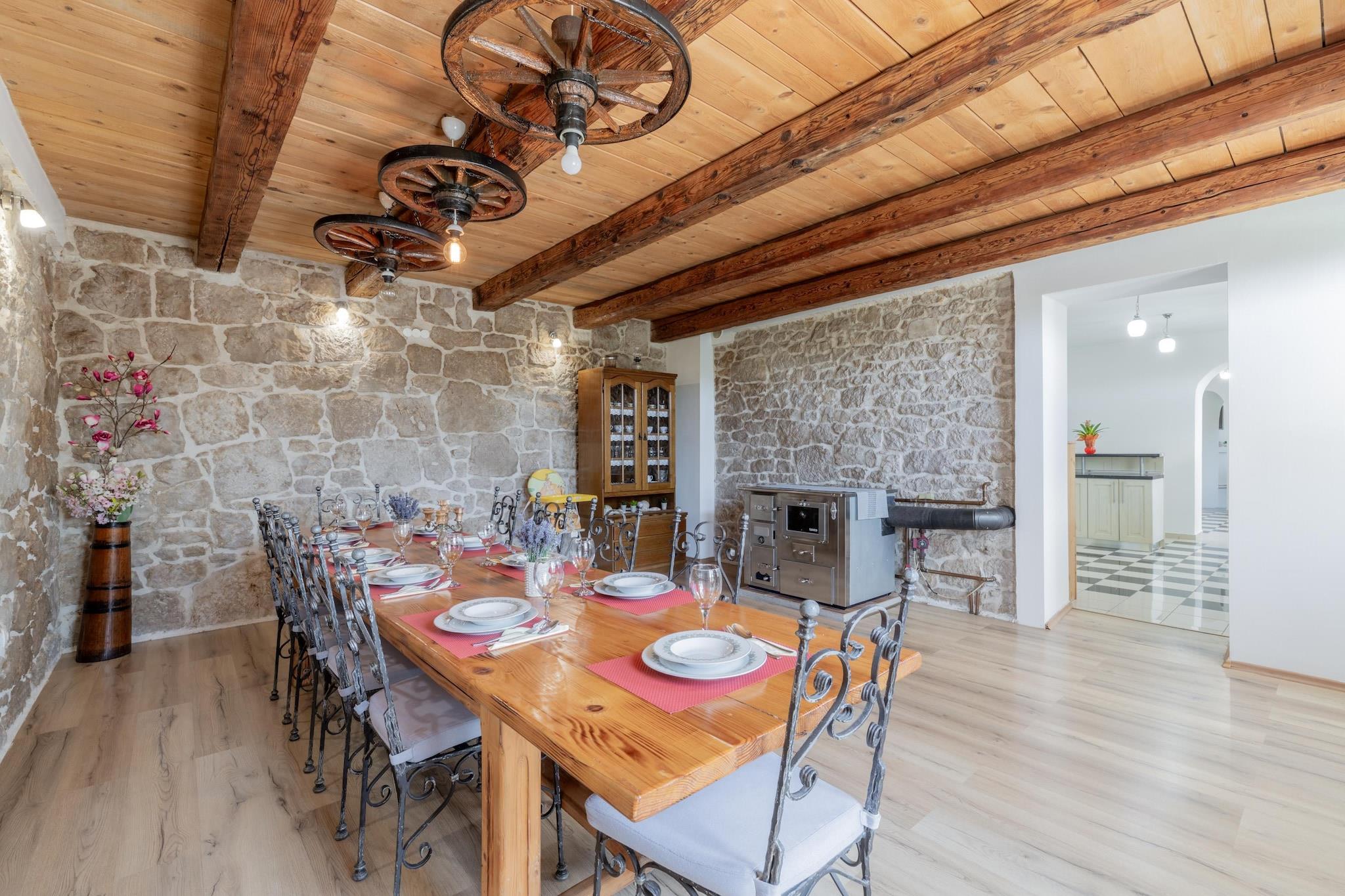 Gemt blandt vinmarker og gamle olivenlunde i Vinjani Donji, kun få minutter fra Imotskis sjæl, er Villa Lavandis den slags sted, hvor tiden slipper sit greb. Bygget i 1911 og restaureret med stille elegance, blander denne stenvilla med fem soveværelser til op til ti gæster historiske teksturer med moderne komfort på en måde, der føles ubesværet, ikke iscenesat. Indenfor er rytmen rolig og generøs. Fem luftige dobbeltværelser og fire fuldt udstyrede badeværelser er fordelt på to etager, så alle finder deres eget hjørne af fred. Den åbne opholdsstue med pejs, tv og Wi-Fi er afbalanceret af et fuldt udstyret køkken skabt til fælles måltider, lange morgenmader og uplanlagte middagsplaner. Udenfor åbner villaen sig ud til en indhegnet have duftende af lavendel og middelhavsurter. Den 50 m² store private pool sætter tonen for afslappede dage, indrammet af liggestole, skyggefulde terrasser og en traditionel stengrill til sene frokoster, der bliver til solnedgangsmiddage. Gruppen kan vælge mellem bordtennis, cykelstier og skyggefulde vinpauser. Det lokale liv forbliver tæt på, da der er en restaurant i gåafstand, markeder kun en kort køretur væk, og de legendariske blå og røde søer i Imotski ligger få minutter fra din dør. Makarska-kysten venter længere fremme, tæt nok på til en dag ved havet, langt nok væk til at holde dine aftener rolige. På Villa Lavandis presser luksus dig ikke. Den bringer dig ind i naturen, i fælles tid og i en blødere form for ferie, der varer ved længe efter, du er taget afsted.