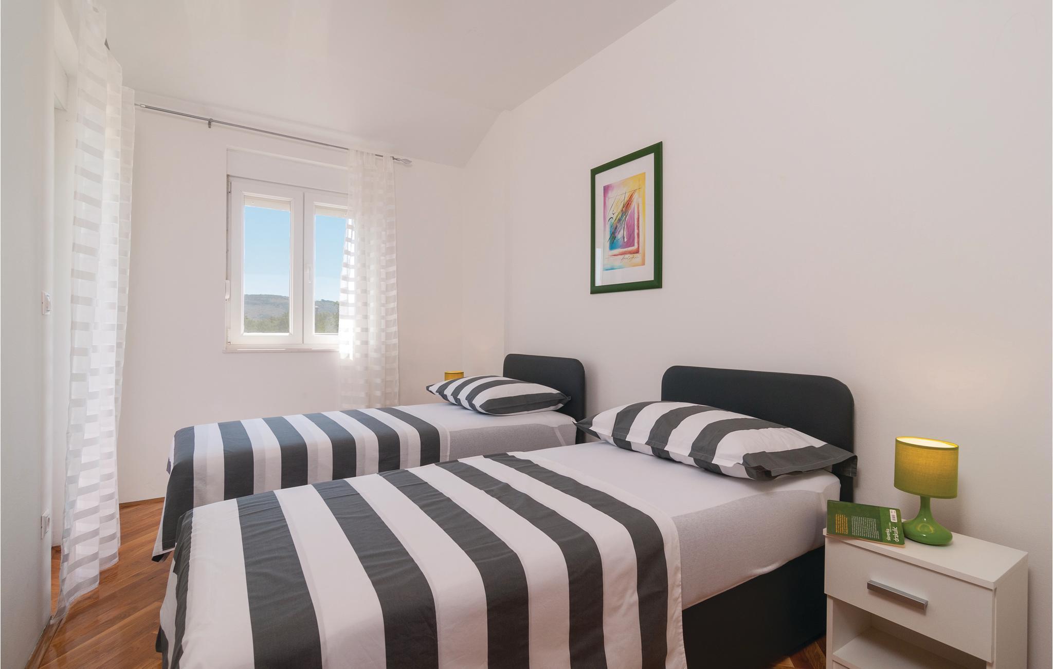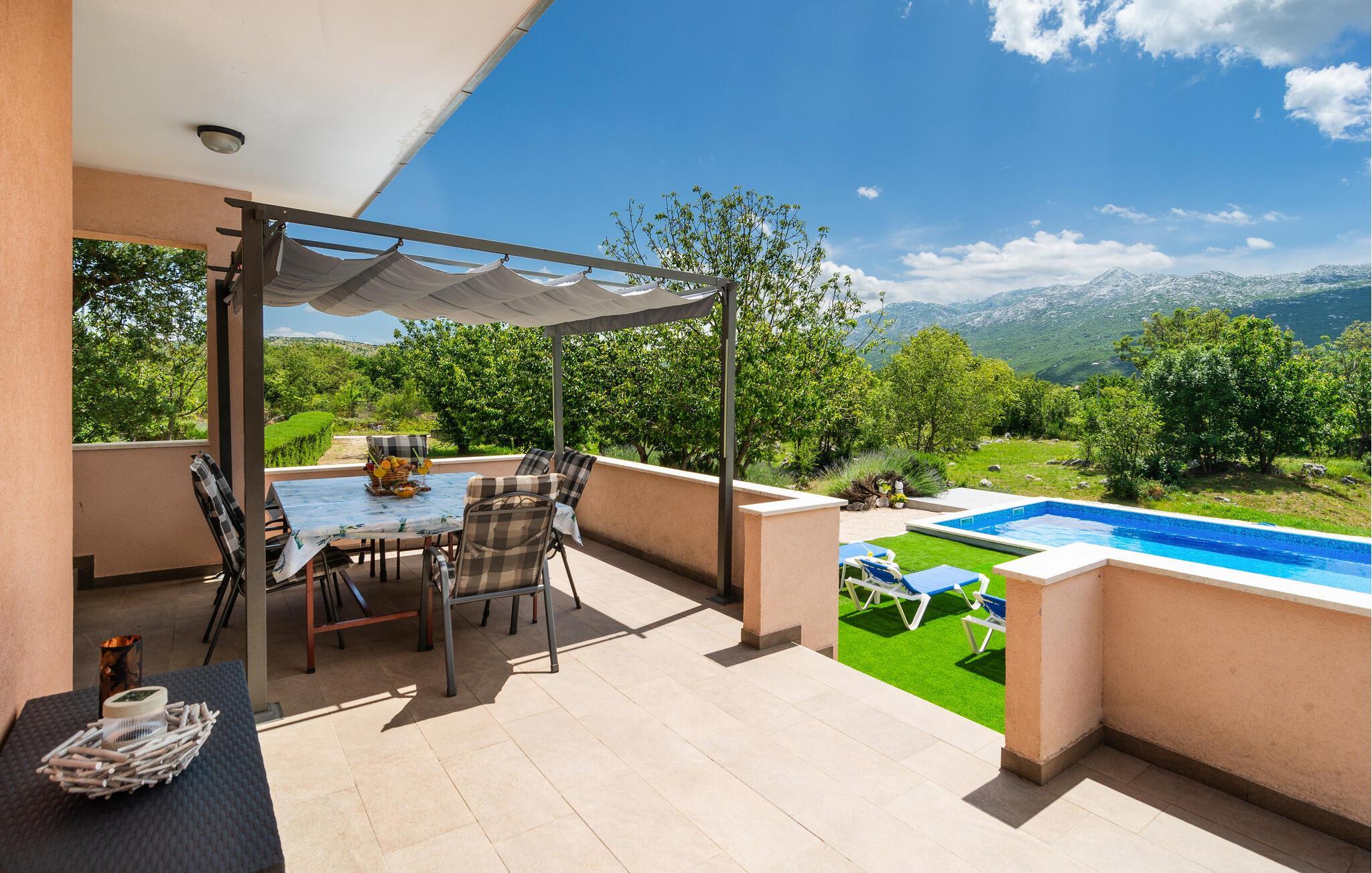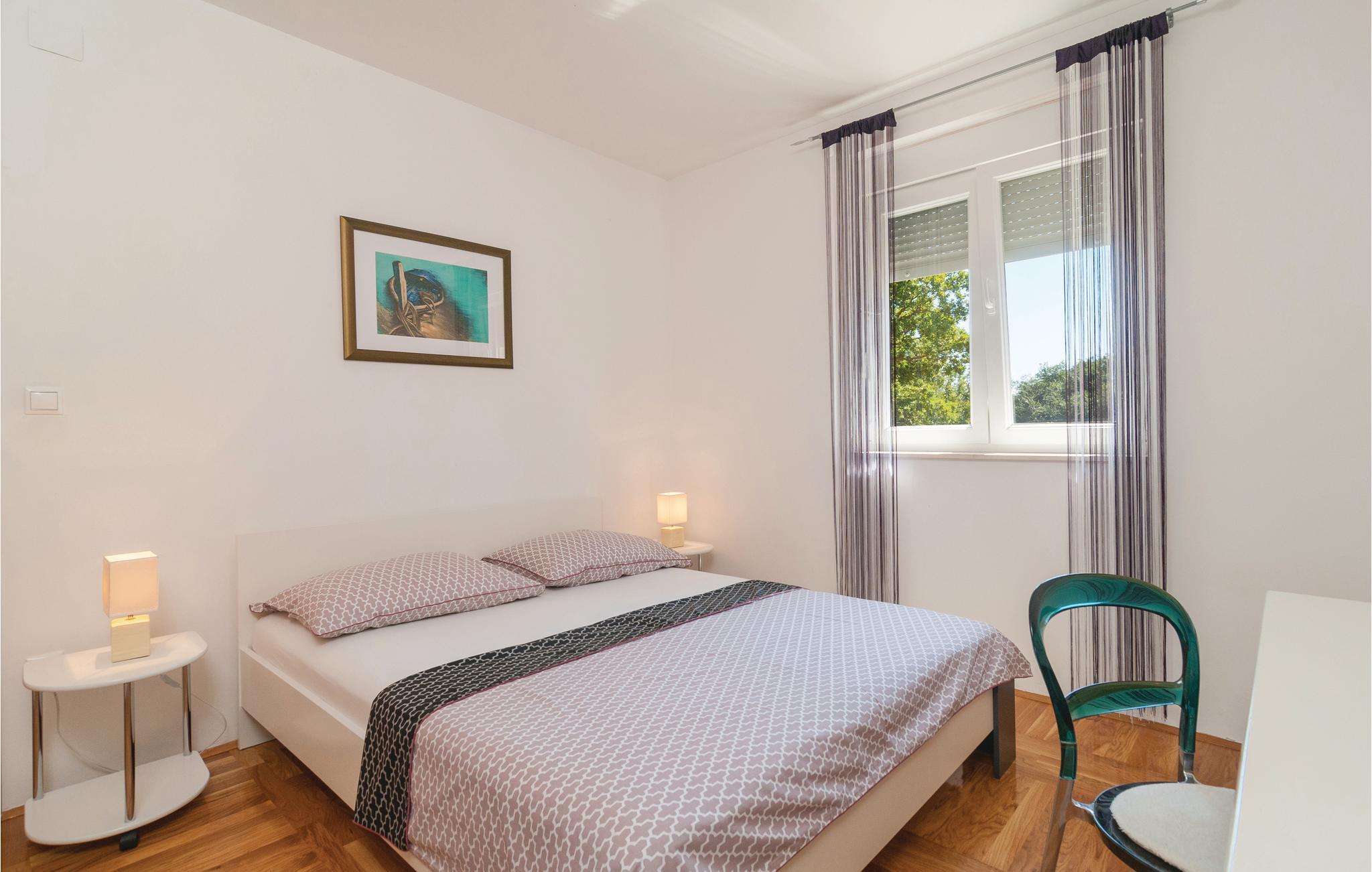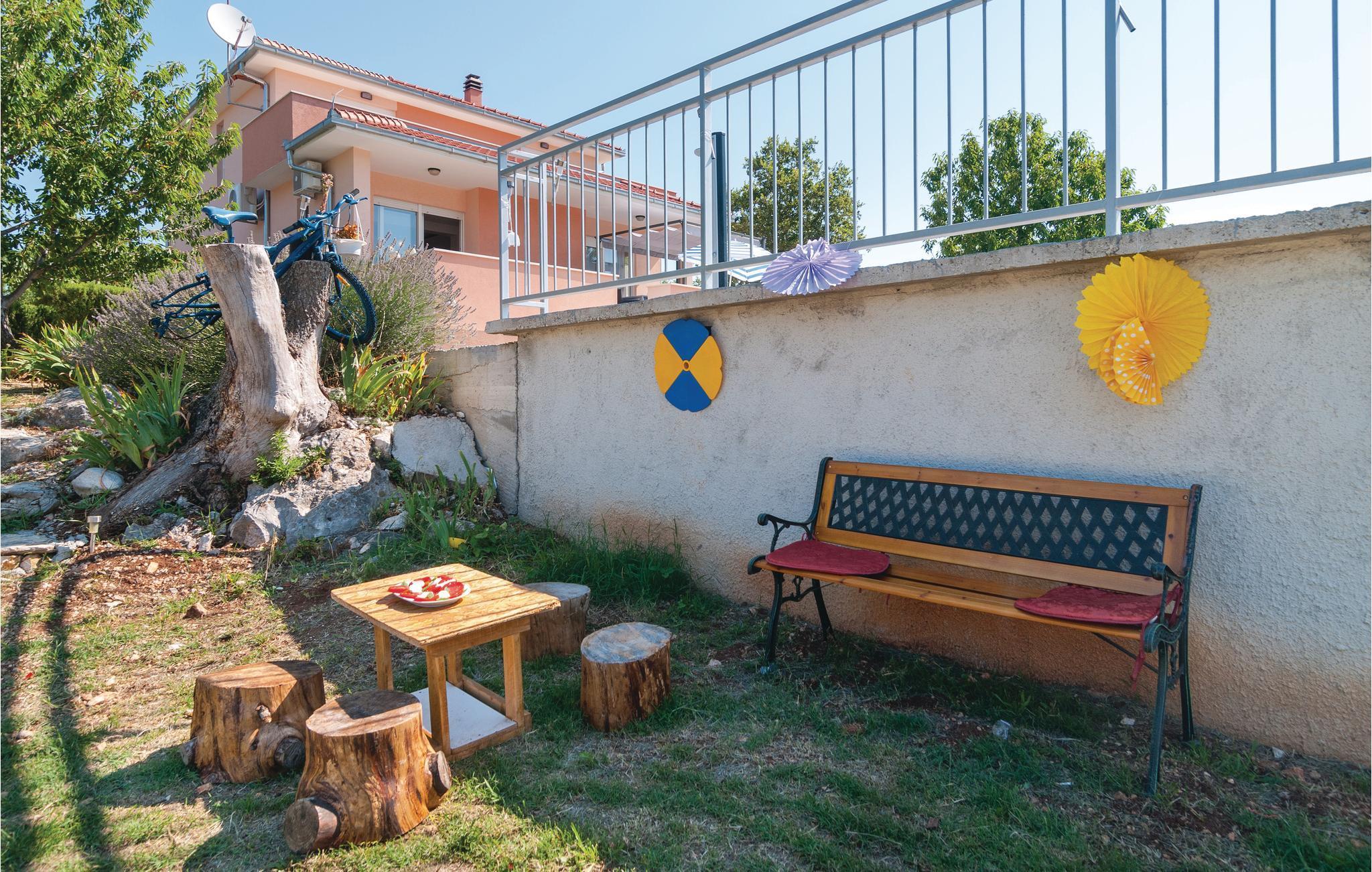 Dette komfortable feriehus ligger i en lille by, perfekt til ferie for en familie eller for flere par. På den store terrasse og i haven kan I slappe af og plukke frugt fra træerne, så meget I har lyst. Lige ved siden af huset står grillen i dejlig skygge, her kan I lave lækker og nem feriemad. Huset fordeler sig på to etager (indendørs trappe). Der er direkte adgang fra stuen til køkkenet ad få trin. Den skønne kiesstrand ligger ca. 18 km væk. Besøg den historiske by Split med talrige seværdigheder og mange arrangementer for store og små.