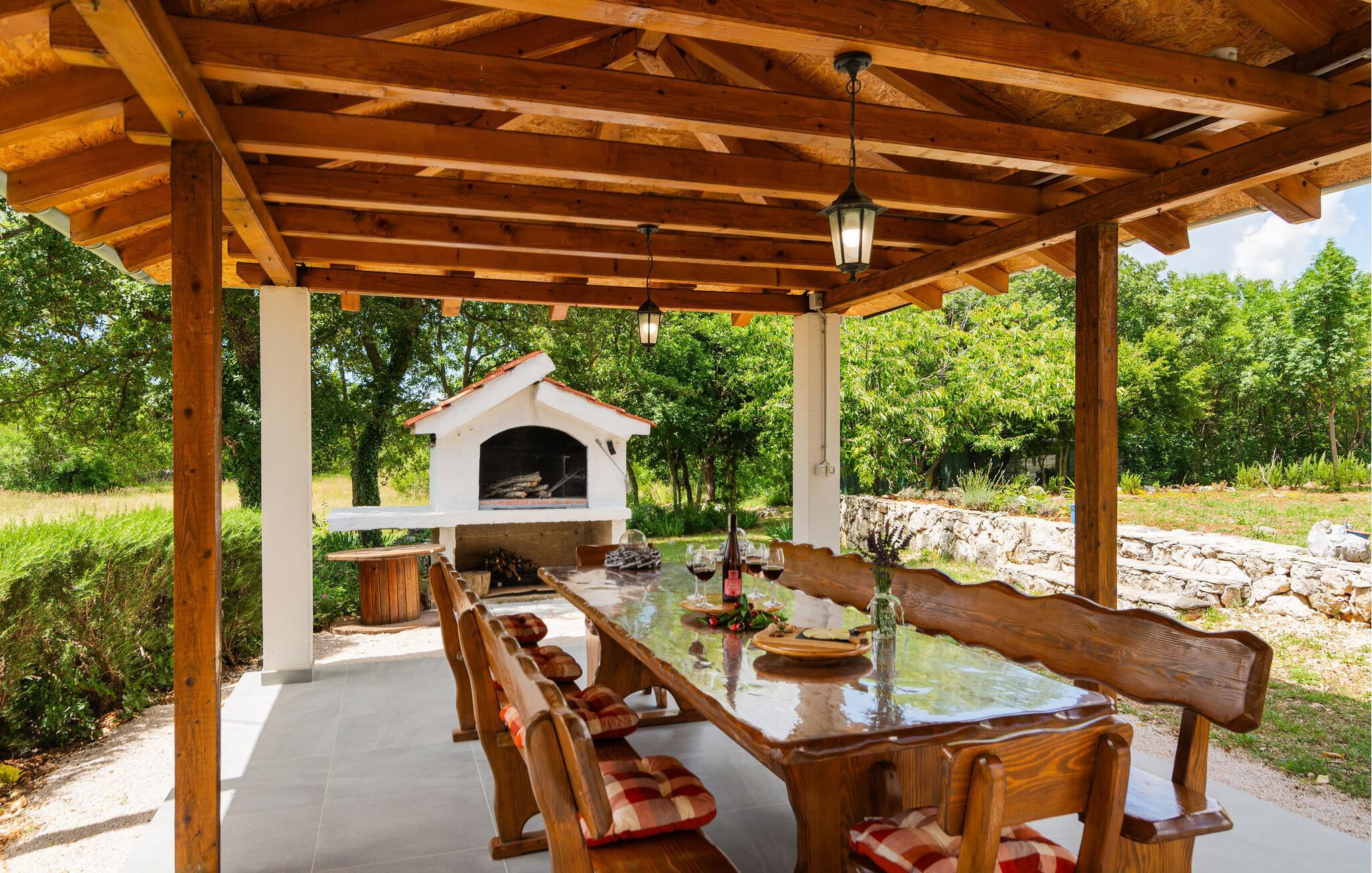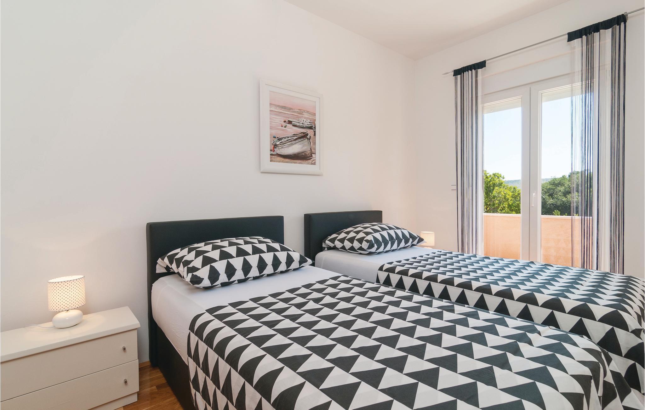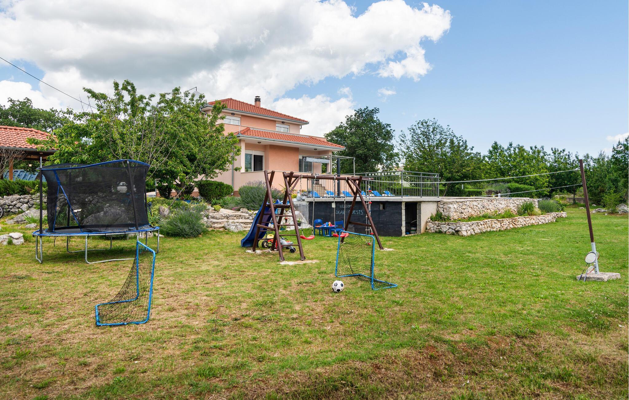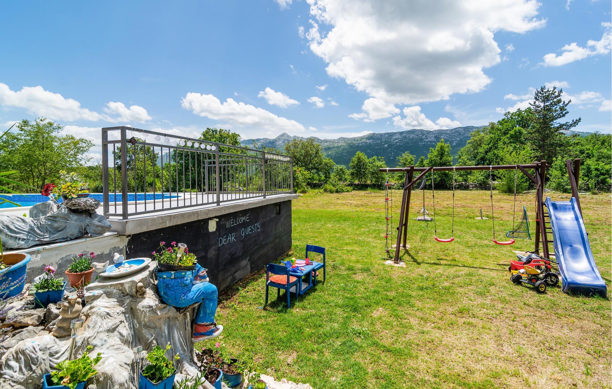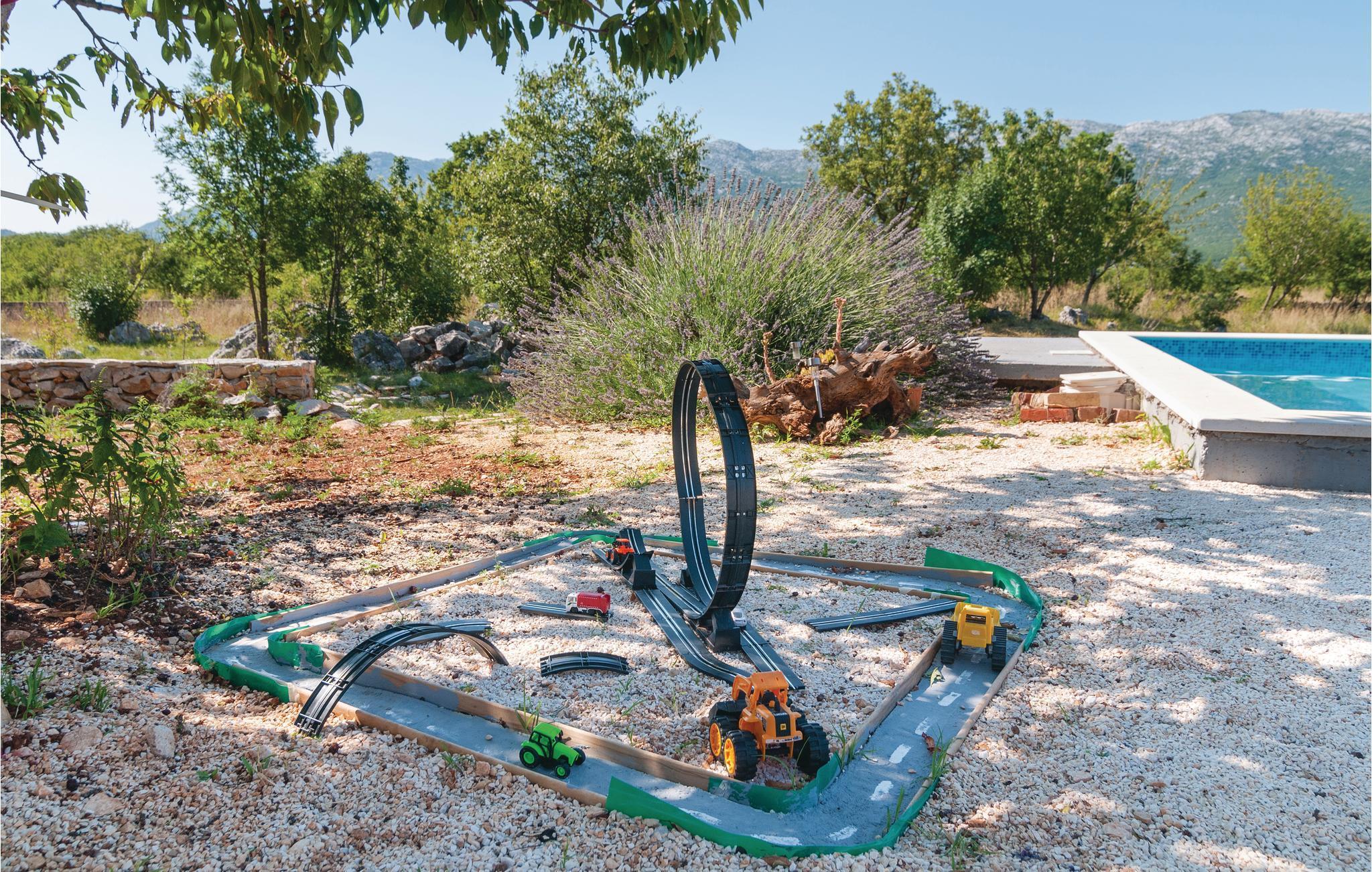 Dette komfortable feriehus ligger i en lille by, perfekt til ferie for en familie eller for flere par. På den store terrasse og i haven kan I slappe af og plukke frugt fra træerne, så meget I har lyst. Lige ved siden af huset står grillen i dejlig skygge, her kan I lave lækker og nem feriemad. Huset fordeler sig på to etager (indendørs trappe). Der er direkte adgang fra stuen til køkkenet ad få trin. Den skønne kiesstrand ligger ca. 18 km væk. Besøg den historiske by Split med talrige seværdigheder og mange arrangementer for store og små.
