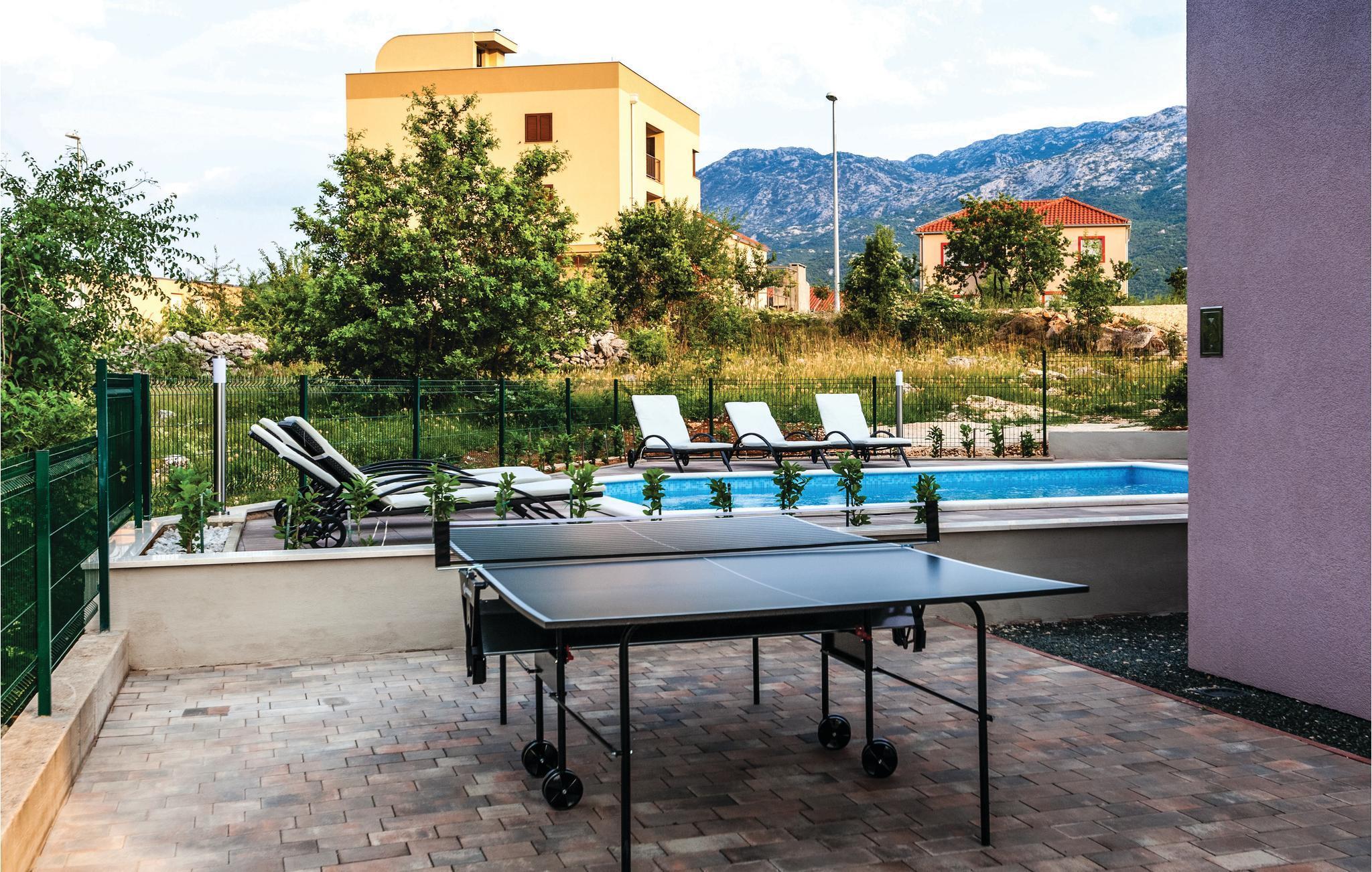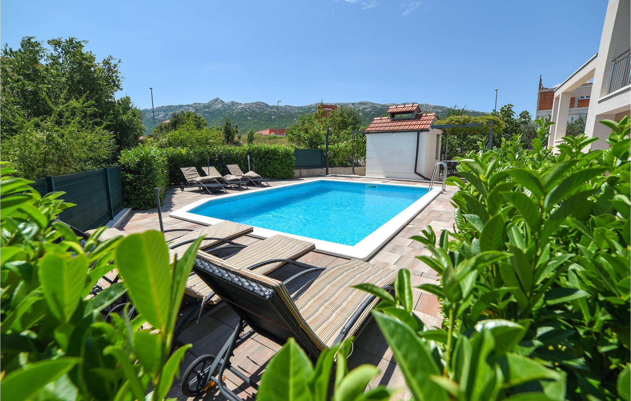 Hold ferie i dette rummelige og smukt indrettede feriehus. Til huset hører en stor terrasse og det ligger på en dejlig grund. Det er velegnet for både flere par eller for en familie med børn. Foran huset ligger poolen, der indbyder til svømmeture og vandsjov. Der er udendørs trappe til aktivitetsrumme. Vi kan anbefale jer at besøge konobaerne, små familiedrevne spisesteder, hvor der serveres regionale specialiteter. Besøg også den historiske by Split, hvor der er mange underholdningstilbud til alle generationer.