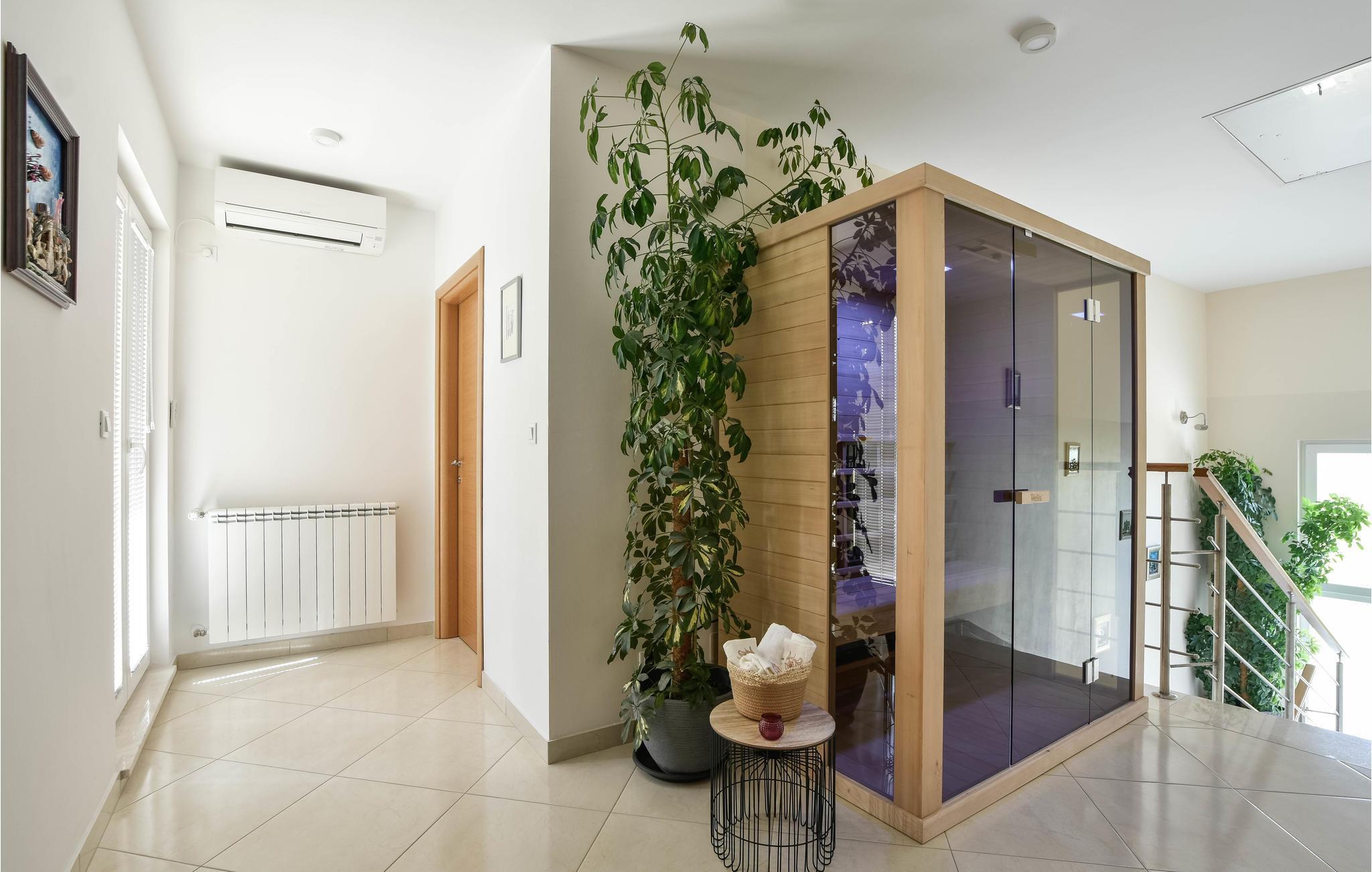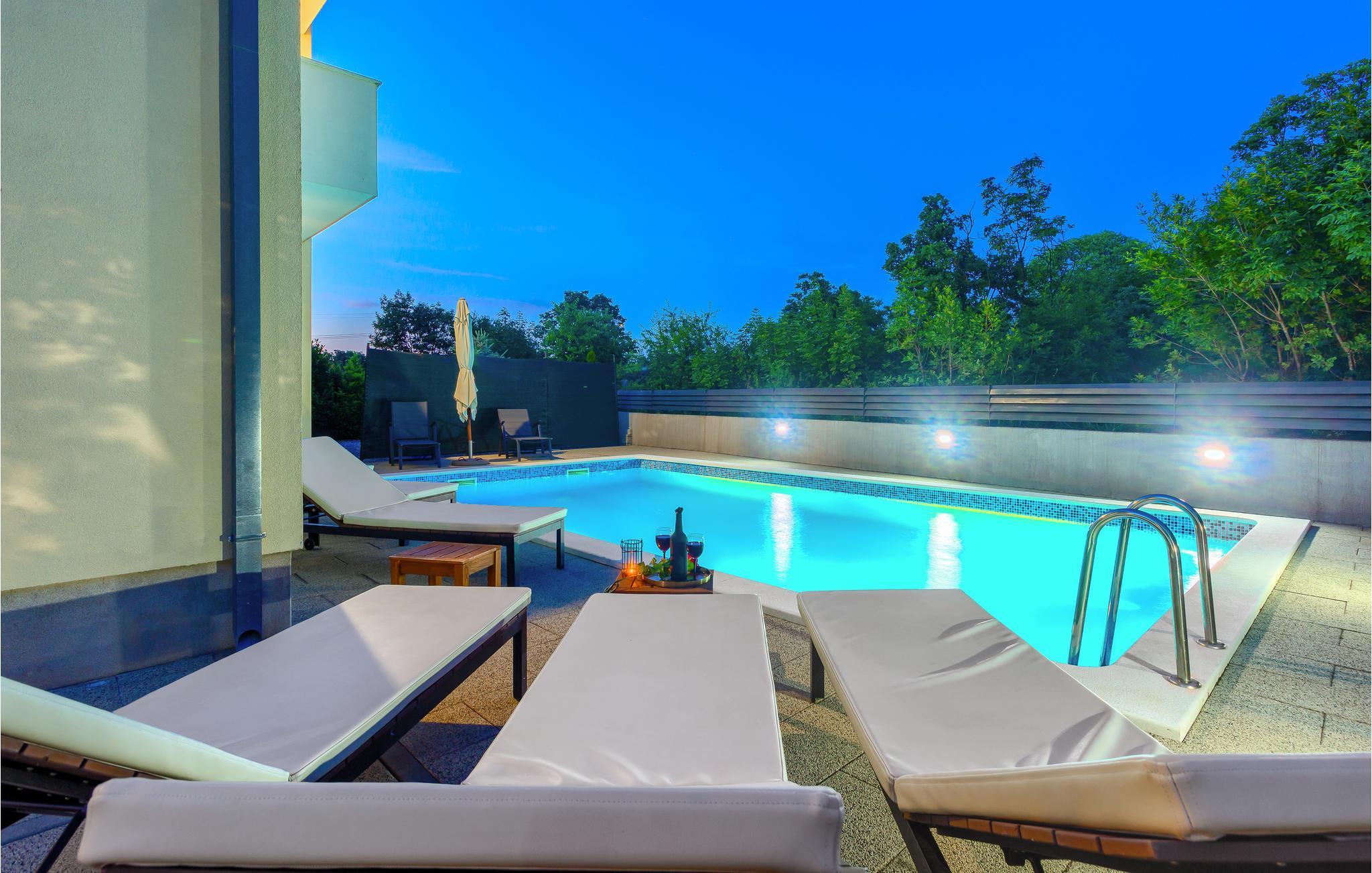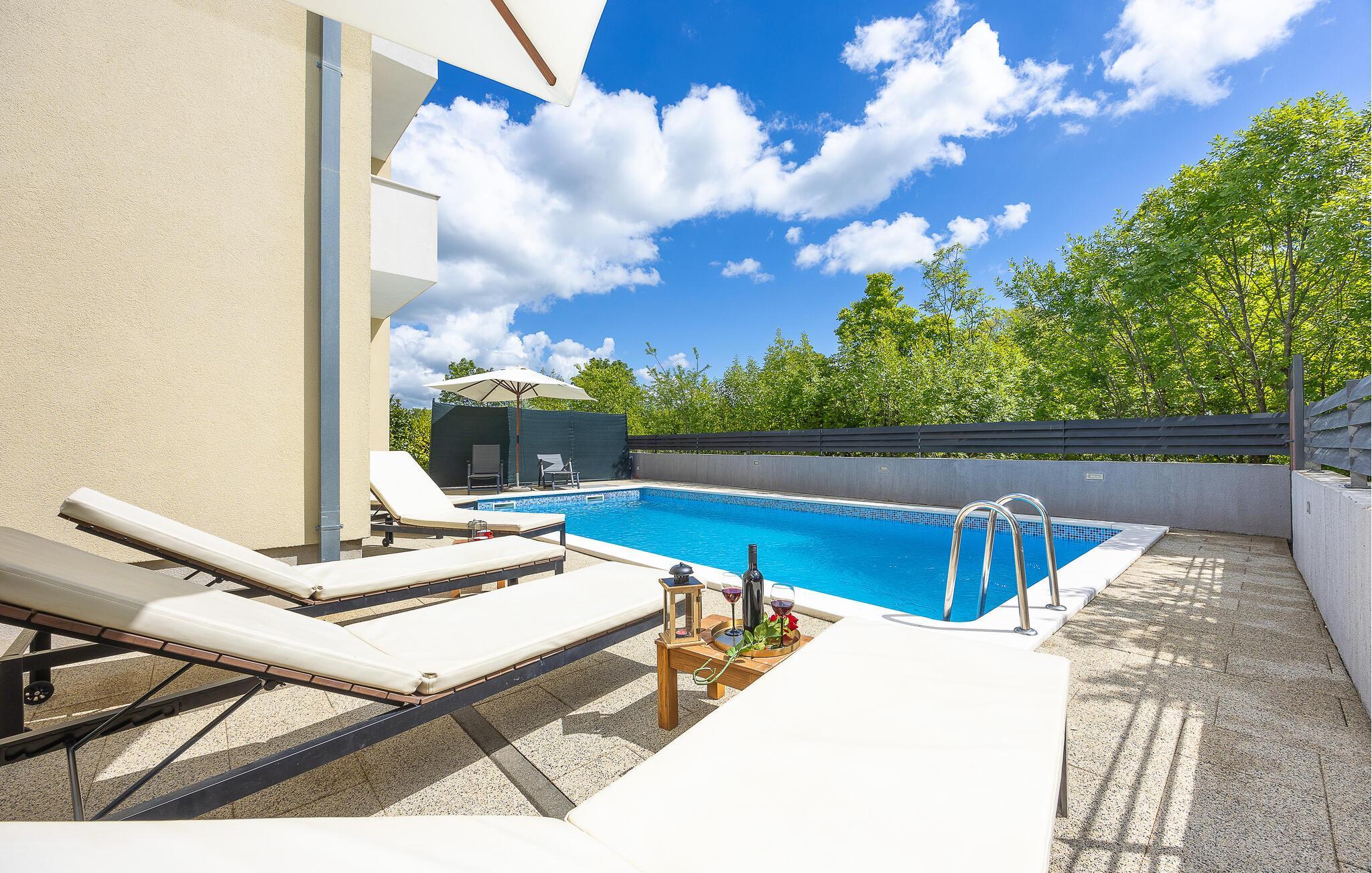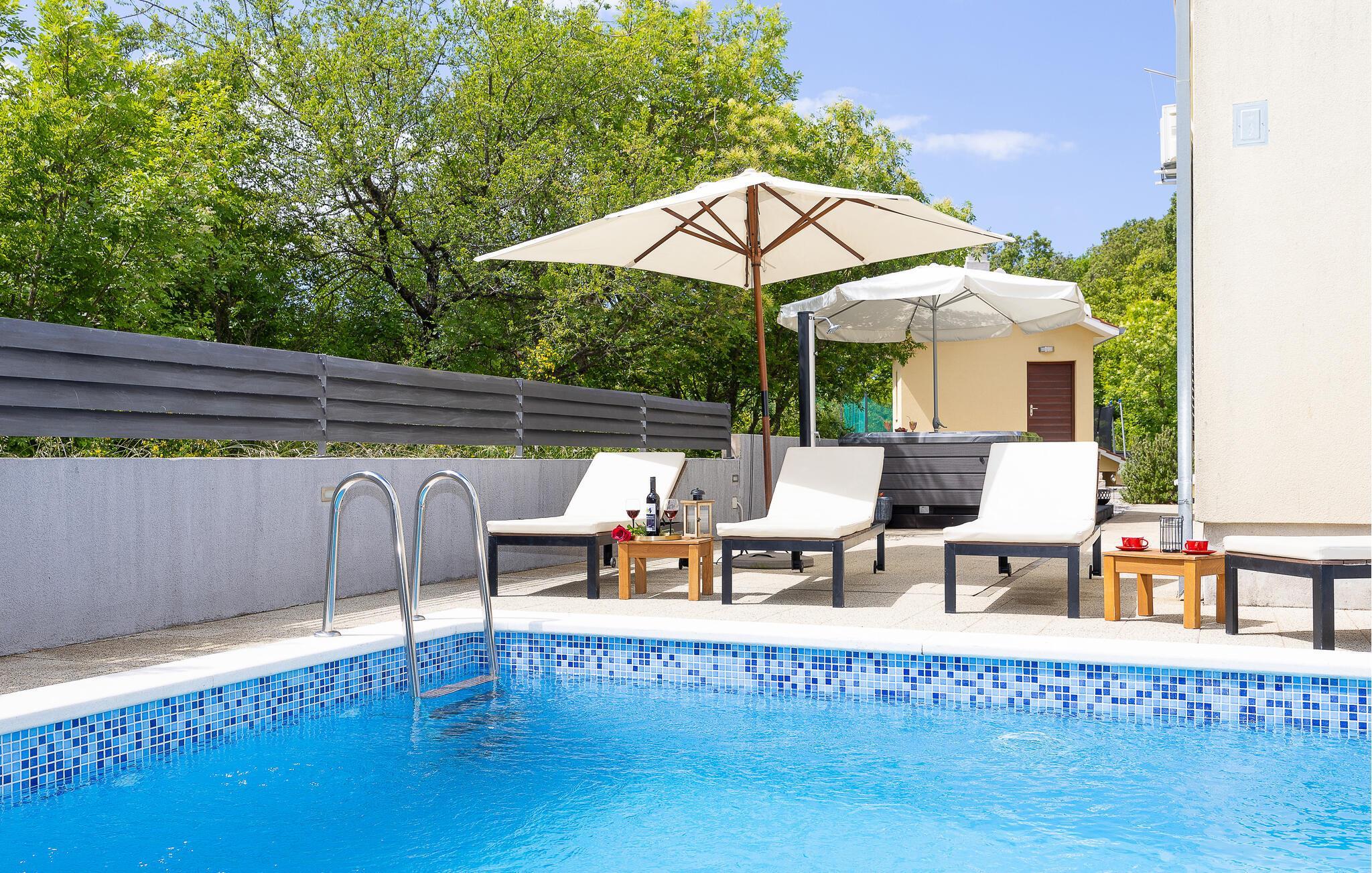 Hold en behagelig ferie i dette skønne og moderne indrettede feriehus. Huset strækker sig over to etager der er forbundet med en indre trappe. I stueplan ligger det veludstyrede køkken der er åbent mod køkkenet, et soveværelse, badeværelse og et fritidsrum, men der på øverste etage er tre soveværelser, det ene med badeværelse en suite, et aktivitetsrum og yderligere et badeværelse. Glæd jer til en privat pool, hvor I kan svømme lige når I har lyst, på de lange varme sommerdage. Prøv en svømmetur under stjernerne og fuldmånen – en ganske særlig oplevelse.