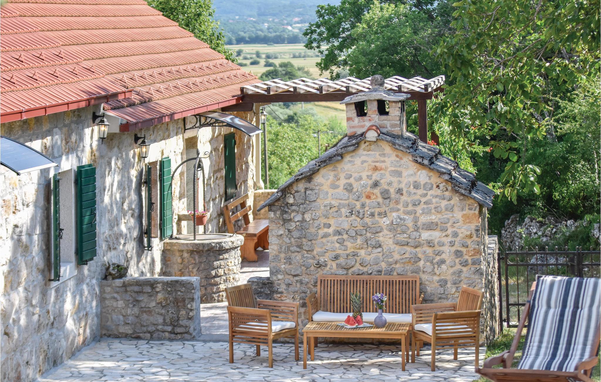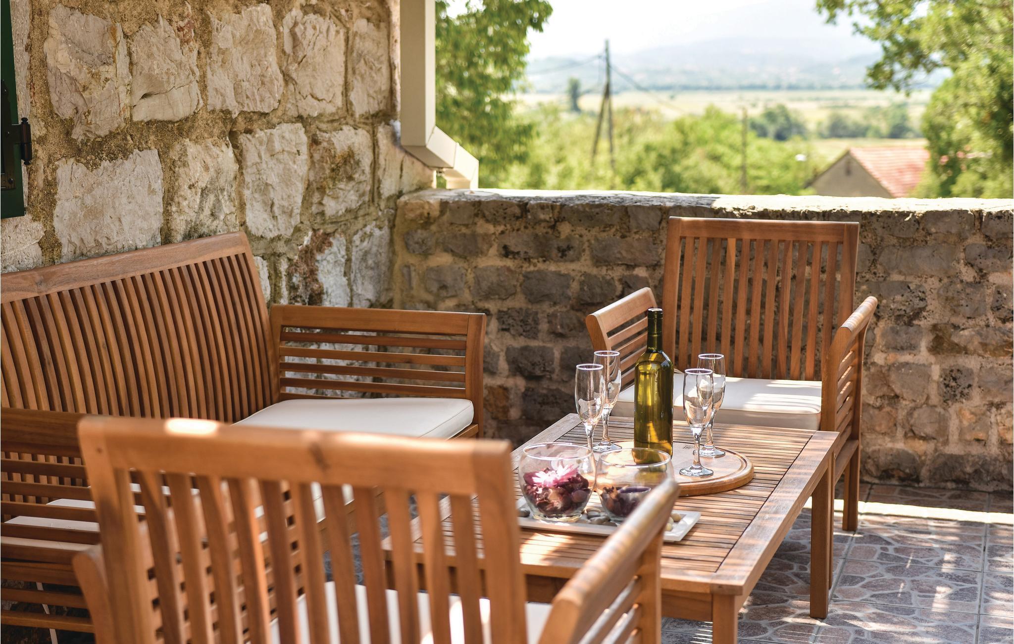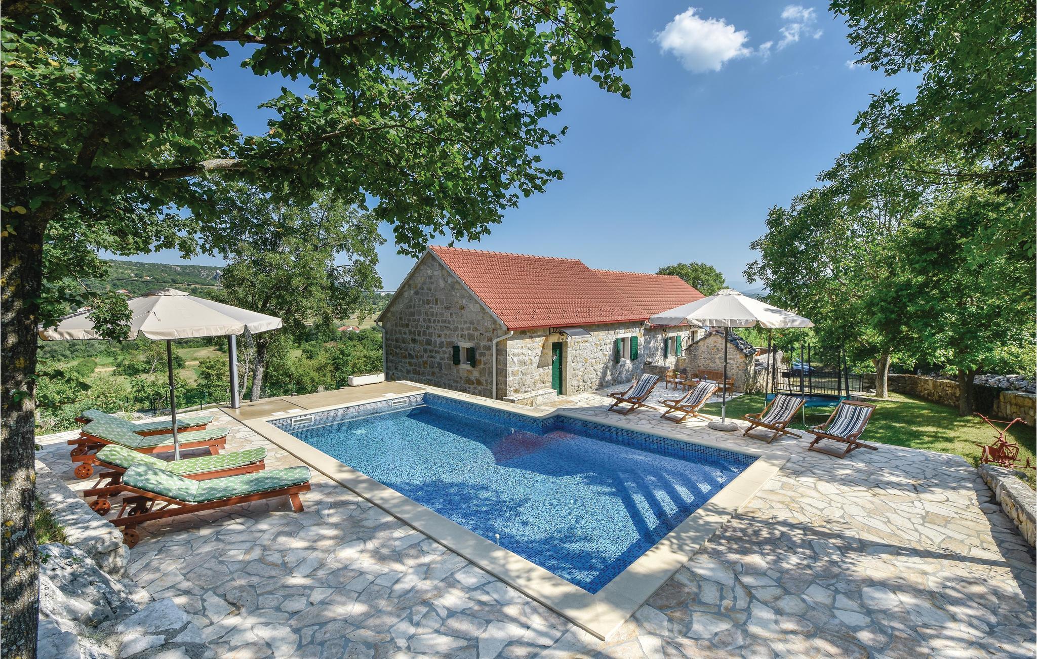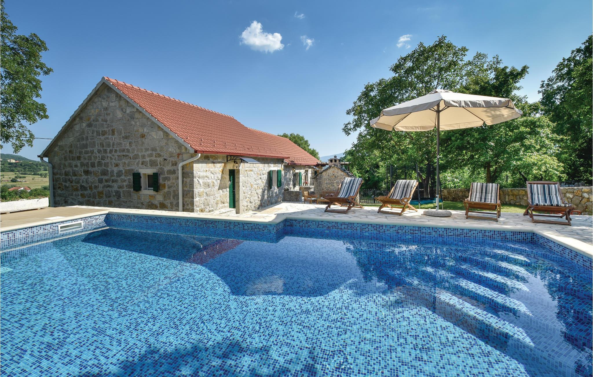 På en lille bakke med en utrolig udsigt over det blide landskab venter dette traditionelle feriehus af sten. Under renoveringen er der blevet taget hensyn til at bevare de traditionelle elementer, der sørger for en indbydende stemning. Feriehuset består af to særskilte lejligheder, der er forbundet over en terrasse, så huset er oplagt til en ferie med to familier. En taverneagtig stue i stueetagen samt udendørspoolen bag huset sørger for hyggelige timer under jeres ophold. I nærheden venter der rig afveksling som rafting ved floden Cetina, bad i Perucasøen med sandbredde, paragliding på bakken samt rideundervisning i rideklubben ved siden af. Der er kun omkring 40 km til havet, ligesom til den nærmeste kystby Split, der er udmærket af mange mindesmærker, der vidner om regionens rige historie.