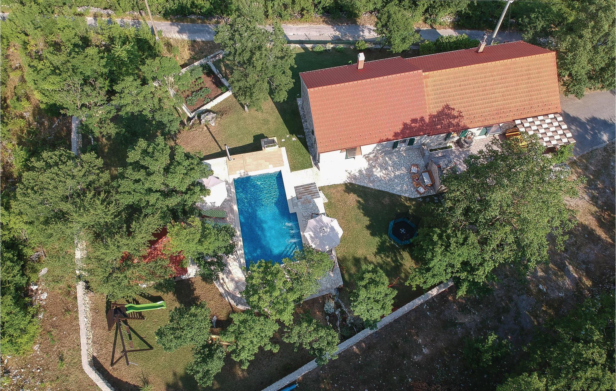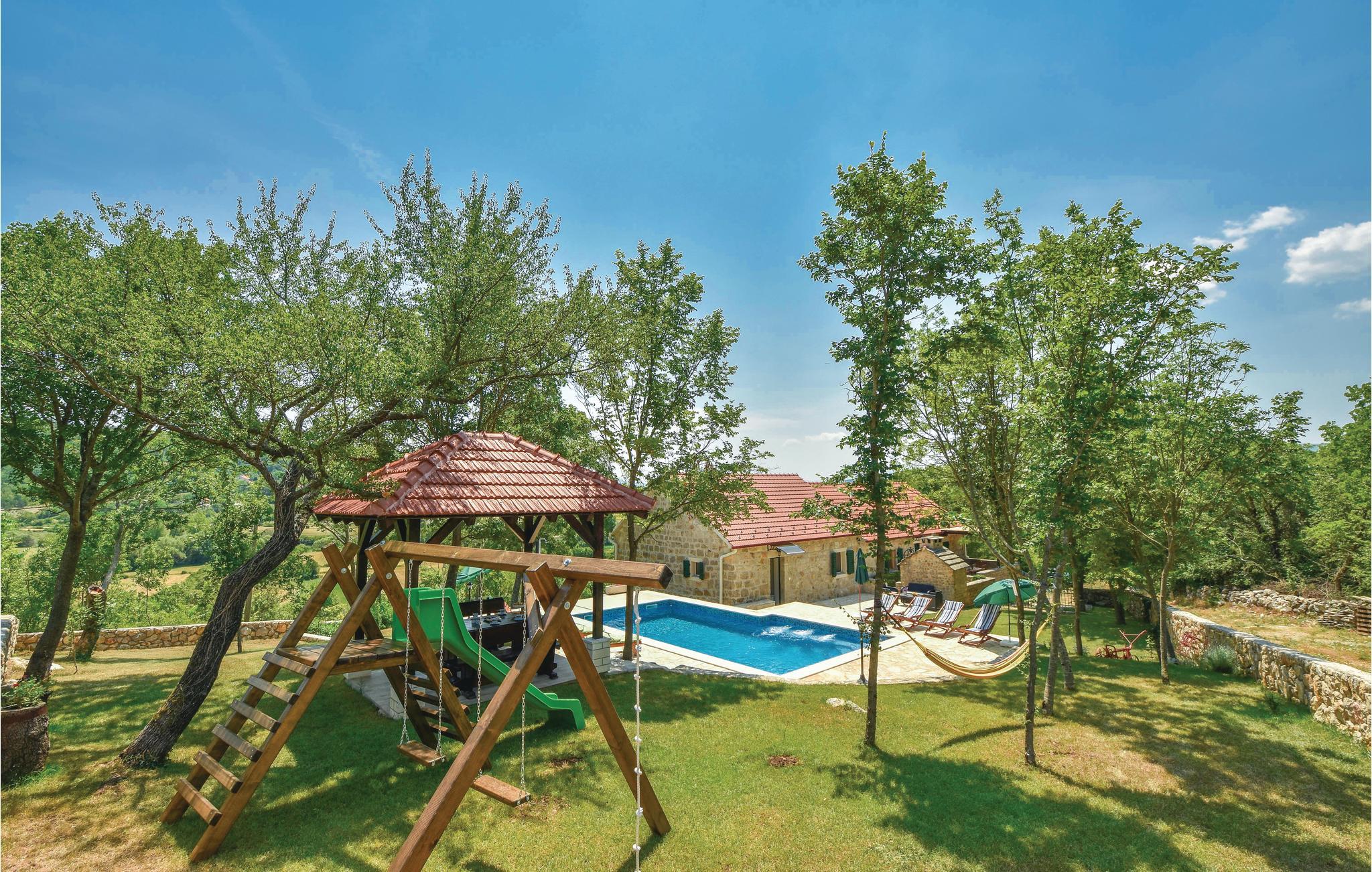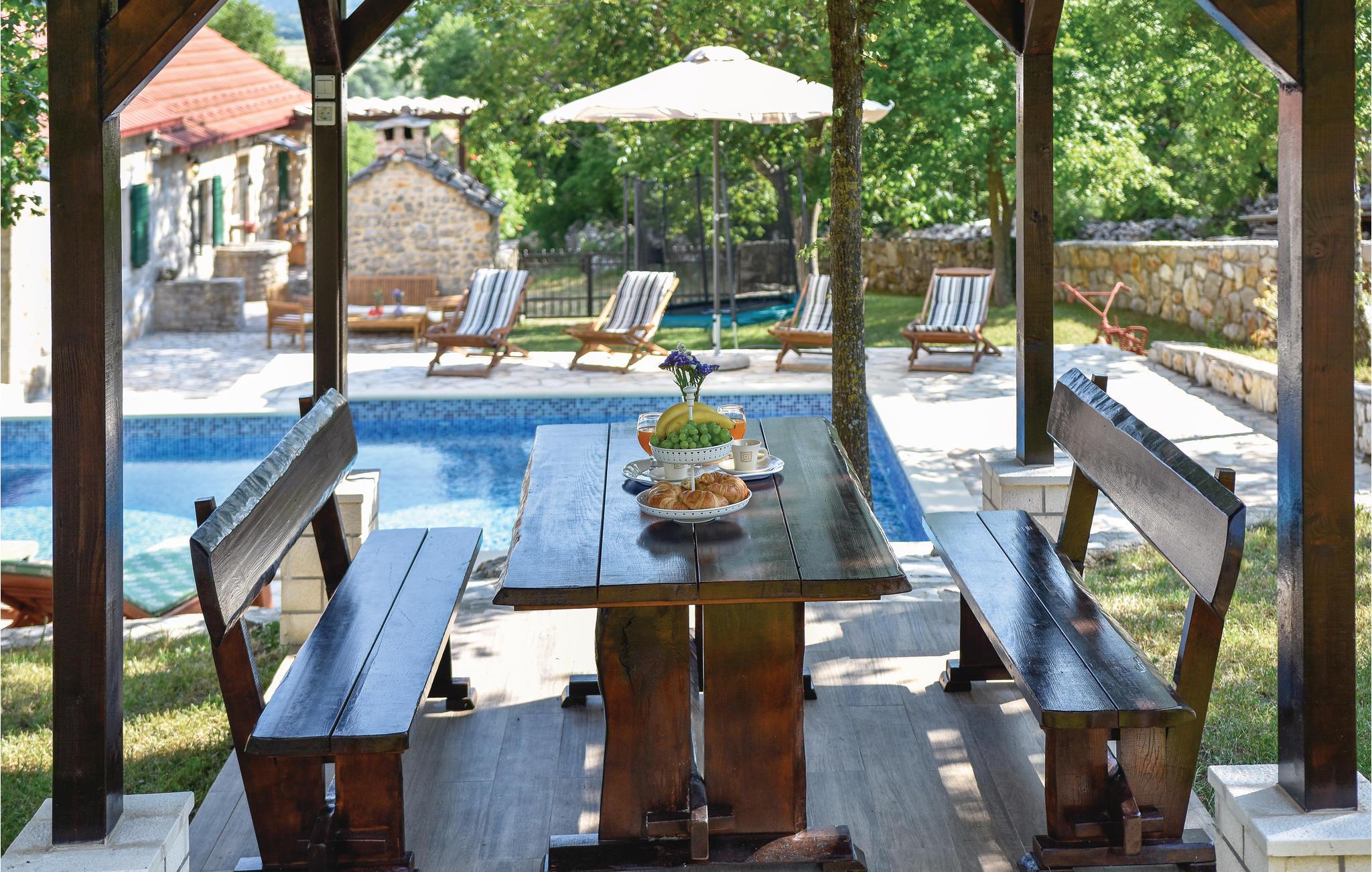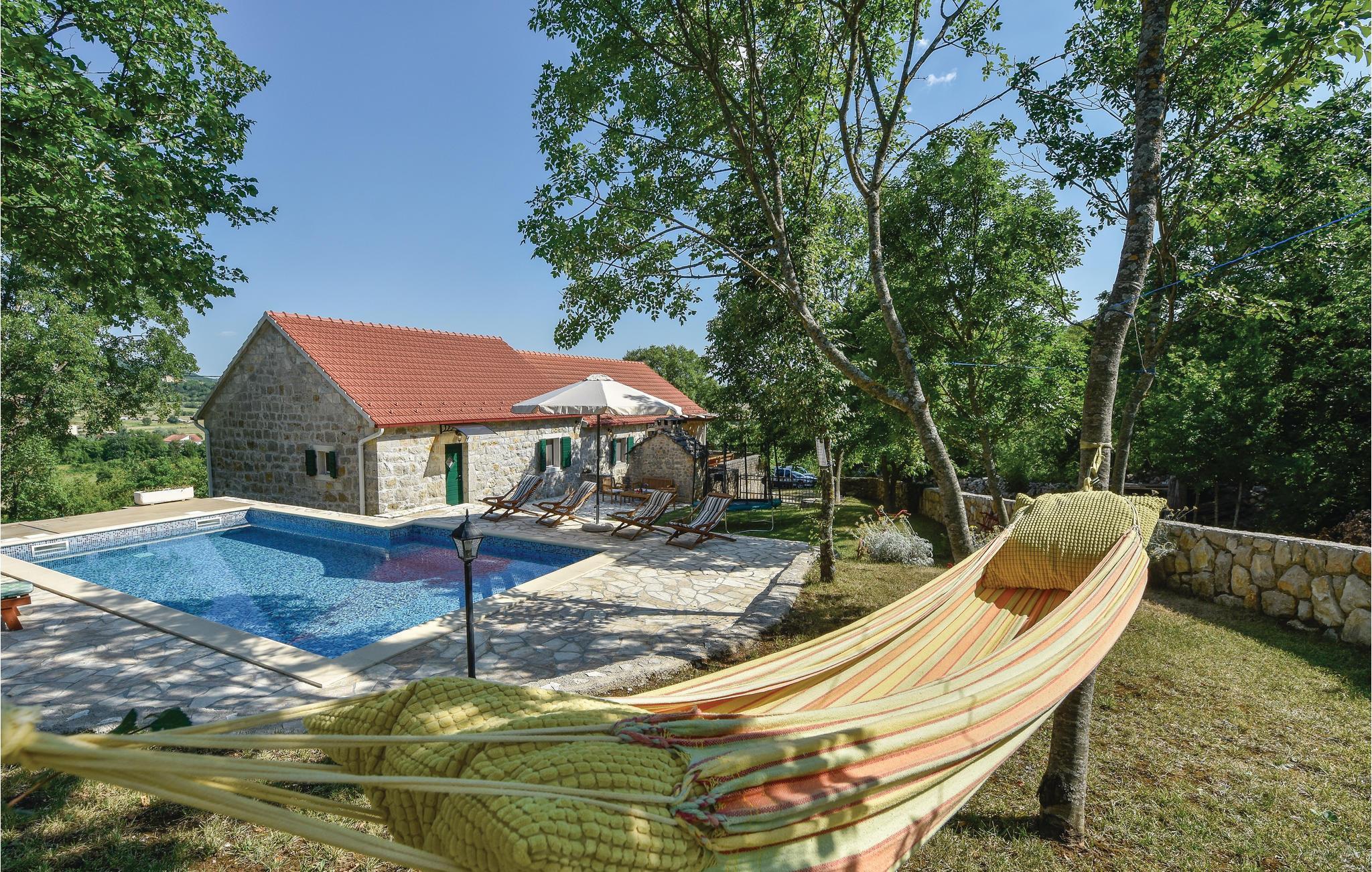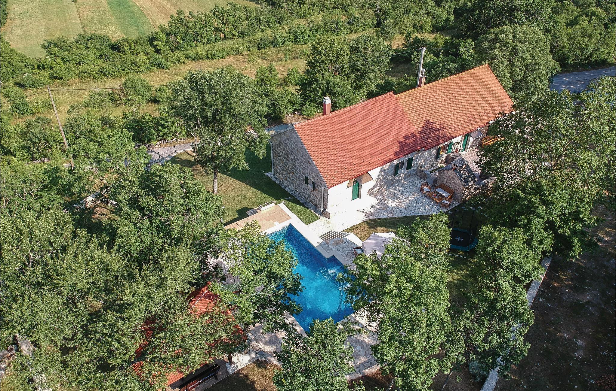 På en lille bakke med en utrolig udsigt over det blide landskab venter dette traditionelle feriehus af sten. Under renoveringen er der blevet taget hensyn til at bevare de traditionelle elementer, der sørger for en indbydende stemning. Feriehuset består af to særskilte lejligheder, der er forbundet over en terrasse, så huset er oplagt til en ferie med to familier. En taverneagtig stue i stueetagen samt udendørspoolen bag huset sørger for hyggelige timer under jeres ophold. I nærheden venter der rig afveksling som rafting ved floden Cetina, bad i Perucasøen med sandbredde, paragliding på bakken samt rideundervisning i rideklubben ved siden af. Der er kun omkring 40 km til havet, ligesom til den nærmeste kystby Split, der er udmærket af mange mindesmærker, der vidner om regionens rige historie.