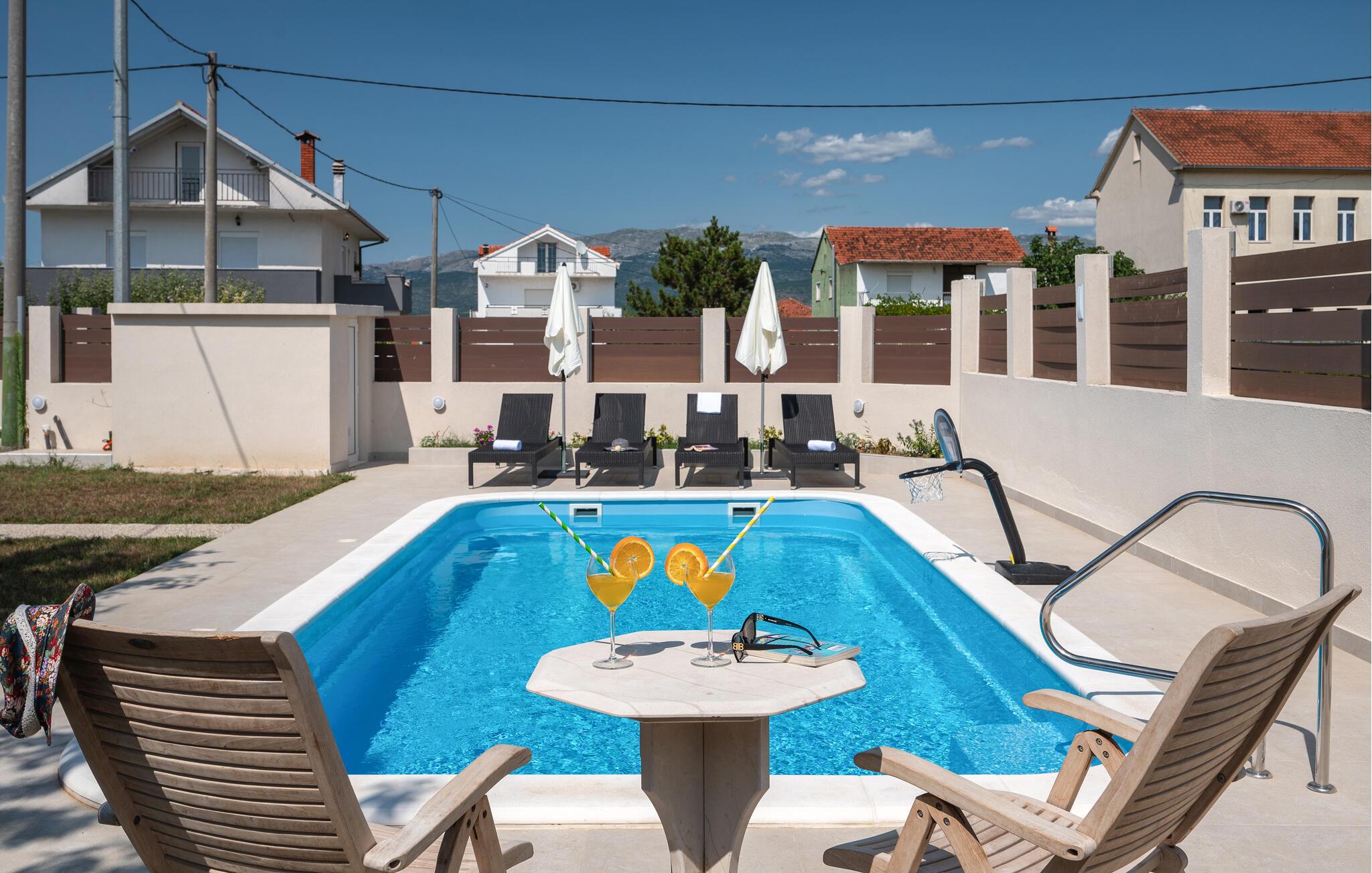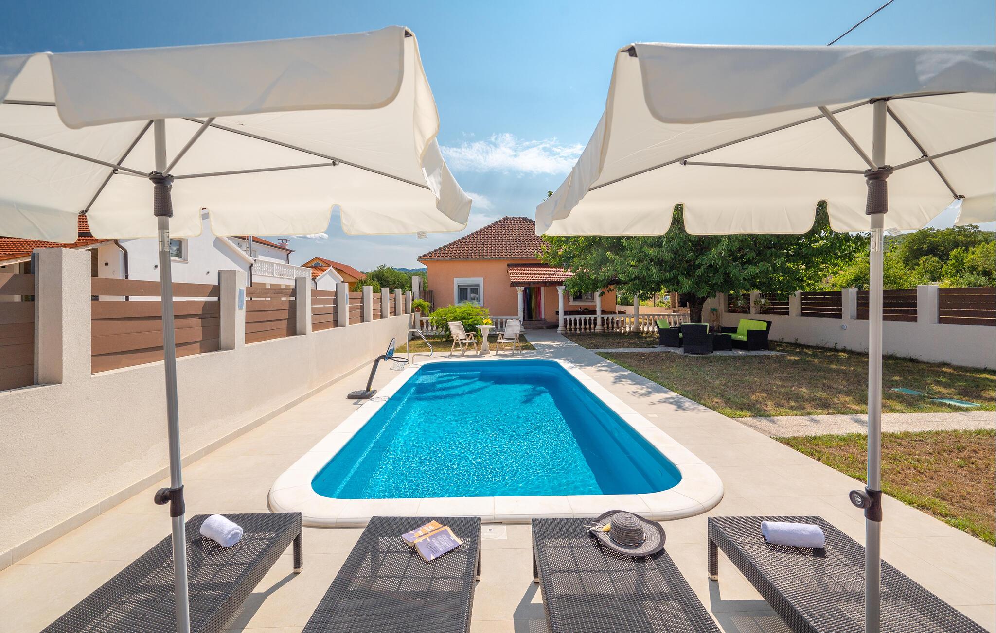 Oplev komfort og ro i et stilfuldt feriehus med pool.