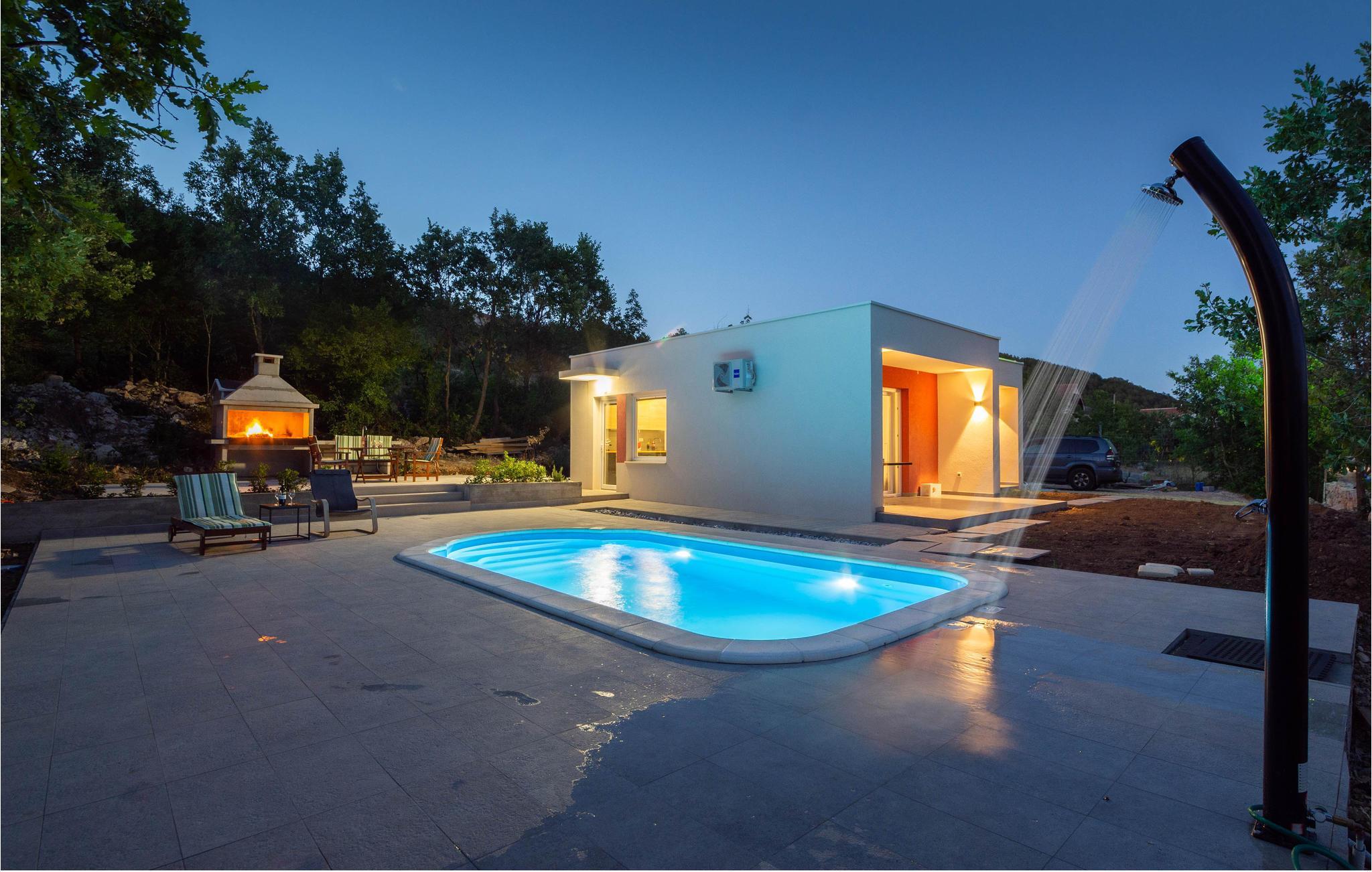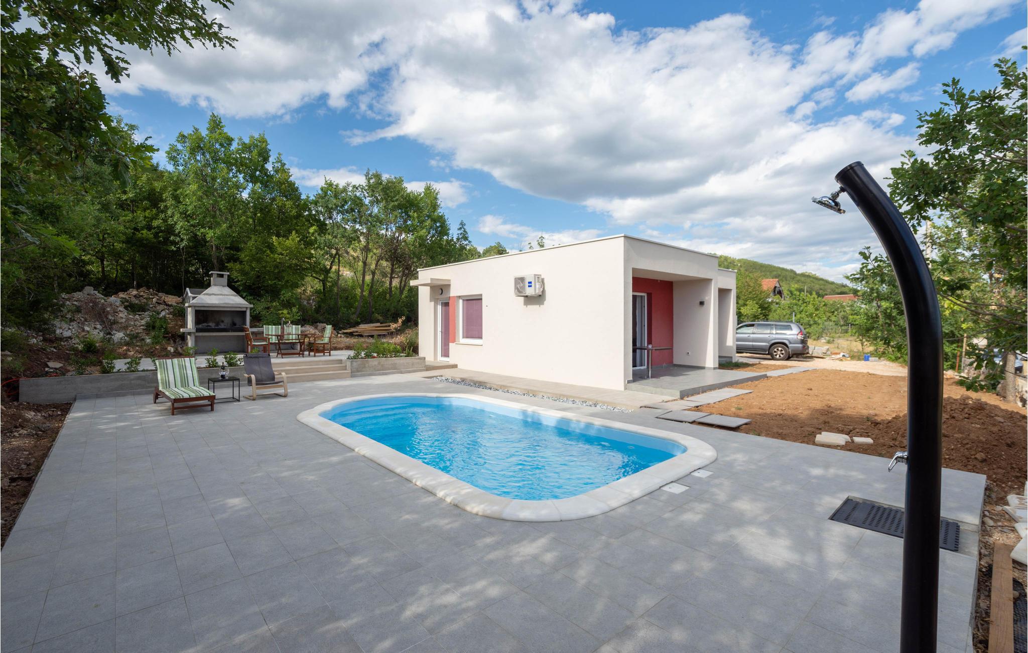 Moderne feriehus i det rolige kroatiske bagland med privat pool. Flyt jeres lille familie ind i dette moderne og kompakte feriehus. Her vil alle jeres ønsker blive opfyldt. Uanset om det er indenfor, med det moderne udstyr i stuen, eller med et hyggeligt samvær i haven, på terrassen. Poolen med udendørs bruser inviterer jer til at svømme både om dagen og i måneskin under stjernerne. Fra haven kan I se ud over det omkringliggende landskab og nyde stilheden. I mellemtiden kan jeres yndlingsretter tilberedes på den store murstensgrill og indtages i den fælles spisestue. På en god halv time kan I komme til havnebyen Split i bil. Herfra kan I tage et par færger til de omkringliggende øer, såsom Brac eller Šolta. Oplev området med dets smukke havne- og kystbyer som Split og Trogir. Her kan I slentre langs promenaden eller tage på en omfattende shoppingtur. Kunne I tænke jer at dyrke sport? Hvad med en robåd eller en vandretur i bjergene? Der er ingen grænser for jeres fantasi, og om aftenen kan I slappe af og lade fødderne dingle i poolen. Glæd jer til en dejlig ferie i Kroatien.