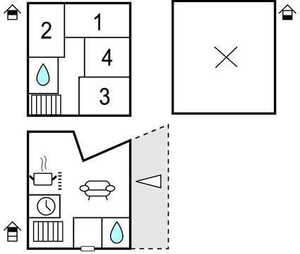 Enkelt indrettet, og strækker sig over to etager, der er forbundet med en indendørs trappe. Her er fire soveværelser, to badeværelser, et køkken og en rummelig stue. På øverste etage er laveste loftshøjde 120 cm. På den store terrasse kan I nyde de lange dejlige feriedage og udsigt over landskabet. Vejen ned til den dejlige kiesstrand er lidt stejl. lejligheder.