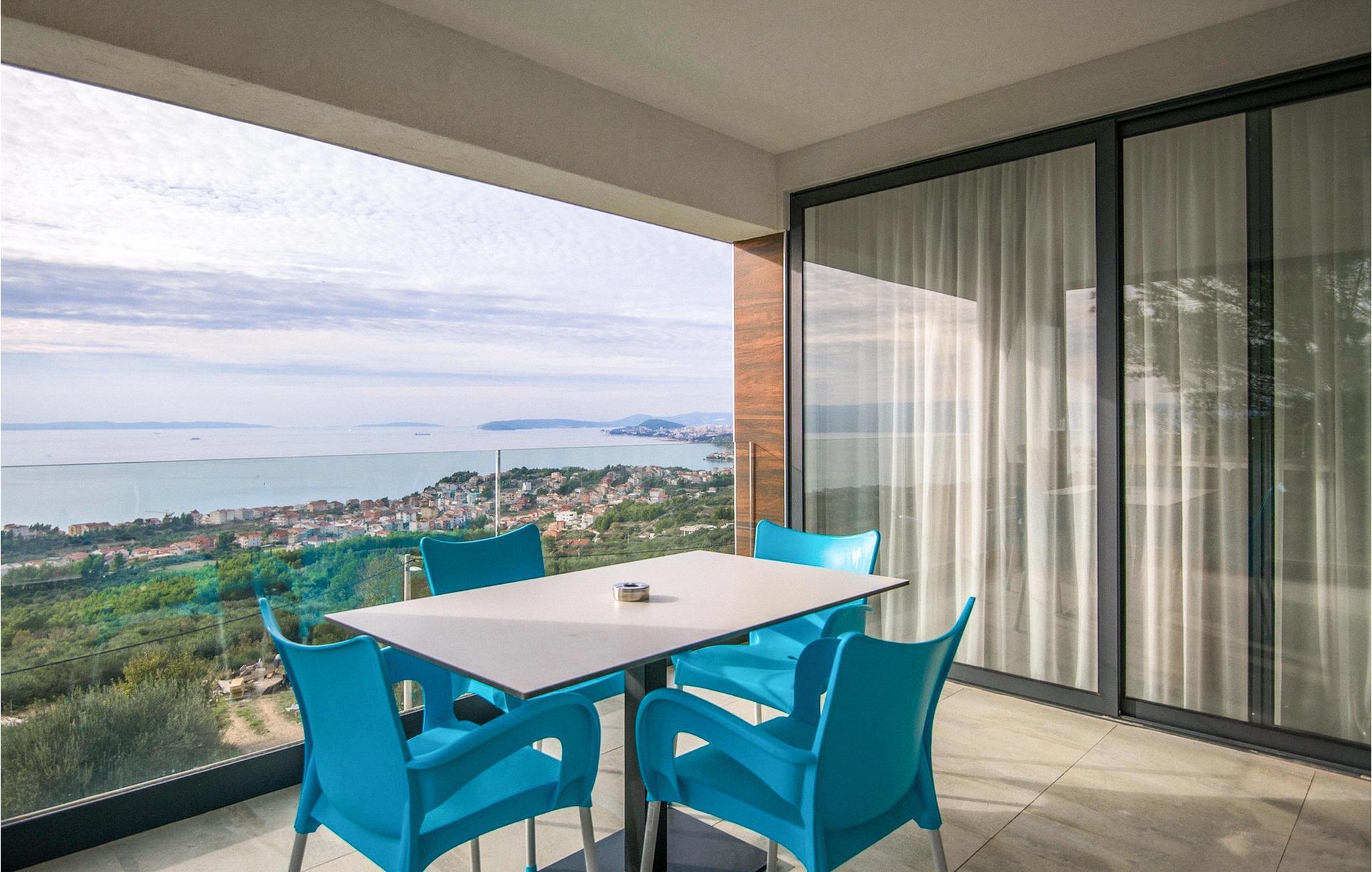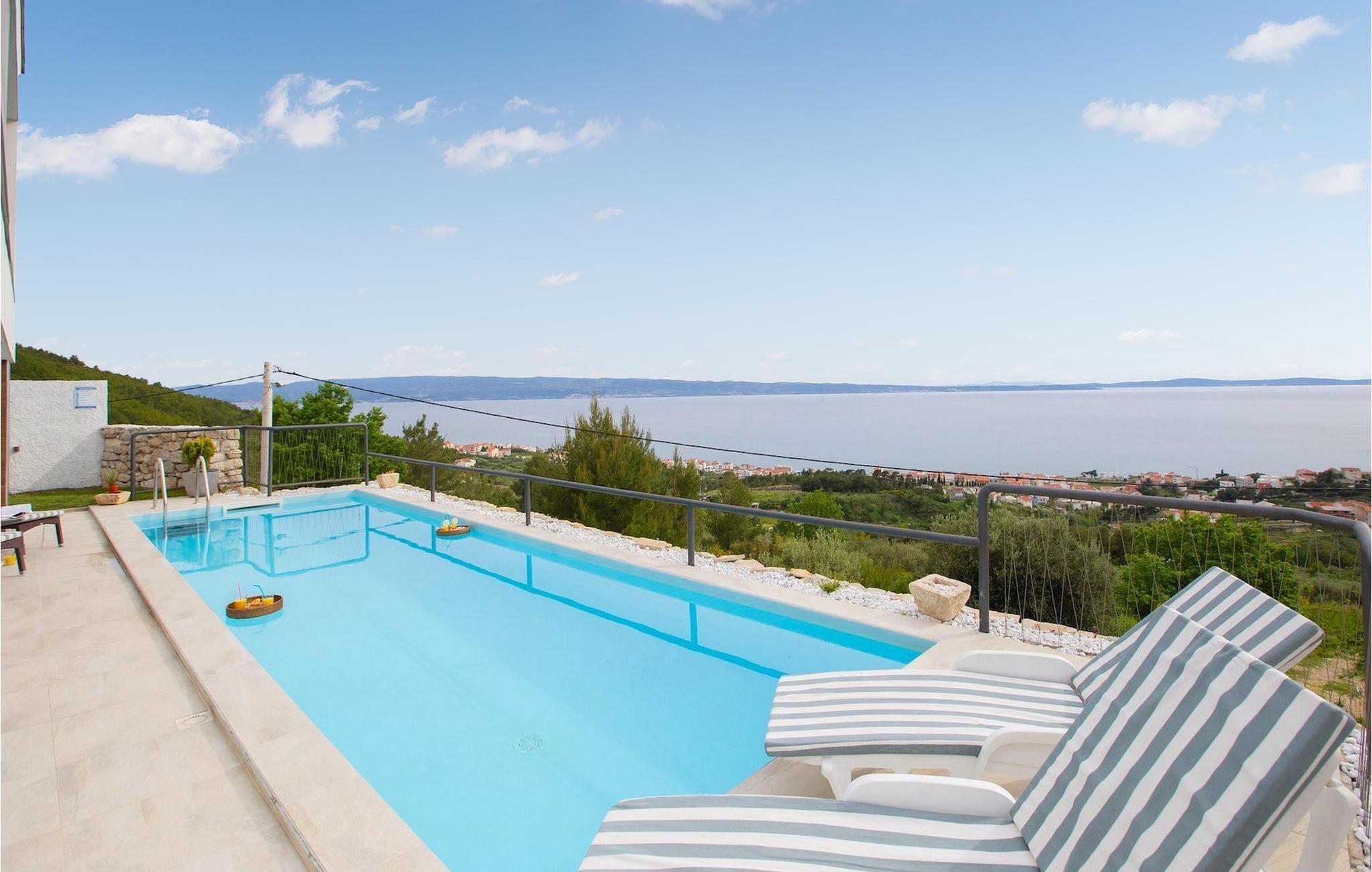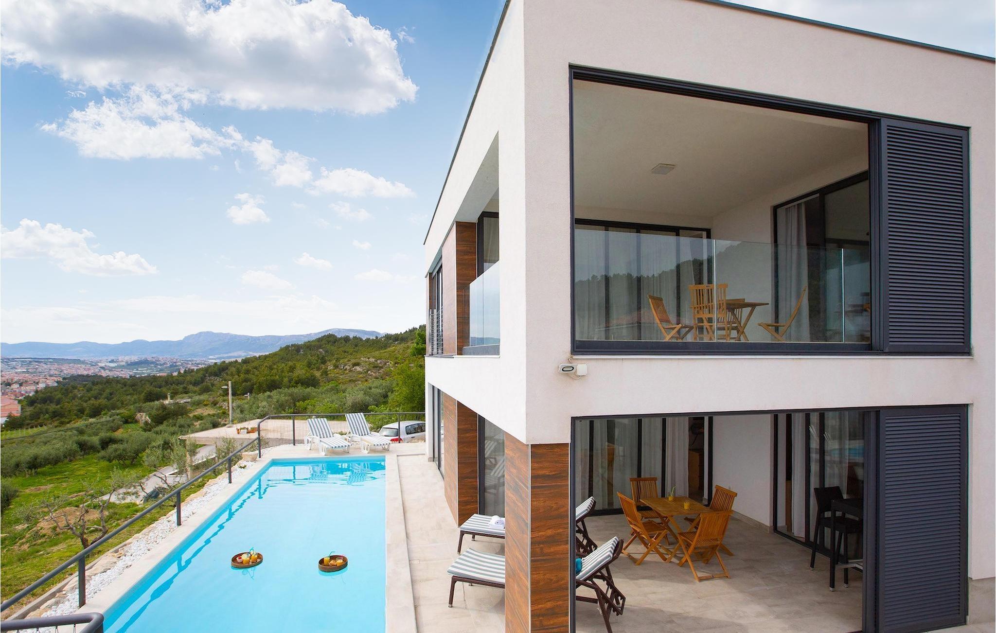 Villa Royal 2 Podstrana ligger i Podstrana, kun en kort køretur fra byen Split. Villaen har i alt 4 soveværelser og kan rumme op til 6+2 personer. Interiøret er præget af rene linjer og moderne design. Villaen er opdelt i 2 etager og to lejligheder. Den åbne stueetage består af et moderne og veludstyret køkken, spiseplads og stue med en fantastisk havudsigt. To soveværelser med eget badeværelse er også placeret i stueetagen. Den anden lejlighed ligger på første sal, hvor der er yderligere to soveværelser med dobbeltseng og eget badeværelse, et køkken og en stue med direkte udgang til den store terrasse. Terrassen på første sal tilbyder dig et ekstra privat sted at nyde panoramaudsigten. Foran villaen er en privat pool, hvor du kan slappe af, mens du læser din yndlingsbog eller nyder solen. Denne unikke villa er perfekt til familier og grupper og tilbyder sine gæster en virkelig uforglemmelig ferie.Villa Royal 2 Podstrana ligger på en skråning med smuk udsigt over Adriaterhavet, øer og kystbyen Podstrana. Alle nødvendige faciliteter såsom butikker, restauranter og caféer ligger kun en kort gåtur fra villaen. Tilbring din ferie på smukke stenstrande, ideel til familier med børn. Villaen er beliggende i det centrale Dalmatien, hvilket gør den til en ideel base for mange dagsture. Besøg byen Split og dens Diocletians palads med dens mange smalle gader og toprestauranter. Gå ikke glip af at besøge øerne Brac, Solta og Hvar, eller måske endda øen Vis, som er helt anderledes end andre øer i Adriaterhavet. Slap af i den smukke natur, i talrige nationalparker og naturreservater. For alle adrenalinelskere kan du besøge floden Cetina, hvor du kan nyde rafting og zipline, eller køre til Biokovo-bjerget og gå en tur på skywalken.