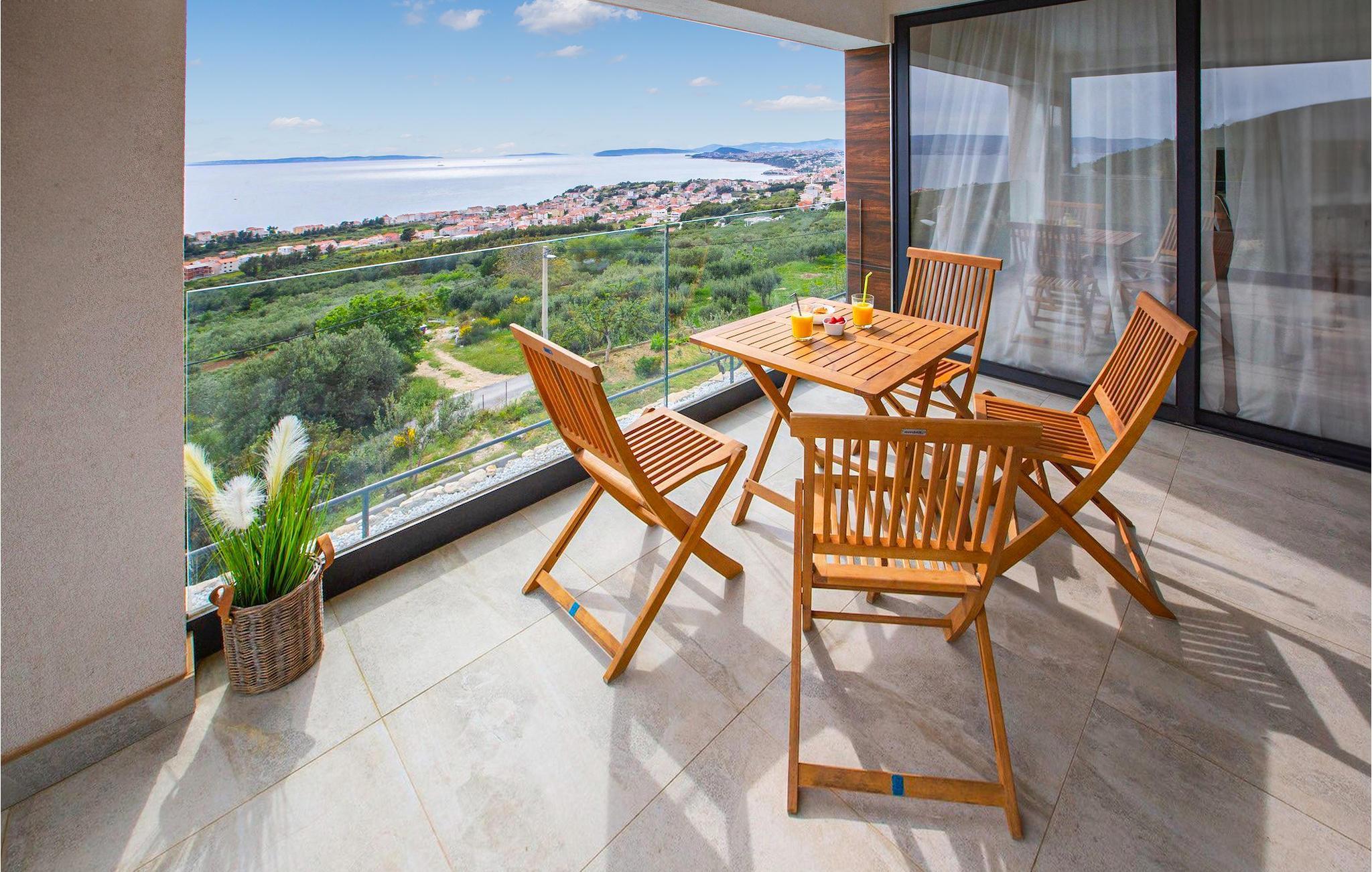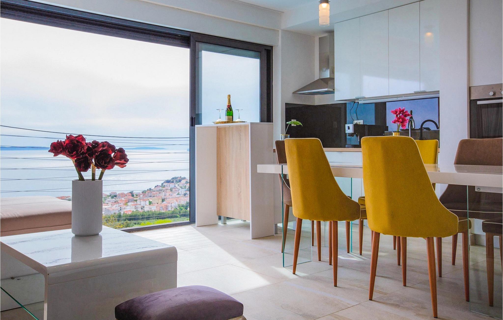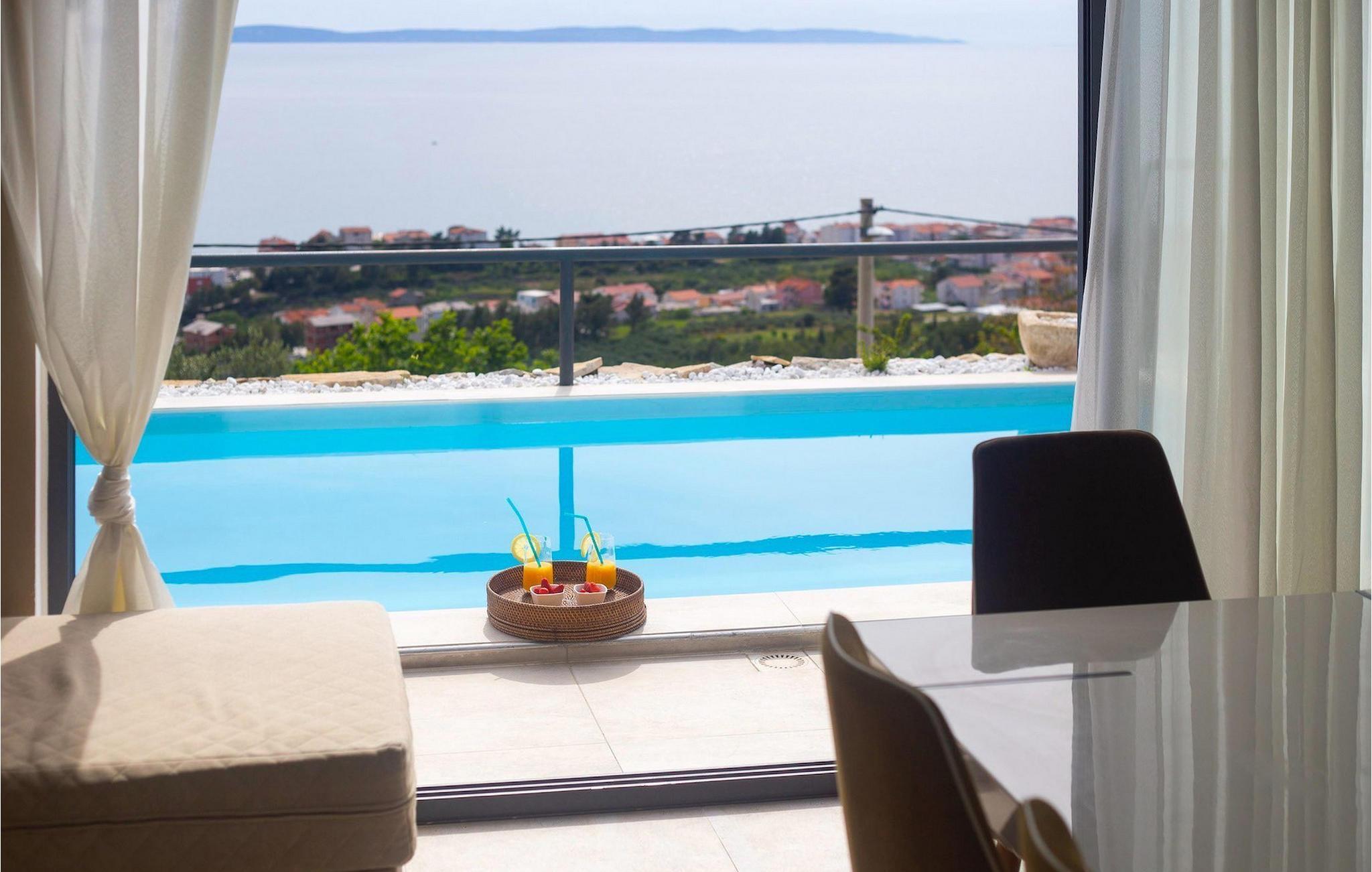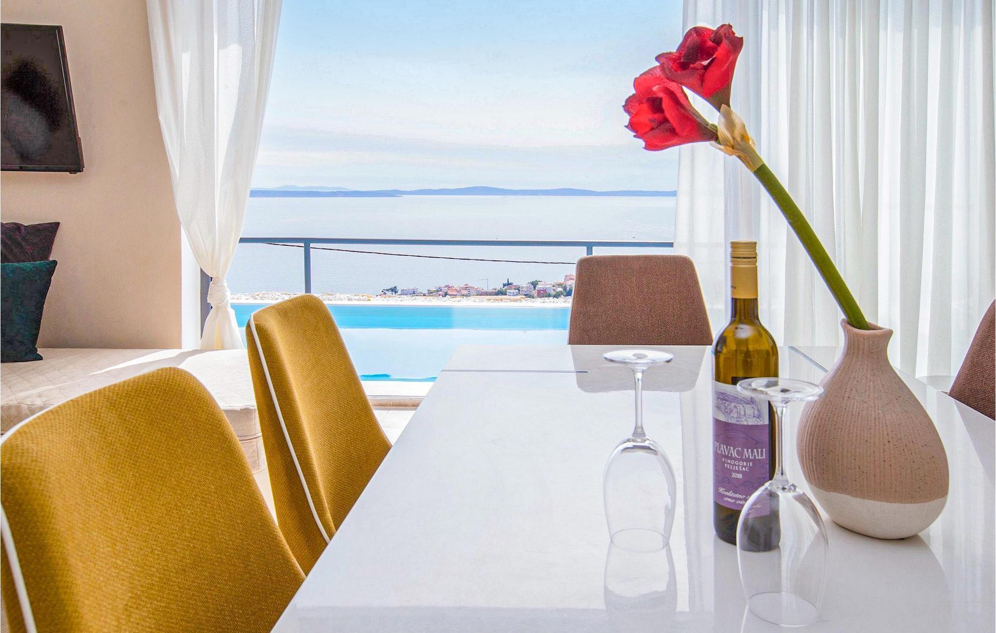 Villa Royal 2 Podstrana ligger i Podstrana, kun en kort køretur fra byen Split. Villaen har i alt 4 soveværelser og kan rumme op til 6+2 personer. Interiøret er præget af rene linjer og moderne design. Villaen er opdelt i 2 etager og to lejligheder. Den åbne stueetage består af et moderne og veludstyret køkken, spiseplads og stue med en fantastisk havudsigt. To soveværelser med eget badeværelse er også placeret i stueetagen. Den anden lejlighed ligger på første sal, hvor der er yderligere to soveværelser med dobbeltseng og eget badeværelse, et køkken og en stue med direkte udgang til den store terrasse. Terrassen på første sal tilbyder dig et ekstra privat sted at nyde panoramaudsigten. Foran villaen er en privat pool, hvor du kan slappe af, mens du læser din yndlingsbog eller nyder solen. Denne unikke villa er perfekt til familier og grupper og tilbyder sine gæster en virkelig uforglemmelig ferie.Villa Royal 2 Podstrana ligger på en skråning med smuk udsigt over Adriaterhavet, øer og kystbyen Podstrana. Alle nødvendige faciliteter såsom butikker, restauranter og caféer ligger kun en kort gåtur fra villaen. Tilbring din ferie på smukke stenstrande, ideel til familier med børn. Villaen er beliggende i det centrale Dalmatien, hvilket gør den til en ideel base for mange dagsture. Besøg byen Split og dens Diocletians palads med dens mange smalle gader og toprestauranter. Gå ikke glip af at besøge øerne Brac, Solta og Hvar, eller måske endda øen Vis, som er helt anderledes end andre øer i Adriaterhavet. Slap af i den smukke natur, i talrige nationalparker og naturreservater. For alle adrenalinelskere kan du besøge floden Cetina, hvor du kan nyde rafting og zipline, eller køre til Biokovo-bjerget og gå en tur på skywalken.