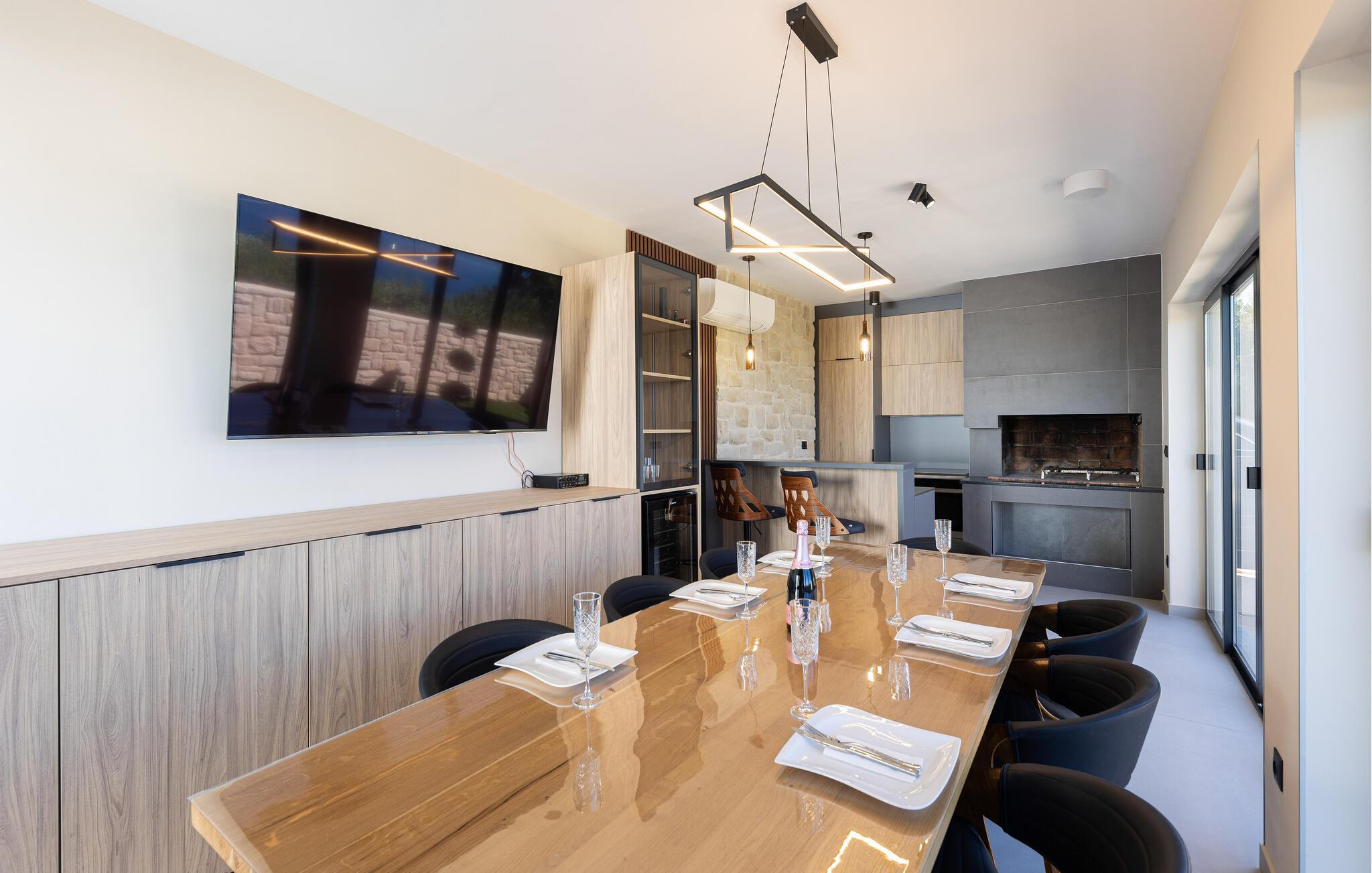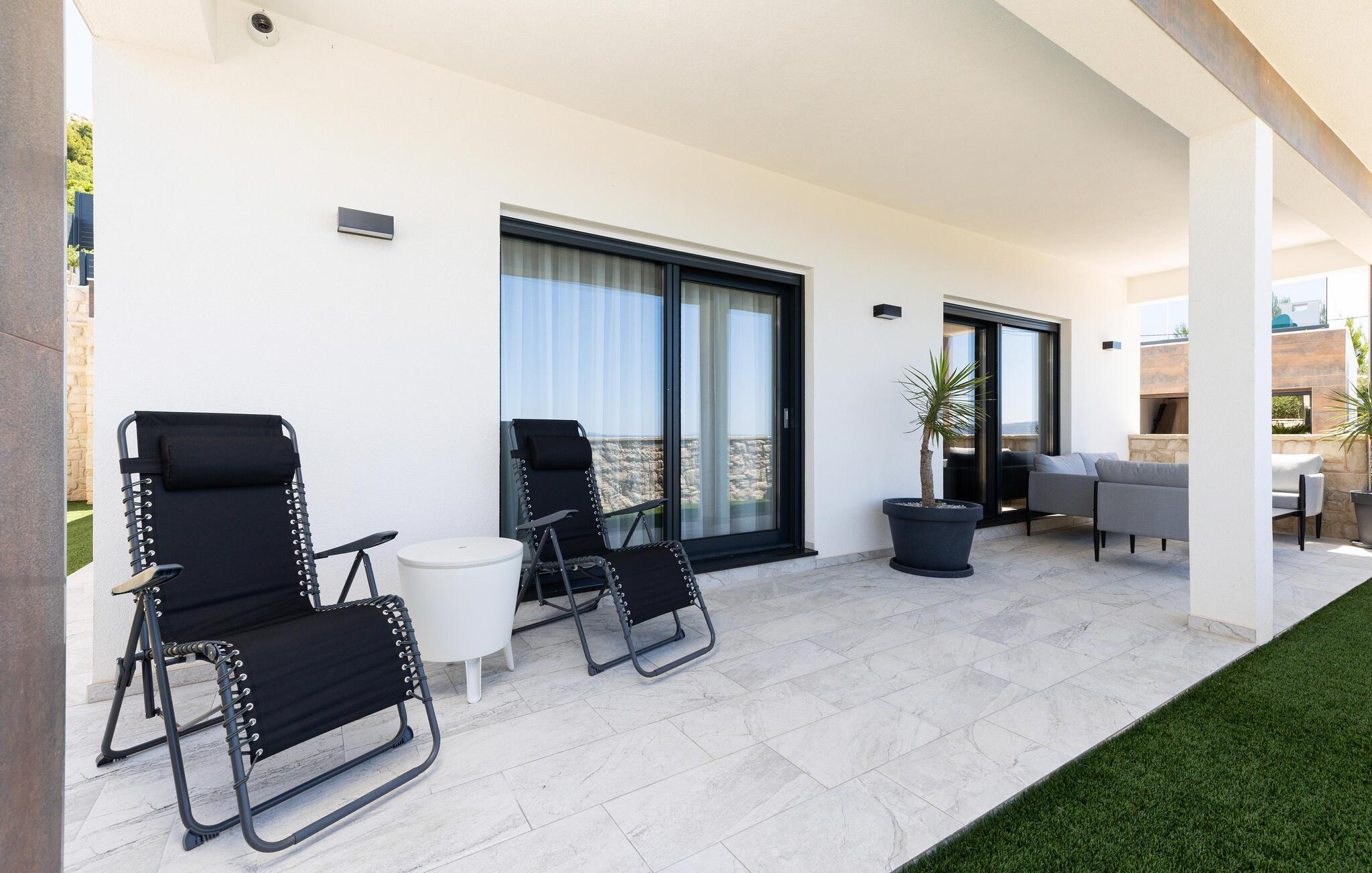Det elegante udendørsområde lokker med et overdækket poolområde, hvor I kan nyde mange solskinstimer på komfortable liggestole. Slap af på dagsengen, mens andre nyder bordtennisbordet eller gyngen, spiller fodbold eller badminton, og stirrer ud over det vidtstrakte hav på stemningsfulde grillaftener.