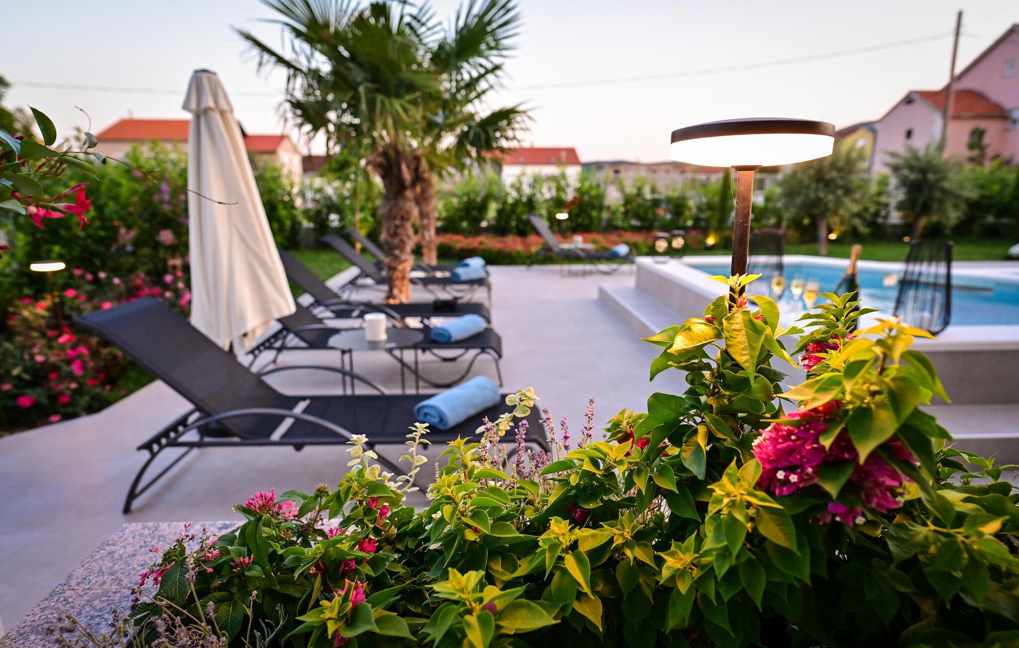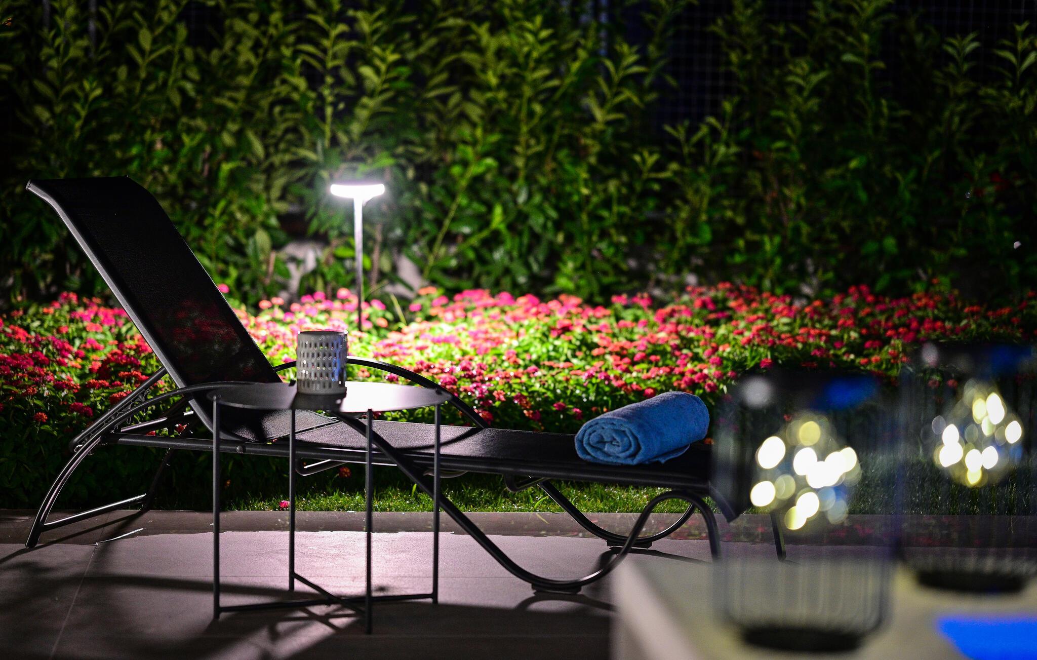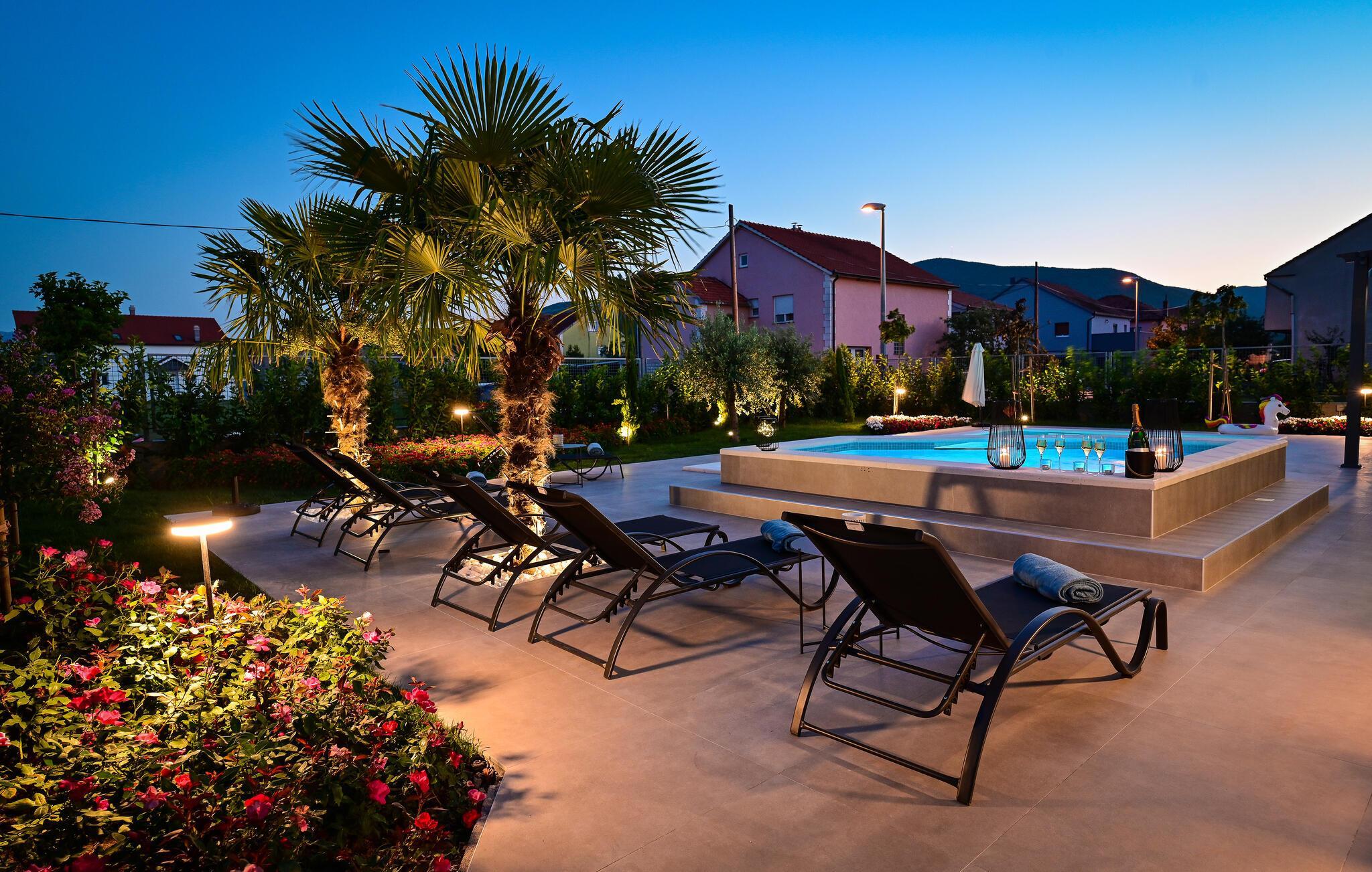 Glæd jer til at gå barfodet i det elegante udendørsområde - en sand oase af velvære i det fri. snup en frisk dukkert i poolen, slap af i spabadet eller på de komfortable liggestole. Spis morgenmad på den overdækkede terrasse og fejr varme sommernætter med lækre grillretter.