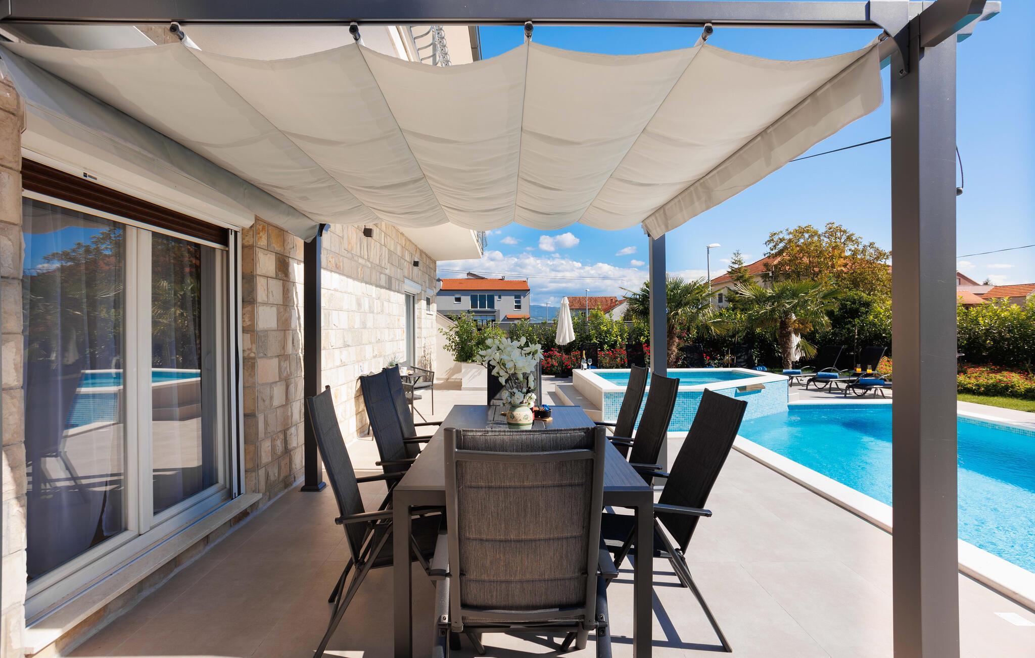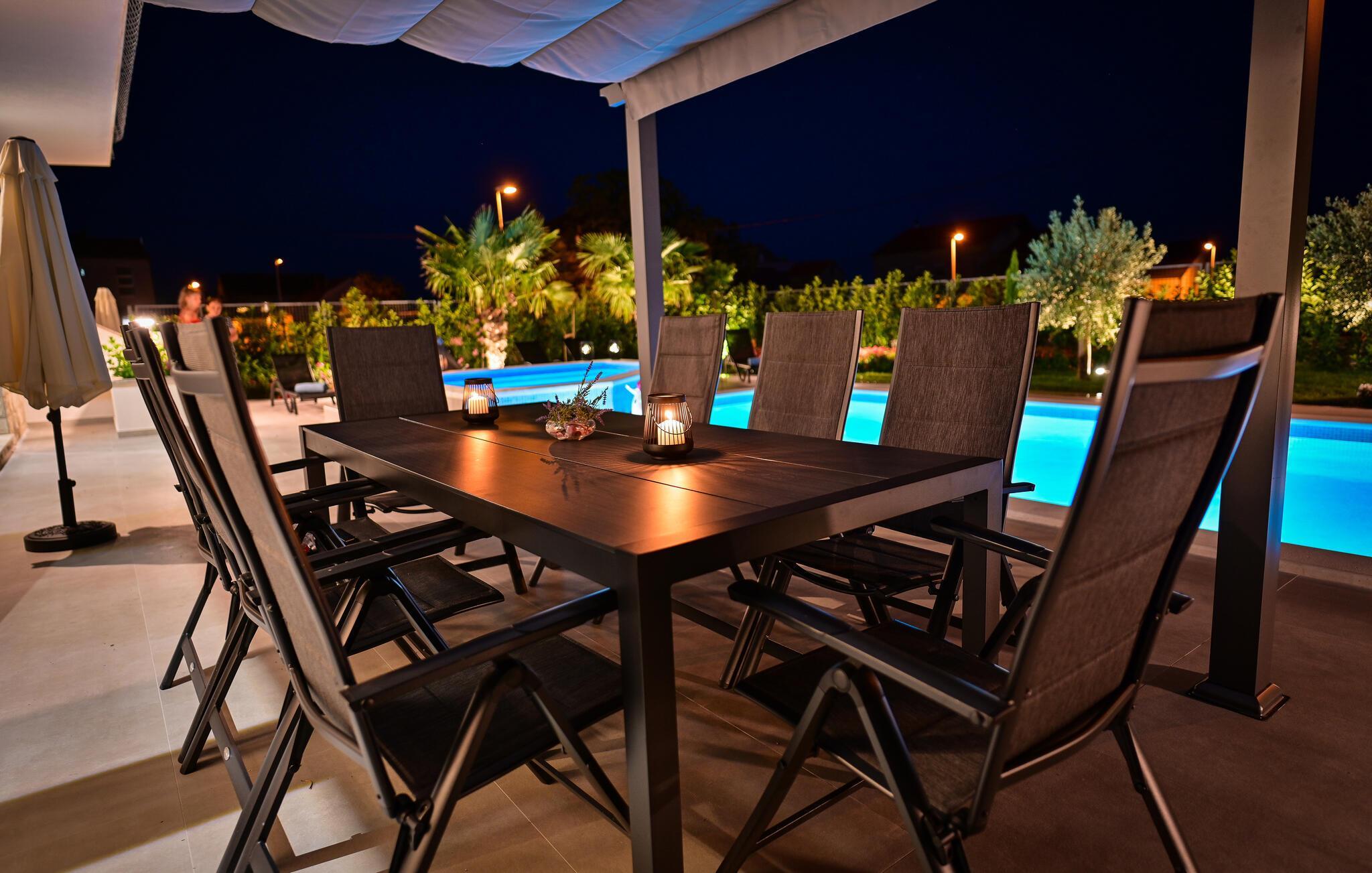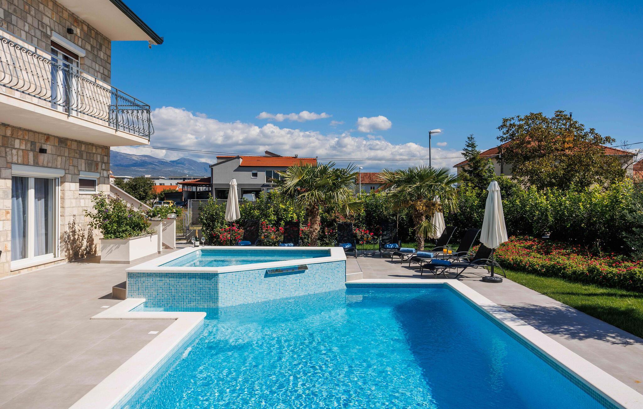 Glæd jer til at gå barfodet i det elegante udendørsområde - en sand oase af velvære i det fri. snup en frisk dukkert i poolen, slap af i spabadet eller på de komfortable liggestole. Spis morgenmad på den overdækkede terrasse og fejr varme sommernætter med lækre grillretter.