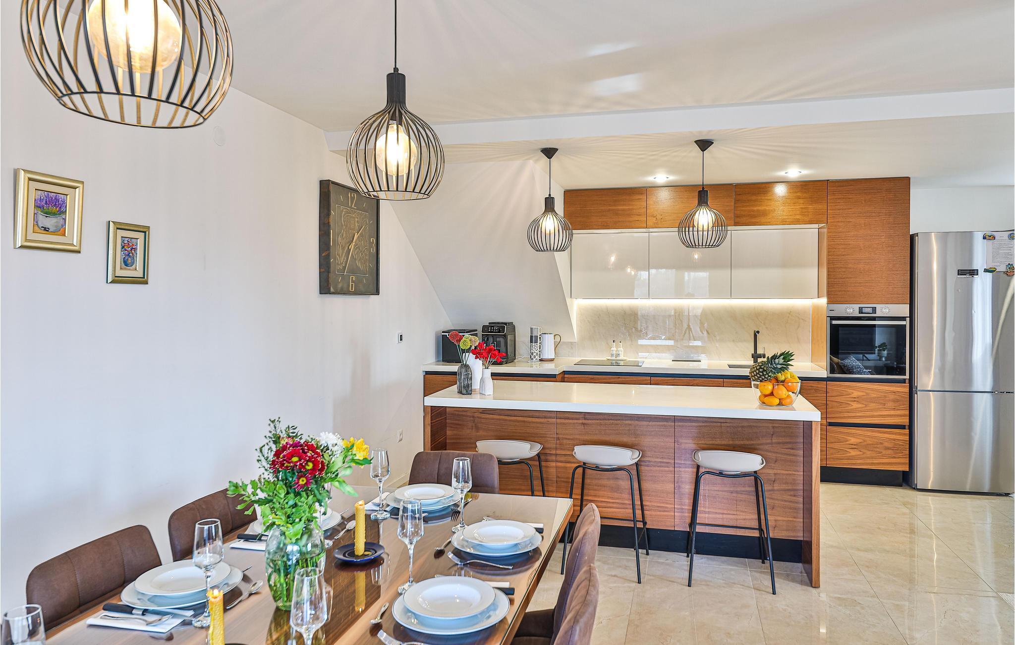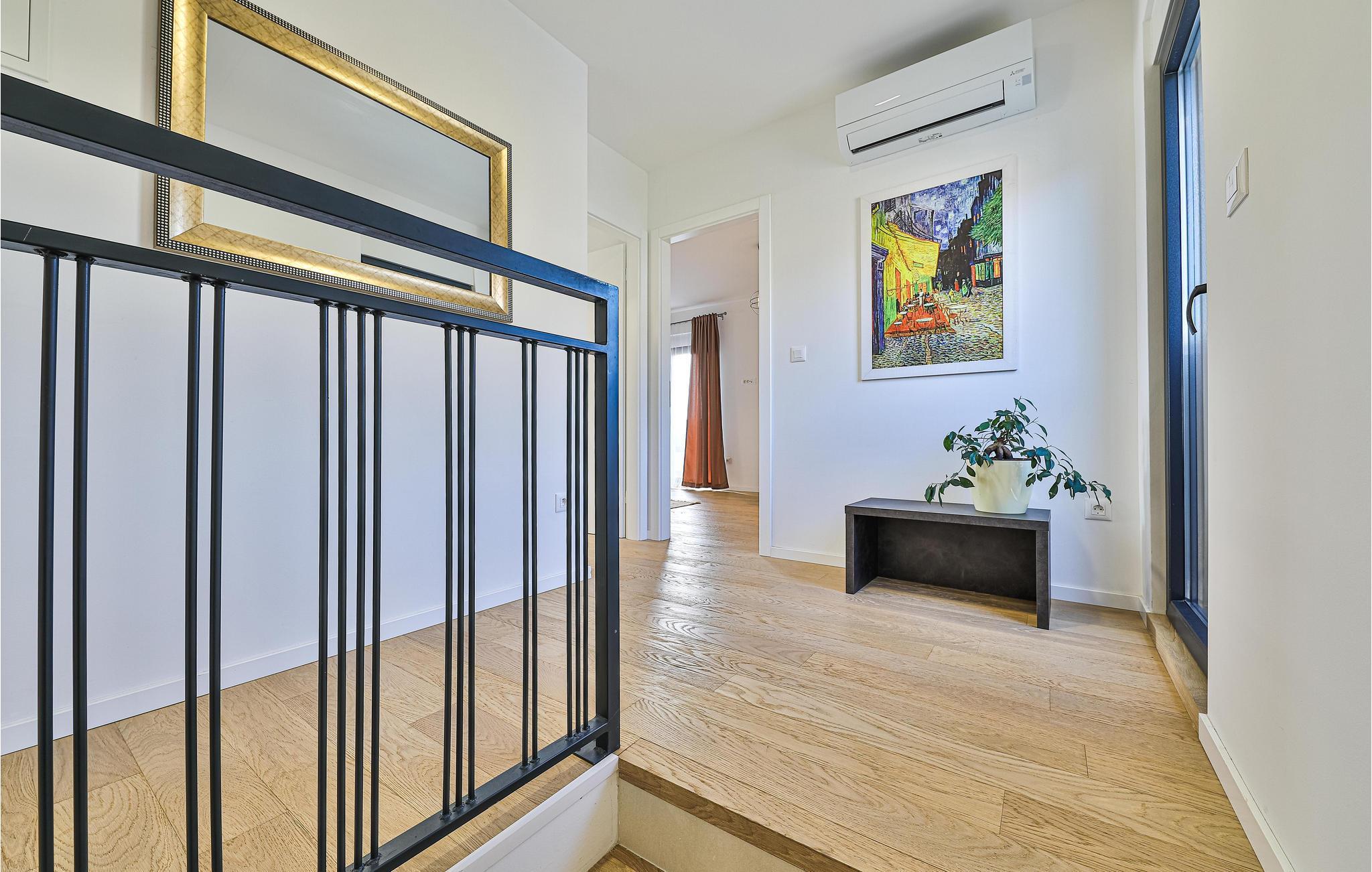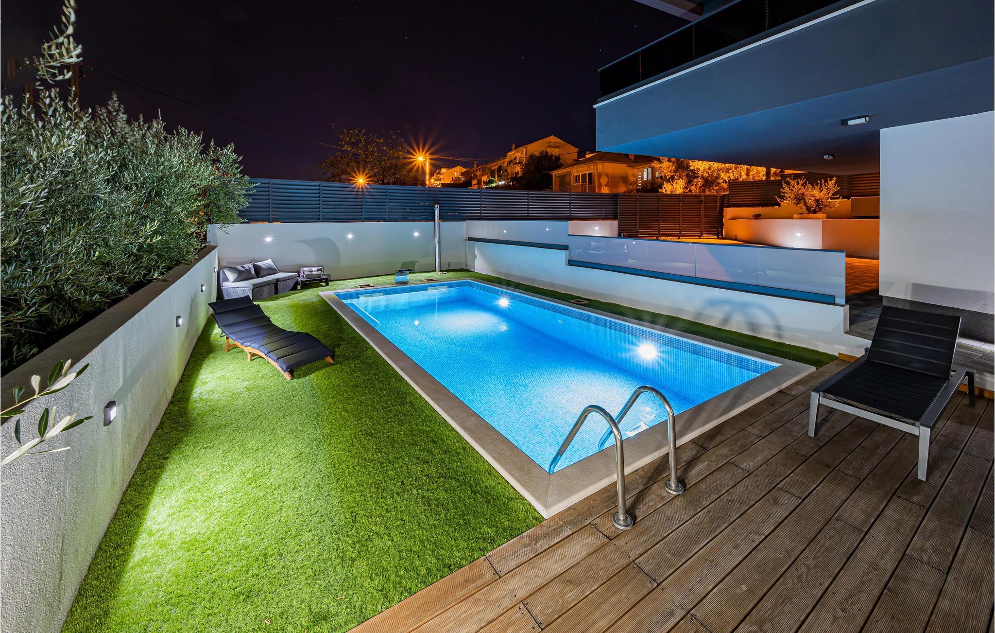 Dette komfortable og moderne feriehus med pool ligger i en forstad til Split. I kan sprede jer ud med familien eller venner på tre etager og nyde samværet og jeres privatliv. Hvert soveværelse har eget badeværelse, så I har jeres frihed, og der er aldrig trafikprop på badeværelset. I kan også nyde jeres private altan eller den store fælles altan og drikke dagens første kop kaffe her eller lave jeres daglige yogaøvelser. Den store altan indbyder også til at slappe af på loungemøblerne eller spise ved bordet. I kan nyde en fantastisk udsigt over landskabet. Møblerne af høj kvalitet og det tiltalende landskab i den åbne stue skaber også en skøn atmosfære.