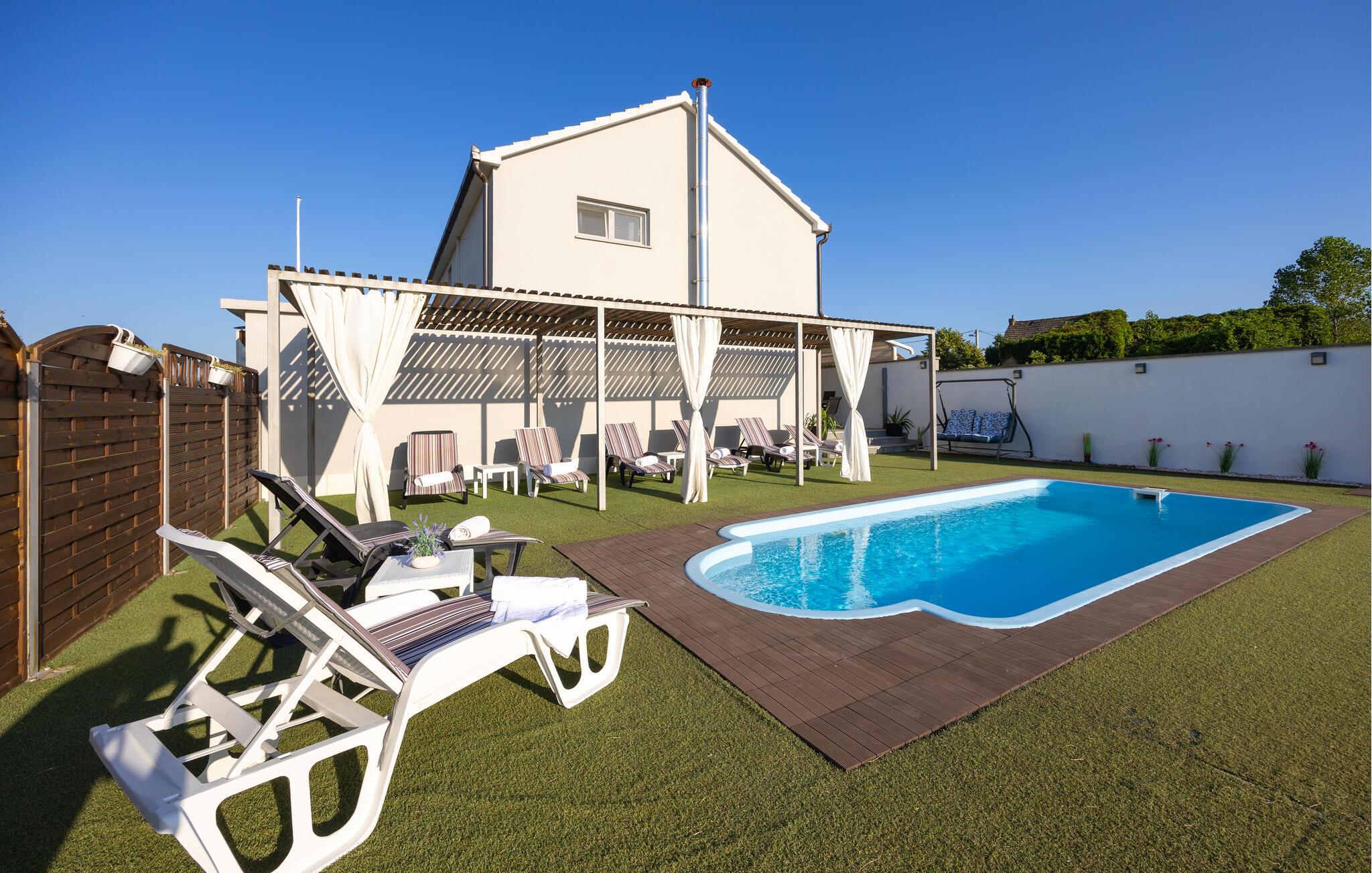 Bo i landlige omgivelser, nær floden Cetina i dette komfortable feriehus med helt egen pool. Husets indre er både smukt og afstemt indrettet med udstyr af god kvalitet. Her vil I føle jer hjemme fra første øjeblik. Den store terrasse ligger ud til de velplejede plæner, med den skønne pool. Huset er fordelt på to etager: i stueplan er der køkken i åben forbindelse med stuen og udgang til terrassen med grill og mini-udendørskøkken, mens soveværelser og det store bad med massagedyser ligger på første sal. Det tager kun ti minutter at gå til byens centrum. Her er der mange restauranter, hvor I bl.a. kan smage specialiteter som frøer og foreller. Tag til Cetinafloden og sus over vandet på zip-line, eller tag en udfordrende rafting-tur.