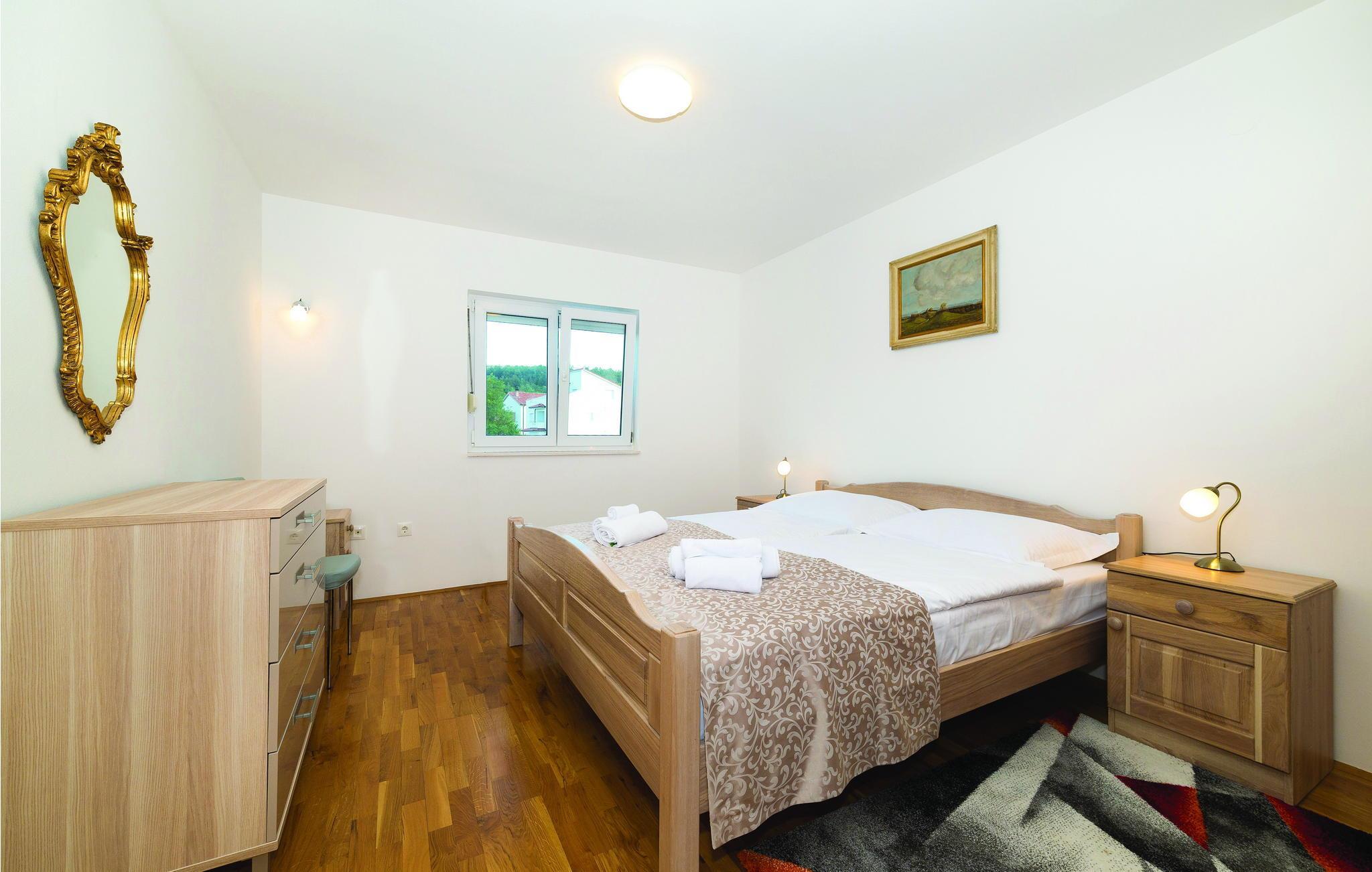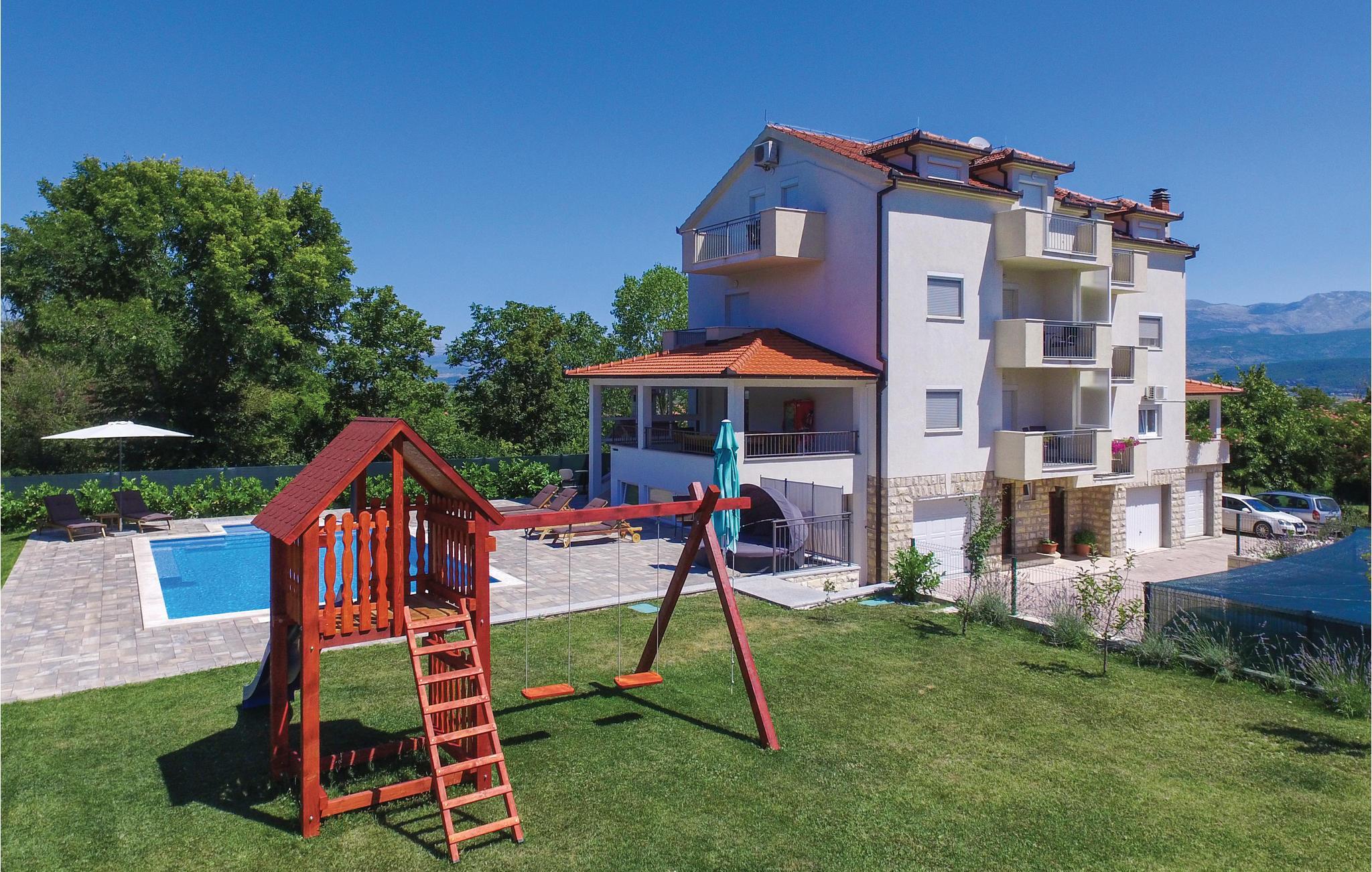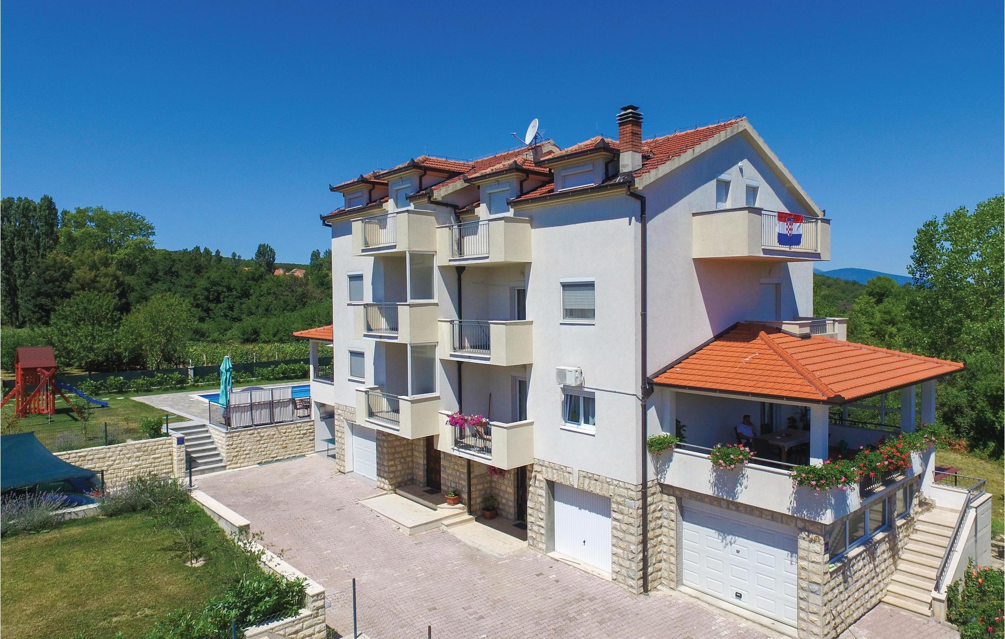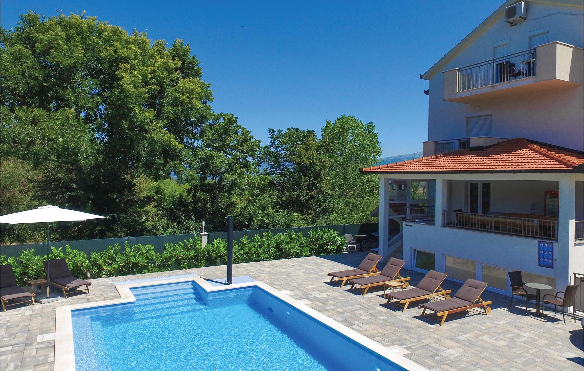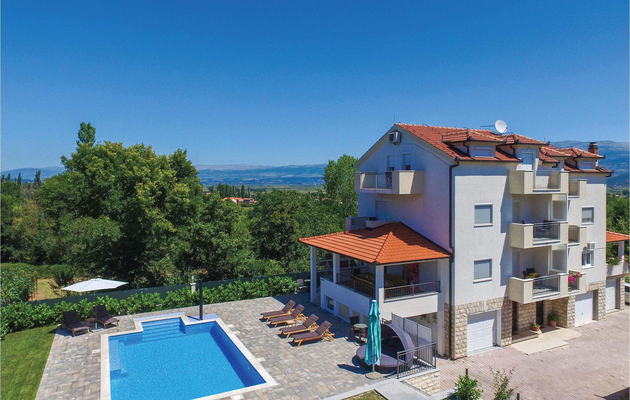 Denne attraktive halvdel af et dobbelthus med privat pool, ligger i Regionen Sinj i en rolig bydel i den lille by Trilj. Huset er delt op i to lejligheder. På første sal ligger stue, på anden sal er der tre soveværelser. På øverste etage er det åbne køkken og et soveværelse. Etagerne er forbundet med en indendørstrappe. I den indhegnede have ligger swimmingpoolen med et integreret spabad til fire personer. og her er også en grill og en volleyballbane på sand. I den anden del af huset bor ejeren med sin familie. Der er plads til at parkere en bil i garage og fire biler under åben himmel på grunden. Det tager en halv time i bil at køre til de interessante byer Split, Trogir, Šibenik og Makarska. Det er muligt at tage med på rafting- og rideudflugter mod betaling.