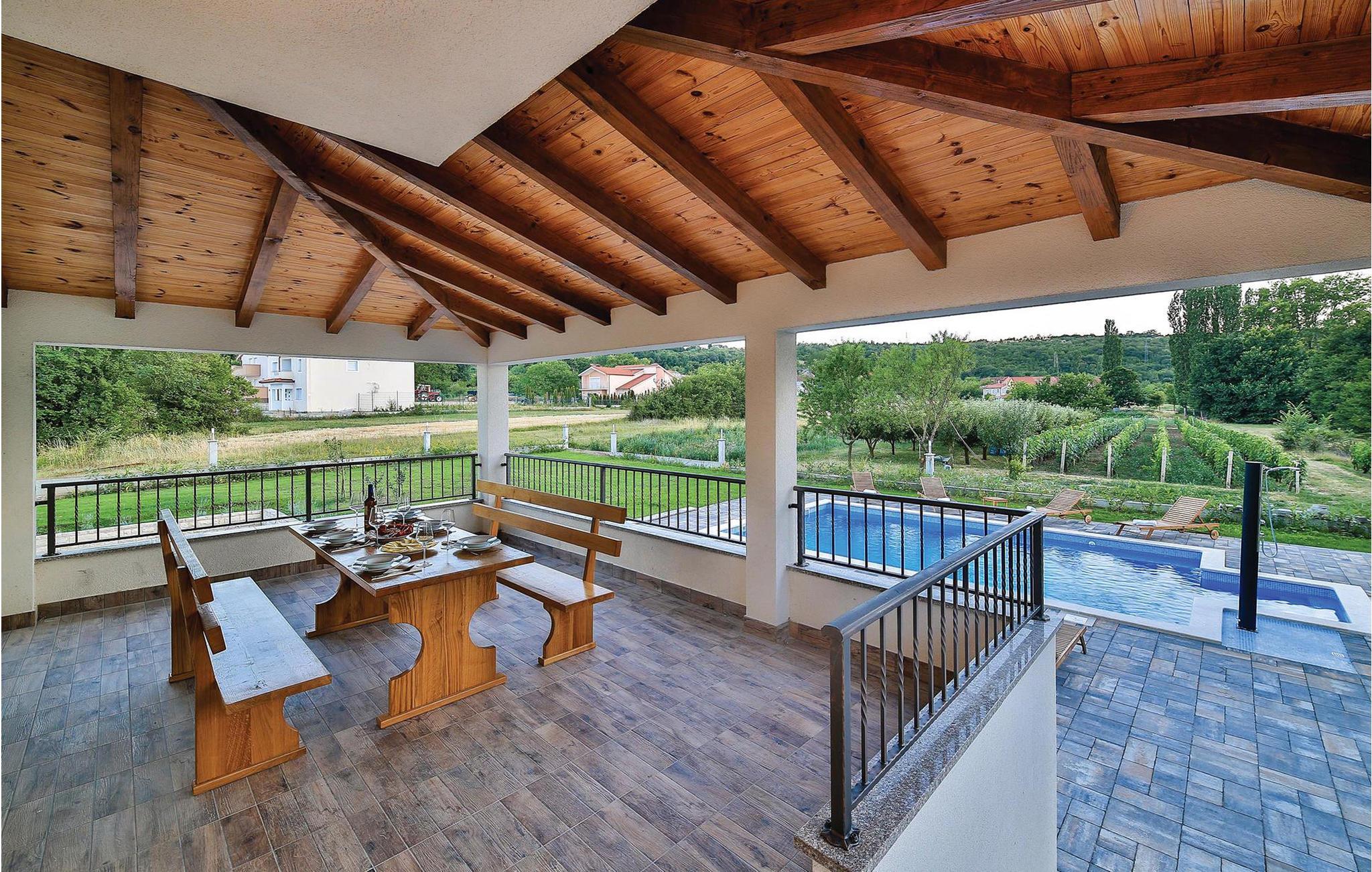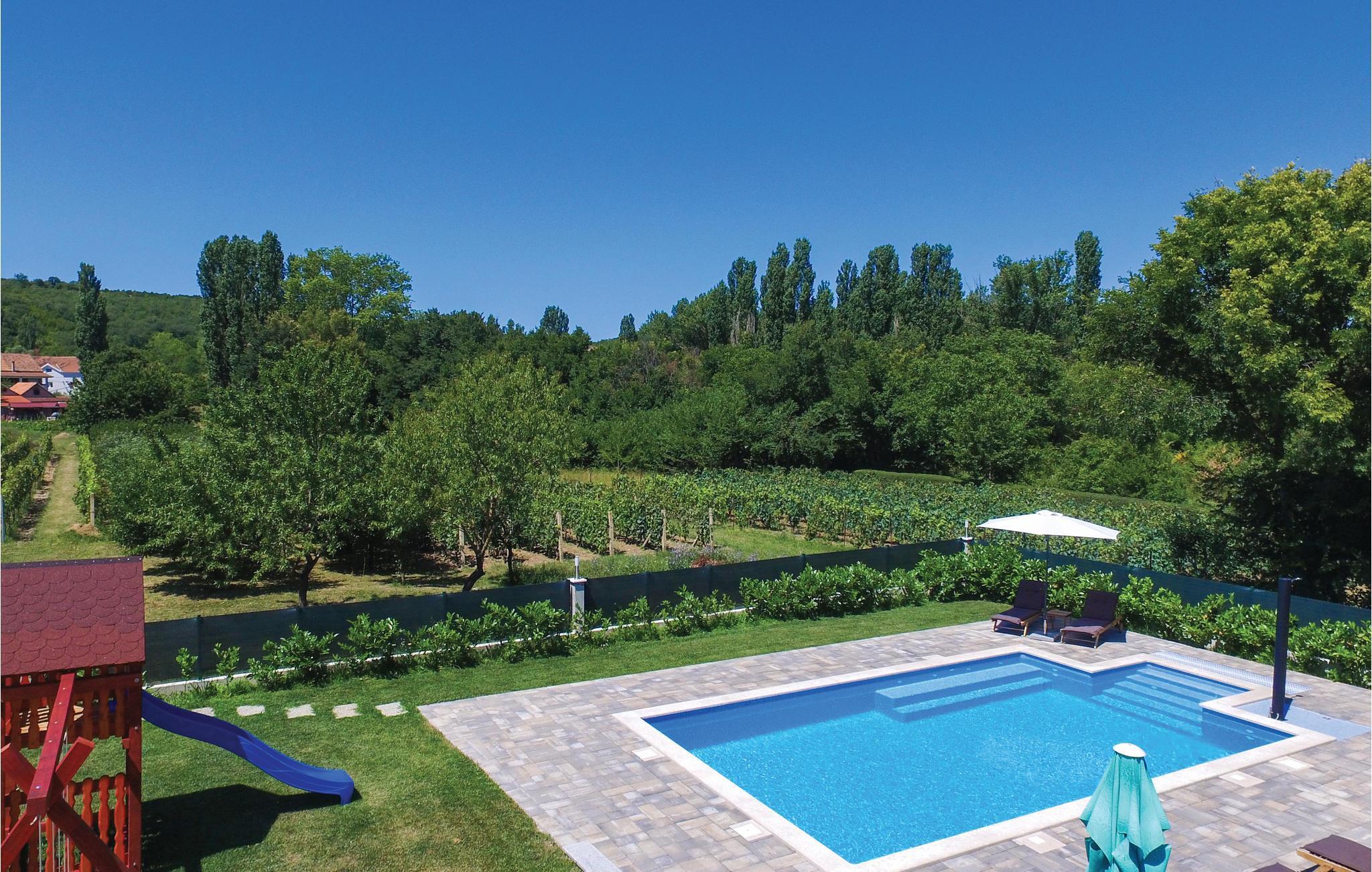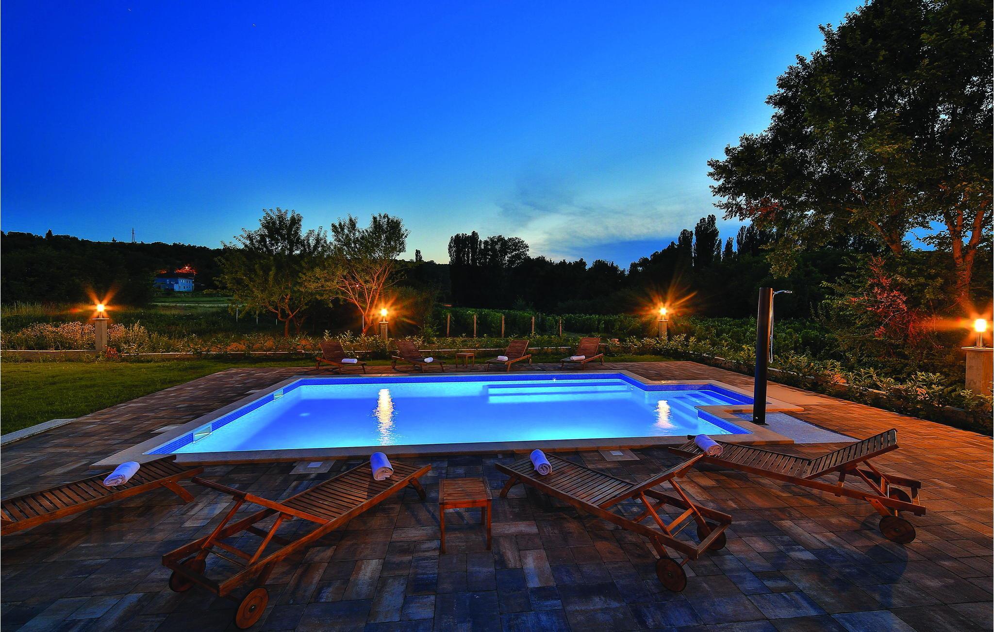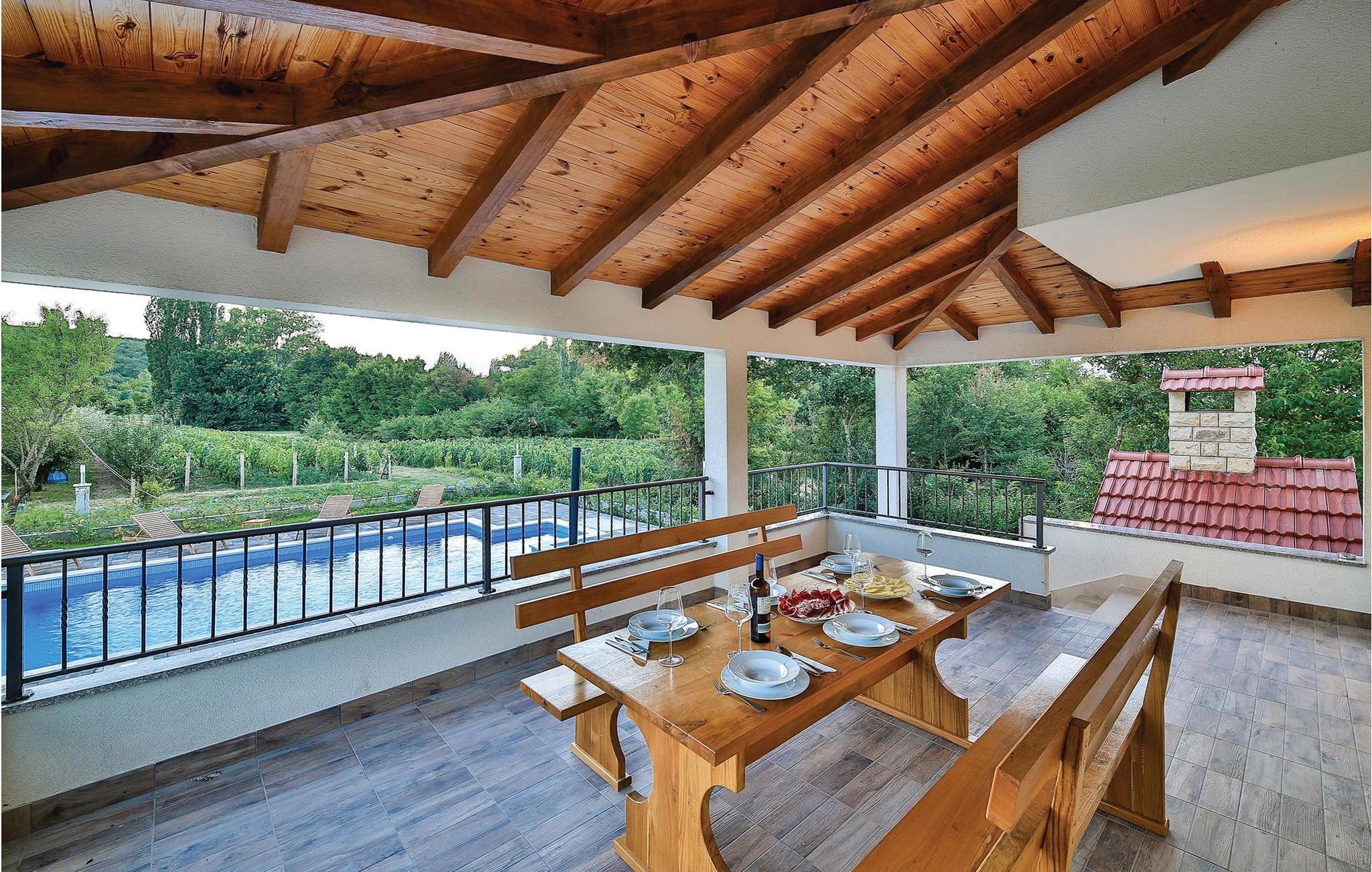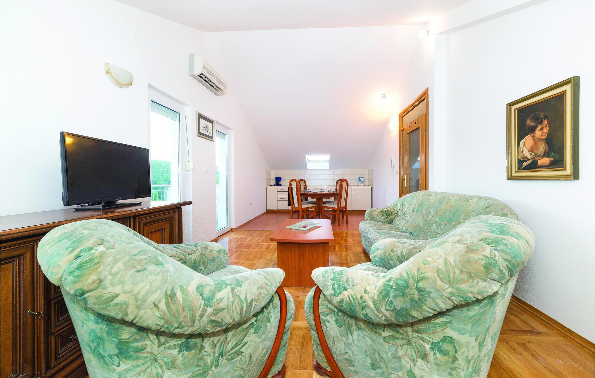 Denne attraktive halvdel af et dobbelthus med privat pool, ligger i Regionen Sinj i en rolig bydel i den lille by Trilj. Huset er delt op i to lejligheder. På første sal ligger stue, på anden sal er der tre soveværelser. På øverste etage er det åbne køkken og et soveværelse. Etagerne er forbundet med en indendørstrappe. I den indhegnede have ligger swimmingpoolen med et integreret spabad til fire personer. og her er også en grill og en volleyballbane på sand. I den anden del af huset bor ejeren med sin familie. Der er plads til at parkere en bil i garage og fire biler under åben himmel på grunden. Det tager en halv time i bil at køre til de interessante byer Split, Trogir, Šibenik og Makarska. Det er muligt at tage med på rafting- og rideudflugter mod betaling.
