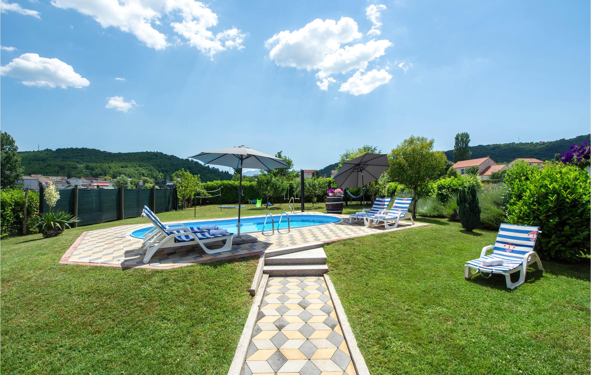 Dette dejlige feriehus, der er omgivet af meget grønt, ligger i nærheden af floden Certina. Jeres hus har alle faciliteter til en afslappende ferie. Fra stueetagen kommer I ud på terrassen, og ad den indendørs trappe kommer I op på øverste etage, hvor I finder soveværelserne. Foran huset ligger poolen, der sørger for sjov badning og afkøling på varme sommerdage. En velkommen afveksling til badningen giver floden Cetina 250 m væk. Alle I, der er aktive feriegæster får rigtig noget ud af det i dette område og kan vælge mellem rafting og eventyrudflugter med kano.