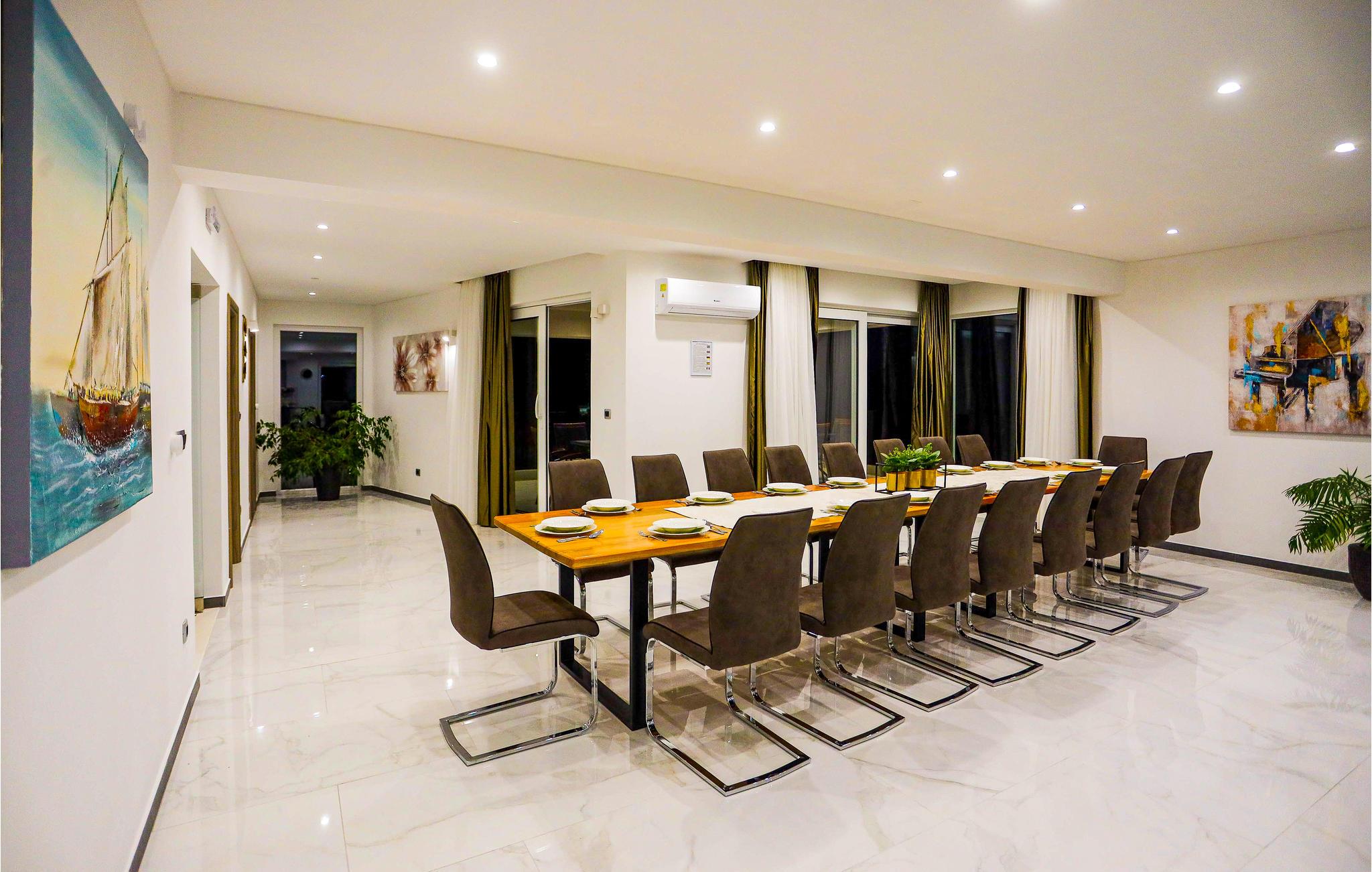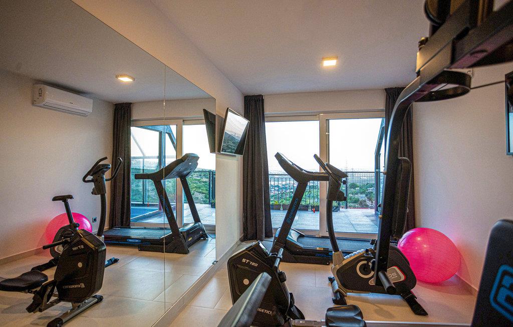 Huset strækker sig over fem etager, der er forbundet med elevator og er både luksuøst og moderne indrettet. På første sal finder I både fitnessrum, aktivitetsrum og et wellnessområde med opvarmet indendørspool, spabad og en sauna. På anden og tredje sal er der i alt otte soveværelser, hvert med eget bad og panoramaudsigt over havet, byen og øerne.