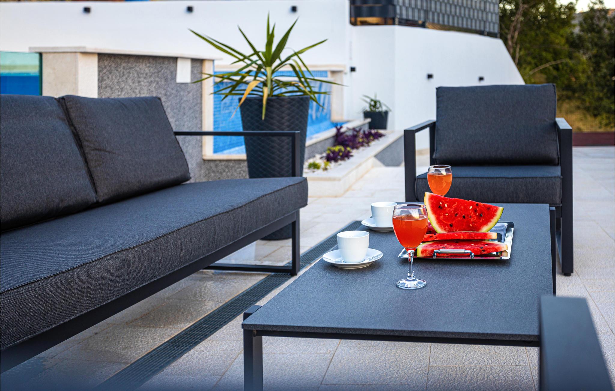 Soveværelse fem rummer et spabad hvorfra der er panoramaudsigt. På fjerde sal er der en terrasse med udendørs pool, grill og et udendørs køkken. På øverste etage ligger der en terrasse med et stort spabad. Huset ligger i dejligt rolige omgivelser med mange pinjetræer og velduftende mediterrane planter.
