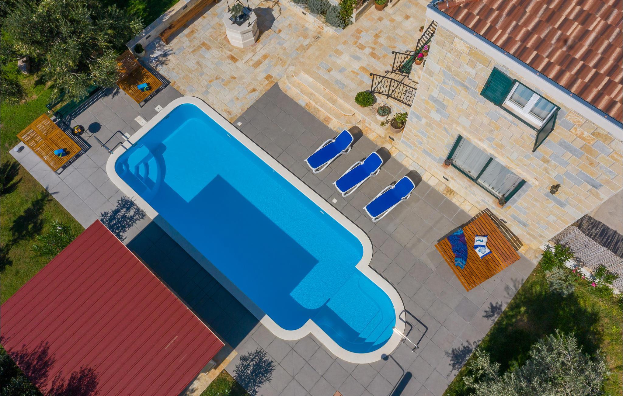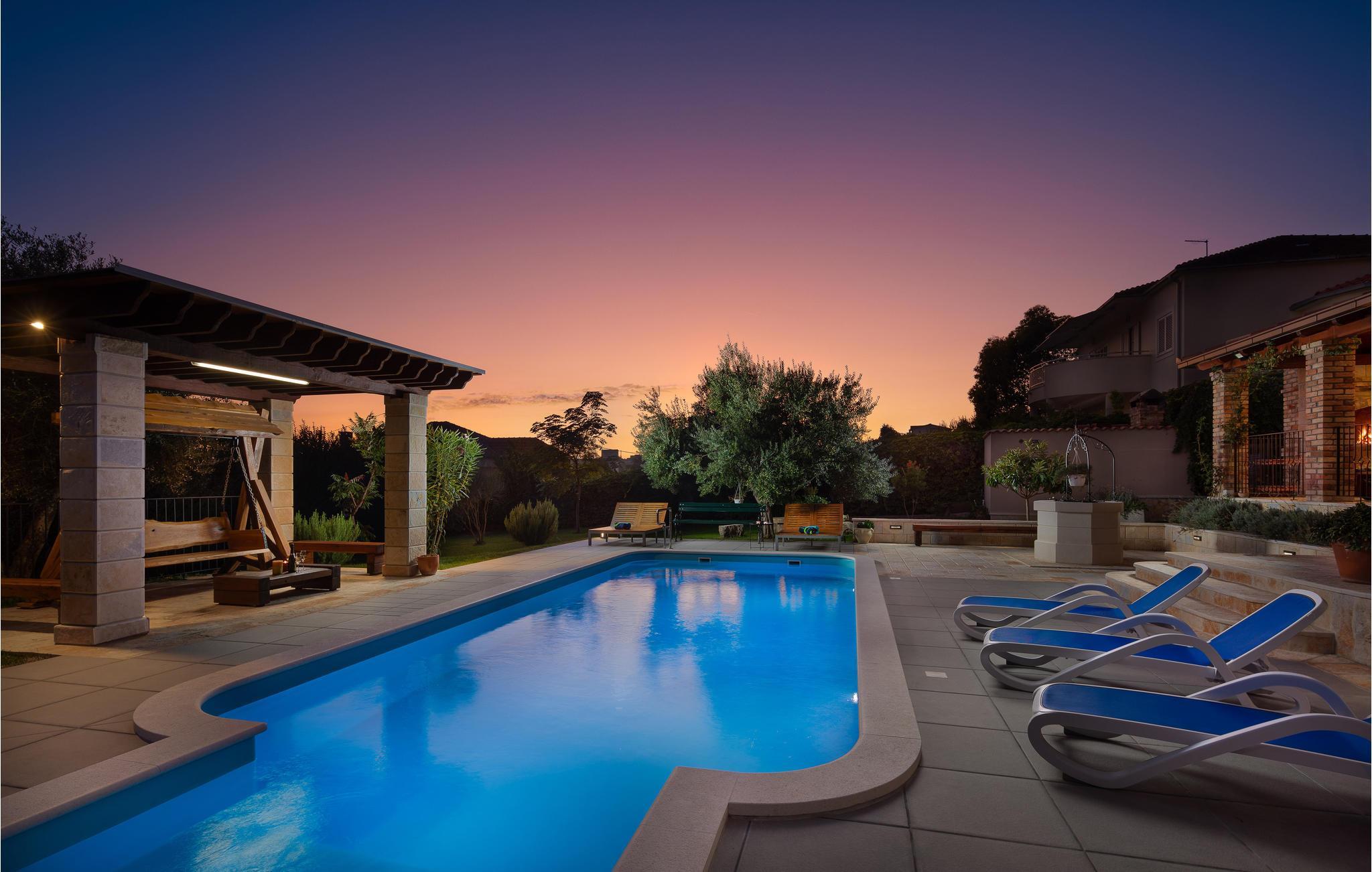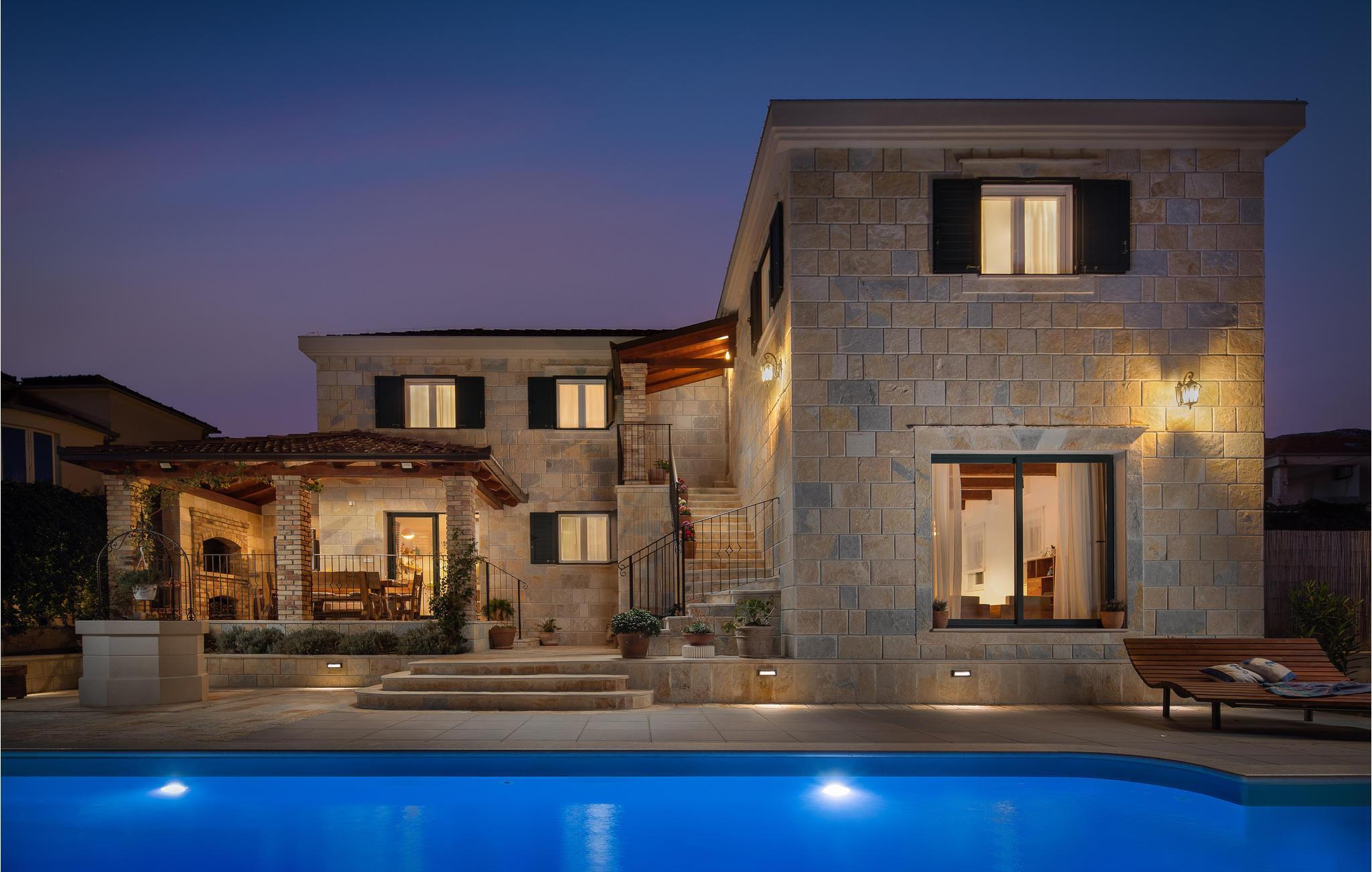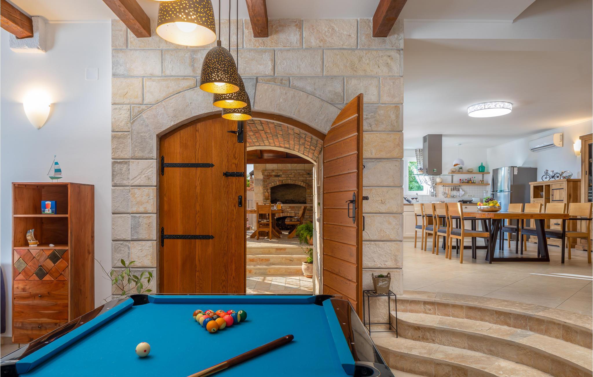 I vågner op i strålende solskin og har alle muligheder åbne. Tilbring et par timer med at plaske rundt i den store udendørs swimmingpool og sole jer fra liggestolene. Foretrækker I stranden, så kan I bade i Adriaterhavets glitrende vand ved grusstranden 2 km fra huset. Eller hvad med et par timers golf eller en vandretur under den bagende sol? Når I har brug fra en pause fra solen, er huset med dets store, rummelige og veludstyrede lokaler det perfekte sted at slappe af.