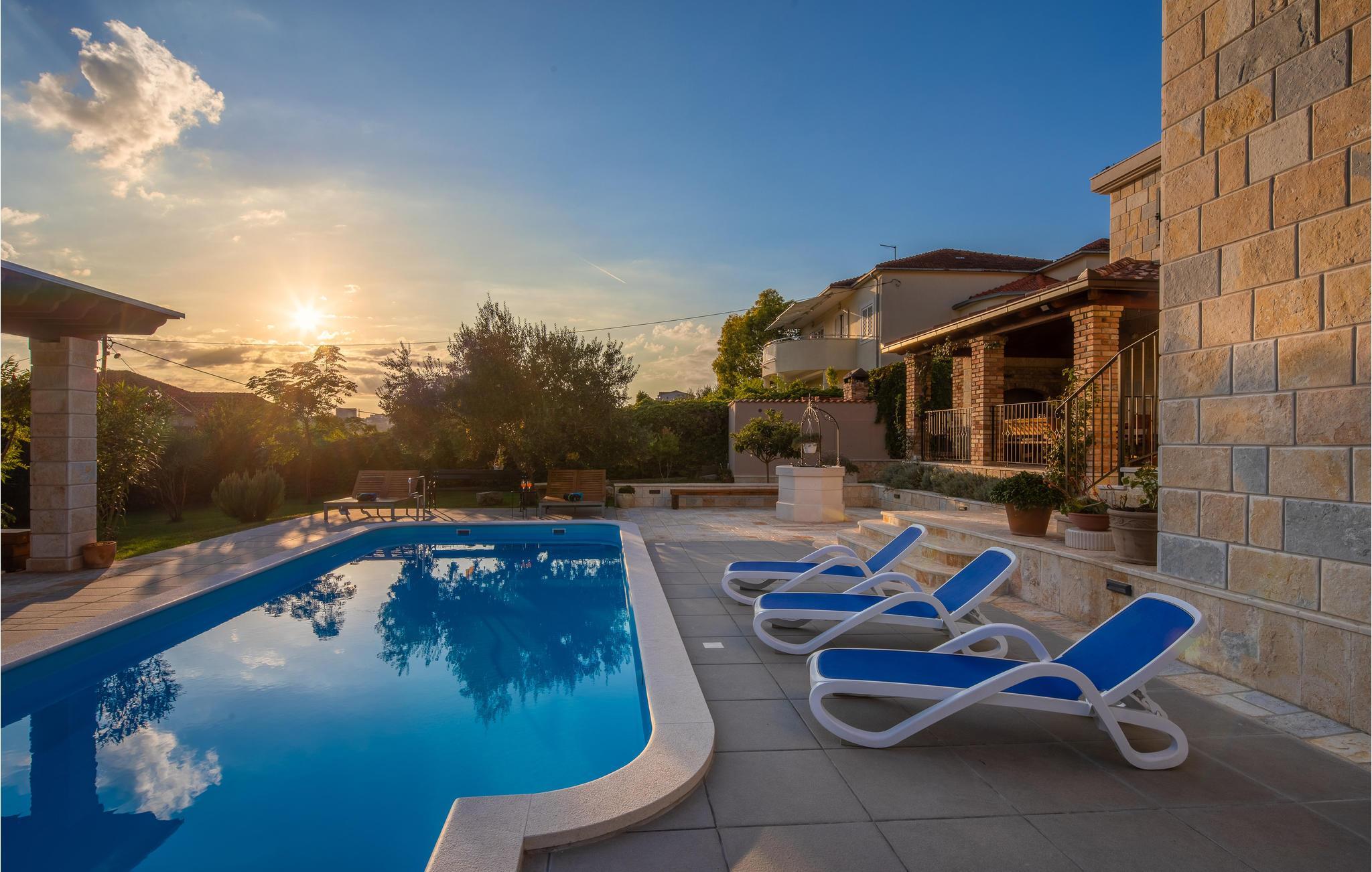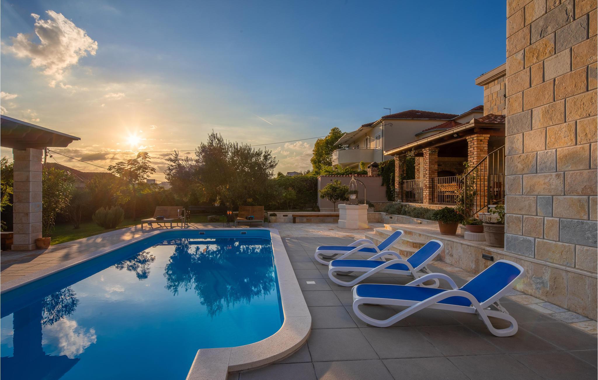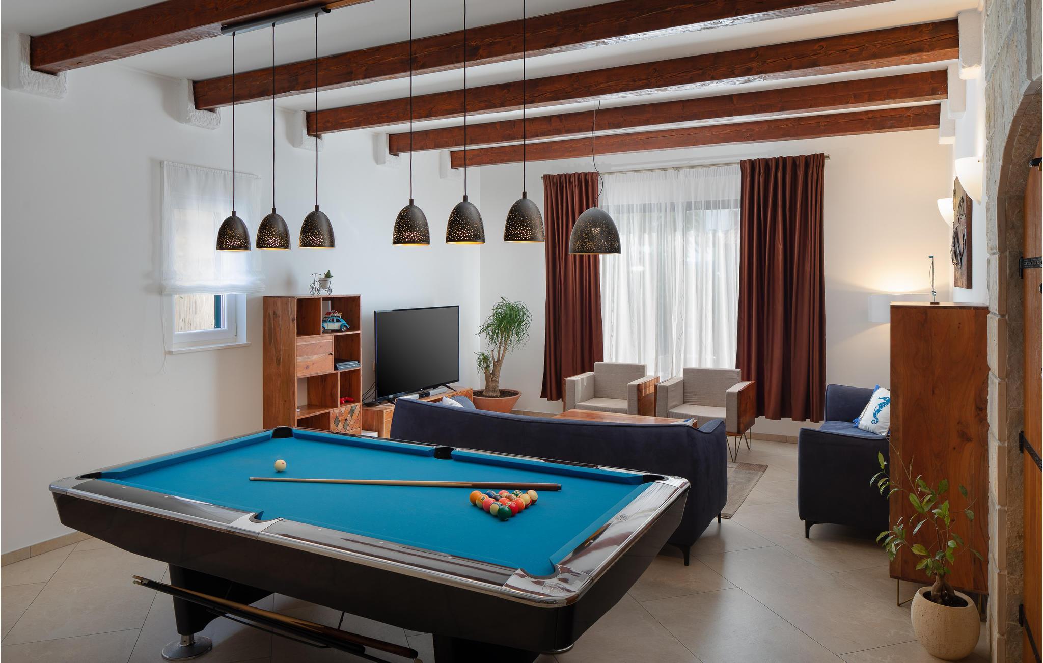 I vågner op i strålende solskin og har alle muligheder åbne. Tilbring et par timer med at plaske rundt i den store udendørs swimmingpool og sole jer fra liggestolene. Foretrækker I stranden, så kan I bade i Adriaterhavets glitrende vand ved grusstranden 2 km fra huset. Eller hvad med et par timers golf eller en vandretur under den bagende sol? Når I har brug fra en pause fra solen, er huset med dets store, rummelige og veludstyrede lokaler det perfekte sted at slappe af.