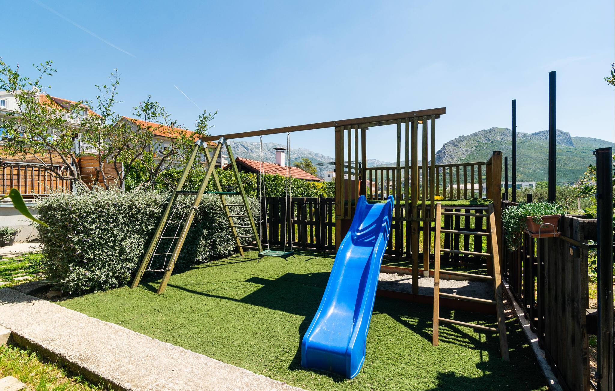 Denne skønne ferielejlighed ligger i et dobbelthus i den lille by Zrnovnica ikke langt fra Split. Huset fordeler sig på tre etager og er perfekt til flere der gerne vil holde ferie sammen. Stueplan og første sal er forbundet med indre trappe, mens øverste etage har adgang udefra. I haven er der grill, legehjørne og pool til skønne svømmeture og vandleg. I byen Stobrec er der skønne strande ud til det klare Adriaterhav. Besøg også byen Split, hvis gamle bydel er fuld af spændende arkitektur og hvor der er en dejlig mediterran livsstil der får jer til at slappe af. Husets smalle vindeltrappe er hverken egnet til små børn eller til ganghandicappede.