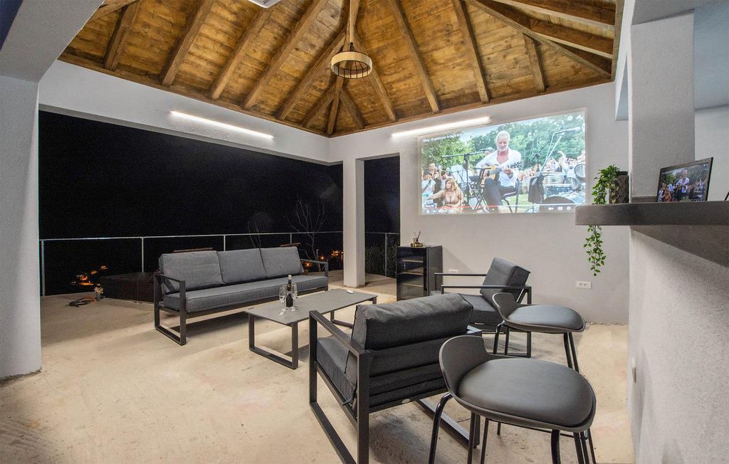 Ved poolen er der et flot loungeområde til afslapning med overdækket terrasse, som er udstyret med køleskab, vask, bar med stole, projektor, højttalere, hyggelig udendørsbelysning og behagelige siddepladser. Her kan I tilbringe hyggelige stunder sammen som familie.