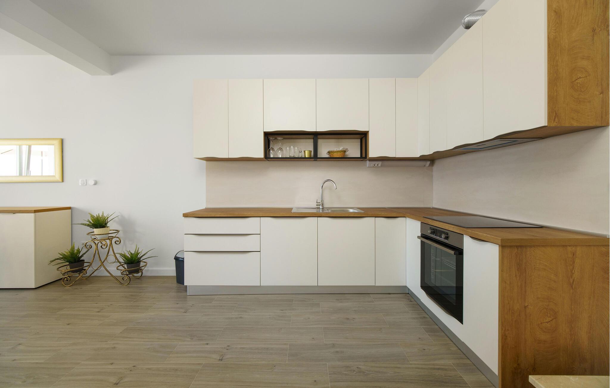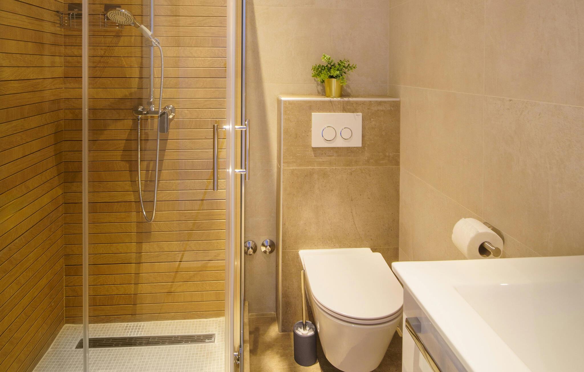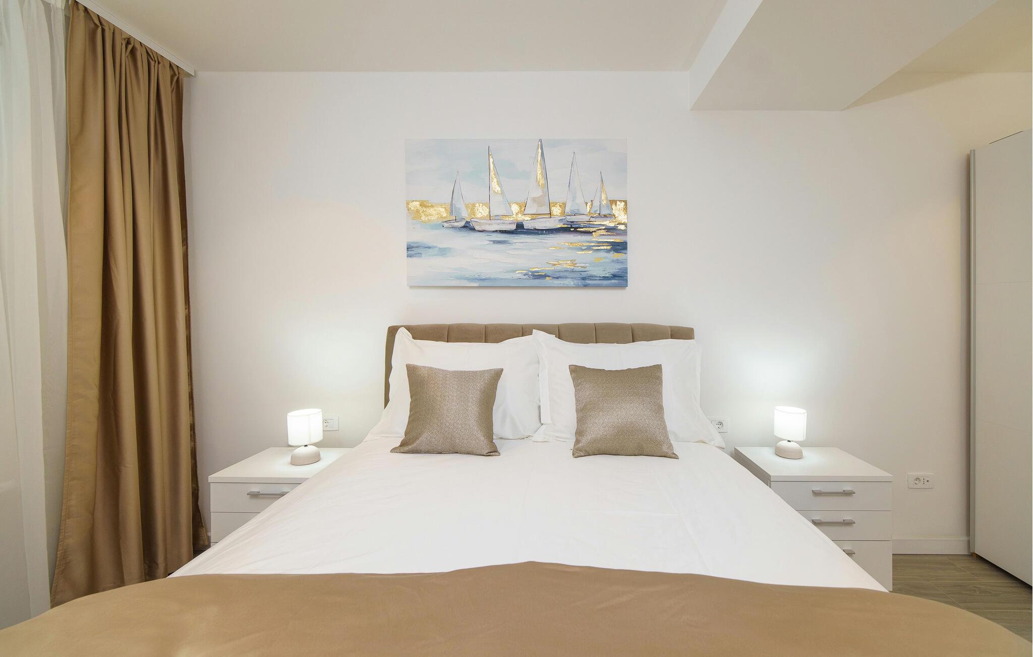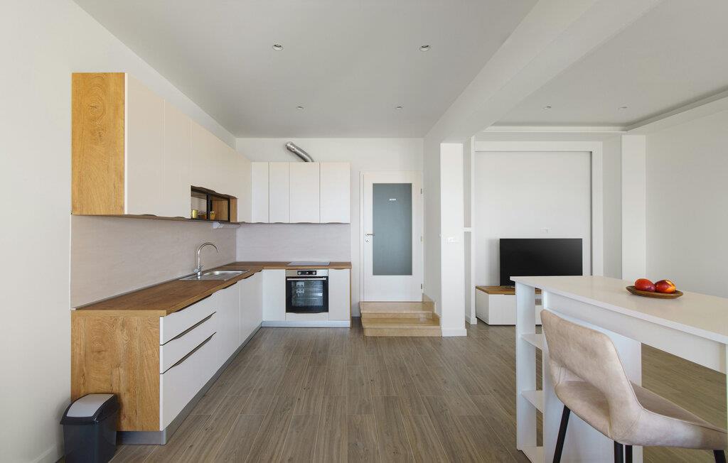 Træd ind i det lyse og stilfulde interiør i denne ferielejlighed, og føl jer hjemme. Find jer til rette i den åbne stue og spisestue med en behagelig sofa, et moderne spisebord og store vinduer, der lukker masser af naturligt lys ind. Tilbered jeres måltider i det veludstyrede køkken og tilbring rolige aftener i en behagelig atmosfære.