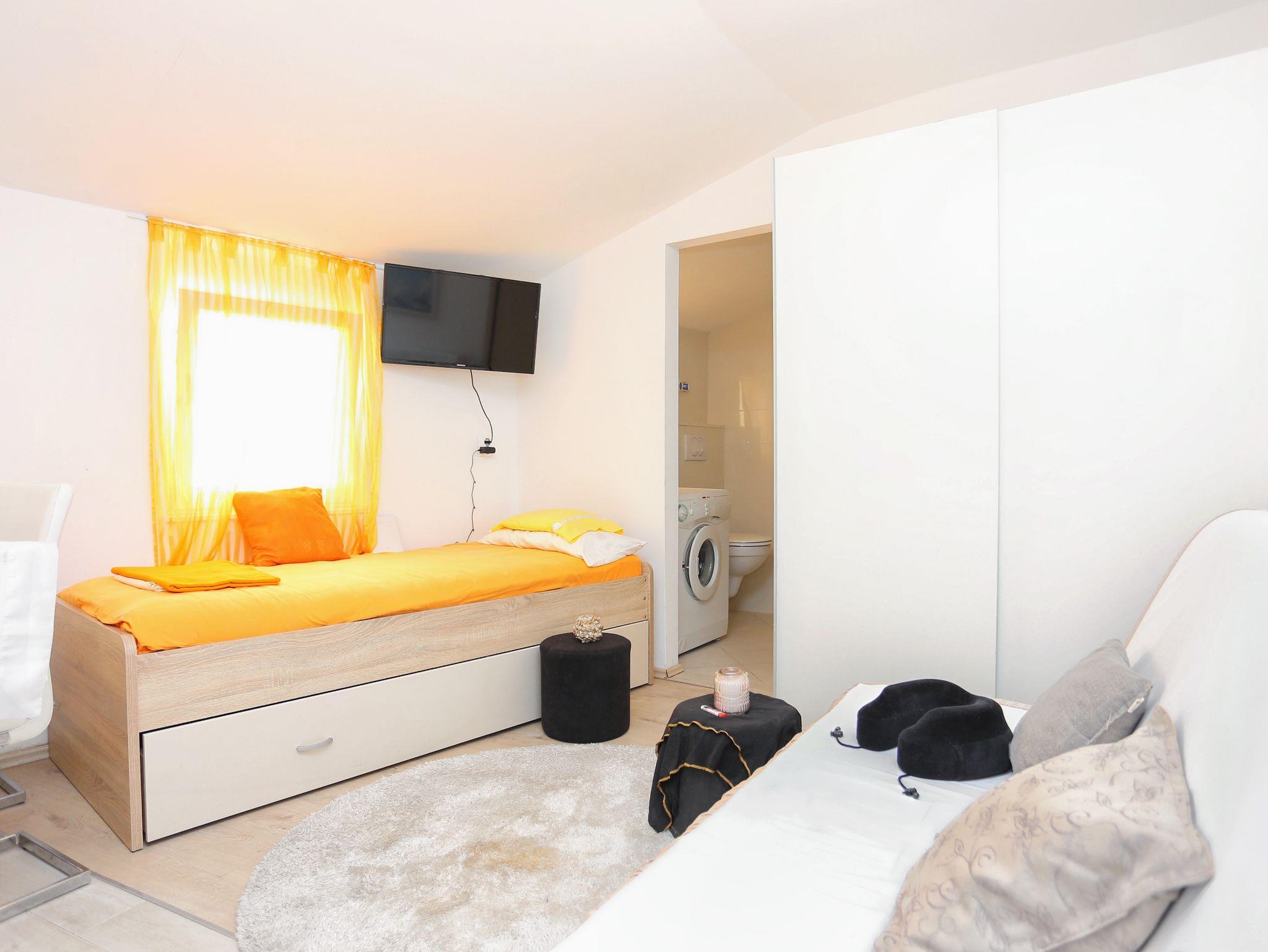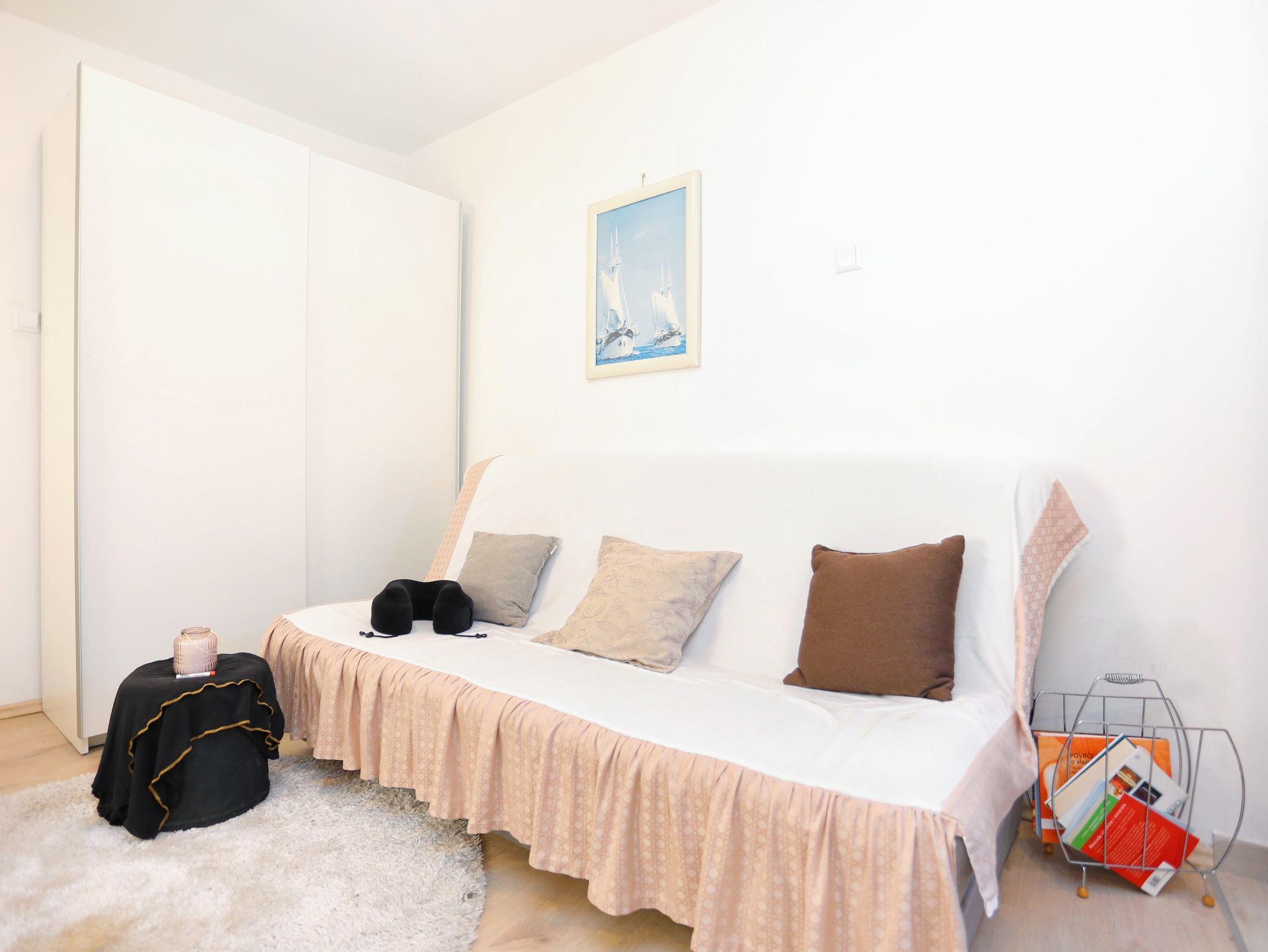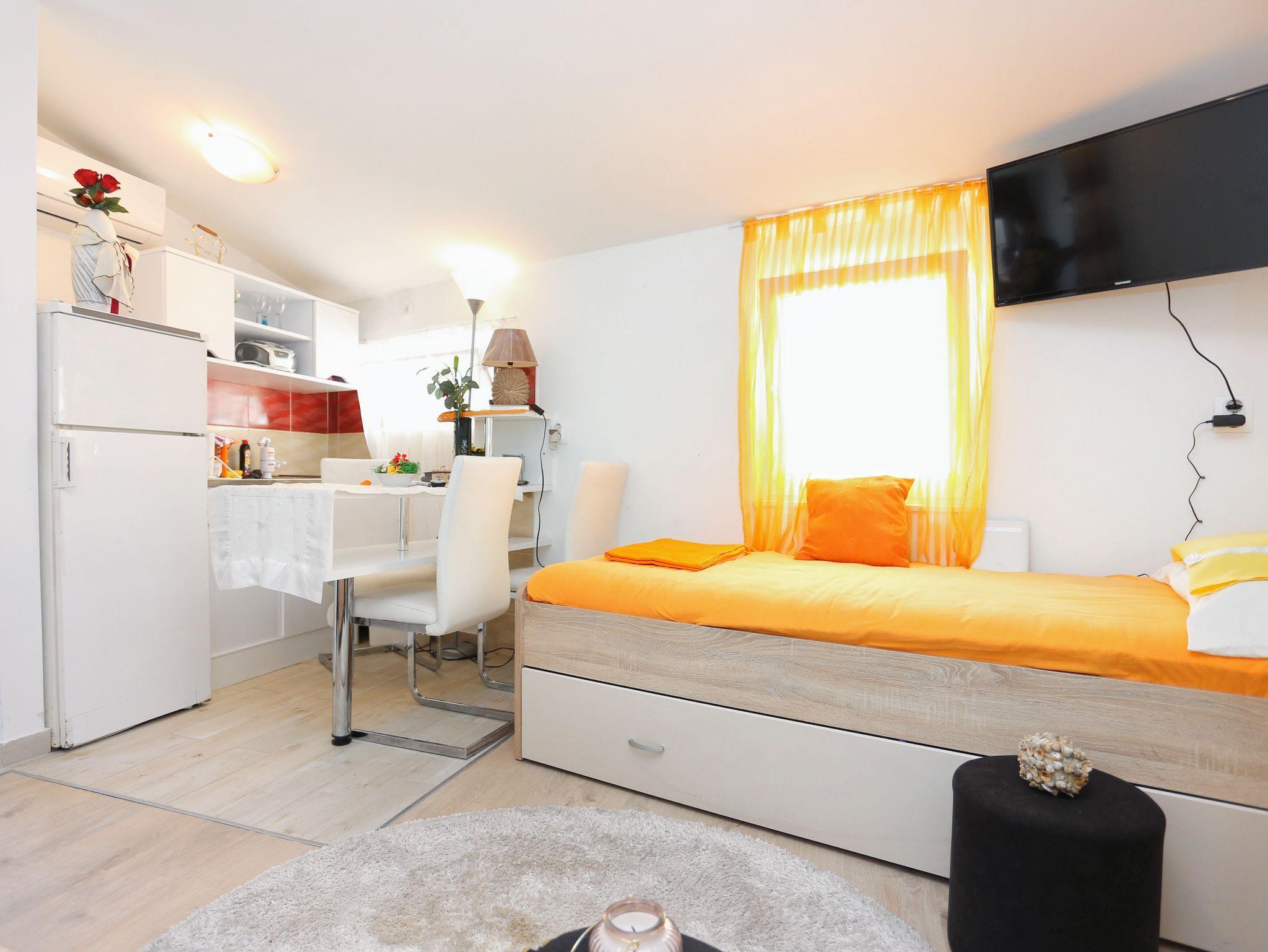 Studio bietet Platz für 3 Gäste. Die Betten sind in Schlafzimmern, die es 1 gibt, innerhalb einer Gesamtfläche von 22m2, angeordnet. Es ist erlaubt, Speisen auf dem Gemeinschafts-Grill vorzubereiten. Die reservierte Unterkunftseinheit hat keinen Balkon und keine Terrasse. IM PREIS INBEGRIFFEN: Kurtaxe, Endreinigung, Klimatisierung, Internet, Bügeleisen, Bügelbrett, Föhn. VERBINDLICHE ZUSÄTZLICHE KOSTEN: Aufzahlung für Kurzaufenthalte (prozentualer Zuschlag pro Nächtigungsanzahl: 30% - 1, 20% - 2, 10% - 3). Die Verfügbarkeit zusätzlicher Dienstleistungen in Ihrem reservierten Termin und die Preise derselben (falls nicht aufgeführt) müssen im Voraus überprüft werden. Zusätzliche Dienstleistungen die in der Zahlungsaufforderung nicht aufgeführt sind werden direkt beim Vermieter bezahlt, angenommen der Gast nutzt auch diese. Ermäßigung auf den Grundpreis: Gratistag 14=13 (bei einem Aufenthalt von 14 Tagen oder mehr erhalten Sie einen Gratistag für den Aufenthalt bis 31.12.26).
