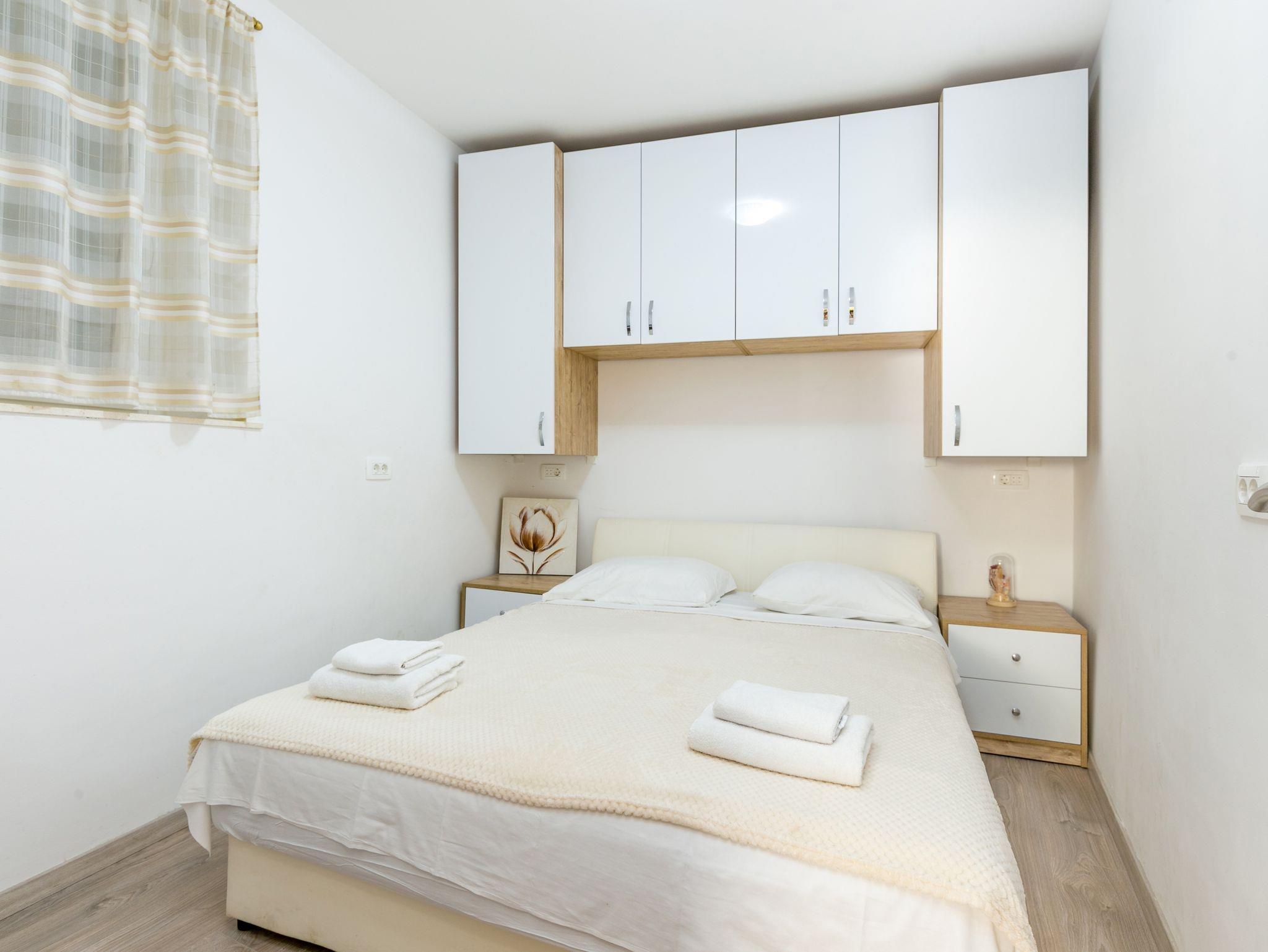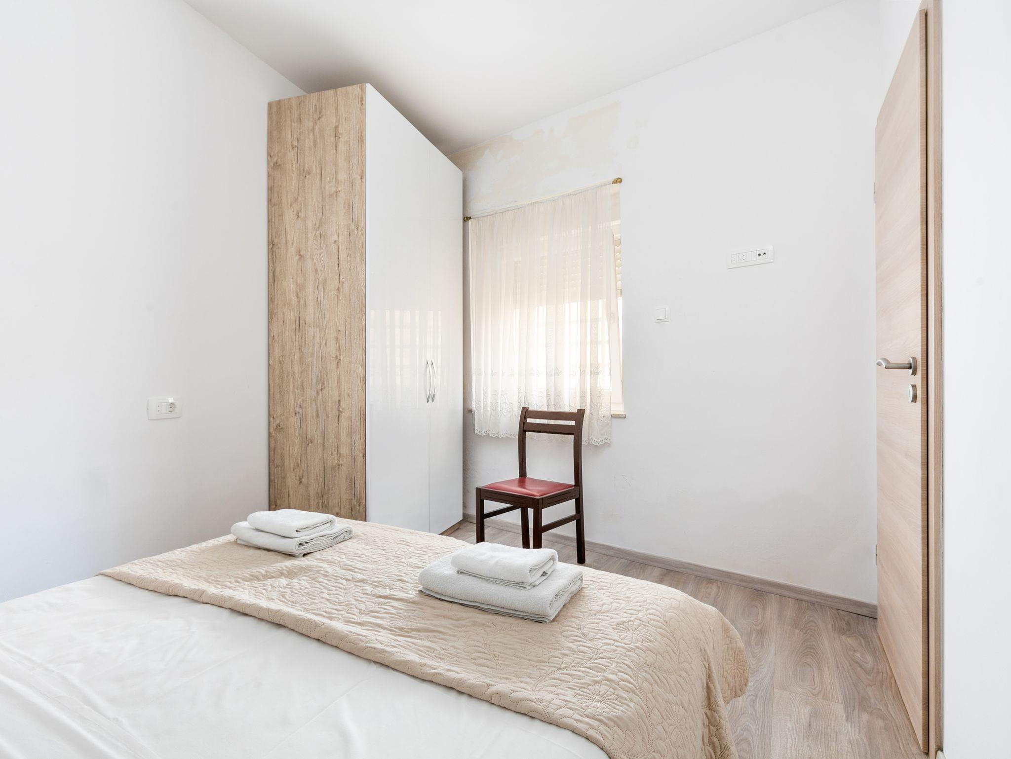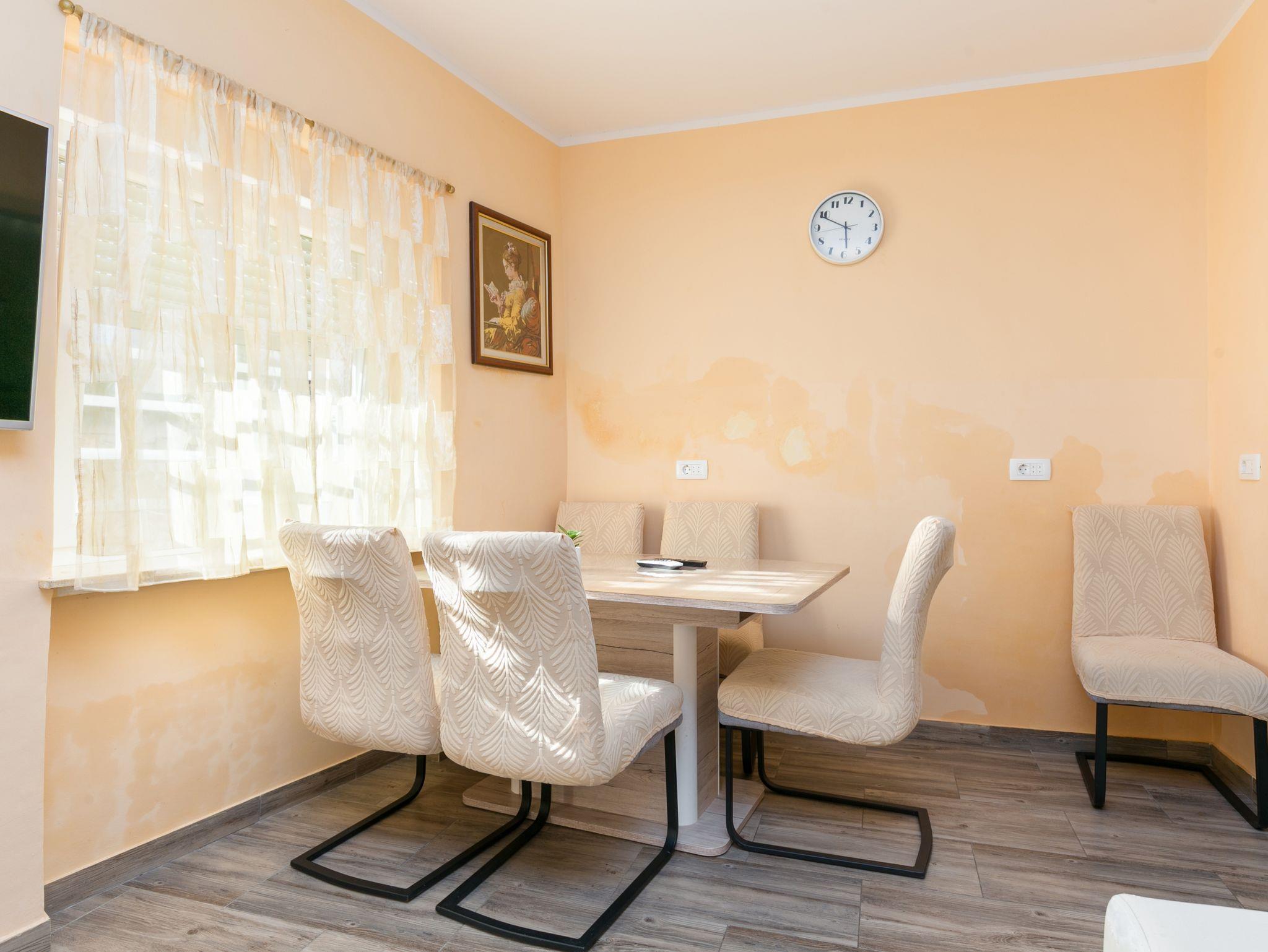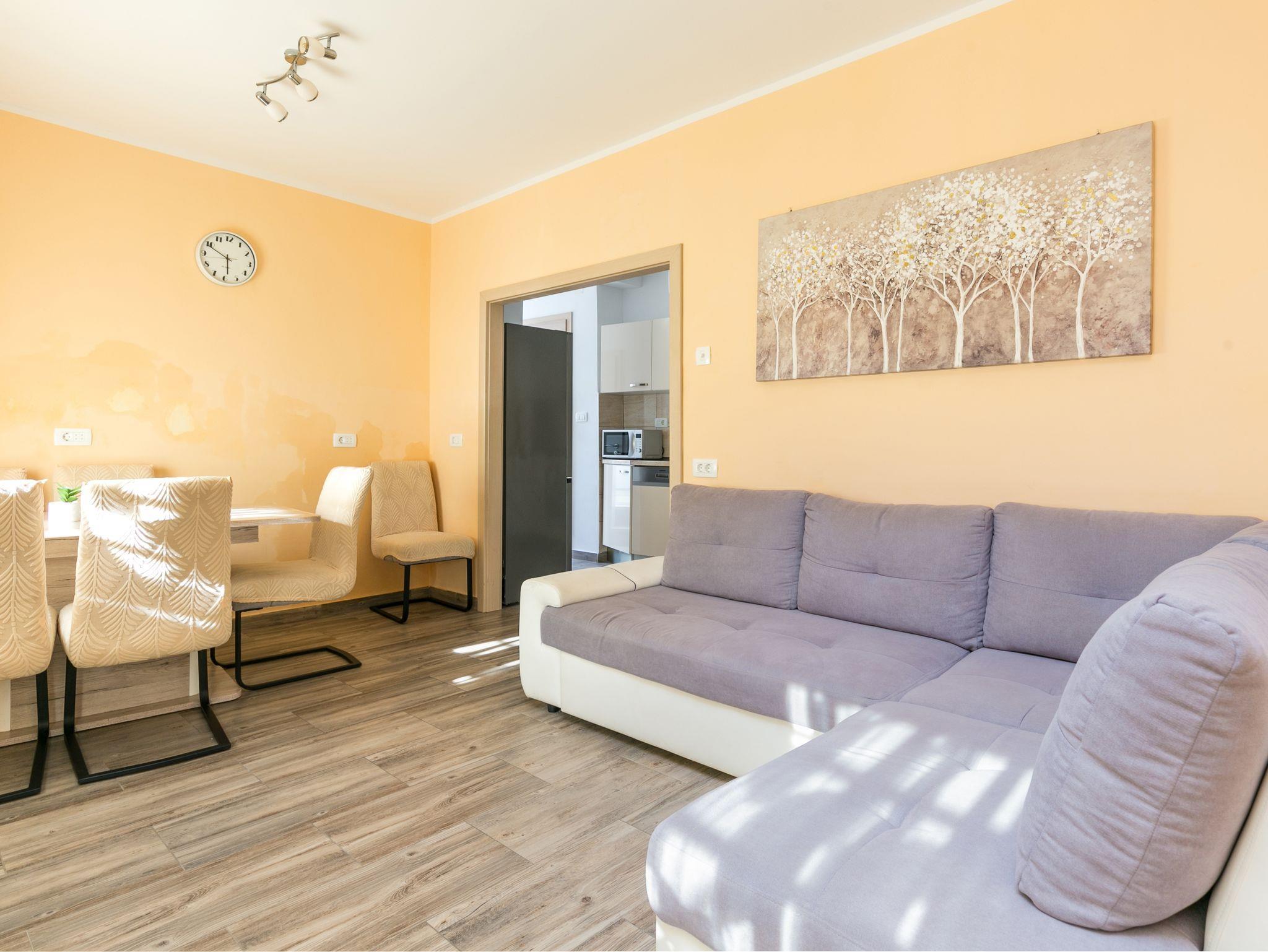 Ferienwohnung bietet Platz für 5 Gäste. Die Betten sind in Schlafzimmern, die es 2 gibt, und in Wohnzimmer, innerhalb einer Gesamtfläche von 42m2, angeordnet. Die Gäste haben eine eigene Terrasse zur Verfügung, auf der sie in warmen Sommernächten genießen können. Für vollen Genuss und Entspannung gibt es einen privaten Grill für Gäste dieser Unterkunft. Durch die Terrasse der gebuchten Unterkunftseinheit gehen auch andere Gäste oder Vermieter. IM PREIS INBEGRIFFEN: Kurtaxe, Endreinigung, Klimatisierung, Internet, Wäschewaschen, Bügeleisen. VERBINDLICHE ZUSÄTZLICHE KOSTEN: Aufzahlung für Kurzaufenthalte (prozentualer Zuschlag pro Nächtigungsanzahl: 30% - 1, 20% - 2, 10% - 3). Die Verfügbarkeit zusätzlicher Dienstleistungen in Ihrem reservierten Termin und die Preise derselben (falls nicht aufgeführt) müssen im Voraus überprüft werden. Zusätzliche Dienstleistungen die in der Zahlungsaufforderung nicht aufgeführt sind werden direkt beim Vermieter bezahlt, angenommen der Gast nutzt auch diese. Ermäßigung auf den Grundpreis: Gratistag 14=13 (bei einem Aufenthalt von 14 Tagen oder mehr erhalten Sie einen Gratistag für den Aufenthalt bis 31.12.26).