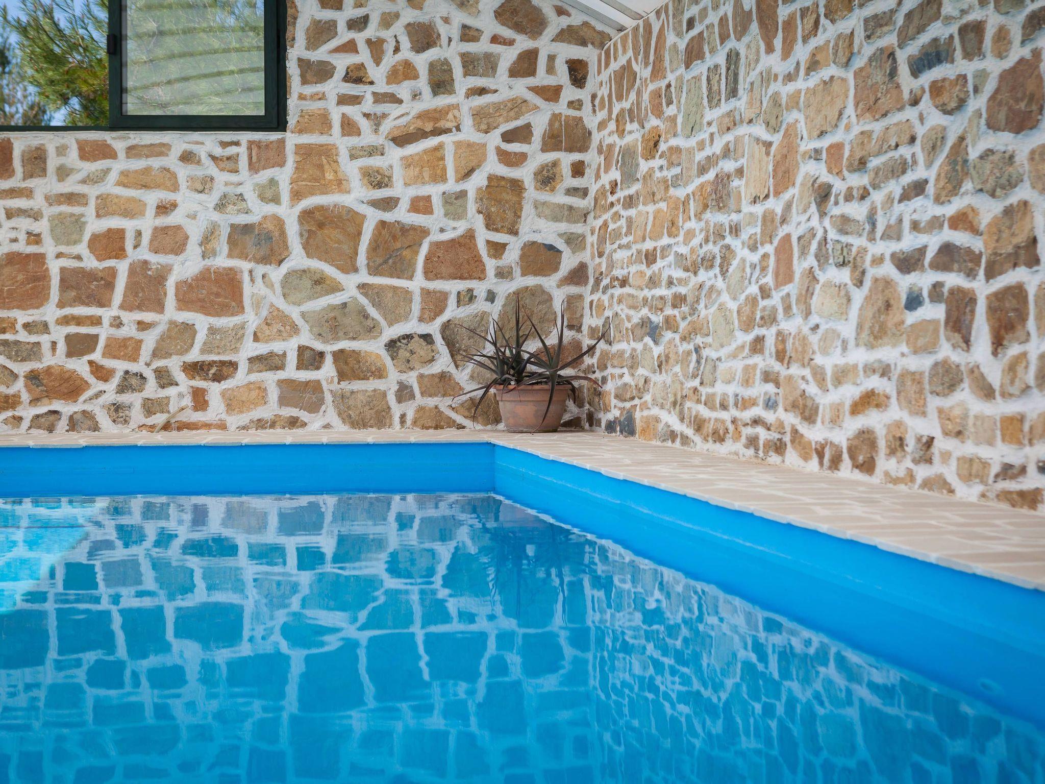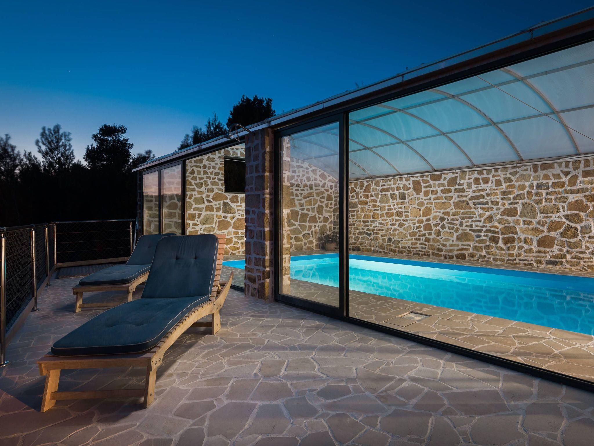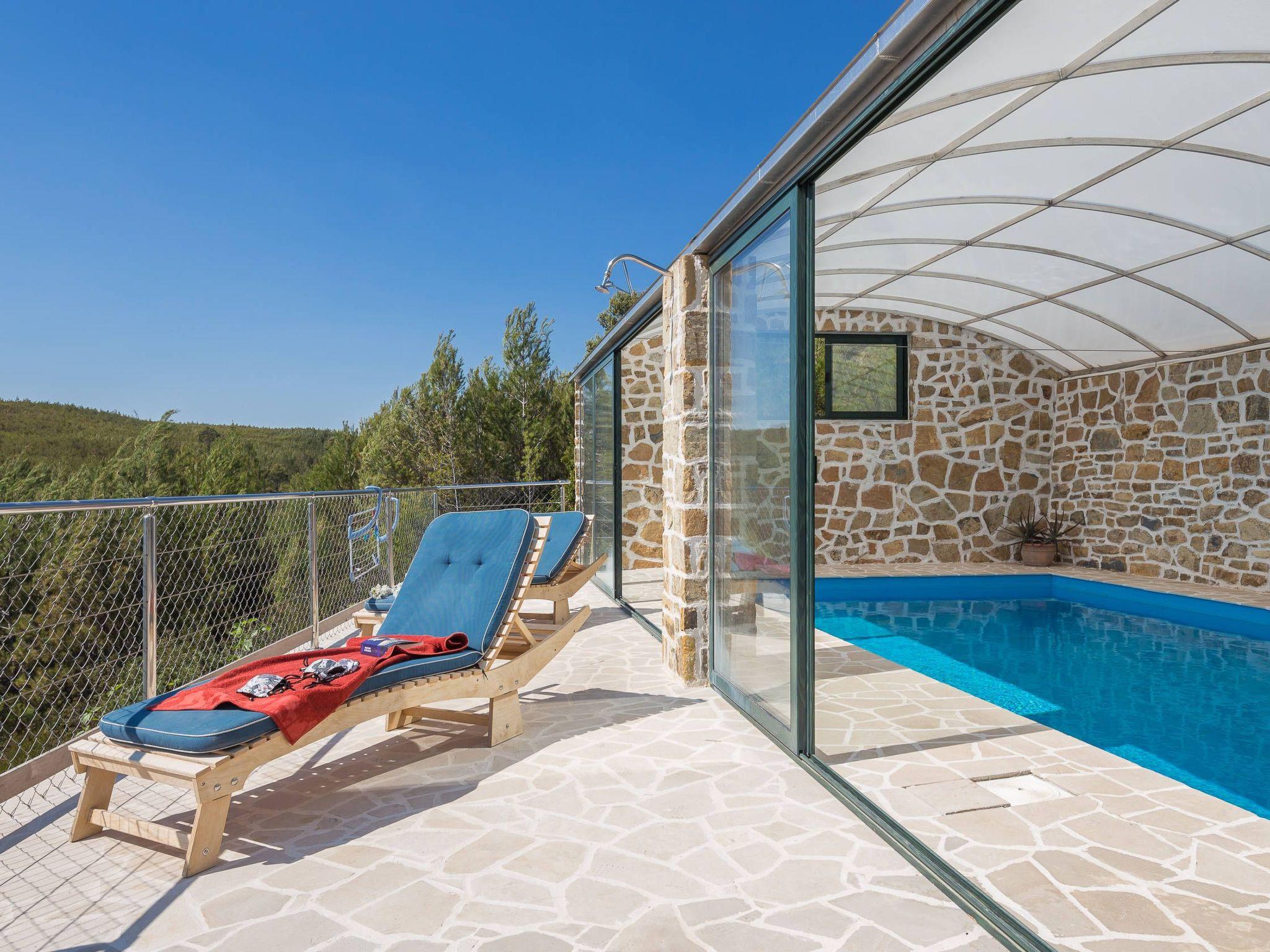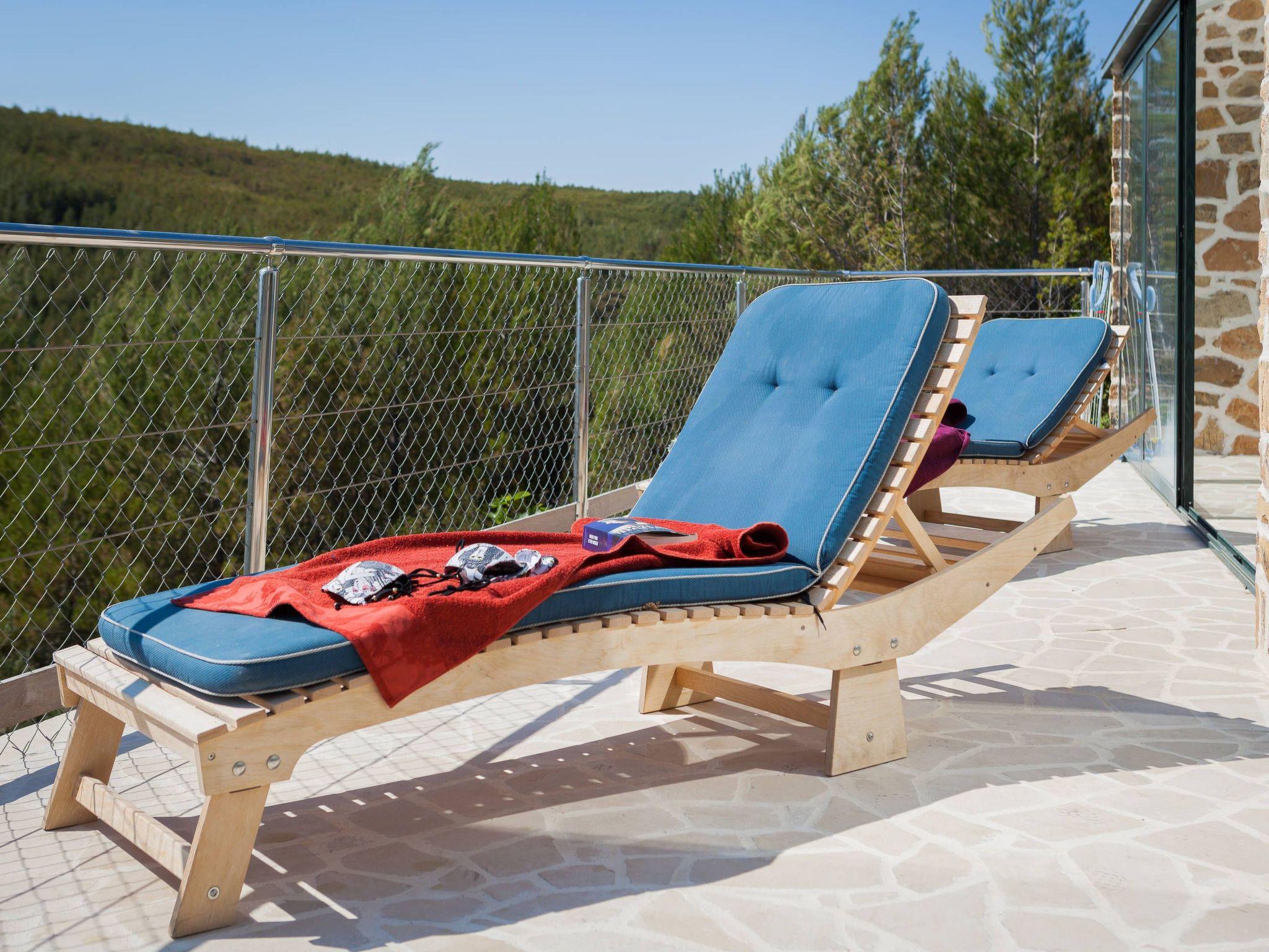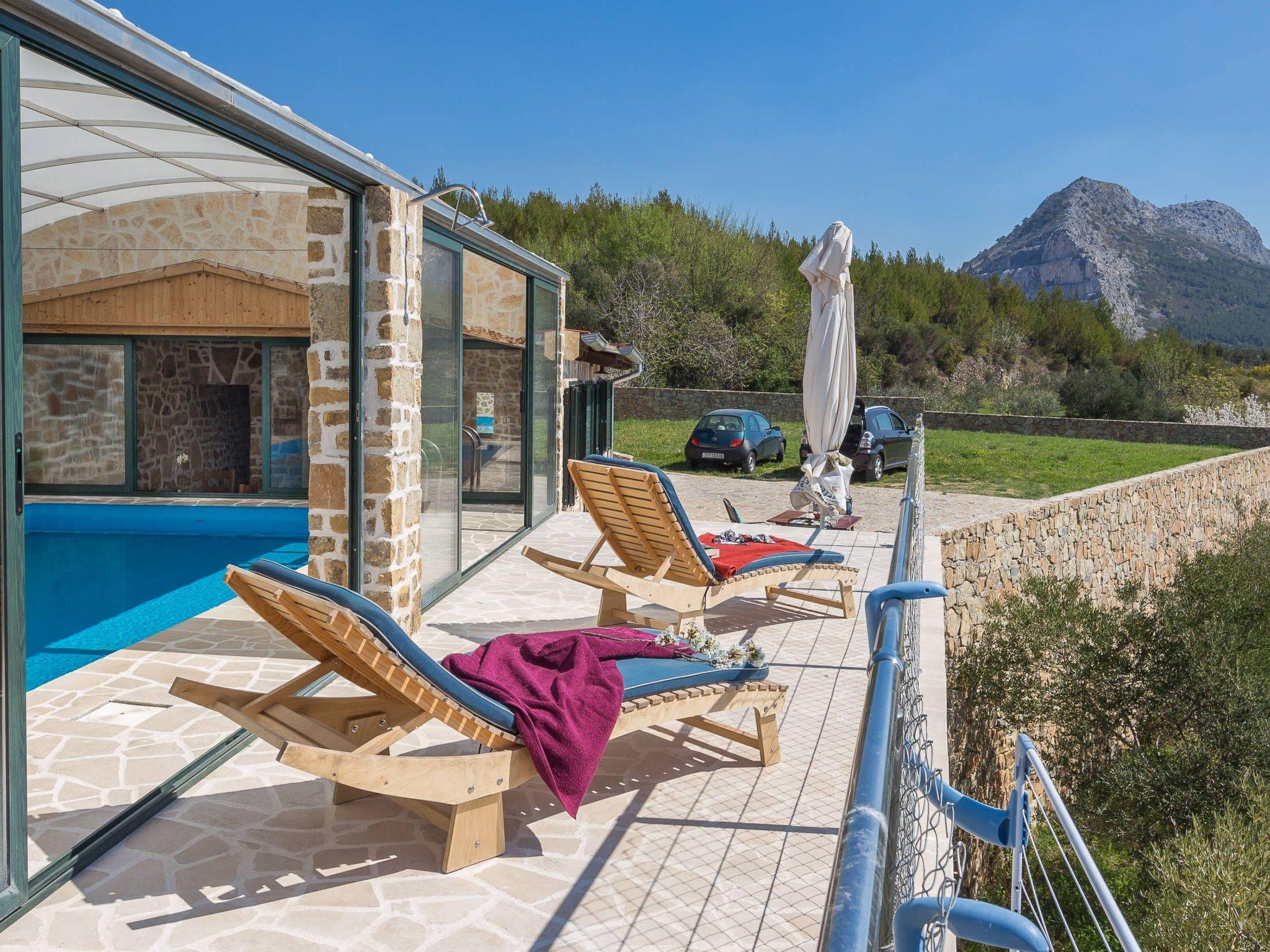 The living room provides direct access to your private indoor pool measuring 4 x 10 metres, with a metal ladder to facilitate entry. The pool area is separated from the sunny terrace by large glass sliding doors. If these are left open then it feels like you are swimming outdoors. After a few rounds, you can relax on the sun loungers on the terrace and enjoy an extensive panoramic view over the mountainous landscape as far as the sea. If you arrive by car than you can use the secure parking spaces right in front of the house.
