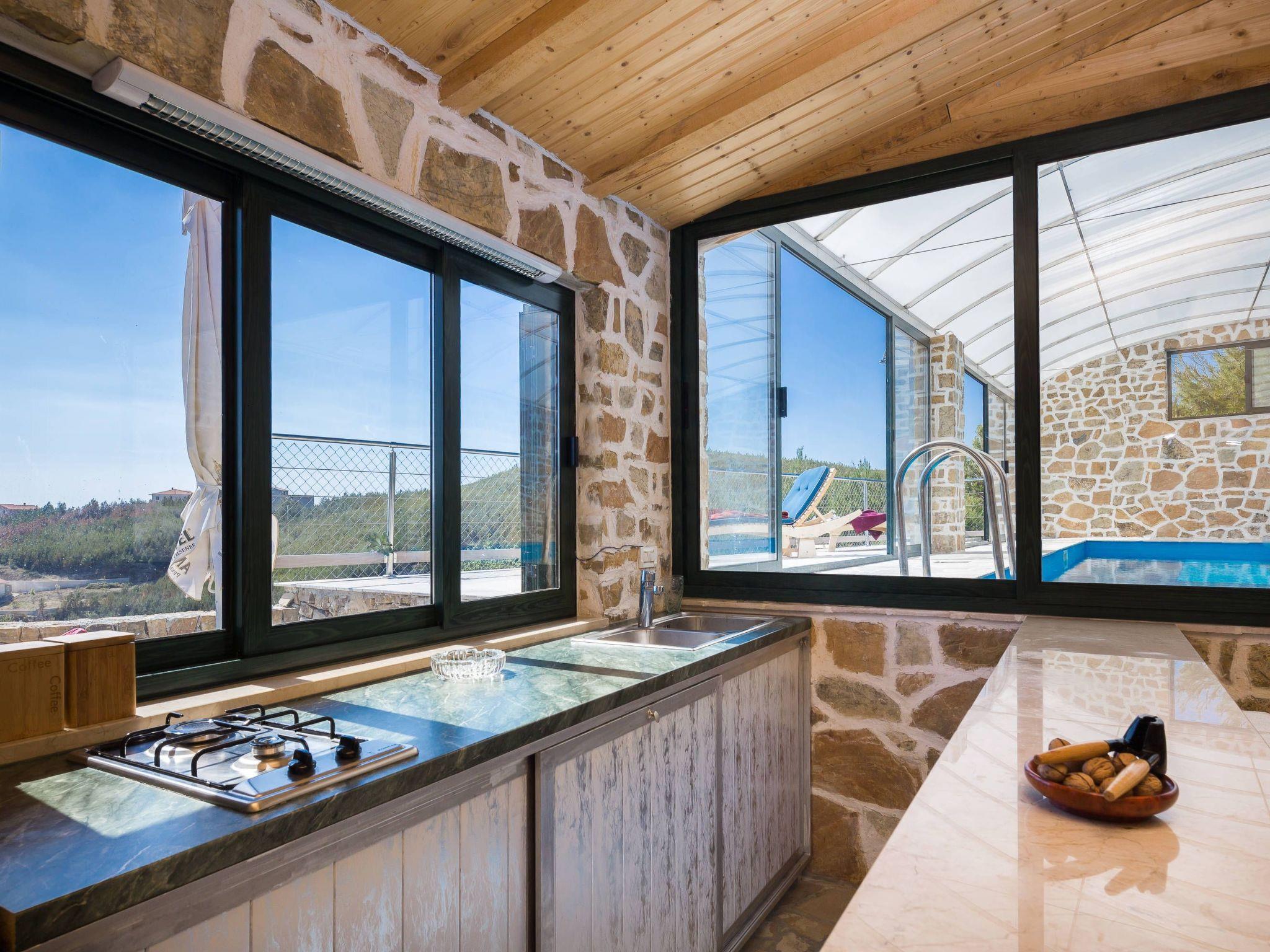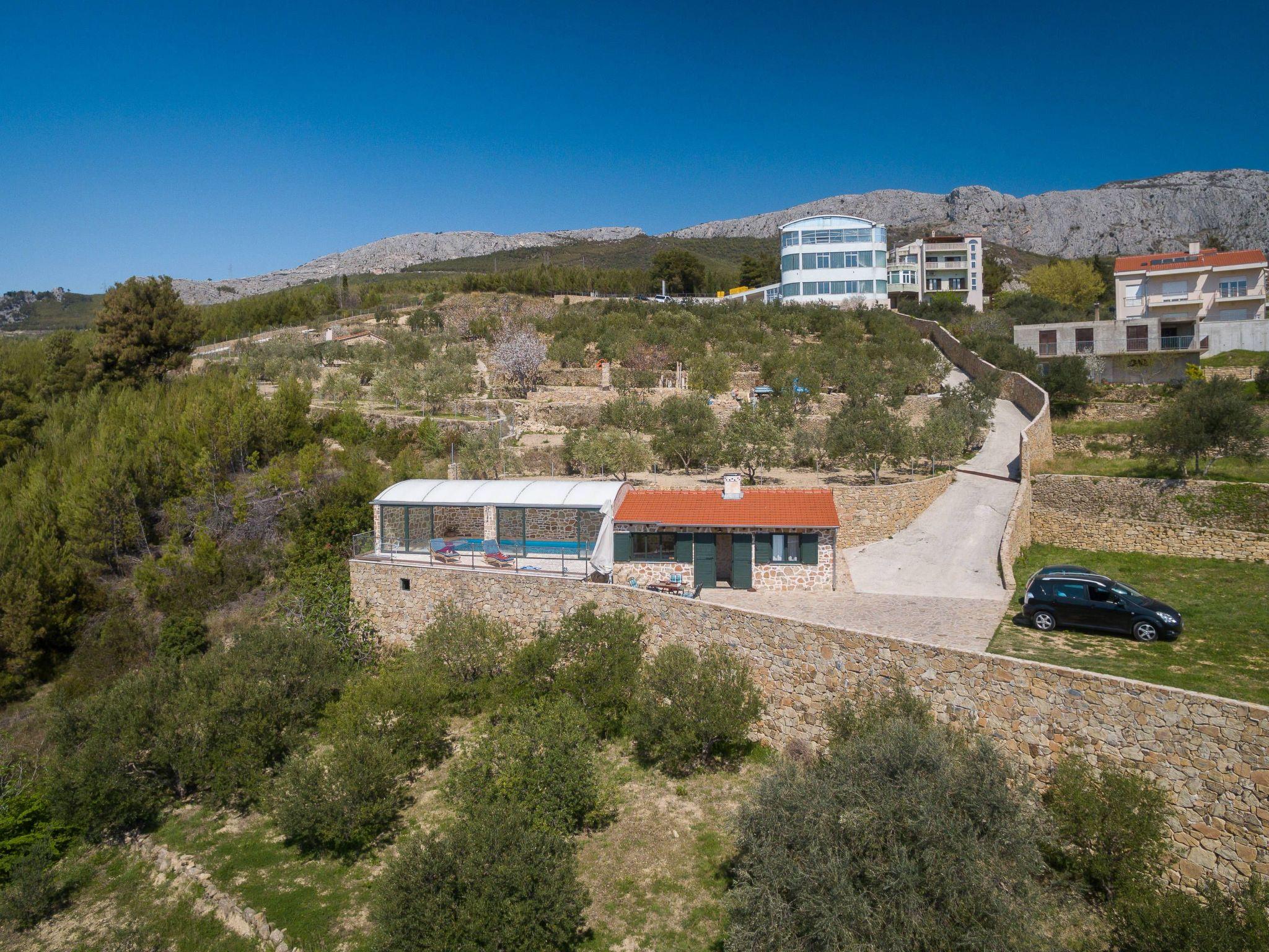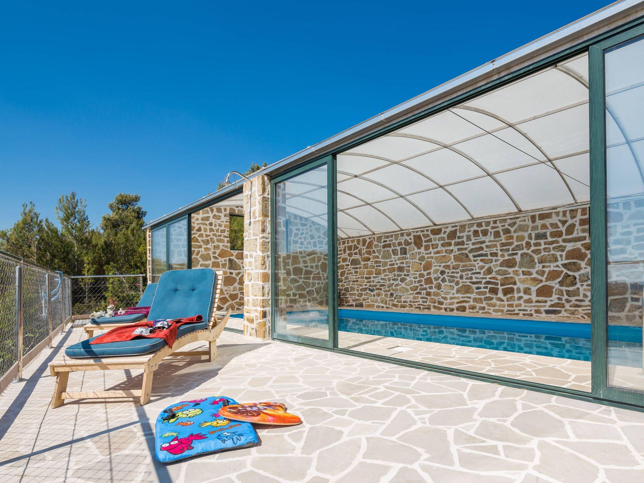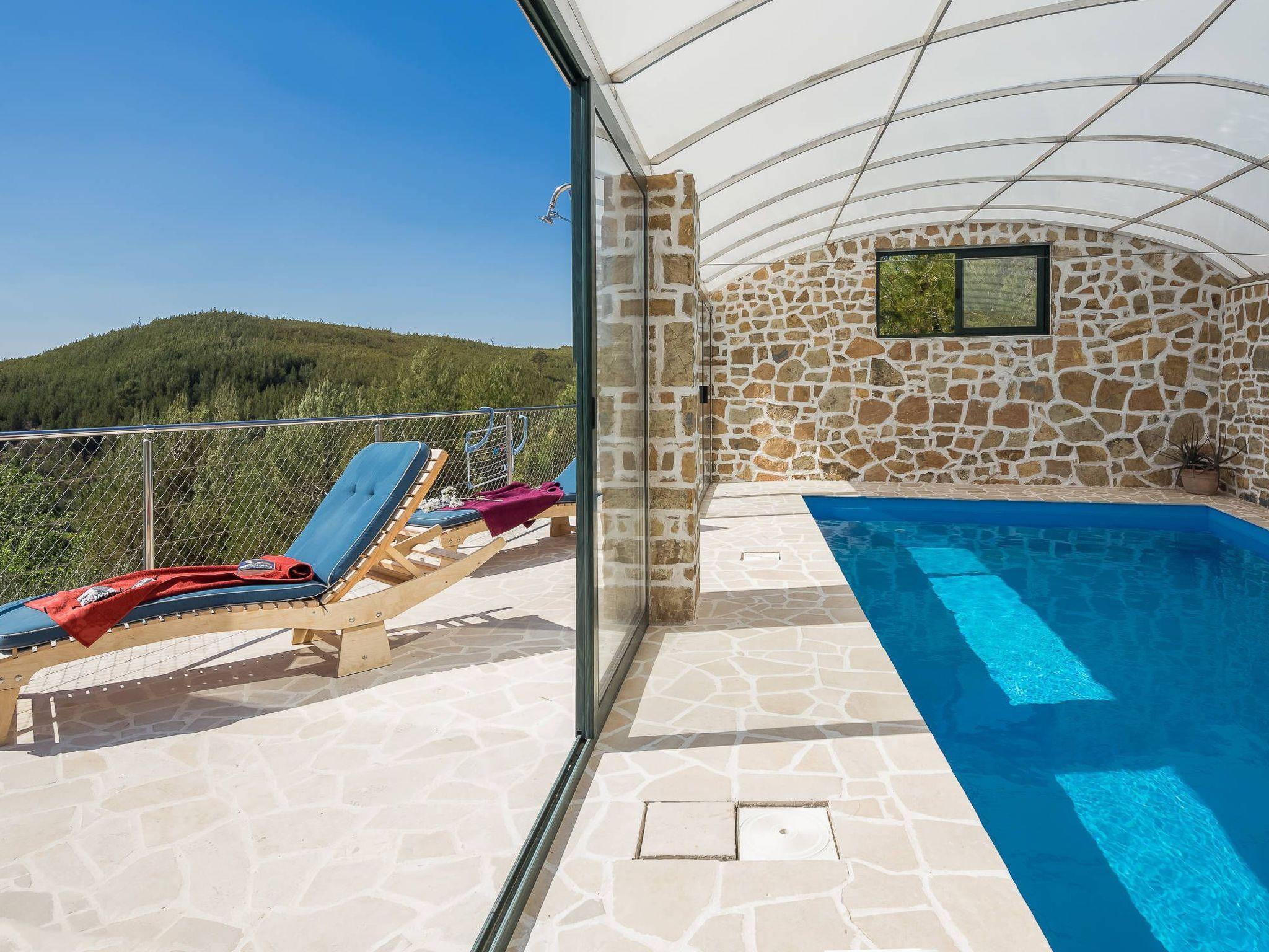 The living room provides direct access to your private indoor pool measuring 4 x 10 metres, with a metal ladder to facilitate entry. The pool area is separated from the sunny terrace by large glass sliding doors. If these are left open then it feels like you are swimming outdoors. After a few rounds, you can relax on the sun loungers on the terrace and enjoy an extensive panoramic view over the mountainous landscape as far as the sea. If you arrive by car than you can use the secure parking spaces right in front of the house.