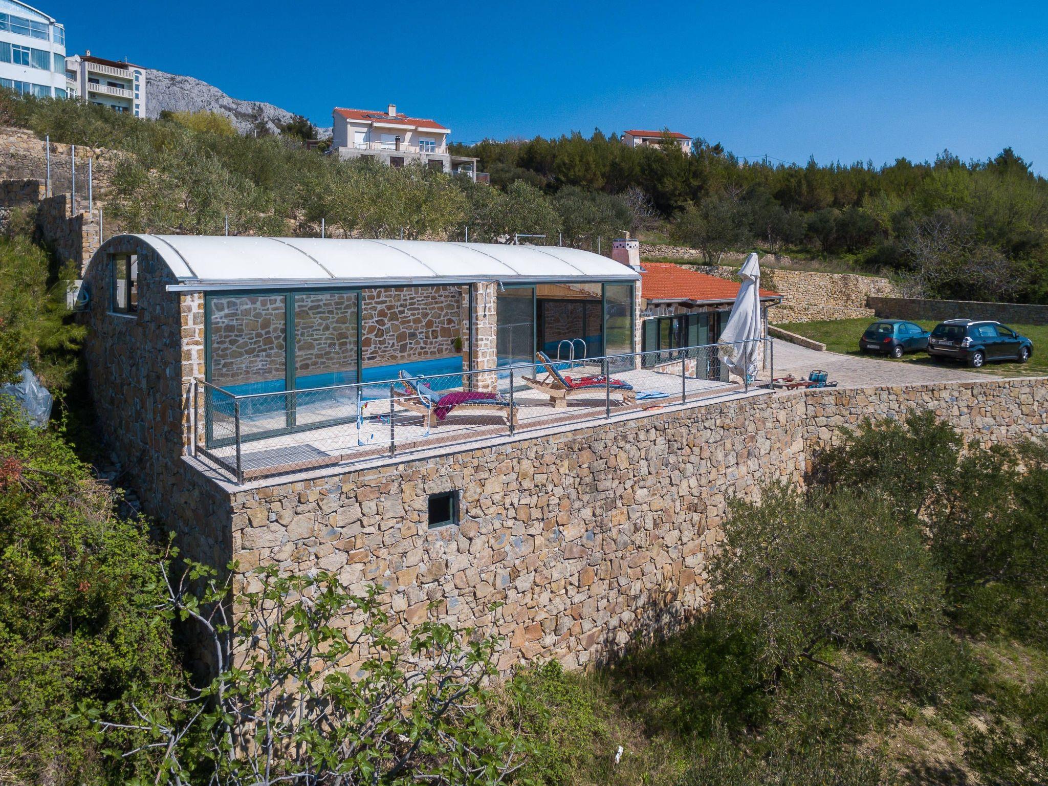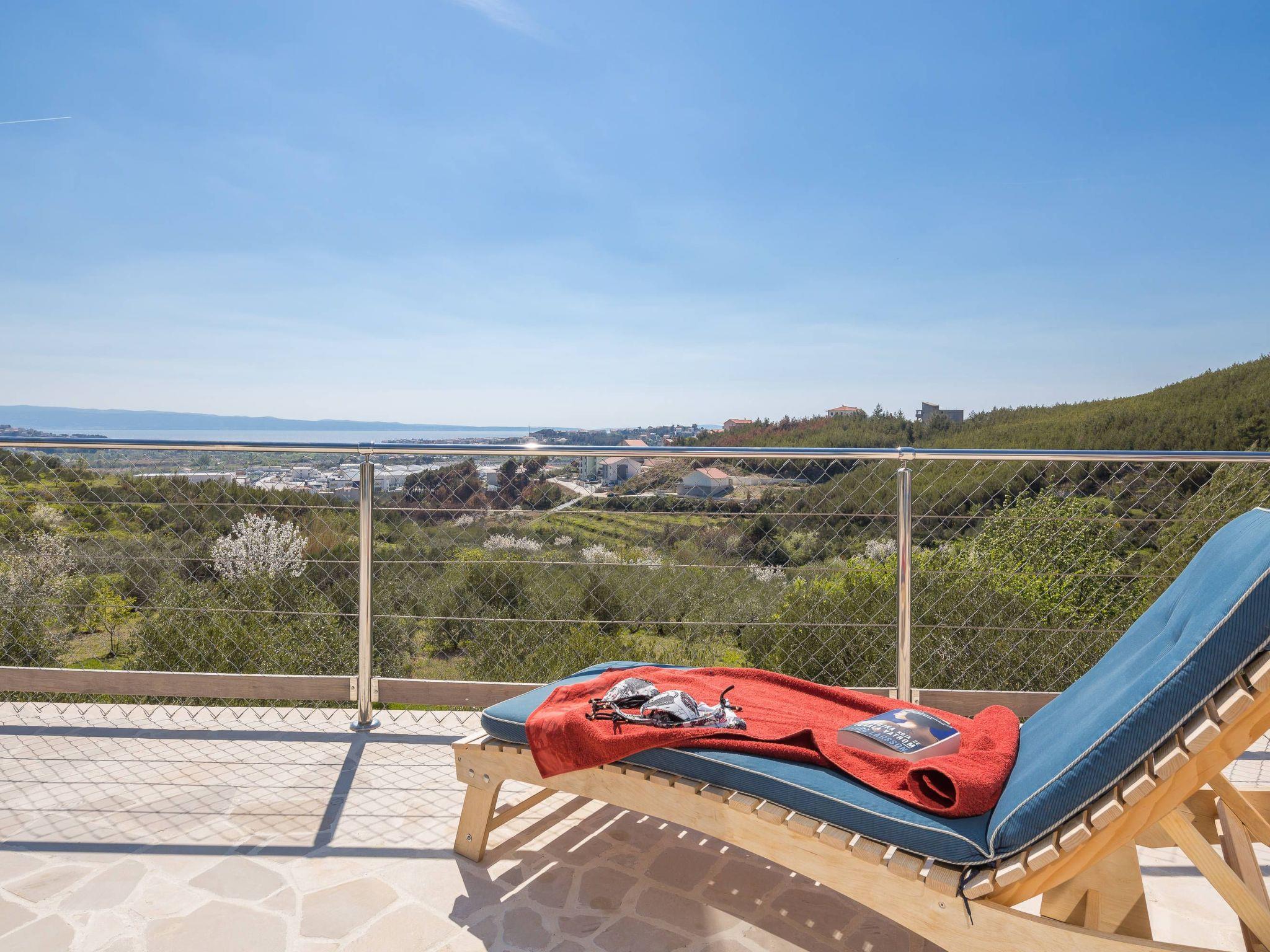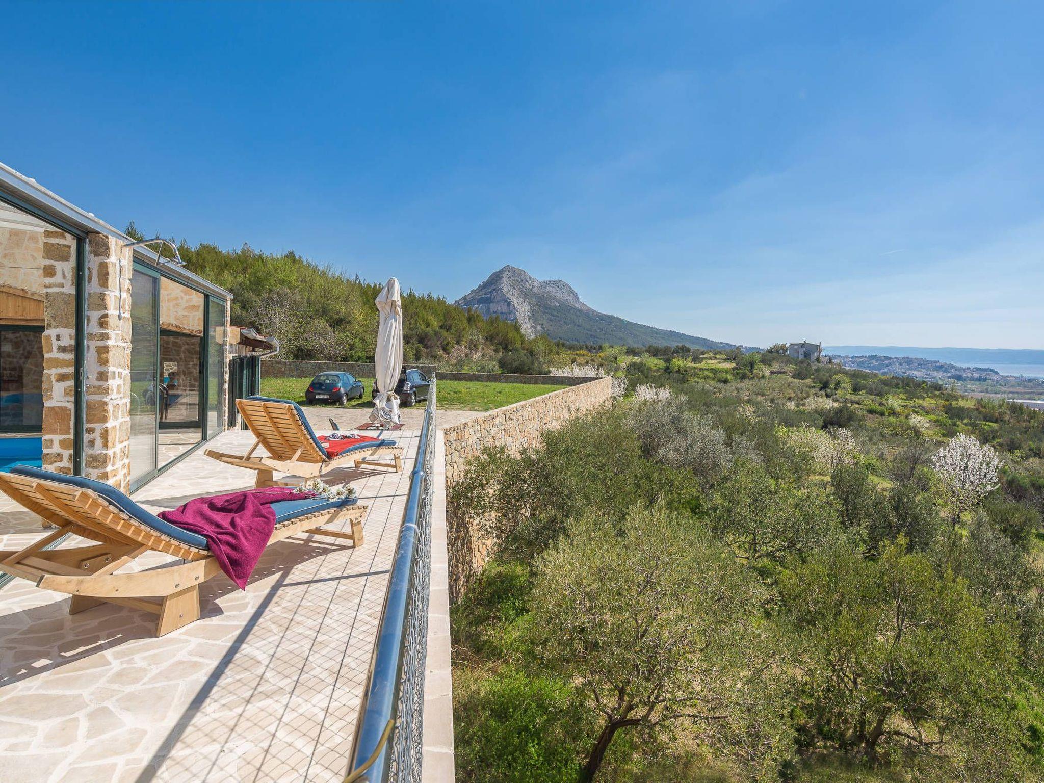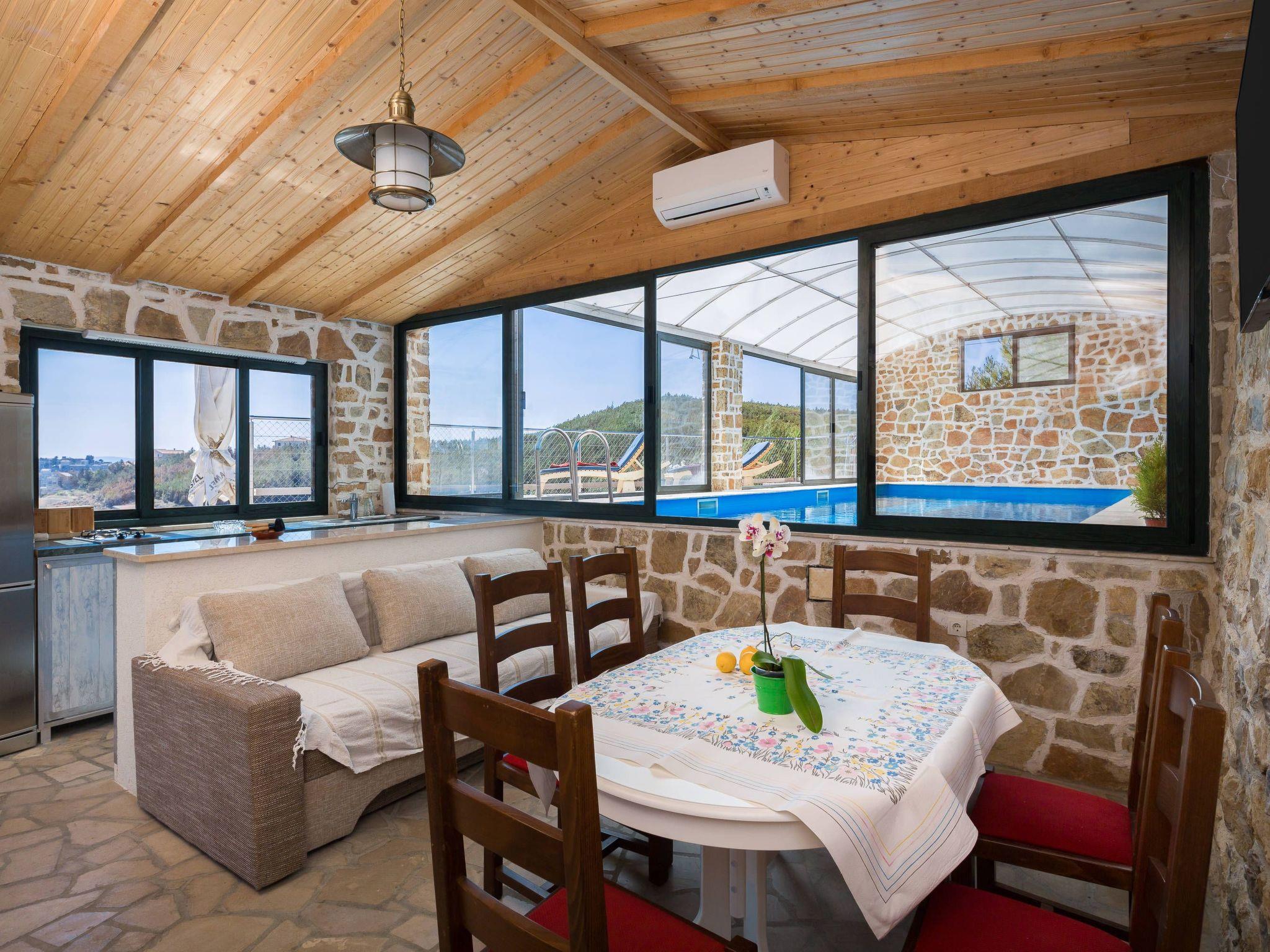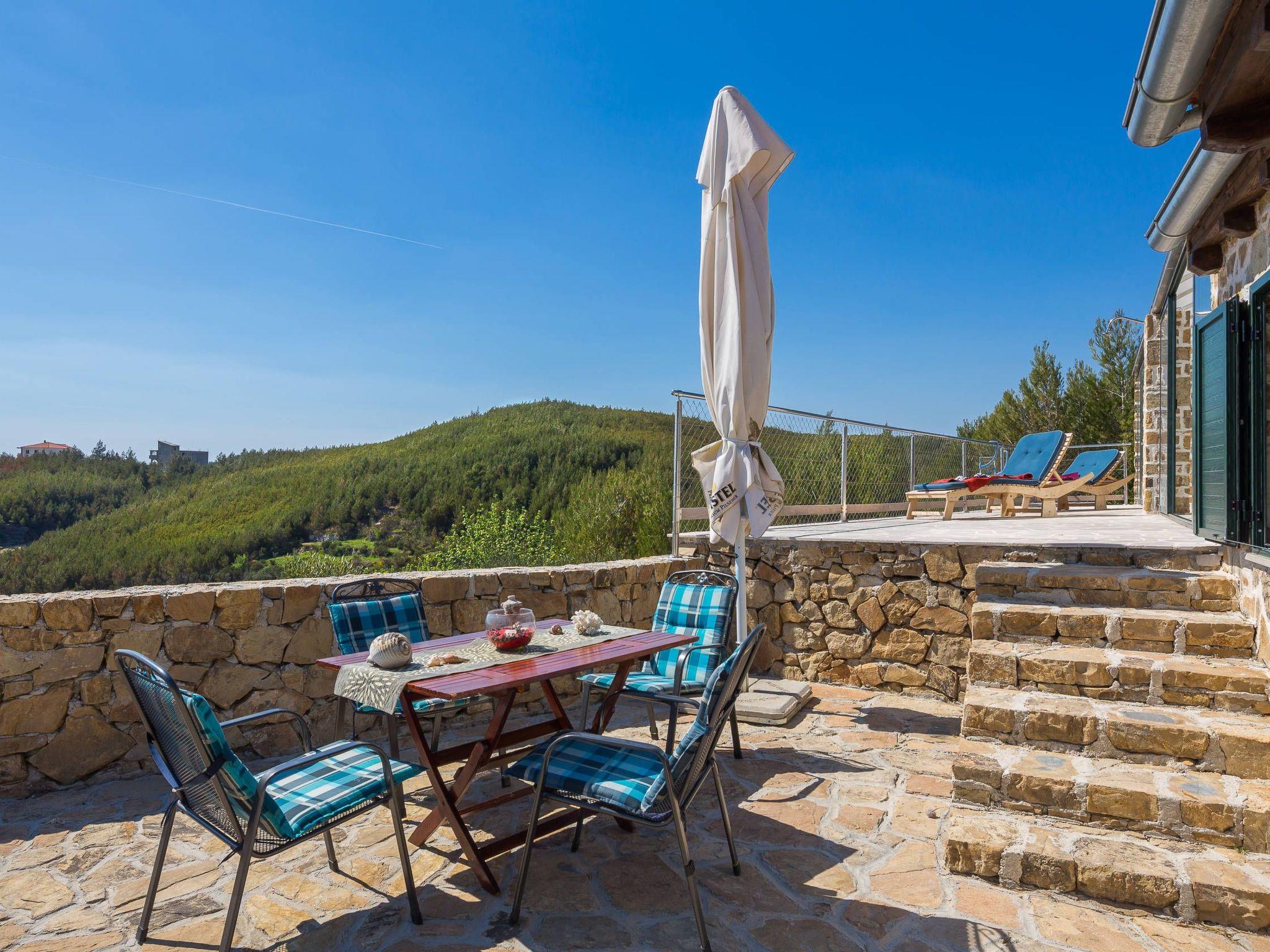 The living room provides direct access to your private indoor pool measuring 4 x 10 metres, with a metal ladder to facilitate entry. The pool area is separated from the sunny terrace by large glass sliding doors. If these are left open then it feels like you are swimming outdoors. After a few rounds, you can relax on the sun loungers on the terrace and enjoy an extensive panoramic view over the mountainous landscape as far as the sea. If you arrive by car than you can use the secure parking spaces right in front of the house.