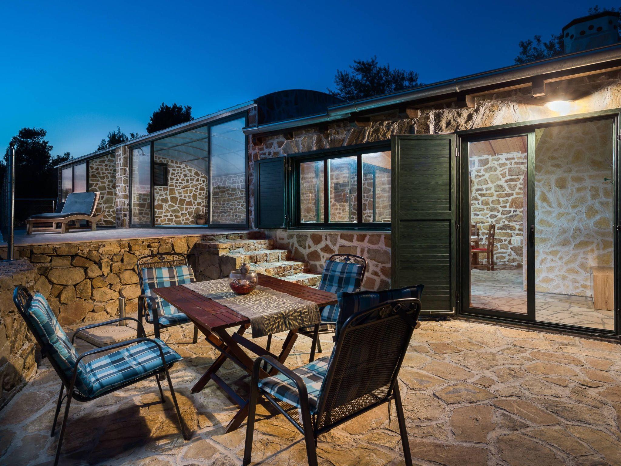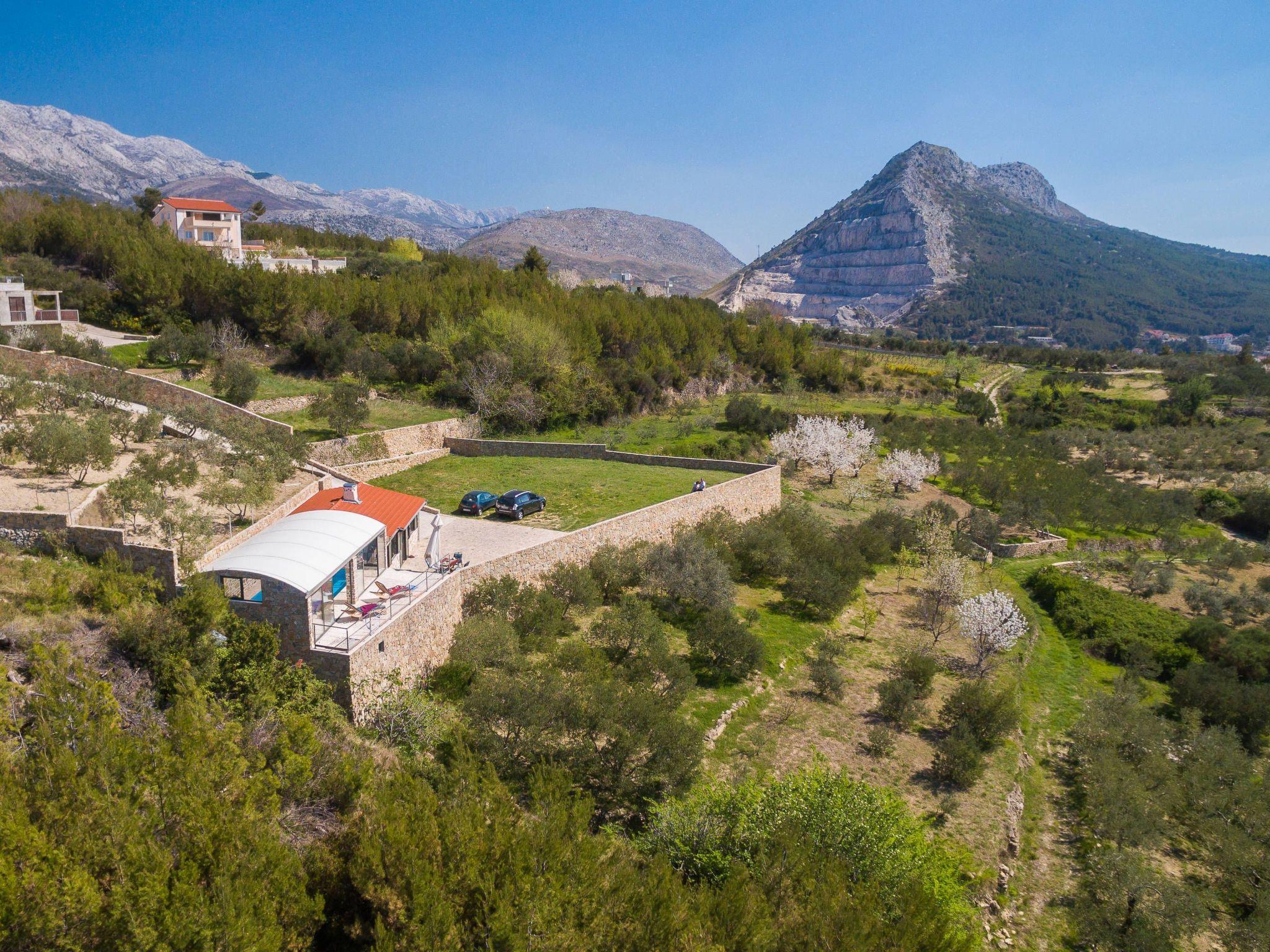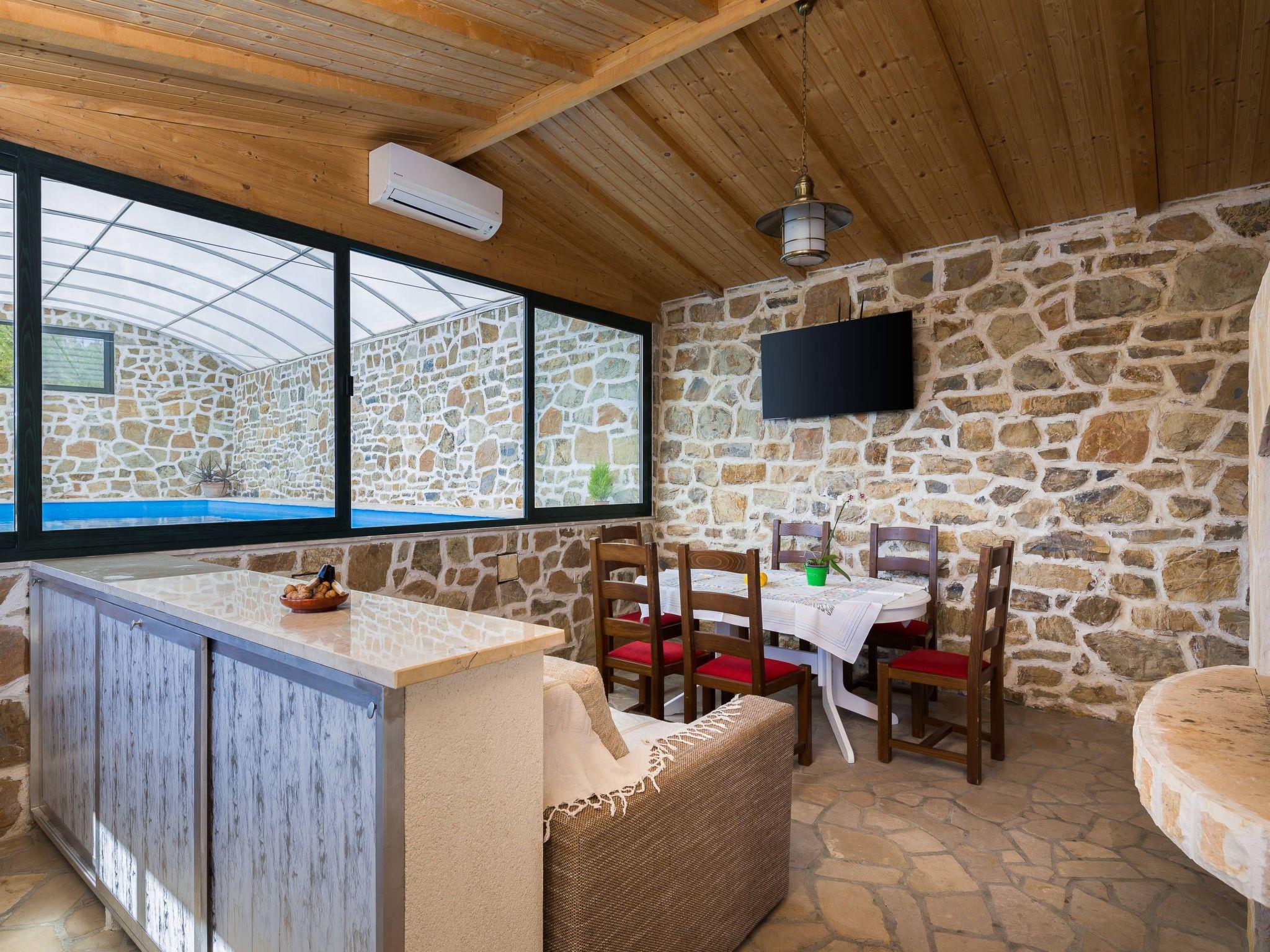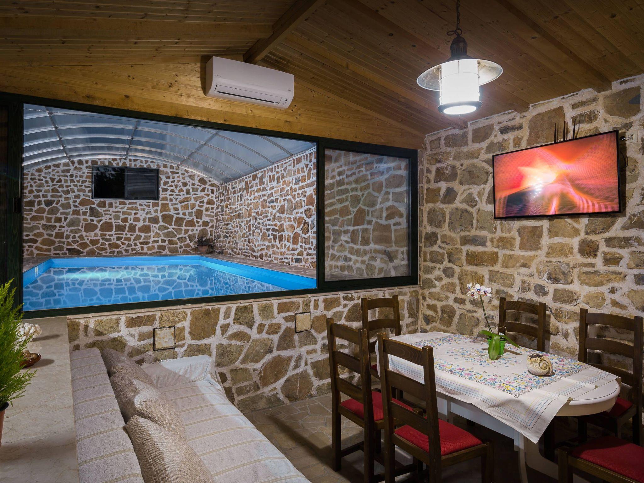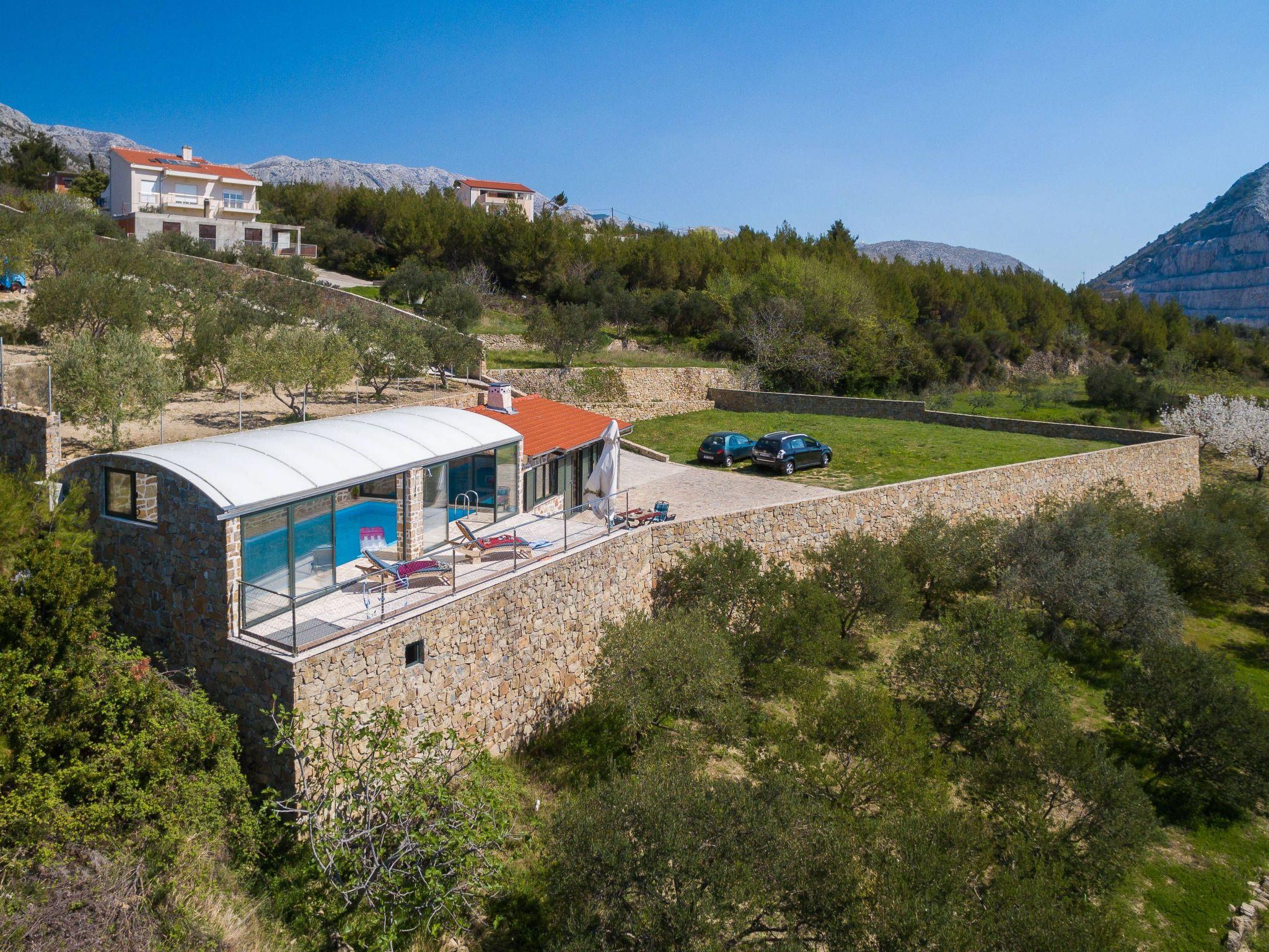 The living room provides direct access to your private indoor pool measuring 4 x 10 metres, with a metal ladder to facilitate entry. The pool area is separated from the sunny terrace by large glass sliding doors. If these are left open then it feels like you are swimming outdoors. After a few rounds, you can relax on the sun loungers on the terrace and enjoy an extensive panoramic view over the mountainous landscape as far as the sea. If you arrive by car than you can use the secure parking spaces right in front of the house.