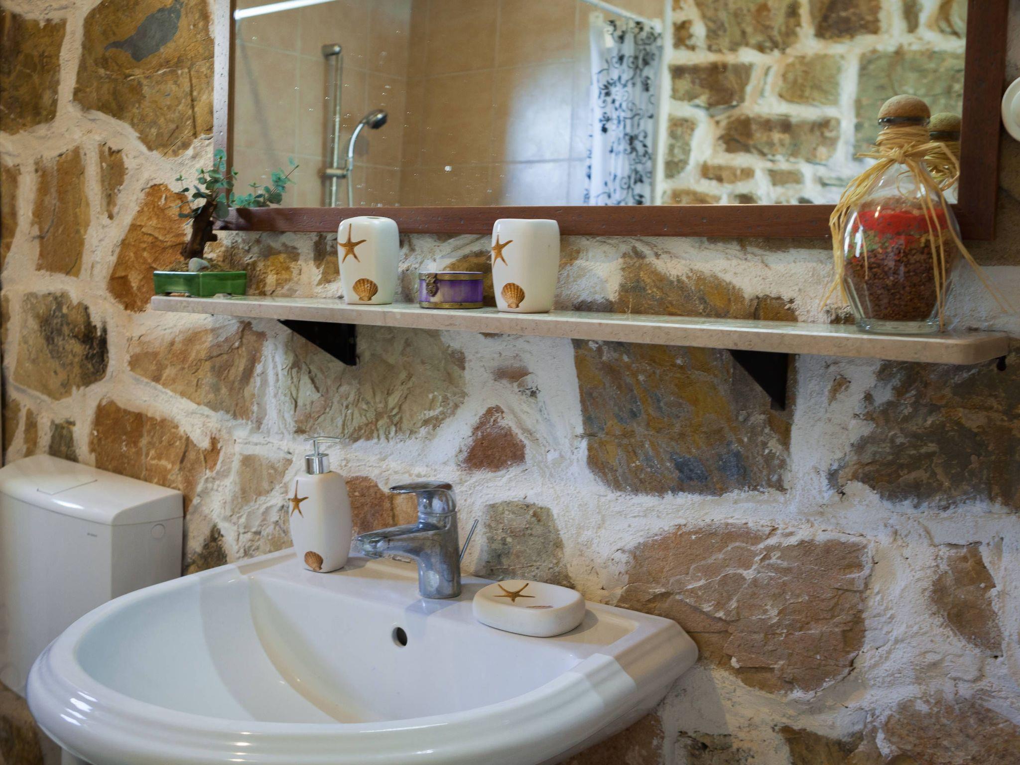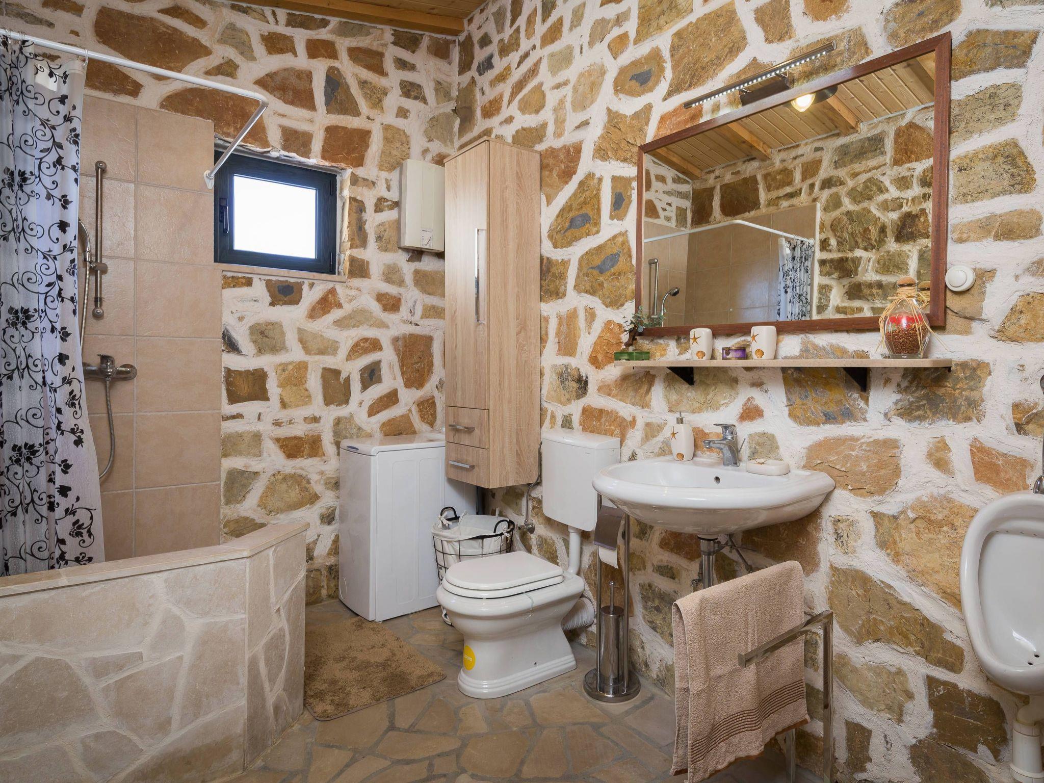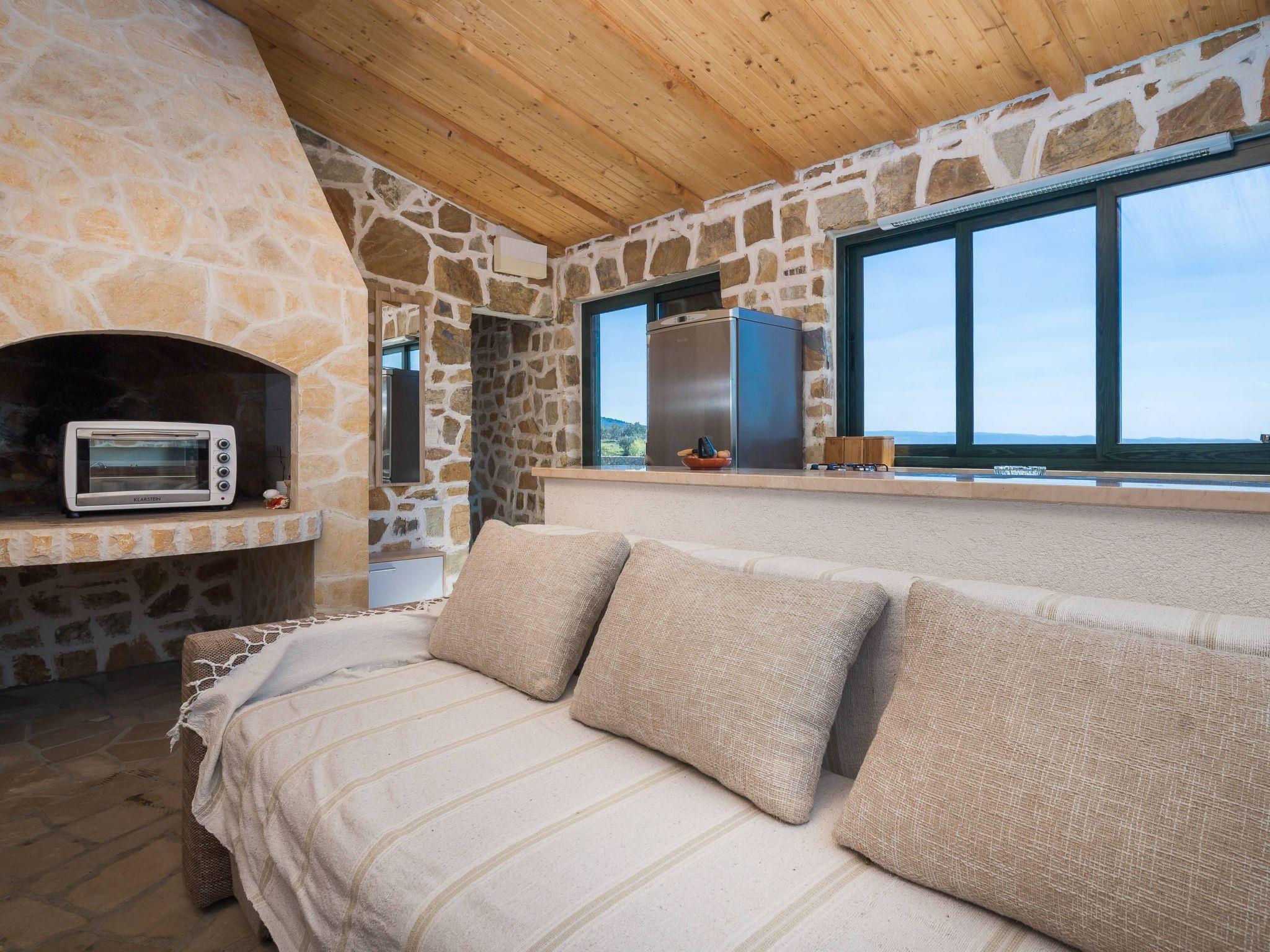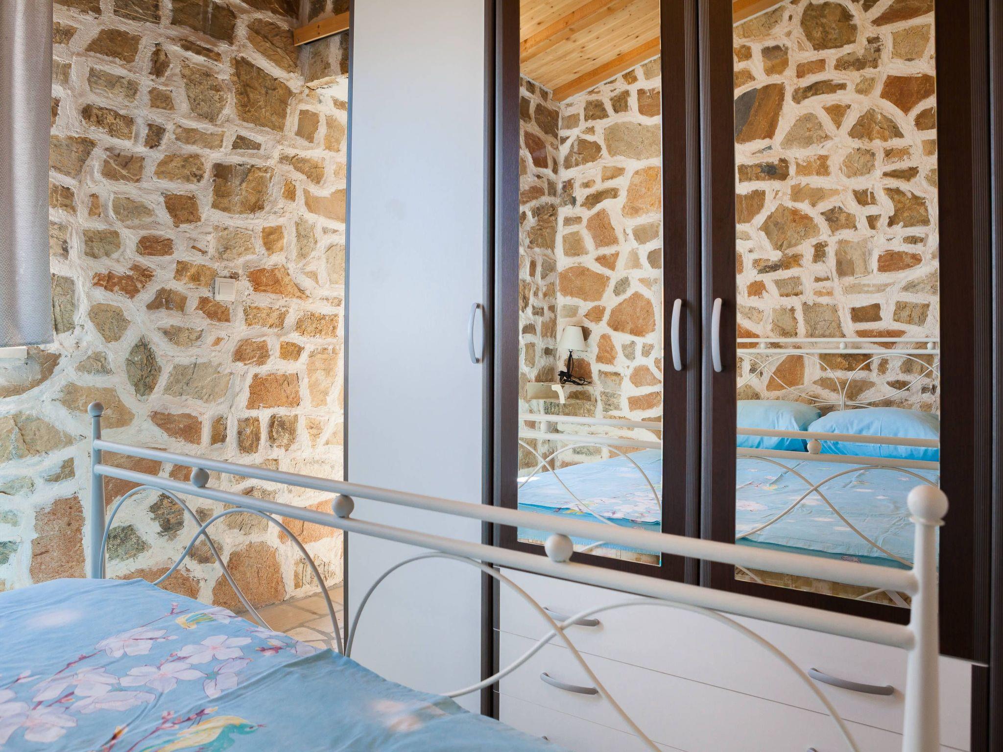 The ground-level holiday house was newly built in 2015 and provides all the necessary modern amenities for a comfortable stay. It consists of a living and dining room with an integrated, fully-equipped kitchen, a light bedroom and a spacious daylight bathroom. The living room provides a comfortable sofa, a flatscreen TV mounted to the wall with a USB port, and a dining table with six chairs. The big open fireplace built into the wall enhances the rustic atmosphere and exudes cosy warmth on cooler evenings. An elegant breakfast bar separates the living room from the built-in kitchen, which is equipped with a two-ring gas hob, a mini oven, an extra large fridge with a freezer compartment, and plenty of crockery and cutlery. The bedroom has a double bed (160 x 200cm), bedside tables with reading lamps and a wall cupboard with plenty of storage space for your clothing and luggage. The sofa in the living room can be converted into an additional double bed (140 x 200cm). The bathroom has a shower cubicle, a washbasin with a wide wall mirror, a hairdryer, a toilet, a urinal and even a washing machine. Plenty of bed linen and towels are provided and the reliable wireless Internet connection in the apartment can be used free of charge.