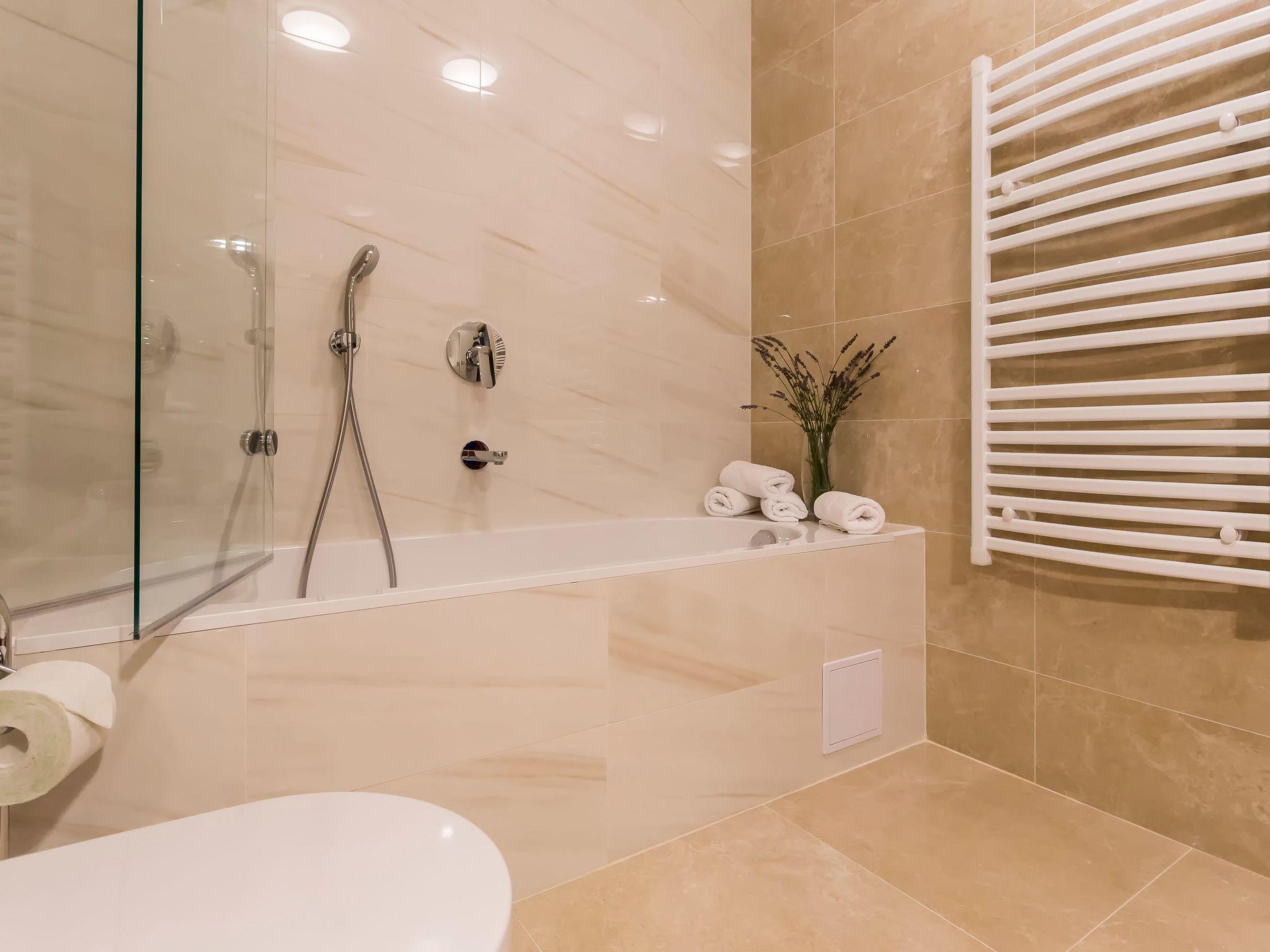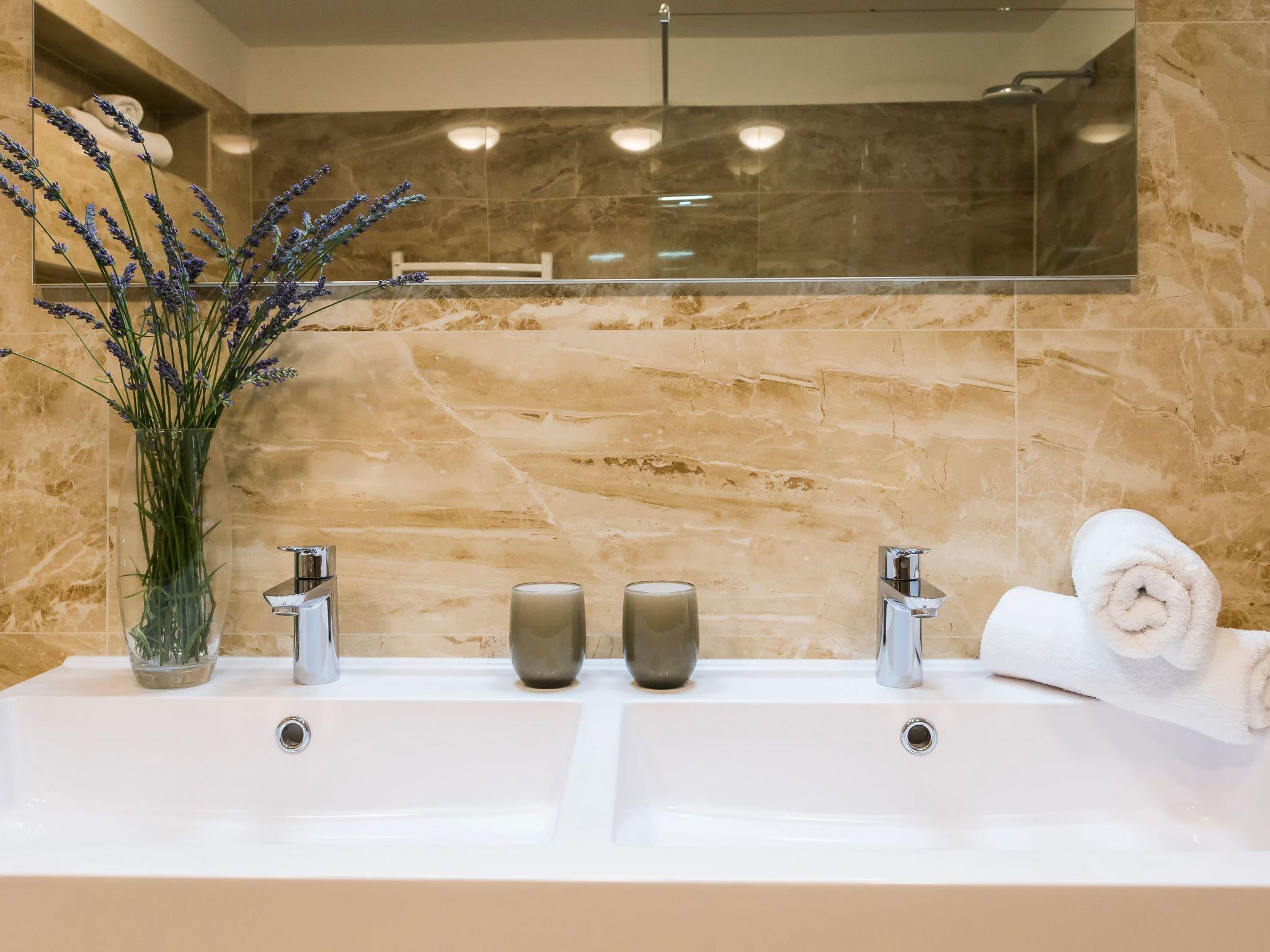 The ground floor is about 80 m² in size and comprises of the following rooms: A living room with a fireplace, a flatcreen TV and a double sofa bed. There is also a bedroom next to it, which includes a double bed. Plus there is a fully-equipped kitchen with an oven, microwave, coffee machine and a dining area, as well as an adjoining bathroom with a bathtub and bidet. Adjoining bathroom with a shower and bidet.