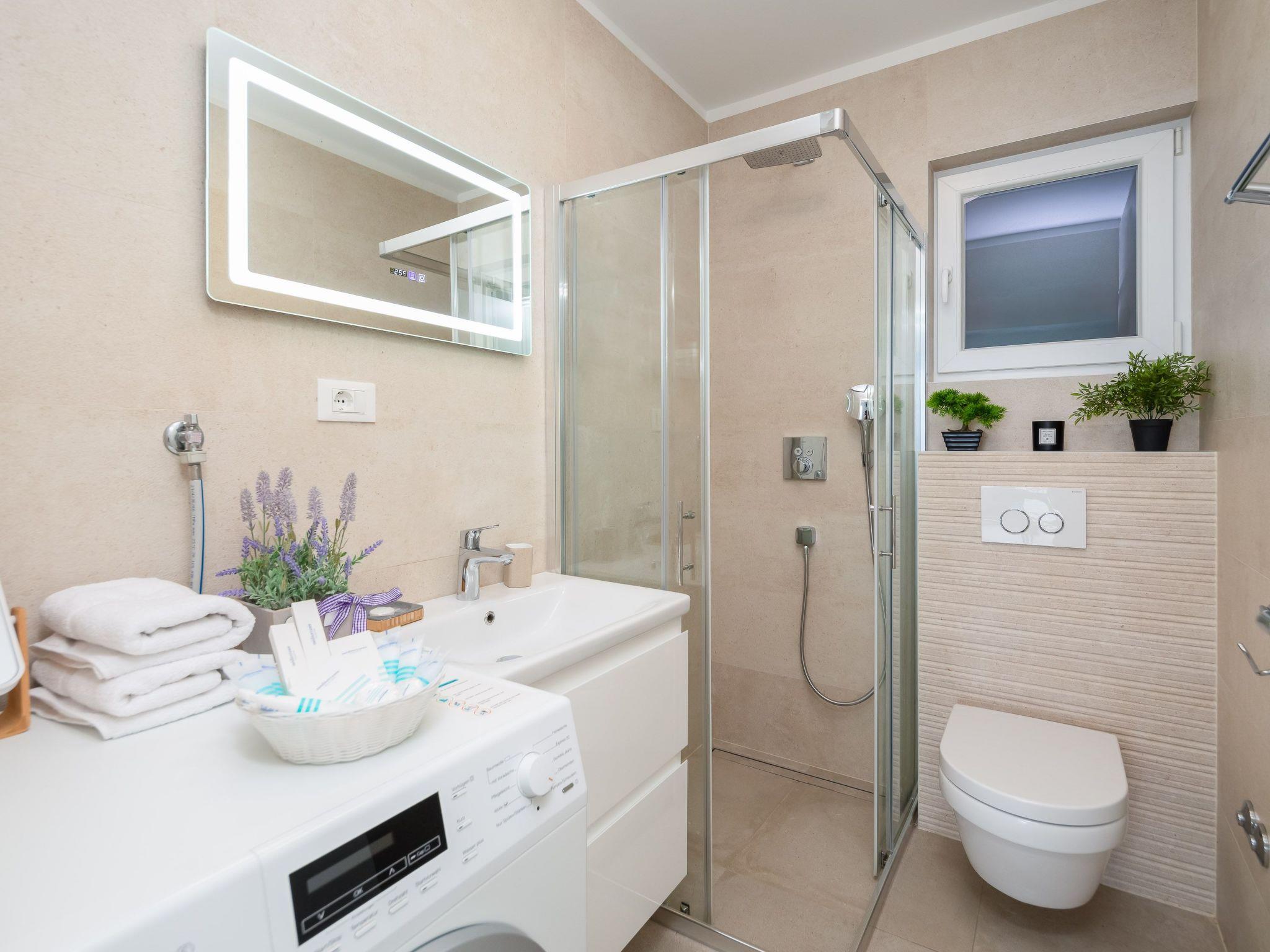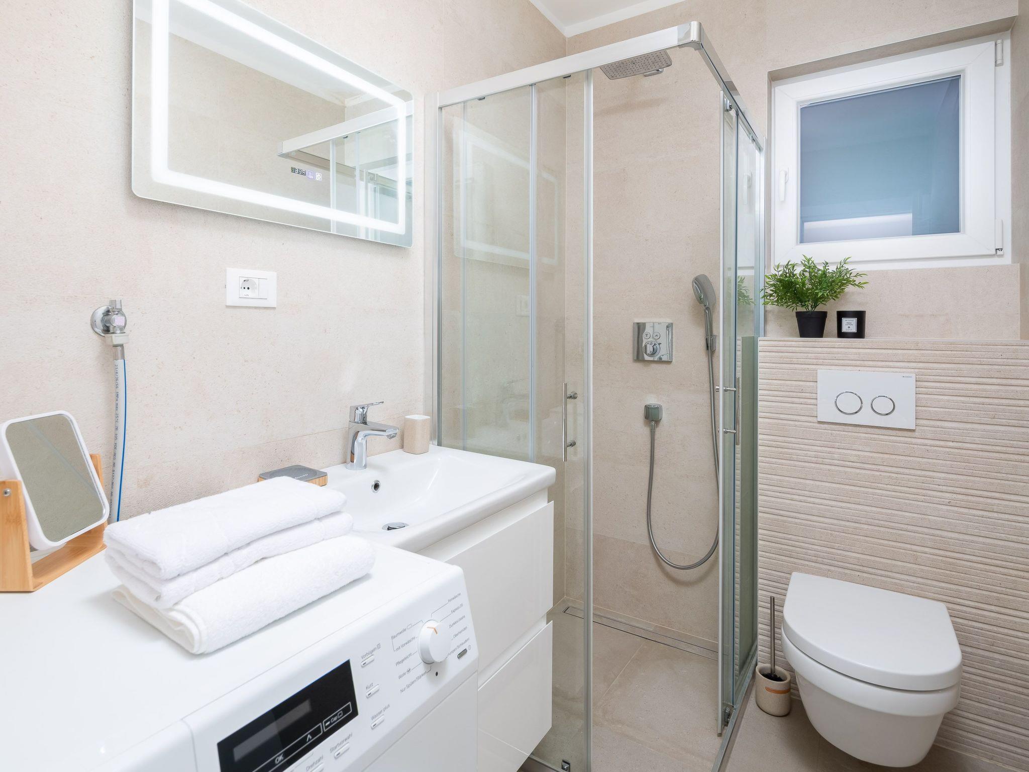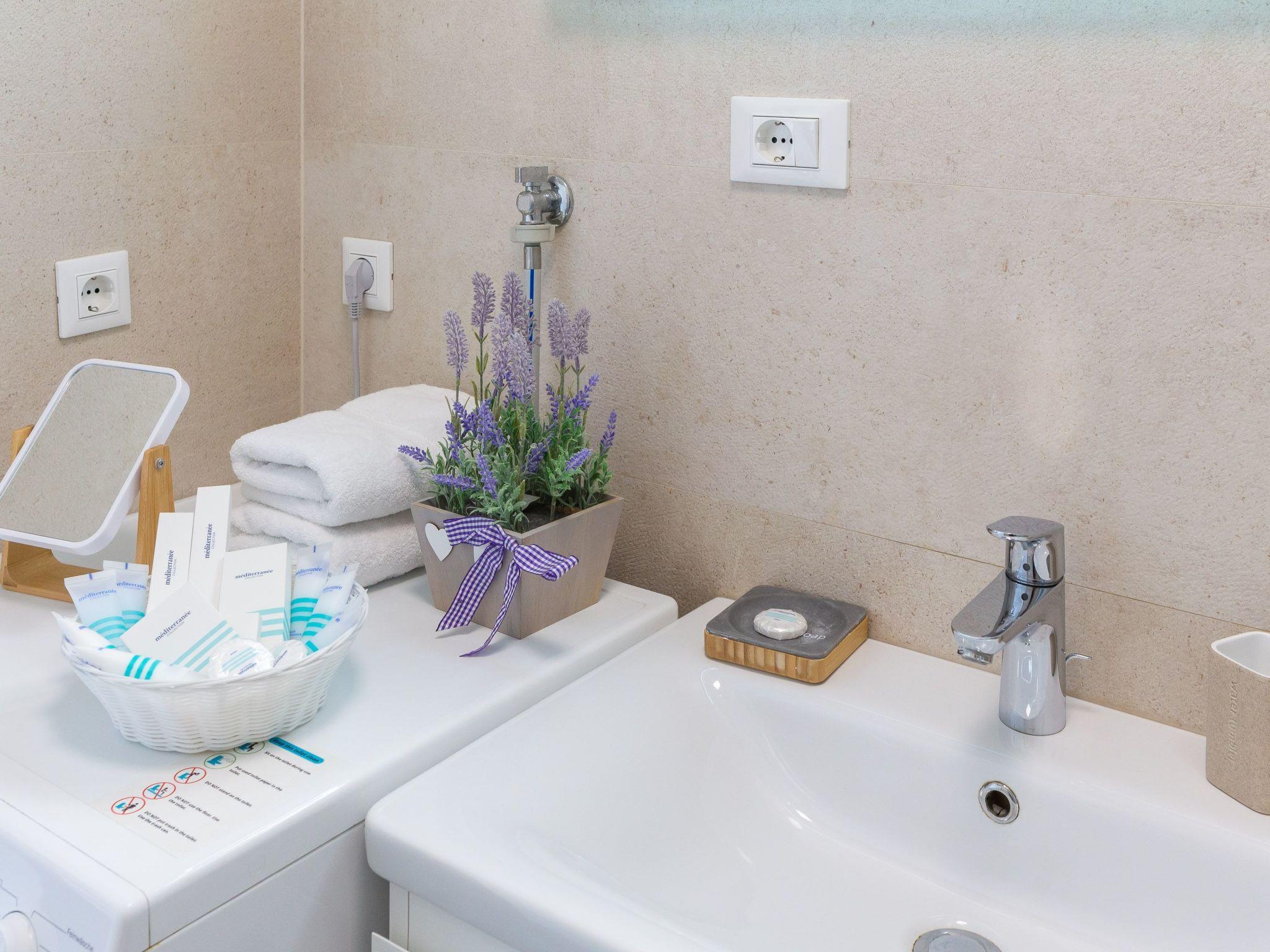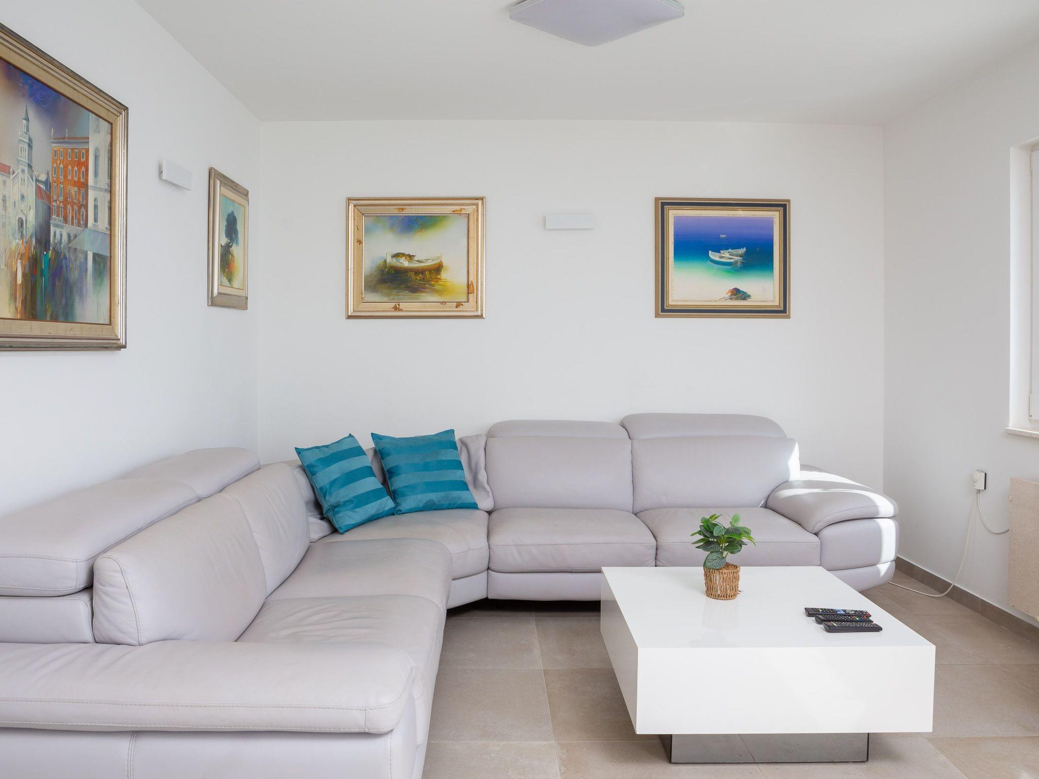 The property consists of 4 bedrooms, each with large double bed and all airconditioned. There is also an additional bedroom with Queen Size bed for children and there is a sofa bed in the Livingroom. The villa is intended for 10 people (maximum 8 adults). There are three bathrooms with shower, two washing machines and clothes dryer. The kitchen is fully equipped with dishes and cutlery, there is a refrigerator with freezing department, stove, oven, dishwasher, coffee maker and dining area.