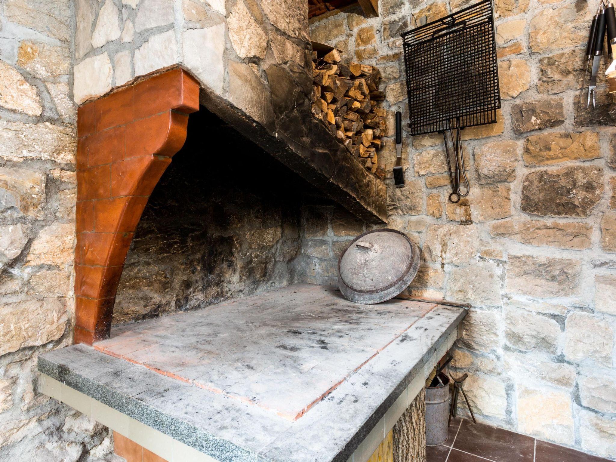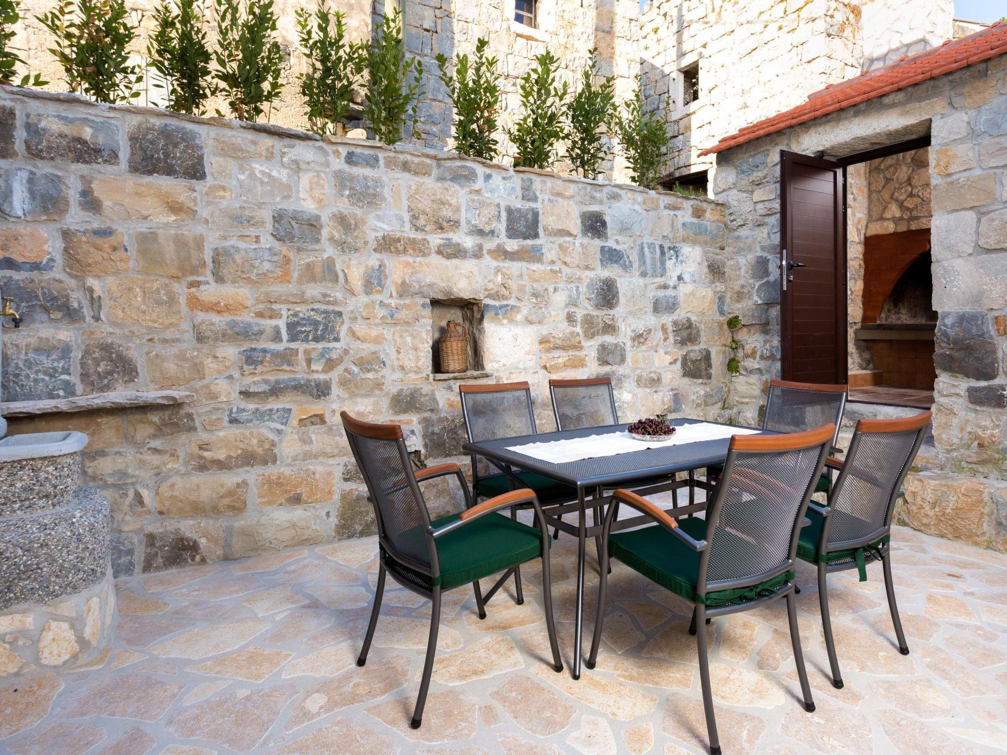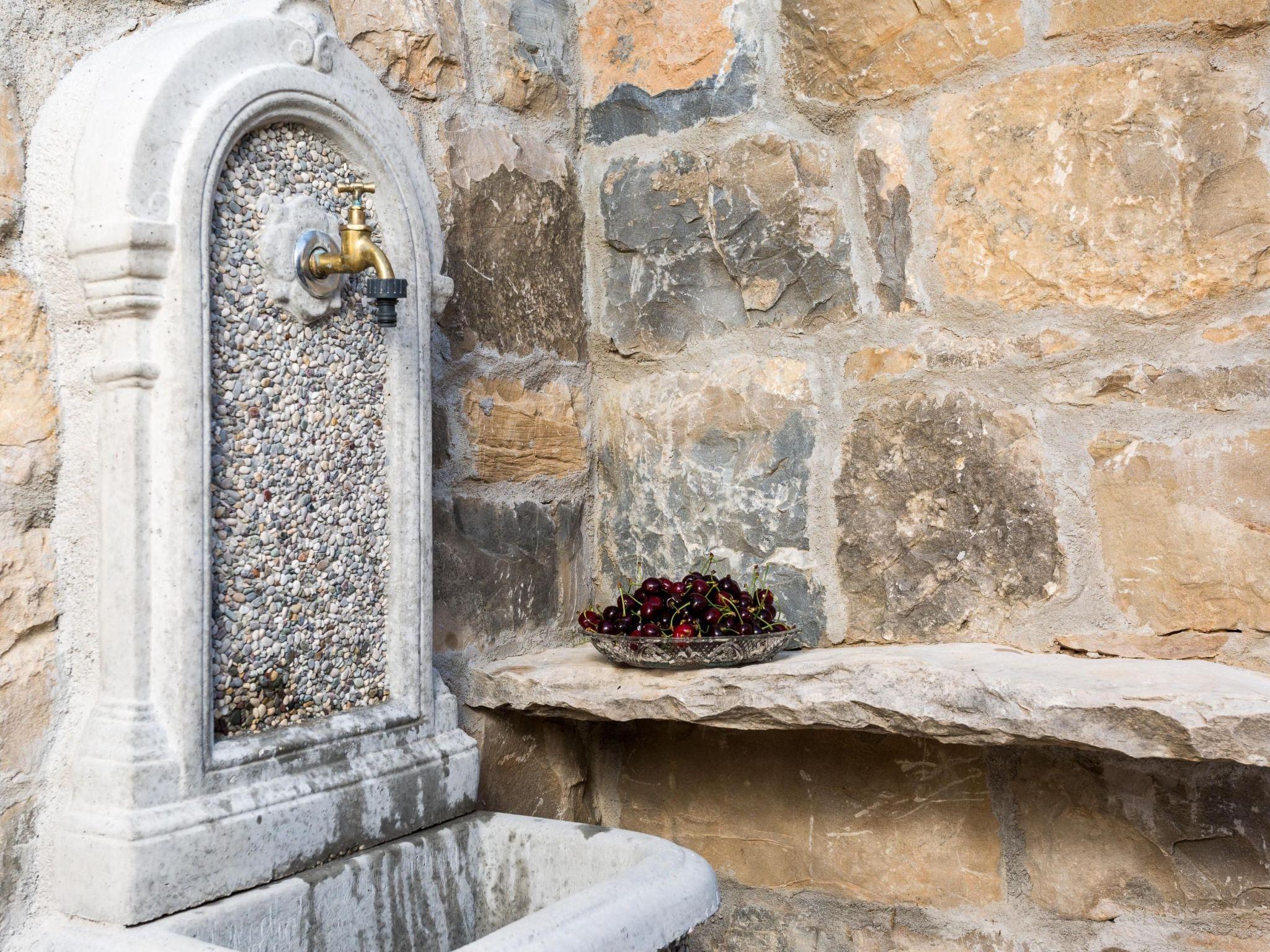 In the enclosed outdoor area a private pool awaits you with a metal ladder to facilitate entry and an outdoor shower. There is a sun deck next to it with sun loungers for relaxing, affording a view over the sun-blessed valley, the meadows and fields of the village Srinjine. A large parasol provides pleasant shade during the midday hours. You can spend your holiday evenings around the traditional stone grill. If you arrive by car, you can use the parking space in the private garage and there are three further parking spaces right in front of the villa.