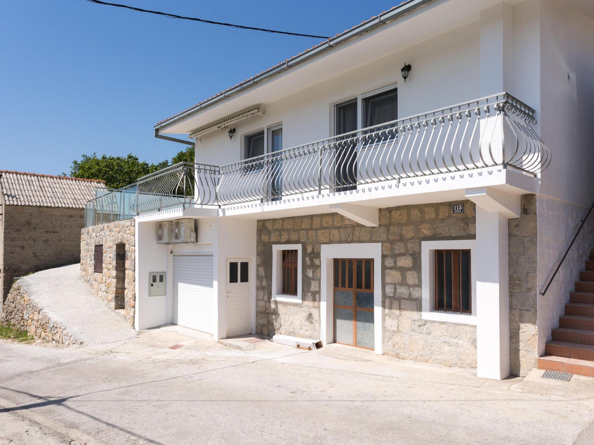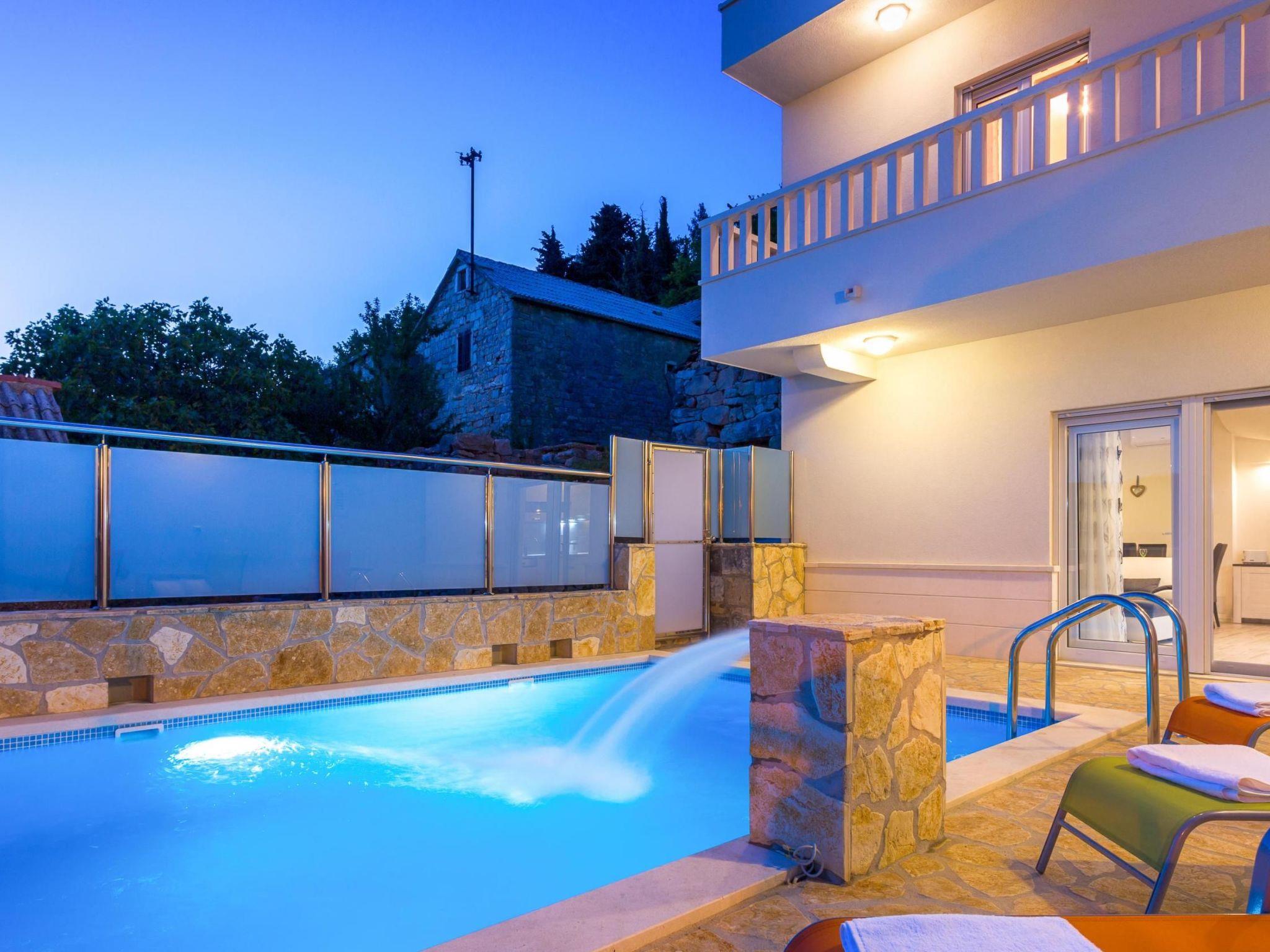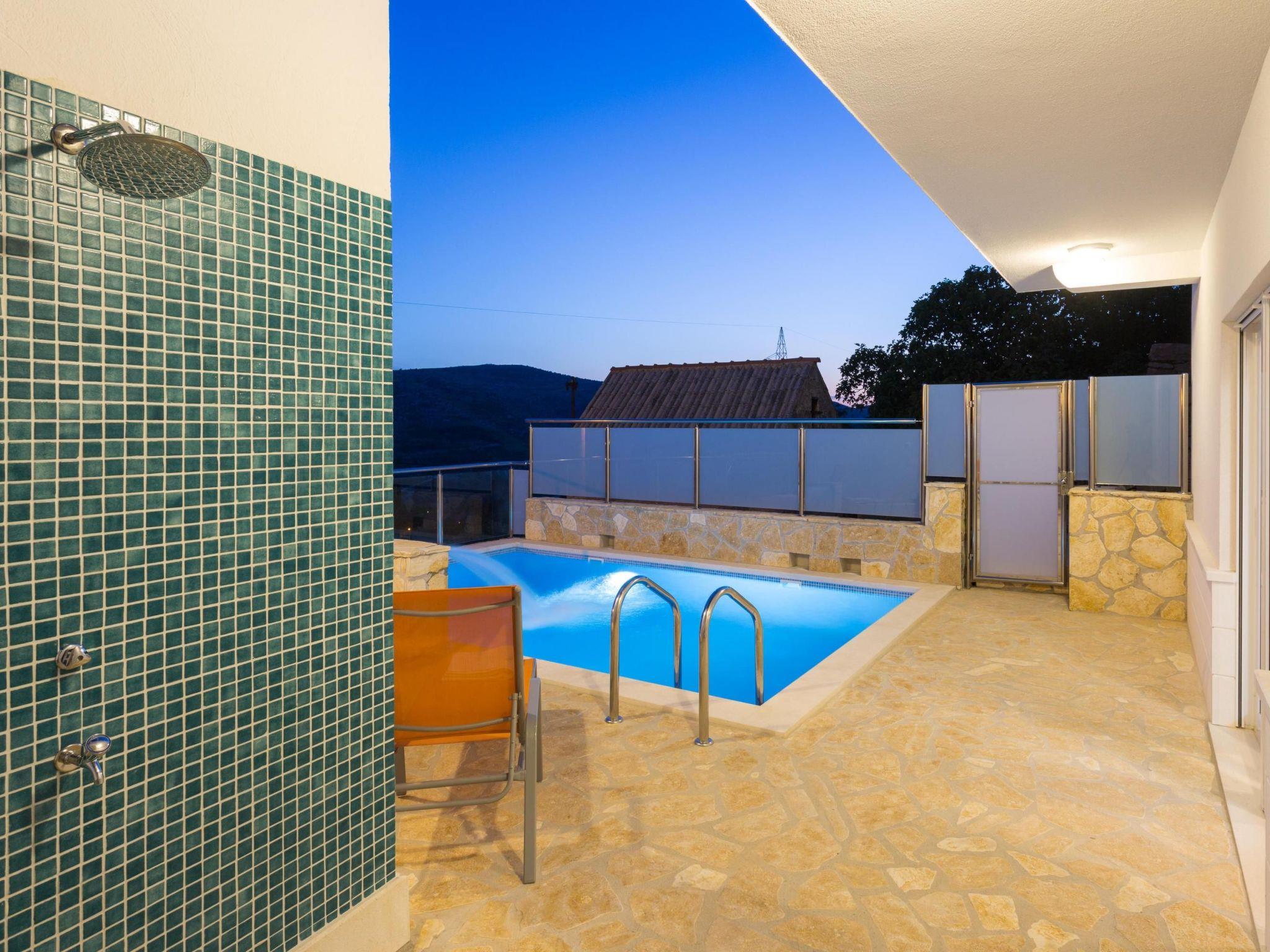 In the enclosed outdoor area a private pool awaits you with a metal ladder to facilitate entry and an outdoor shower. There is a sun deck next to it with sun loungers for relaxing, affording a view over the sun-blessed valley, the meadows and fields of the village Srinjine. A large parasol provides pleasant shade during the midday hours. You can spend your holiday evenings around the traditional stone grill. If you arrive by car, you can use the parking space in the private garage and there are three further parking spaces right in front of the villa.