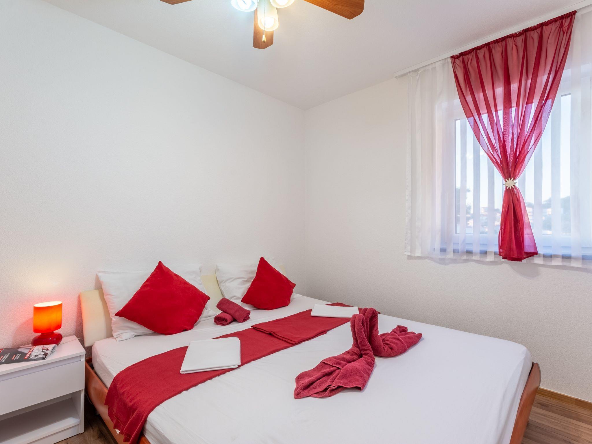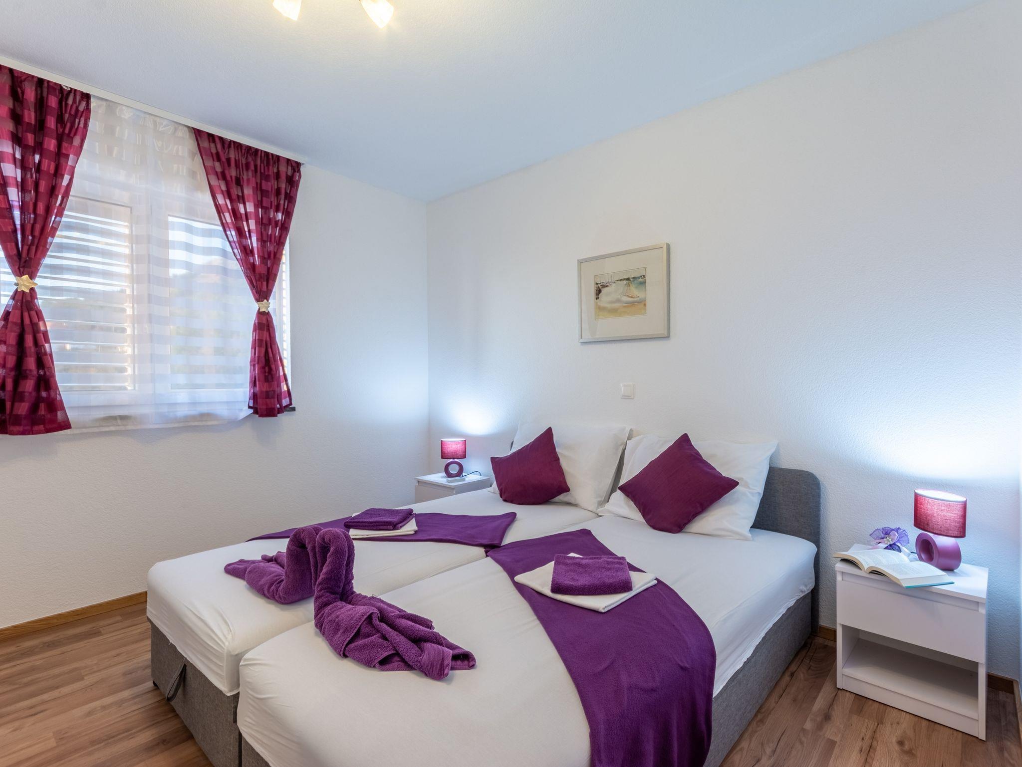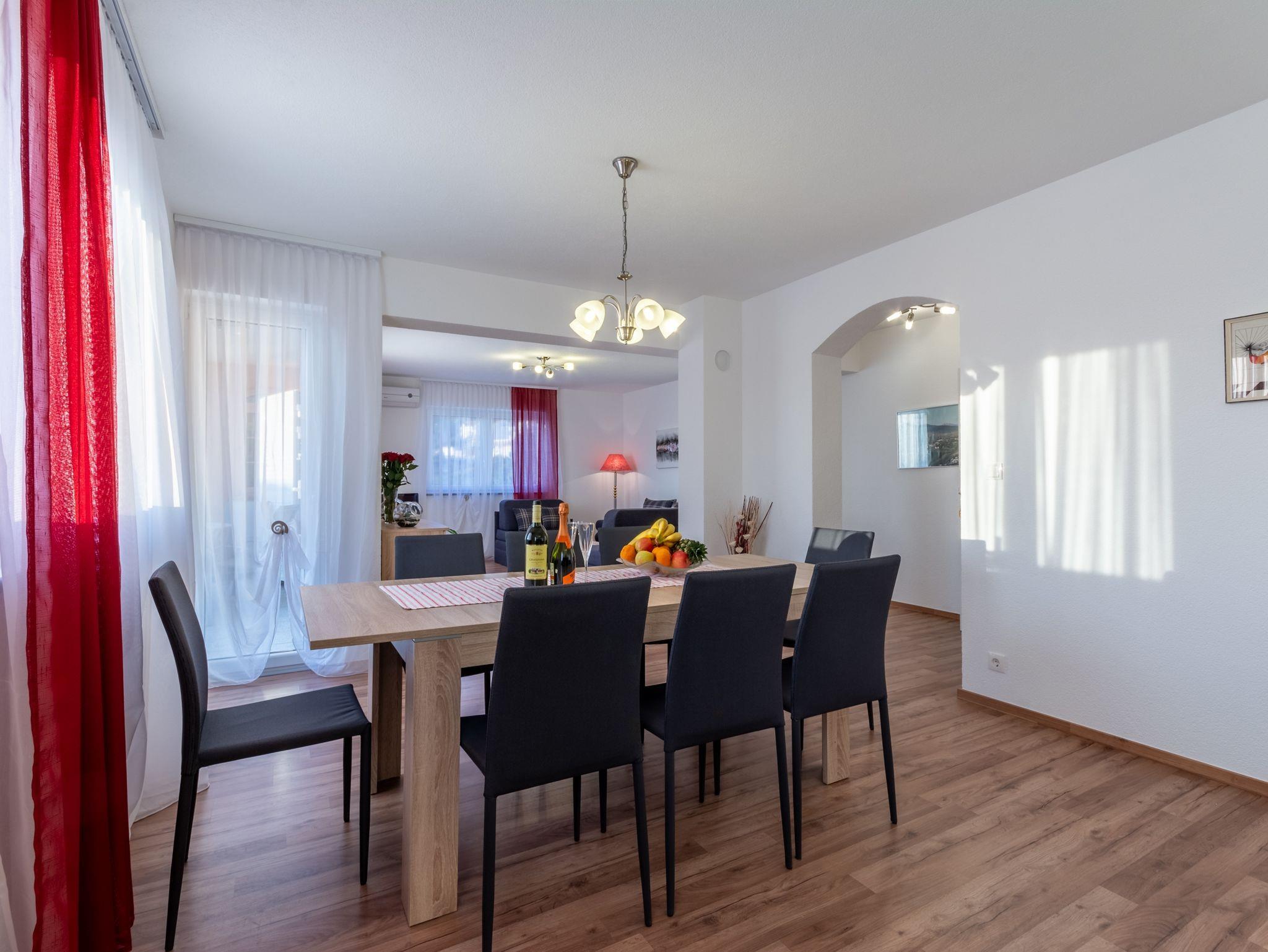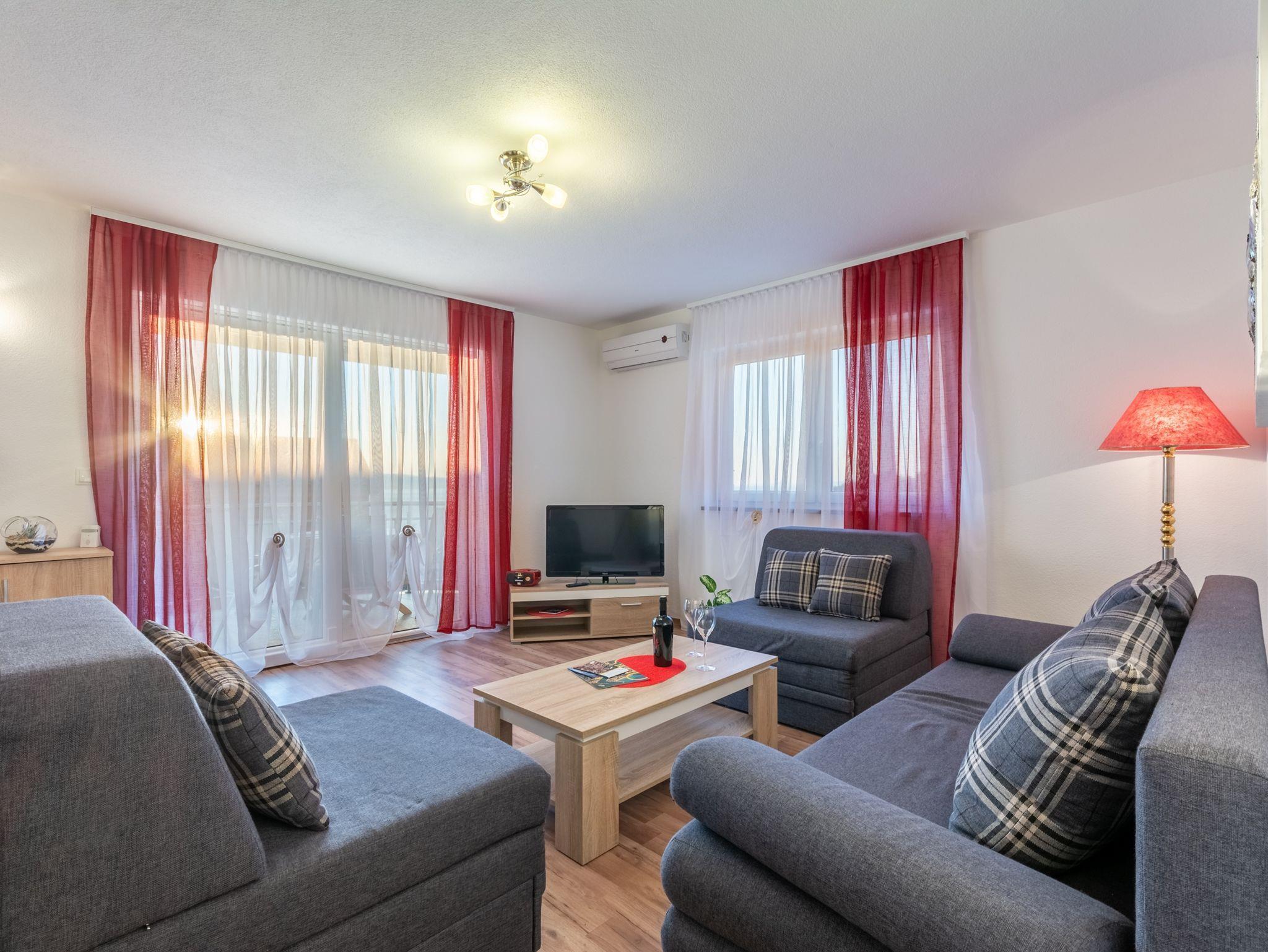Ferienwohnung bietet Platz für 6 Gäste. Die Betten sind in Schlafzimmern, die es 2 gibt, und in Wohnzimmer, innerhalb einer Gesamtfläche von 75m2, angeordnet. Die Gäste haben eine eigene Terrasse zur Verfügung, auf der sie in warmen Sommernächten genießen können. Das Apartment bietet Meerblick. Es ist erlaubt, Speisen auf dem Gemeinschafts-Grill vorzubereiten. Während ihres Aufenthalts können Gäste das gemeinsam zur Nutzung stehende Schwimmbad benutzen. IM PREIS INBEGRIFFEN: Kurtaxe, Endreinigung, Klimatisierung, Pool, Parkplatz, Internet, Wäschewaschen, Kinderbett, Bügeleisen, Bügelbrett, Föhn, tragbarer Grill. VERBINDLICHE ZUSÄTZLICHE KOSTEN: Aufzahlung für Kurzaufenthalte (prozentualer Zuschlag pro Nächtigungsanzahl: 30% - 1, 20% - 2, 10% - 3). Die Verfügbarkeit zusätzlicher Dienstleistungen in Ihrem reservierten Termin und die Preise derselben (falls nicht aufgeführt) müssen im Voraus überprüft werden. Zusätzliche Dienstleistungen die in der Zahlungsaufforderung nicht aufgeführt sind werden direkt beim Vermieter bezahlt, angenommen der Gast nutzt auch diese. Ermäßigung auf den Grundpreis: Gratistag 14=13 (bei einem Aufenthalt von 14 Tagen oder mehr erhalten Sie einen Gratistag für den Aufenthalt bis 31.12.26).