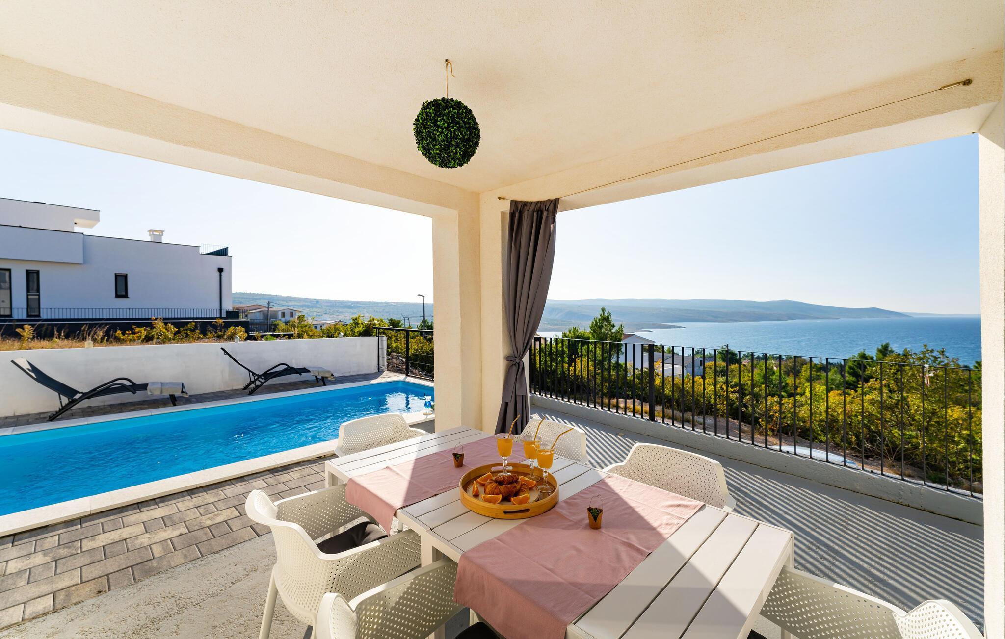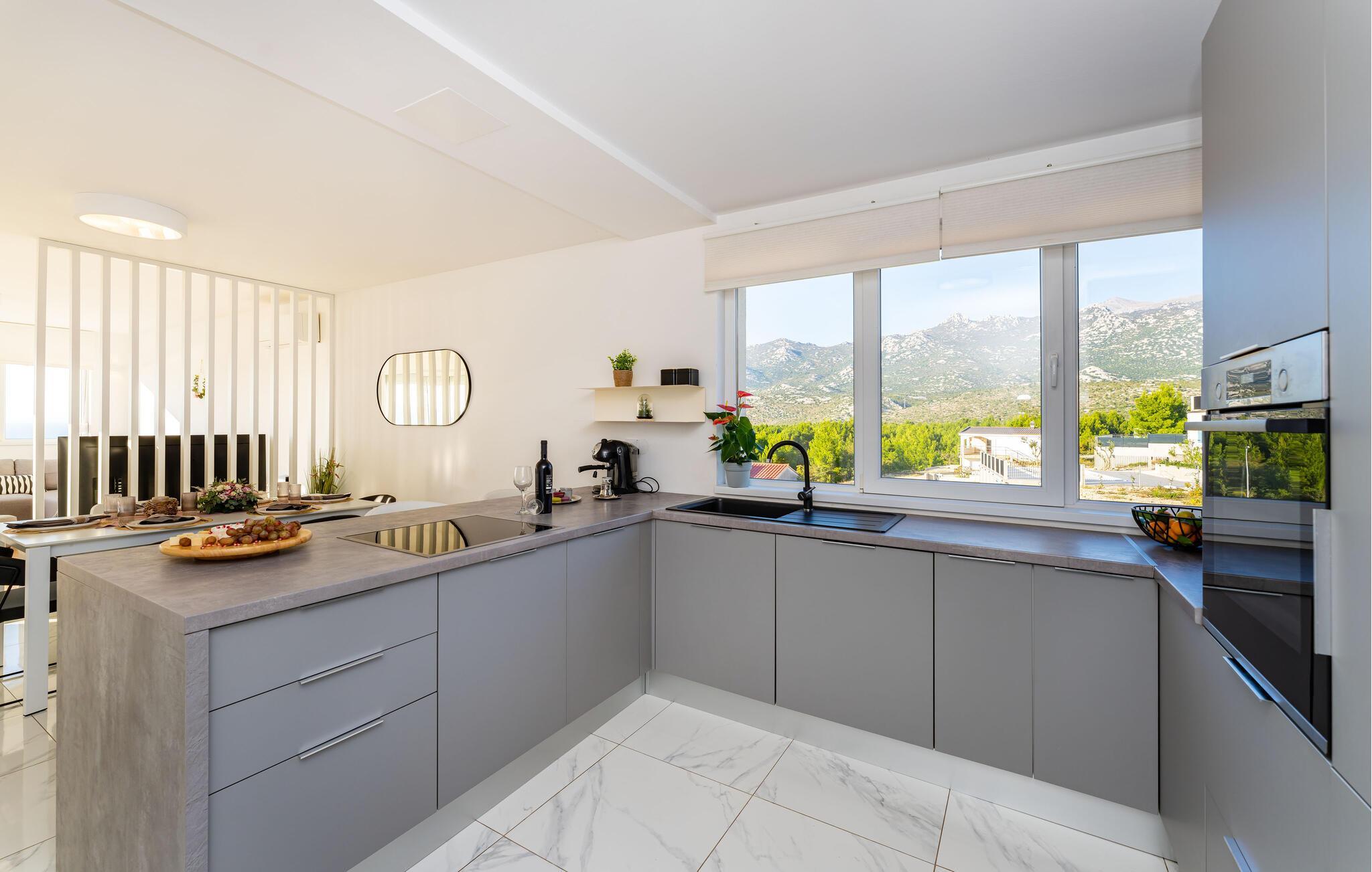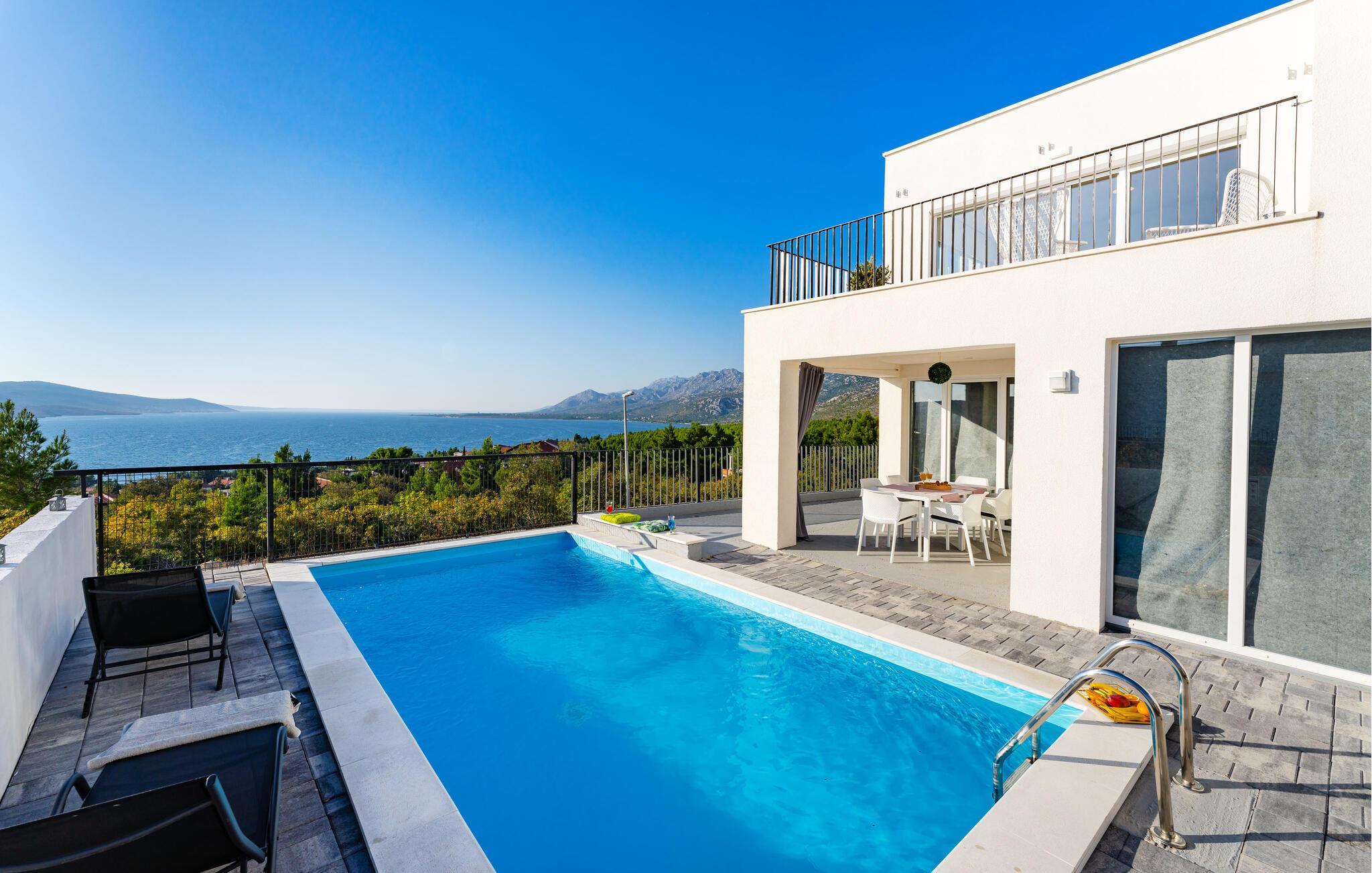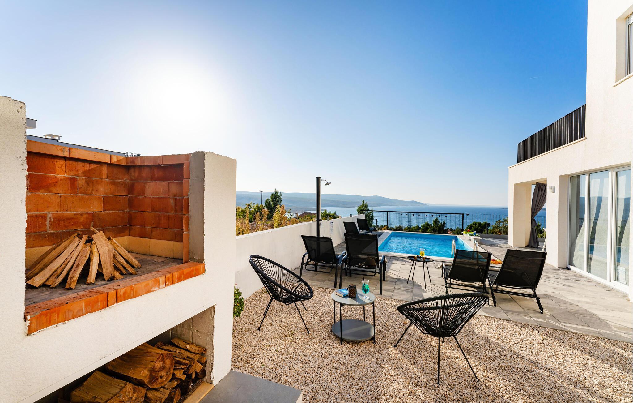 Denne stilfulde villa med to smagfuldt indrettede etager har alt, hvad I behøver for en afslappende familieferie. De lyse rum og den åbne køkkenløsning indbyder til fælles madlavning og hyggelige stunder. I den store stue kan I nyde den rolige atmosfære eller træde direkte ud på den solrige panoramaterrasse, hvor en vidunderlig udsigt over bugten venter. Den nedre terrasse med overdækket siddeplads og privat pool giver ren afslapning – perfekt til at koble af eller til hyggelige grillaftener under åben himmel.