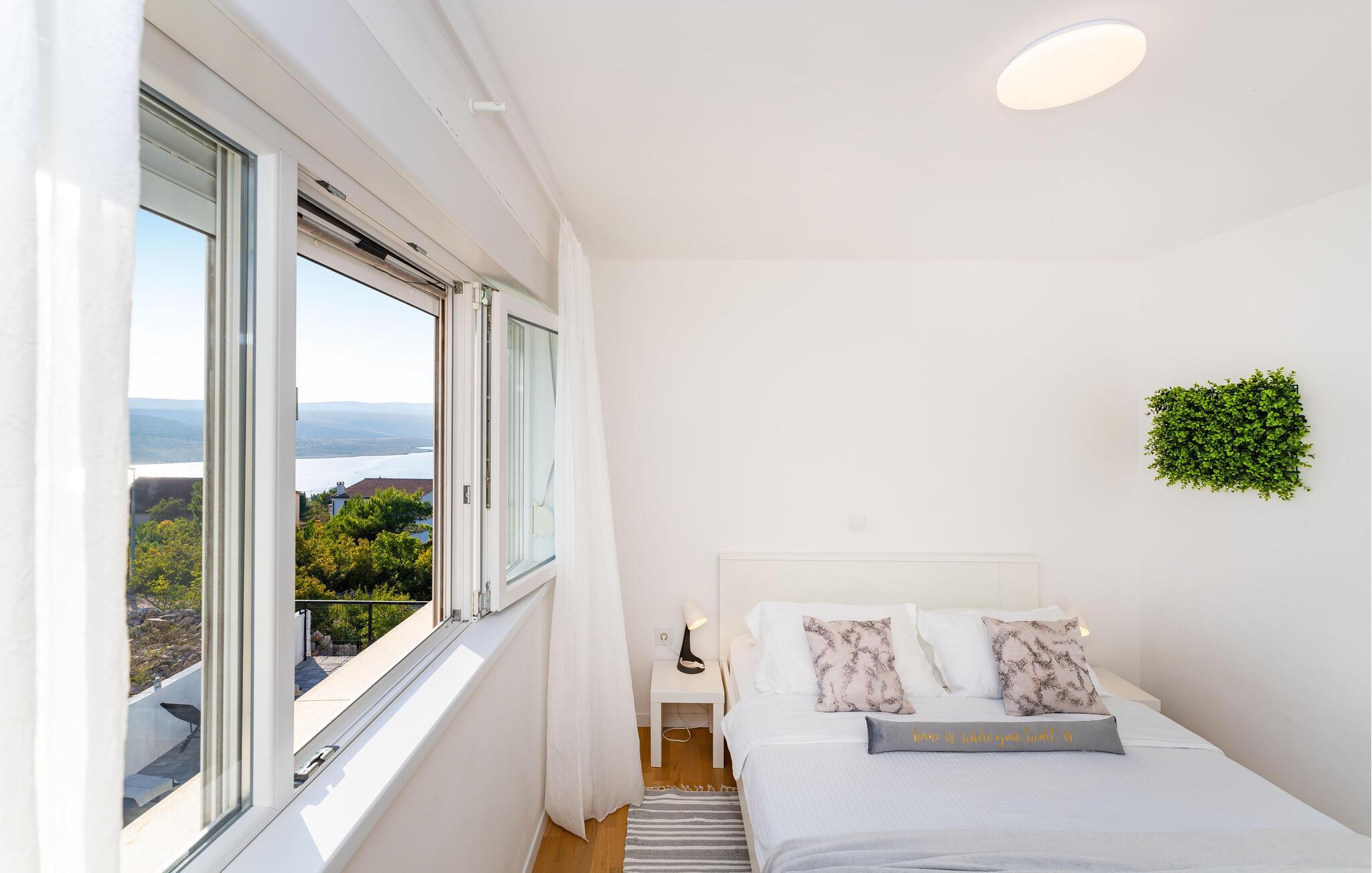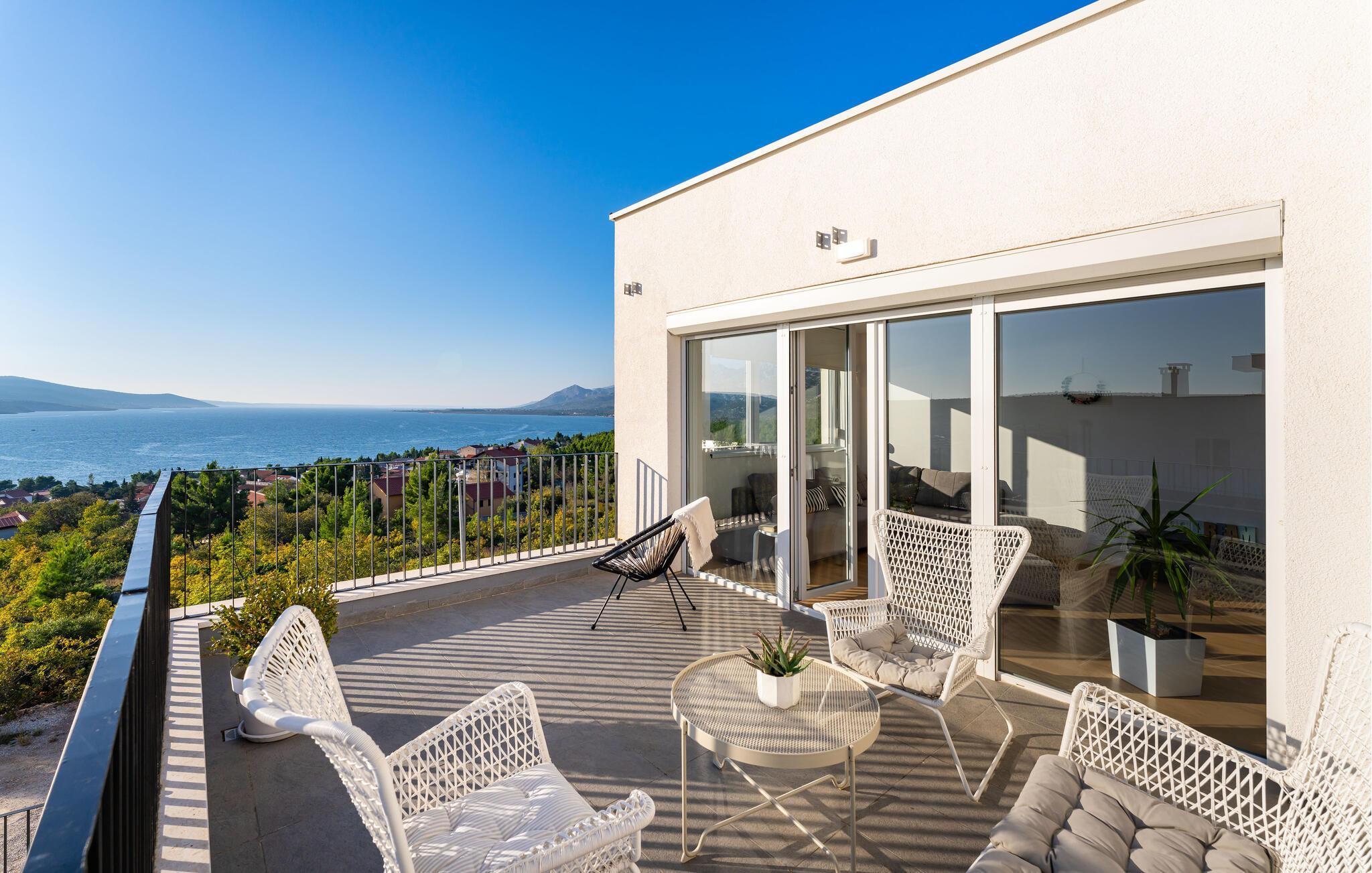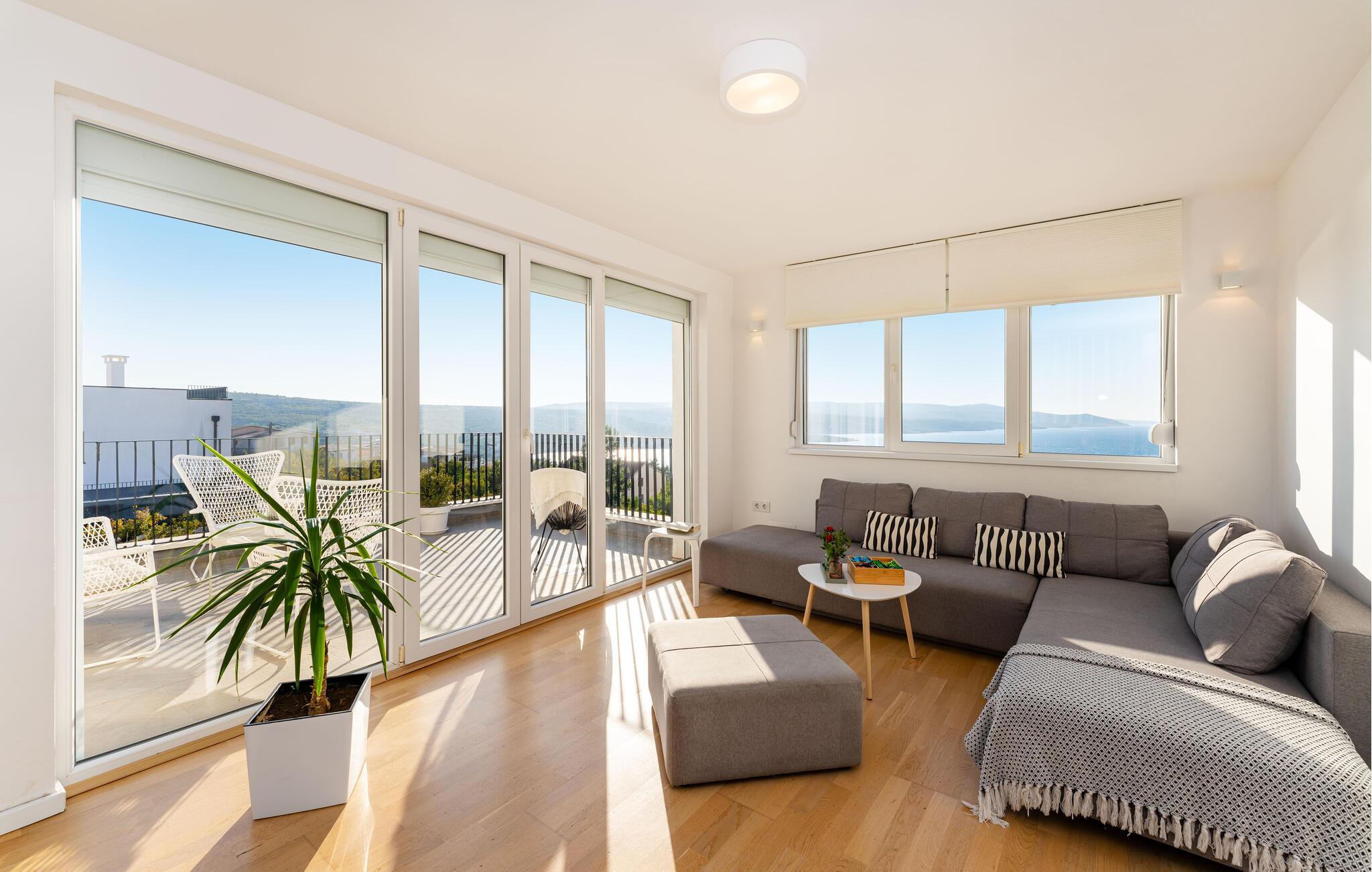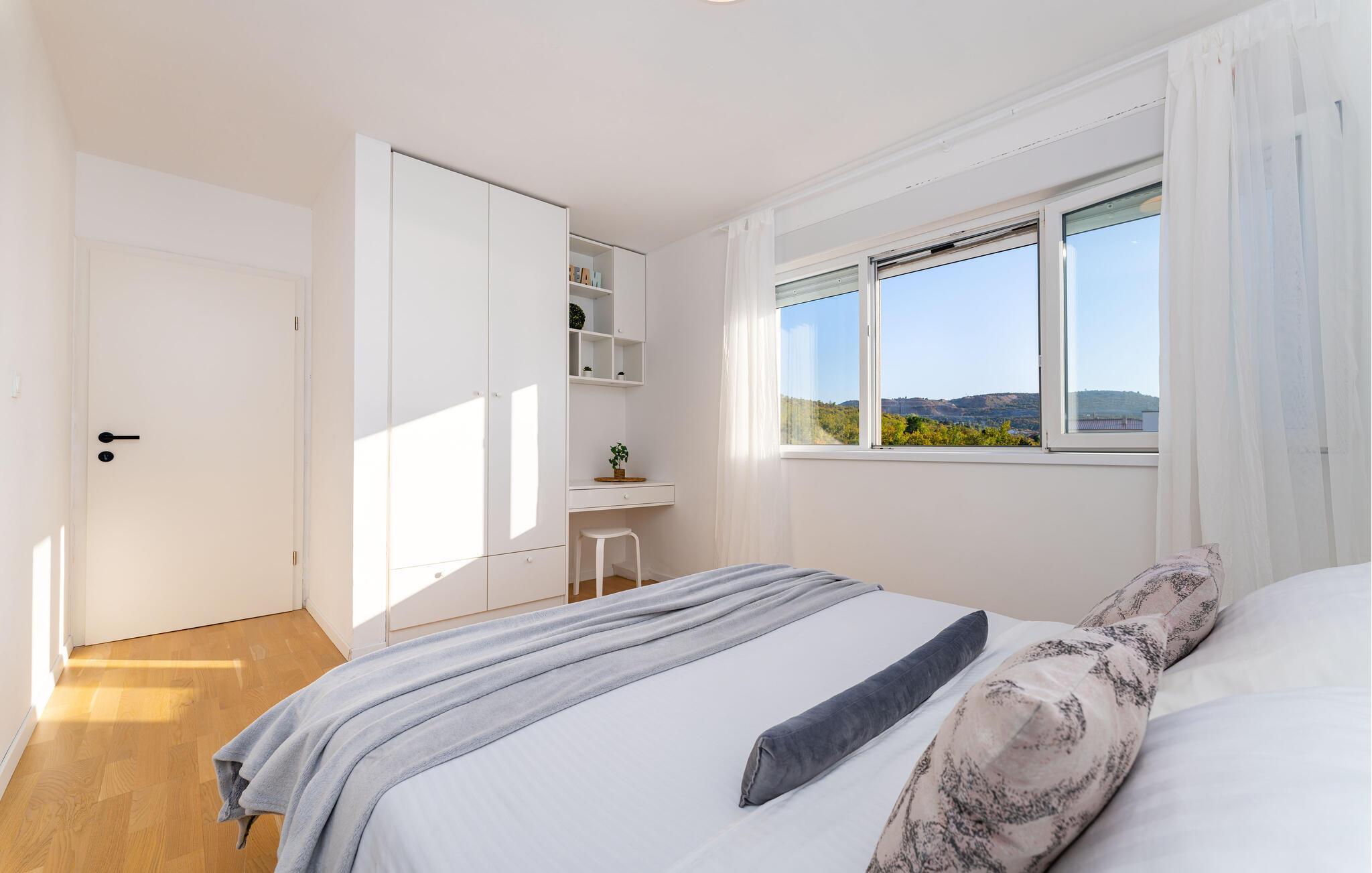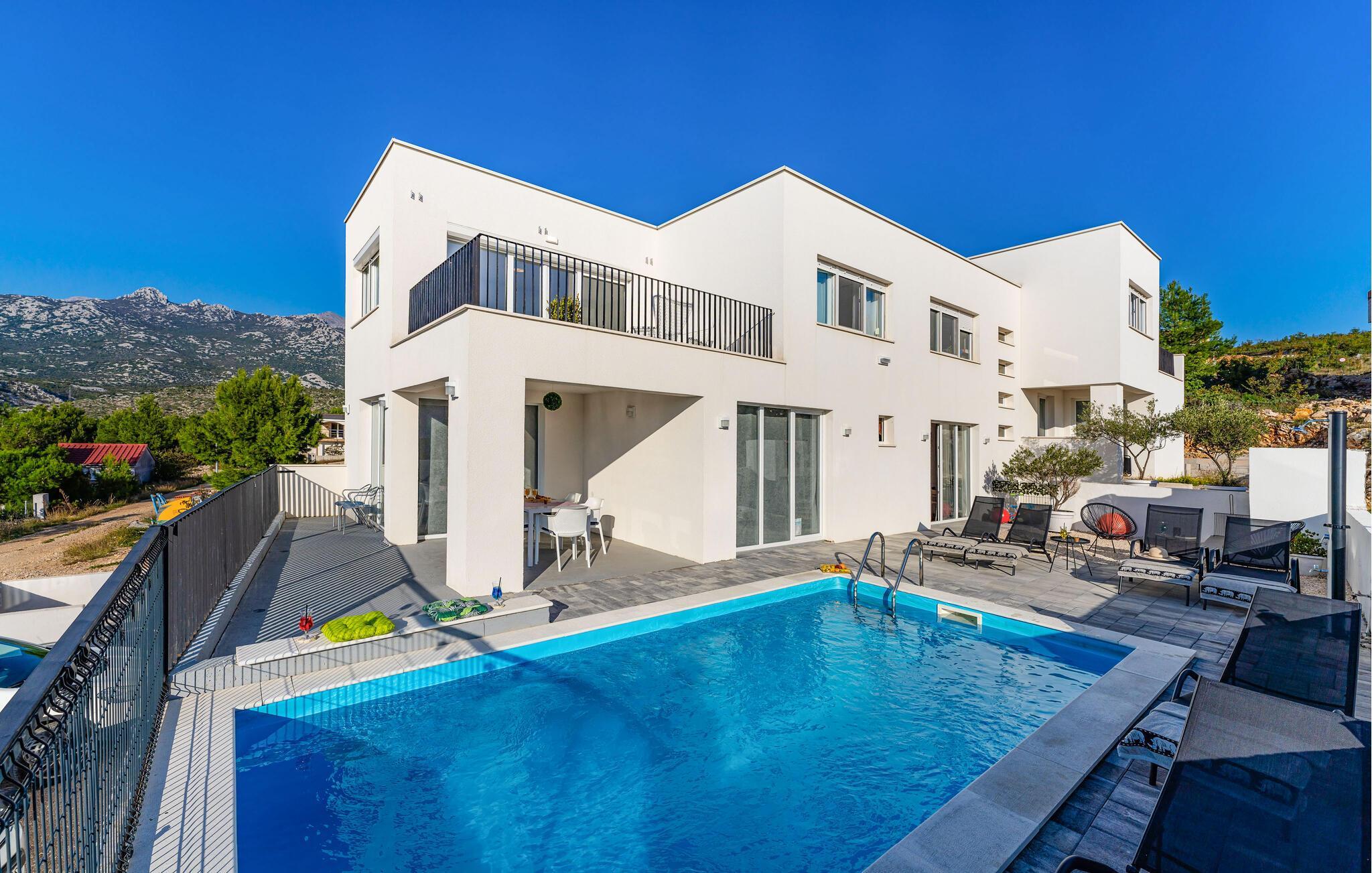 Denne stilfulde villa med to smagfuldt indrettede etager har alt, hvad I behøver for en afslappende familieferie. De lyse rum og den åbne køkkenløsning indbyder til fælles madlavning og hyggelige stunder. I den store stue kan I nyde den rolige atmosfære eller træde direkte ud på den solrige panoramaterrasse, hvor en vidunderlig udsigt over bugten venter. Den nedre terrasse med overdækket siddeplads og privat pool giver ren afslapning – perfekt til at koble af eller til hyggelige grillaftener under åben himmel.