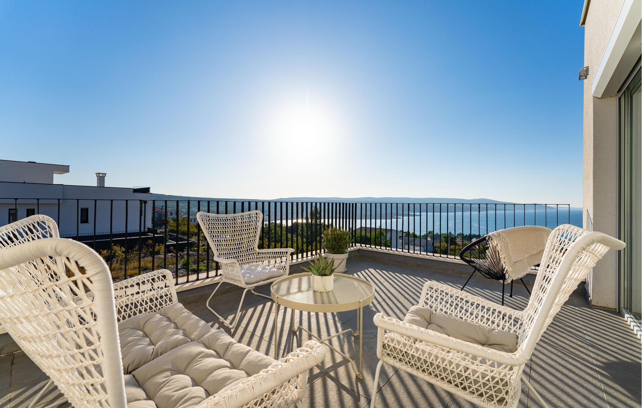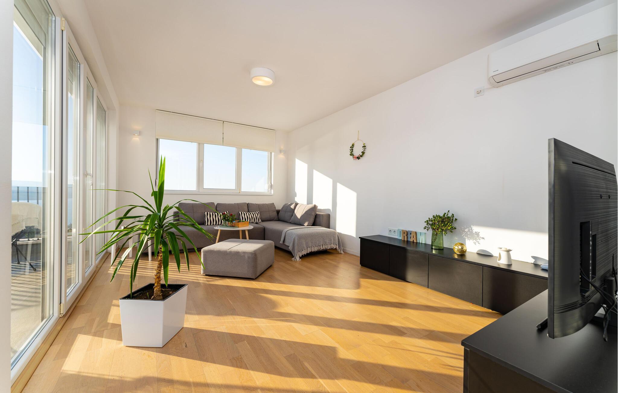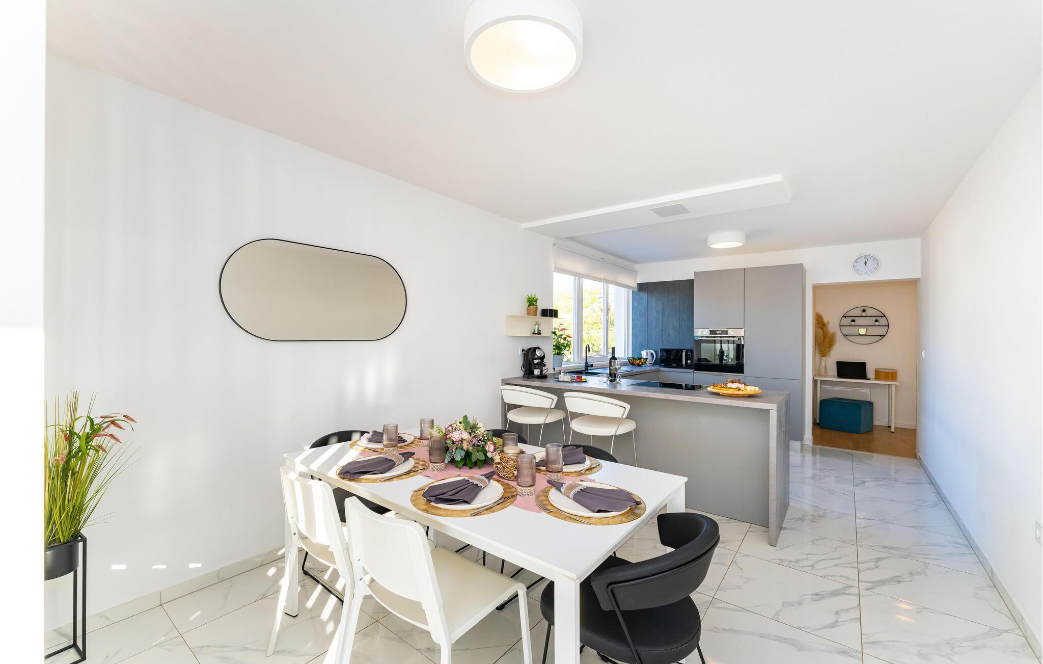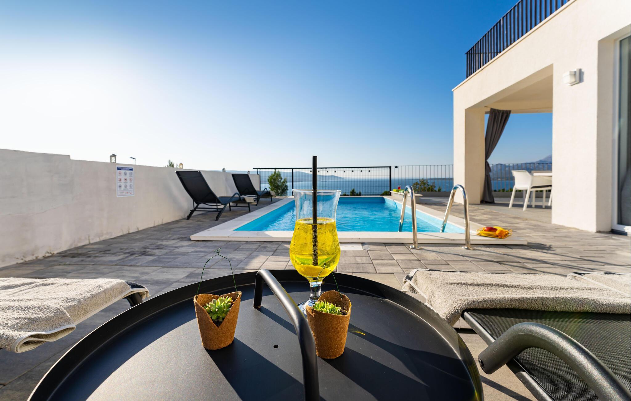 Denne stilfulde villa med to smagfuldt indrettede etager har alt, hvad I behøver for en afslappende familieferie. De lyse rum og den åbne køkkenløsning indbyder til fælles madlavning og hyggelige stunder. I den store stue kan I nyde den rolige atmosfære eller træde direkte ud på den solrige panoramaterrasse, hvor en vidunderlig udsigt over bugten venter. Den nedre terrasse med overdækket siddeplads og privat pool giver ren afslapning – perfekt til at koble af eller til hyggelige grillaftener under åben himmel.