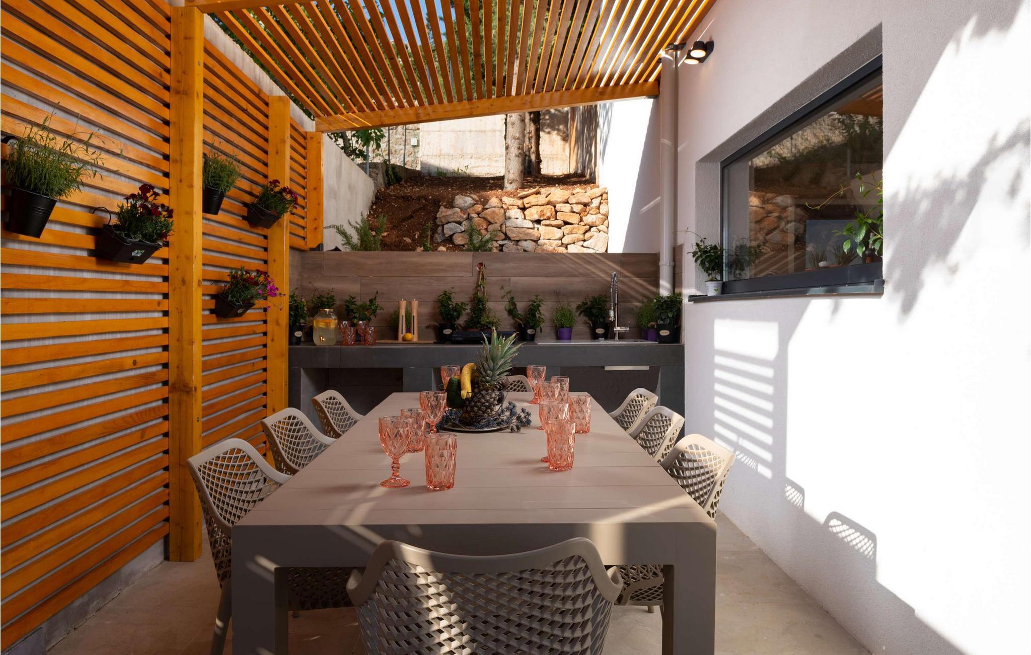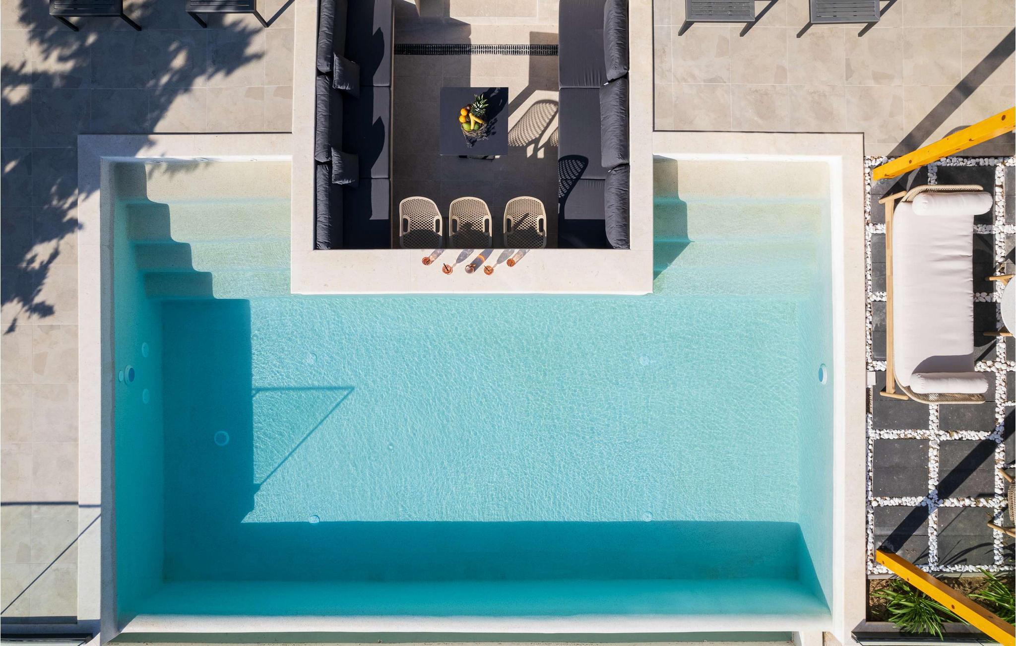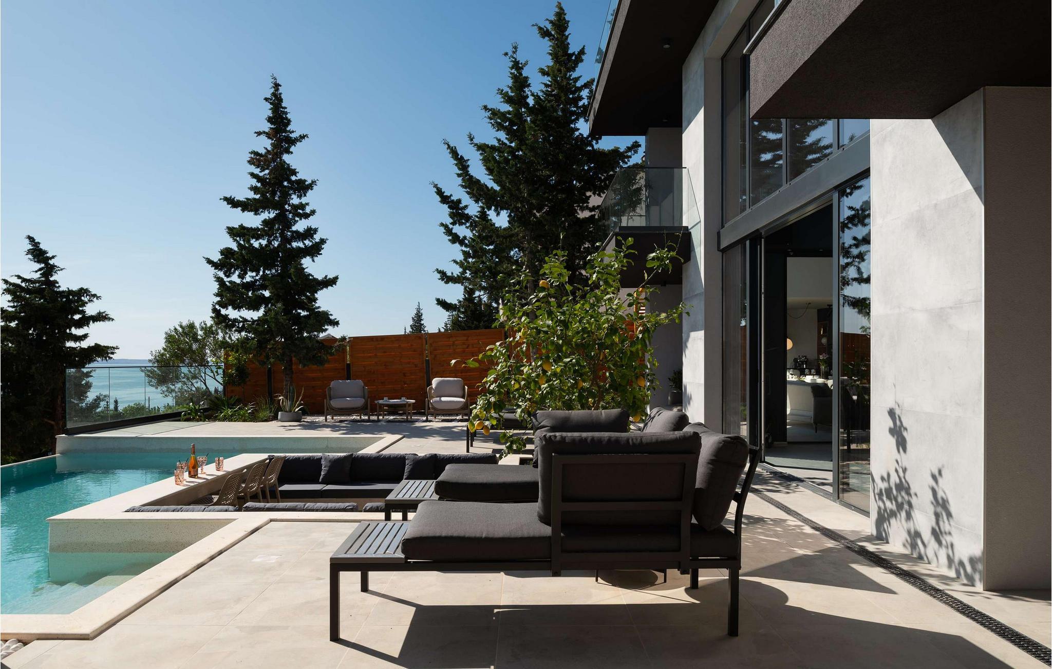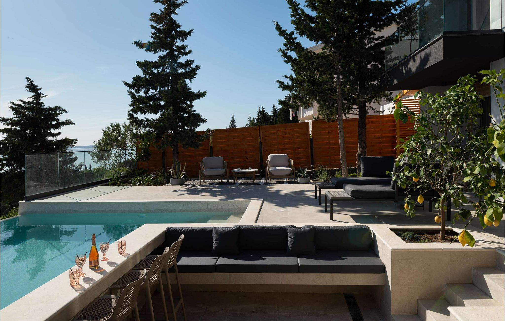 Nyd den storslåede udsigt over Adriaterhavet, mens I svømmer baner i poolen. Slap af på de komfortable liggestole eller træk jer tilbage til det skyggefulde loungeområde. I kan også benytte jer af den udendørs grill og sommerkøkkenet.