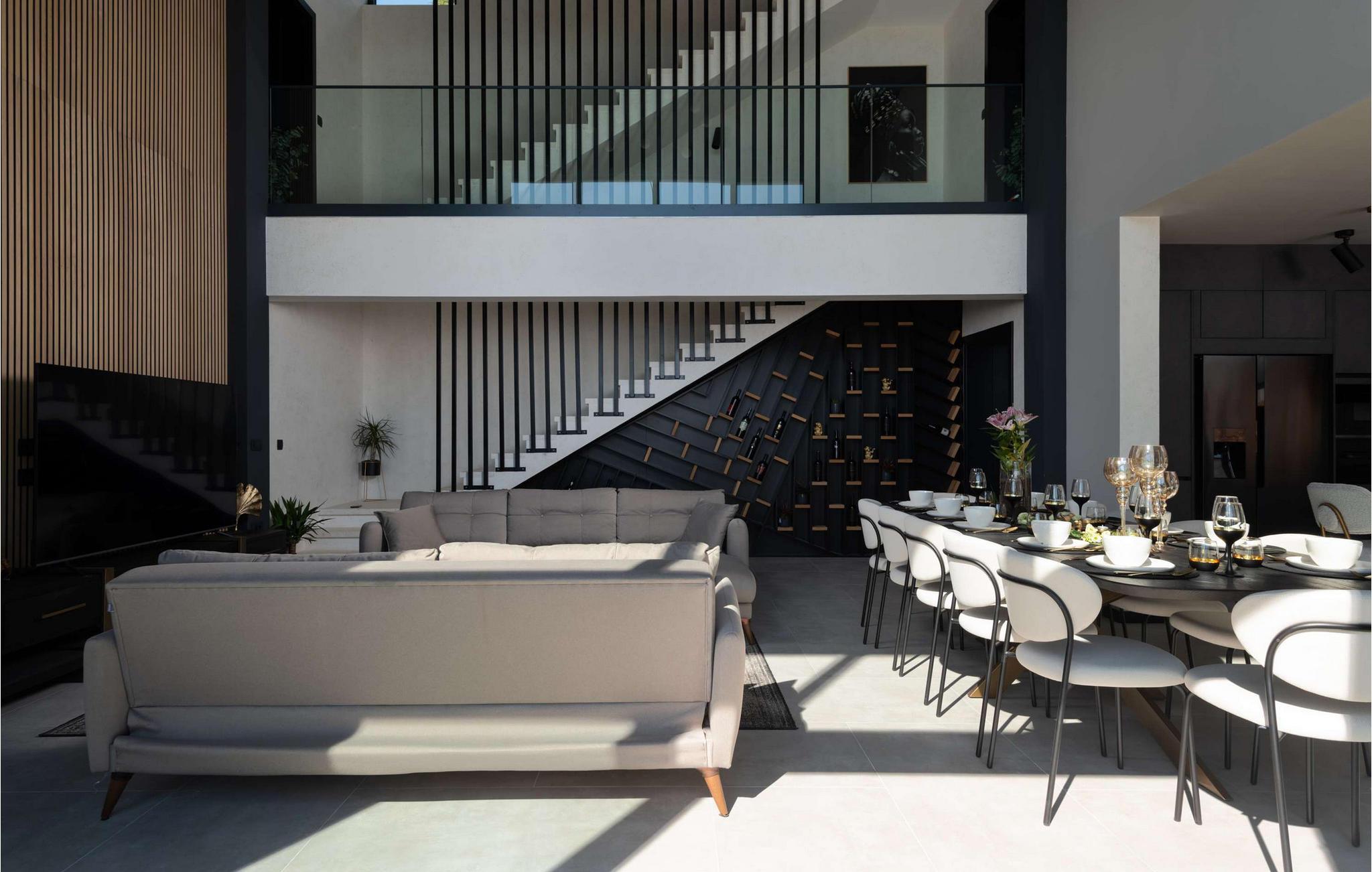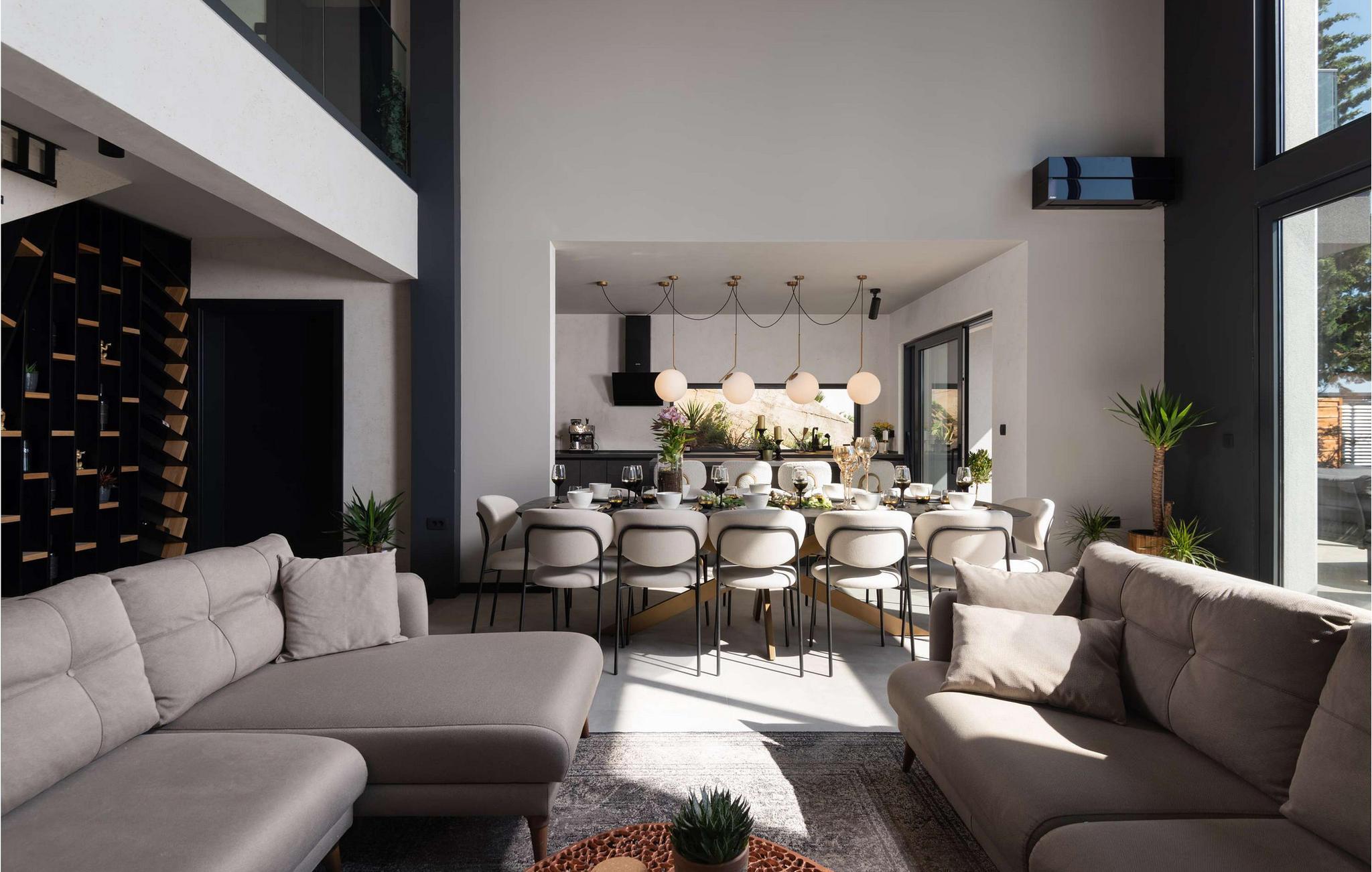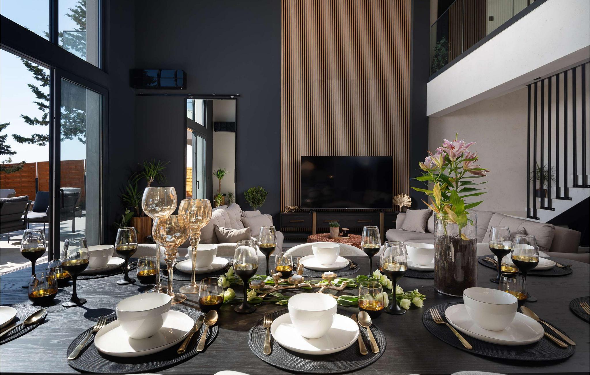 Fra det øjeblik I træder ind, imponerer den rummelige opholdsstue i Villa Beatrice med sin åbne arkitektur, høje vinduer og betagende havudsigt. Elegante materialer, bløde farver og moderne design giver rummet en sofistikeret atmosfære. Uanset om I streamer en god serie, lytter til de seneste hits eller blot nyder en afslappet snak, vil I hurtigt glide ind i ferietilstand. Tilbring aftener sammen i den stilfulde spisestue, tilbered måltider og nyd en god flaske vin.