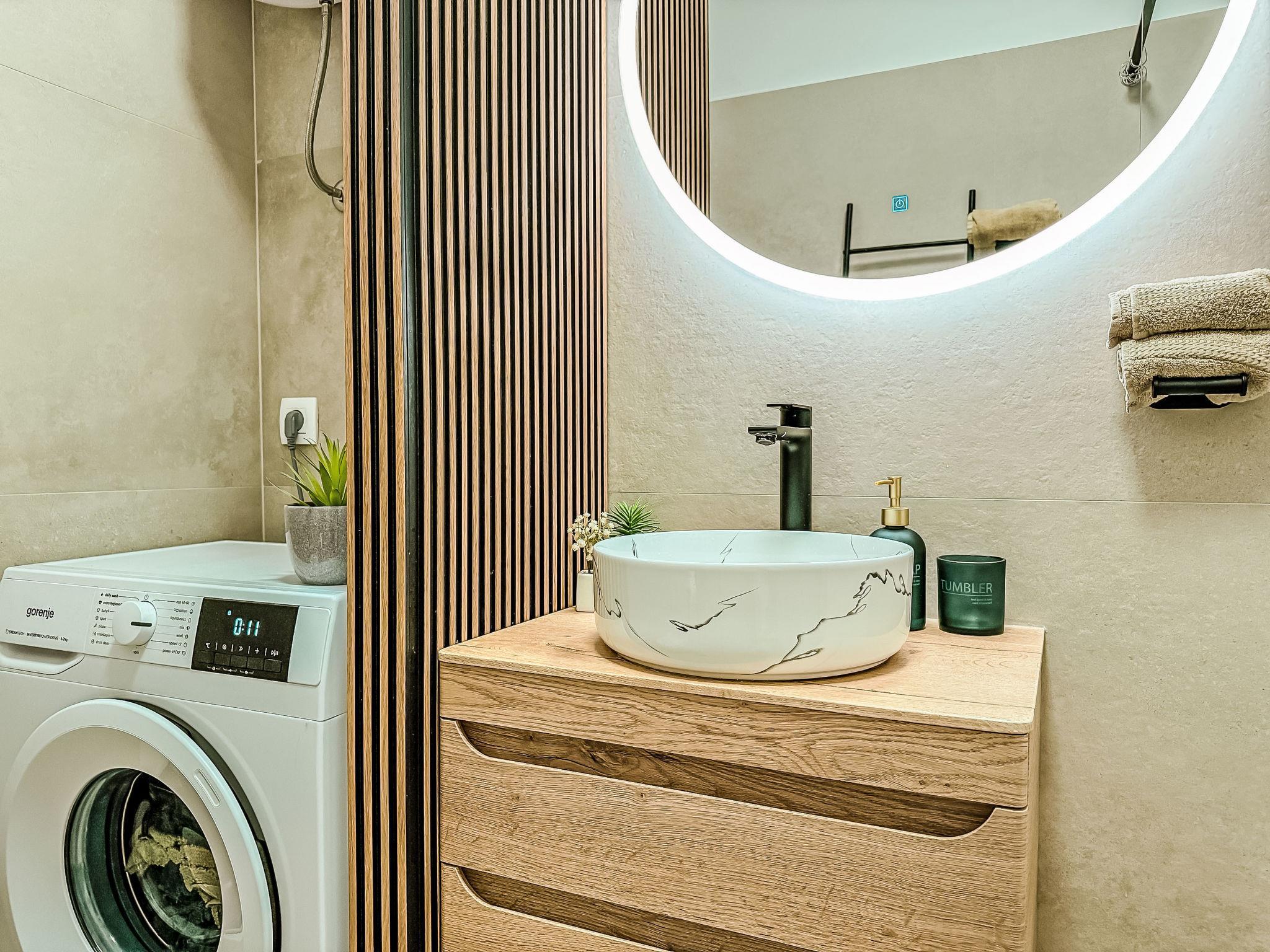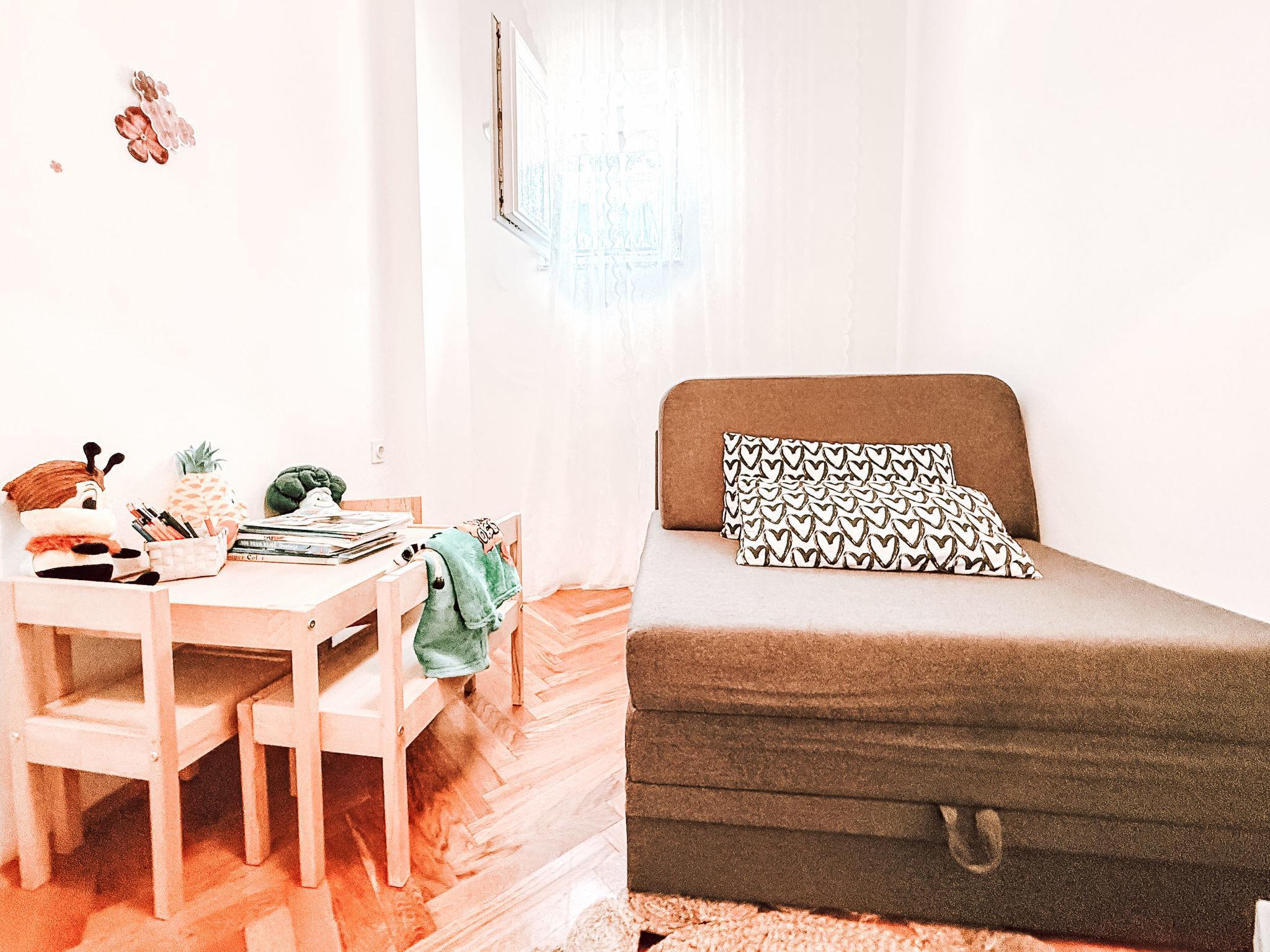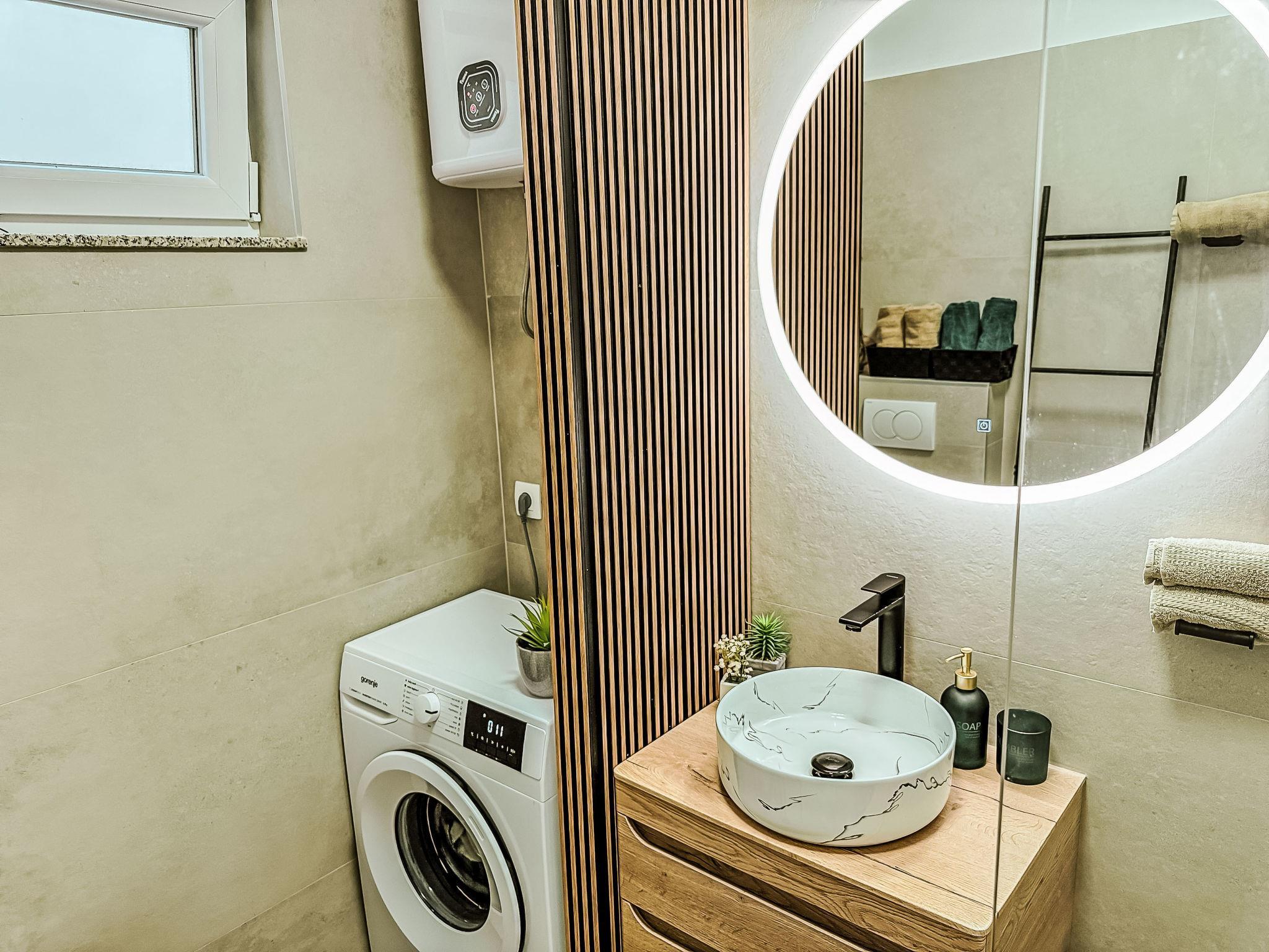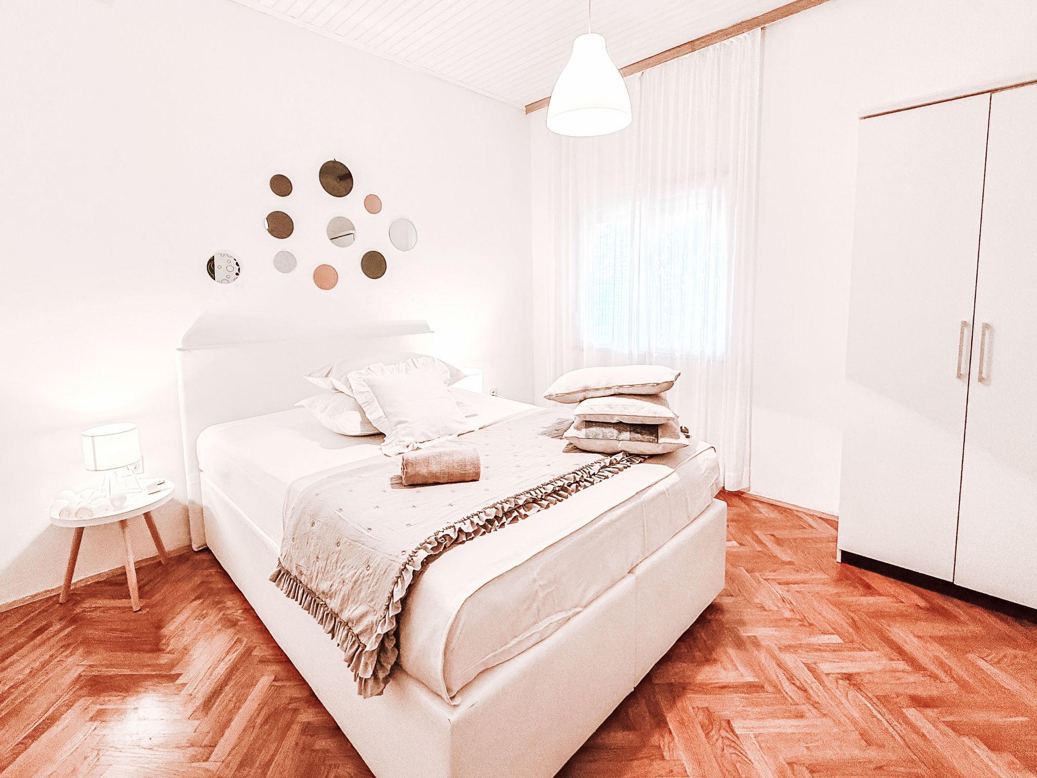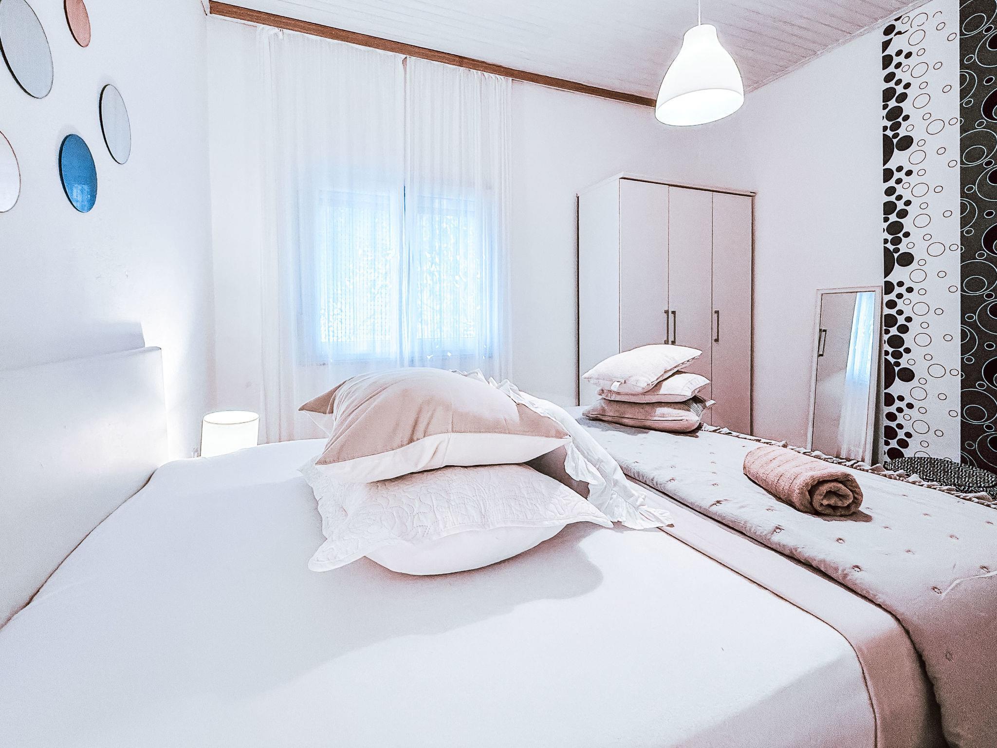 4-room house 100 m2. Living/dining room with satellite TV. Entrance hall with air conditioning. 1 room with 1 bed (90 cm, length 200 cm). 1 room with 1 french bed (160 cm, length 200 cm). Exit to the balcony. 1 room with 1 double bed (2 x 90 cm, length 200 cm). Open kitchen (oven, dishwasher, 4 ceramic glass hob hotplates, toaster, kettle, microwave, freezer, electric coffee machine). Shower/WC. No heating option. Balcony. Balcony furniture, deck chairs (2). Facilities: washing machine, baby cot. Internet (WiFi, free). Please note: non-smoking house.