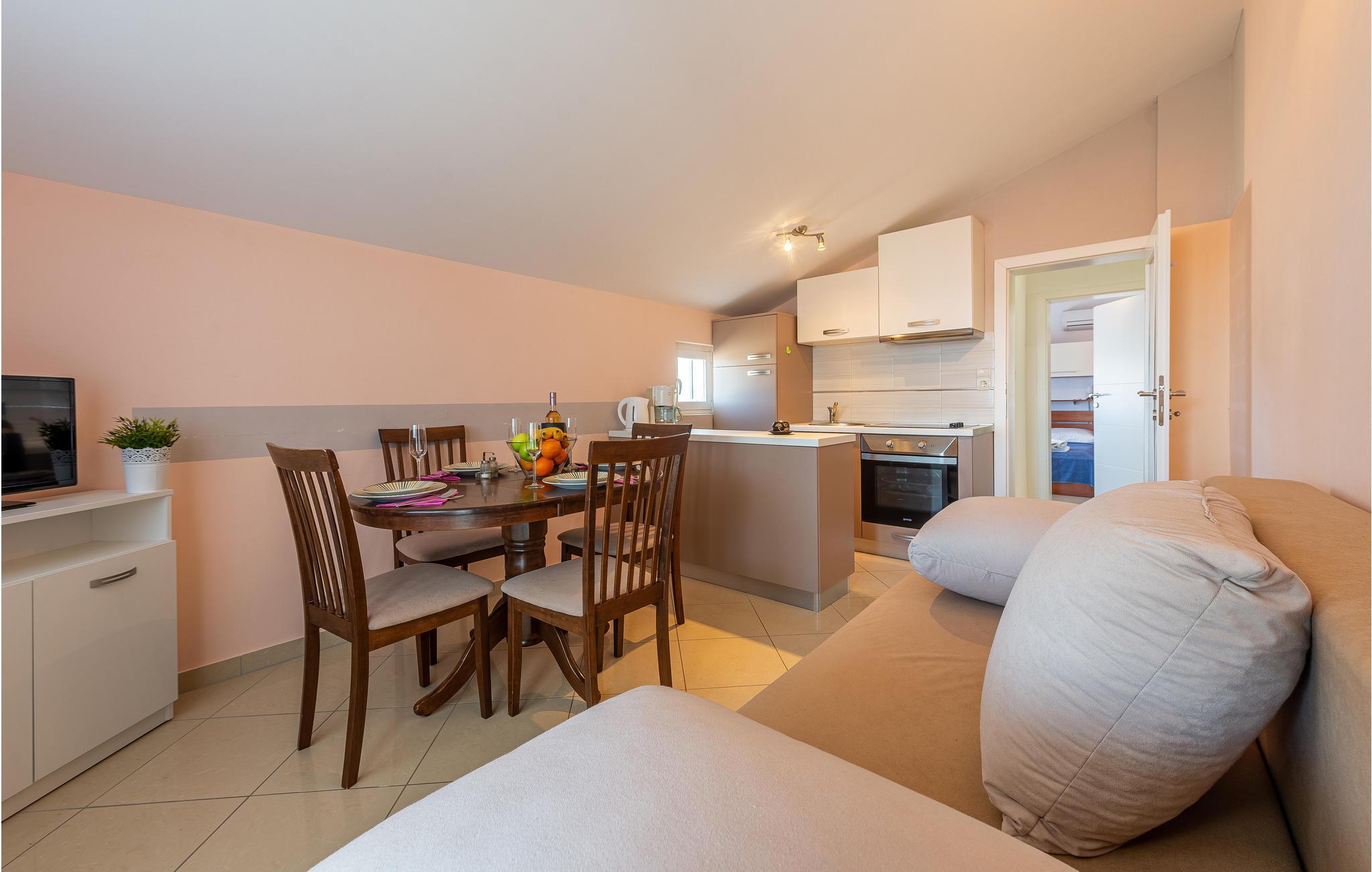 Etværelseslejligheden ligger i et hus med seks lejligheder. Den ligger på anden sal og har en vidunderlig havudsigt og er ideel til fire personer. Der er et soveværelse med en dobbeltseng og yderligere to senge i stuen med åbent køkken. Lejligheden kan bookes på alle tider af året, og det havsnære område er dejligt uanset sæson.