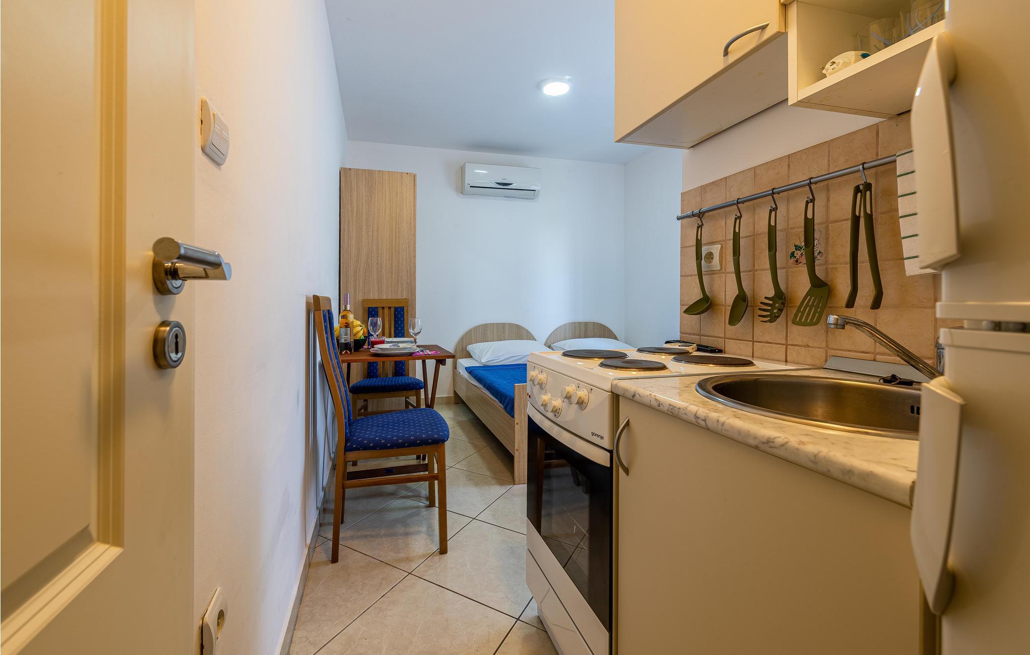 Etværelseslejligheden ligger i et hus med seks lejligheder. Den ligger på første sal og har to senge i stuen med åbent køkken. Lejligheden kan bookes på alle tider af året, og det havsnære område er dejligt uanset sæson. I kommer til terrassen via gangen.