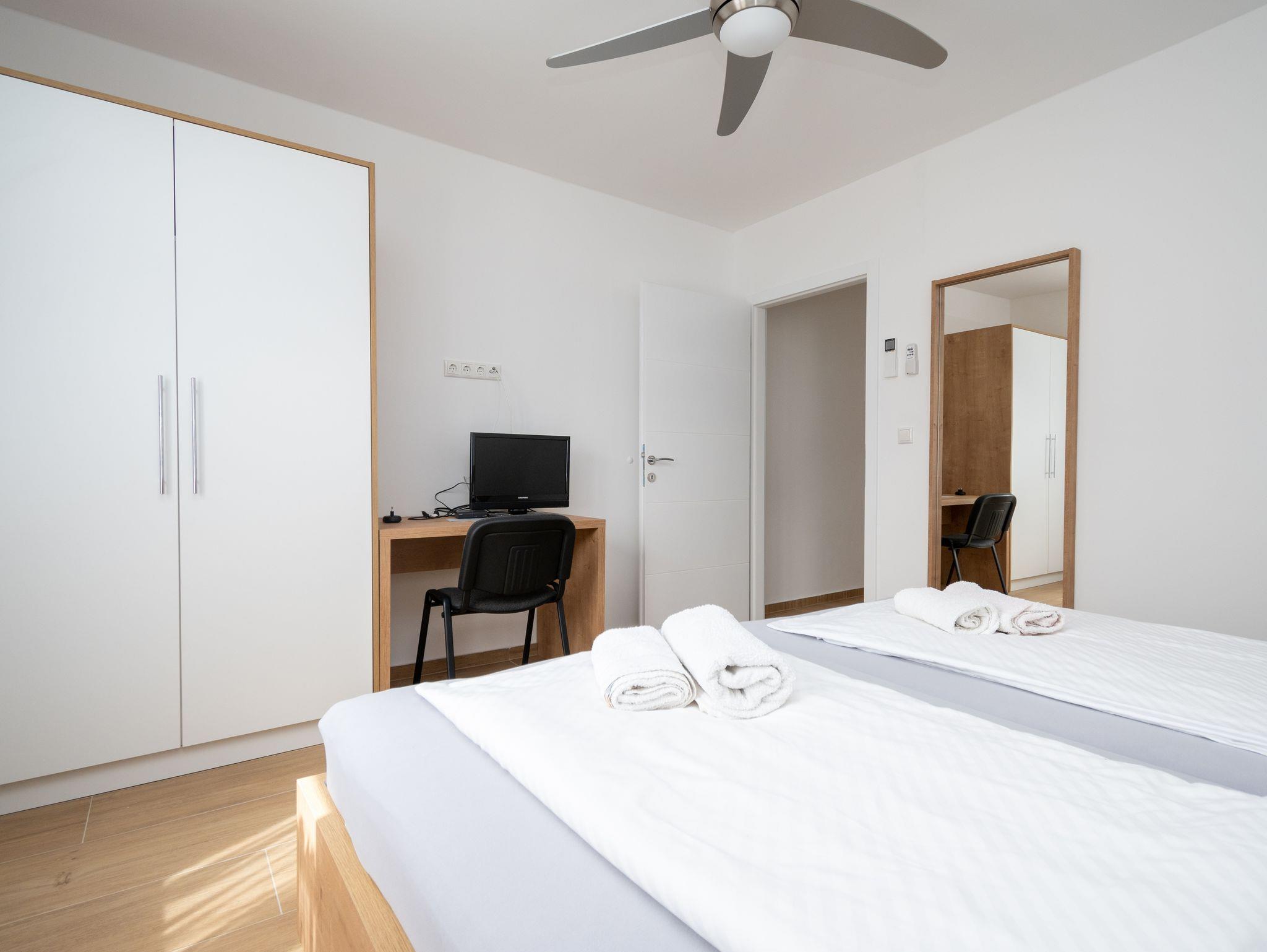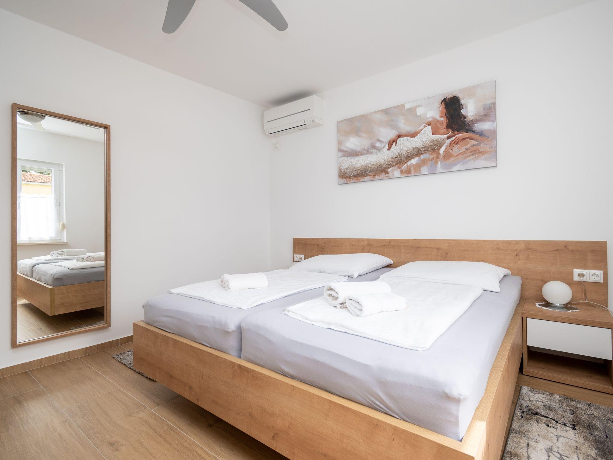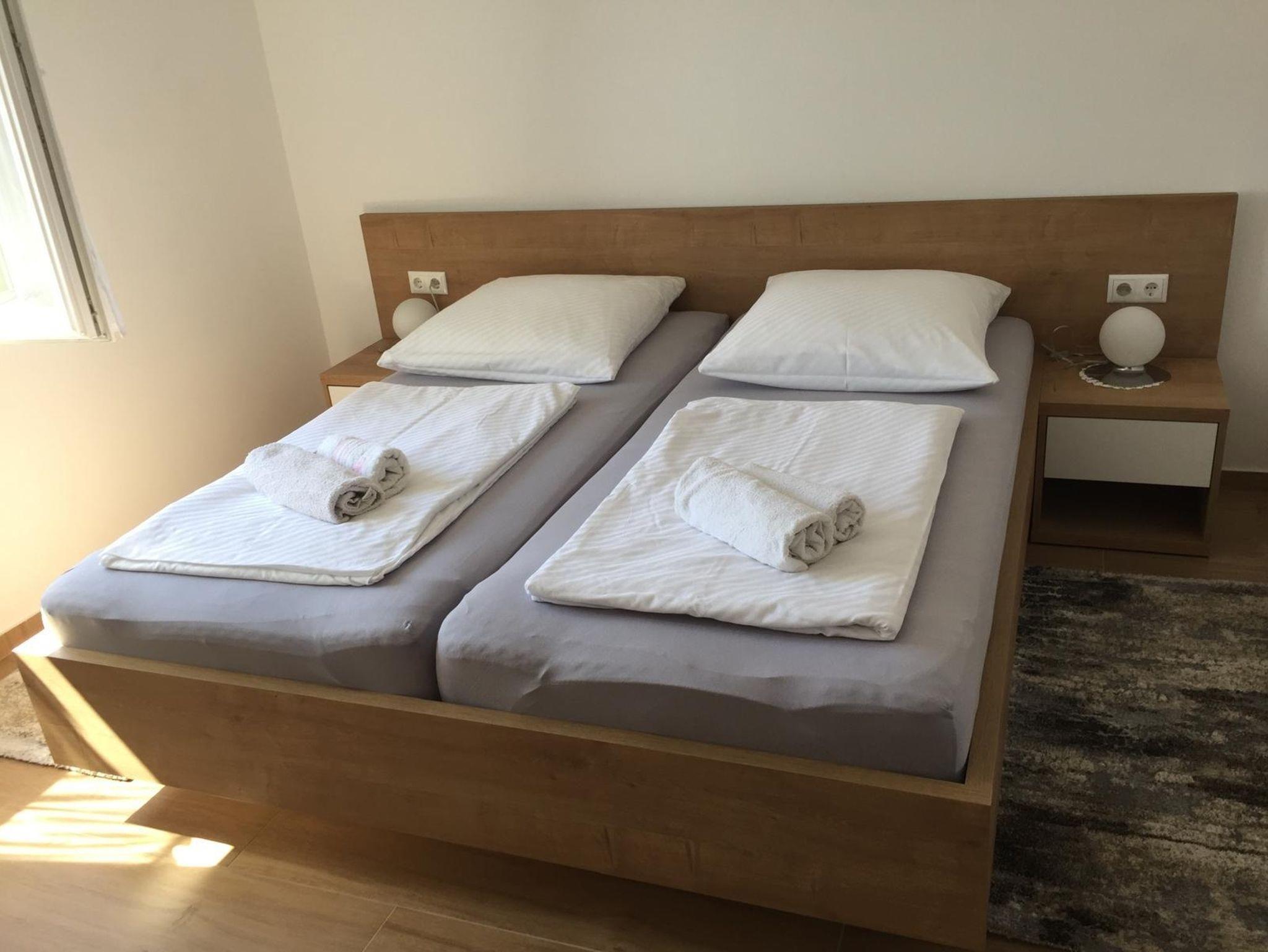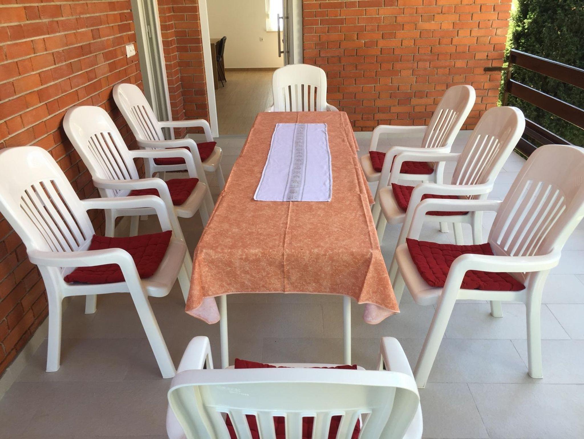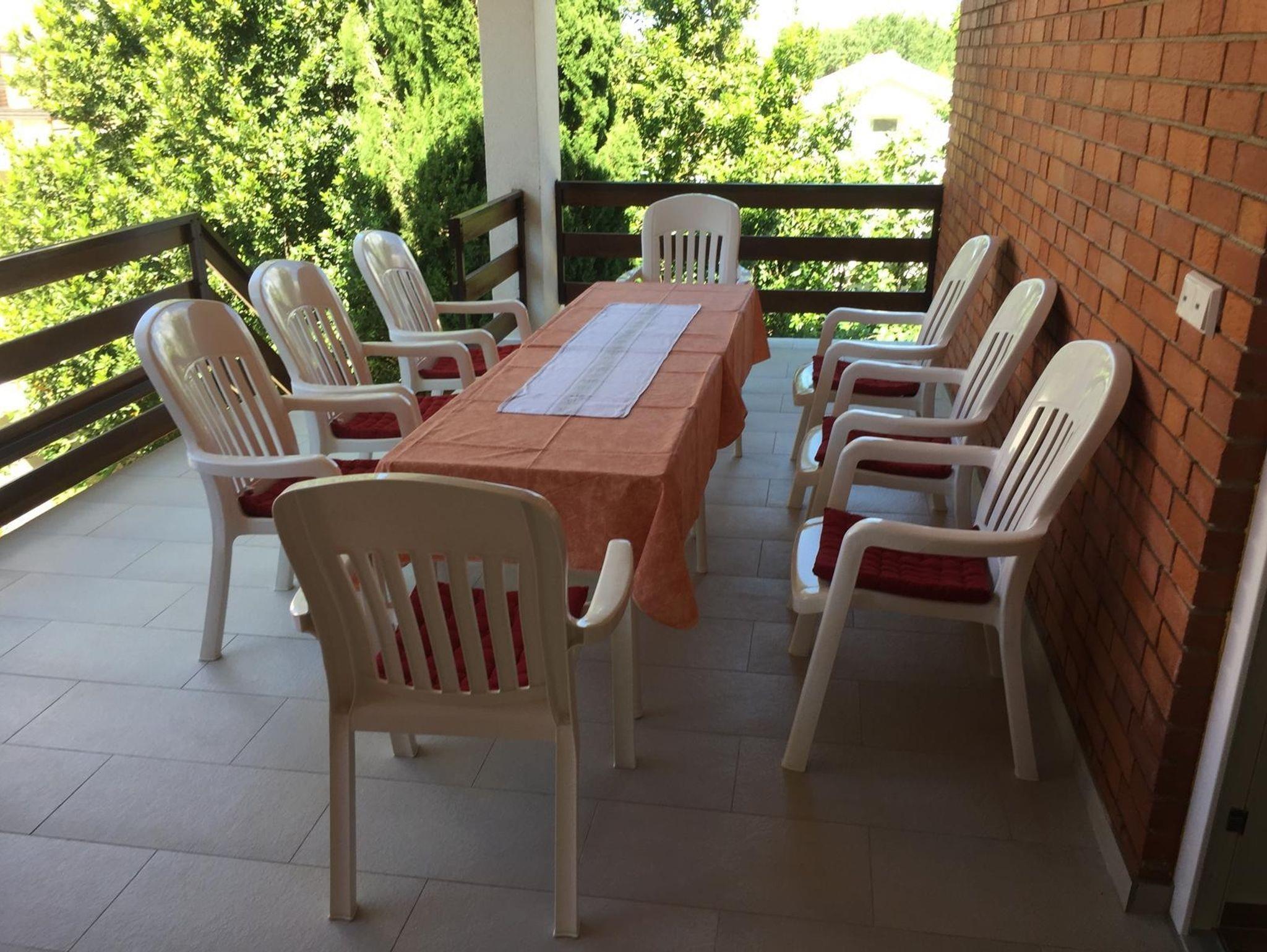 Ferienwohnung bietet Platz für 5 Gäste. Die Betten sind in Schlafzimmern, die es 2 gibt, und in Wohnzimmer, innerhalb einer Gesamtfläche von 65m2, angeordnet. Die Gäste haben eine eigene Terrasse zur Verfügung, auf der sie in warmen Sommernächten genießen können. Es ist erlaubt, Speisen auf dem Gemeinschafts-Grill vorzubereiten. IM PREIS INBEGRIFFEN: Kurtaxe, Endreinigung, Klimatisierung, Parkplatz, Internet, Kinderbett, tragbarer Grill. VERBINDLICHE ZUSÄTZLICHE KOSTEN: Aufzahlung für Kurzaufenthalte (prozentualer Zuschlag pro Nächtigungsanzahl: 30% - 1, 20% - 2, 10% - 3). UNVERBINDLICHE ZUSÄTZLICHE KOSTEN: Wäschewaschen (5,00 € Waschen). Die Verfügbarkeit zusätzlicher Dienstleistungen in Ihrem reservierten Termin und die Preise derselben (falls nicht aufgeführt) müssen im Voraus überprüft werden. Zusätzliche Dienstleistungen die in der Zahlungsaufforderung nicht aufgeführt sind werden direkt beim Vermieter bezahlt, angenommen der Gast nutzt auch diese.