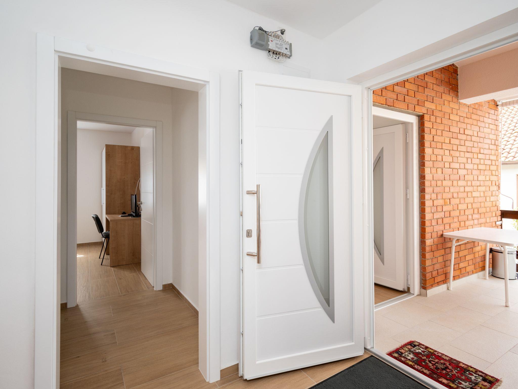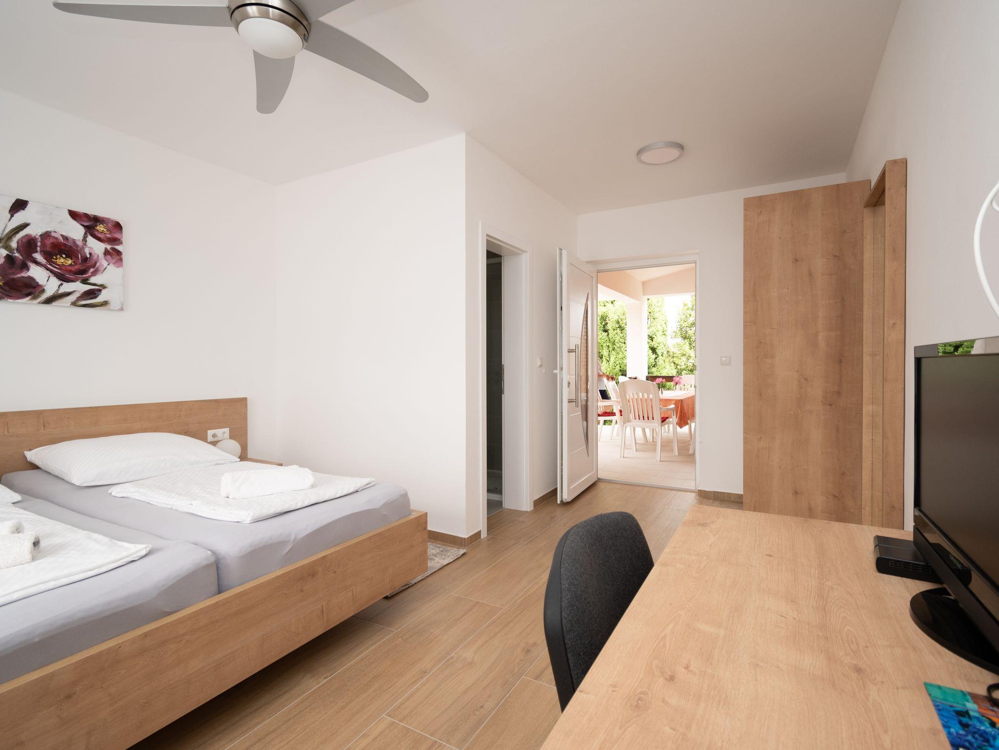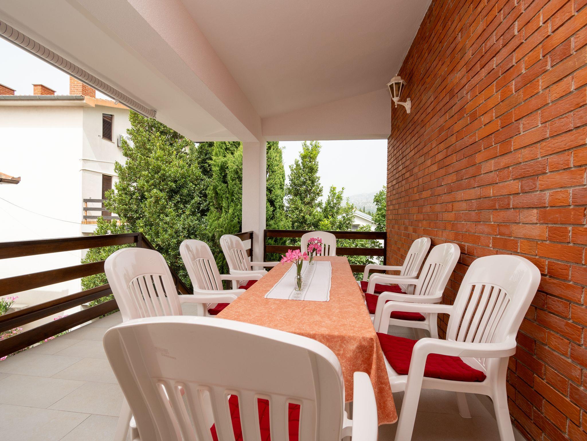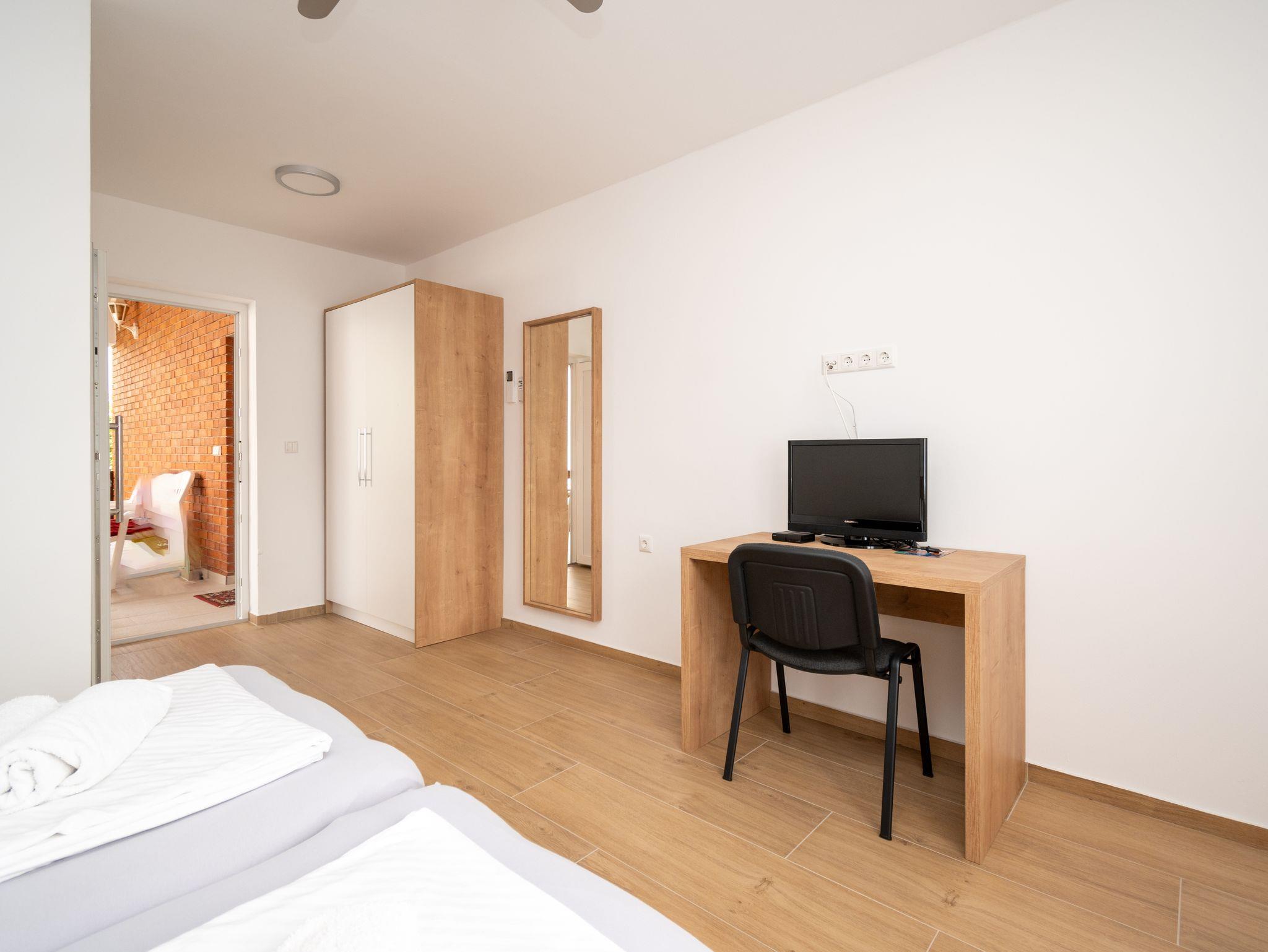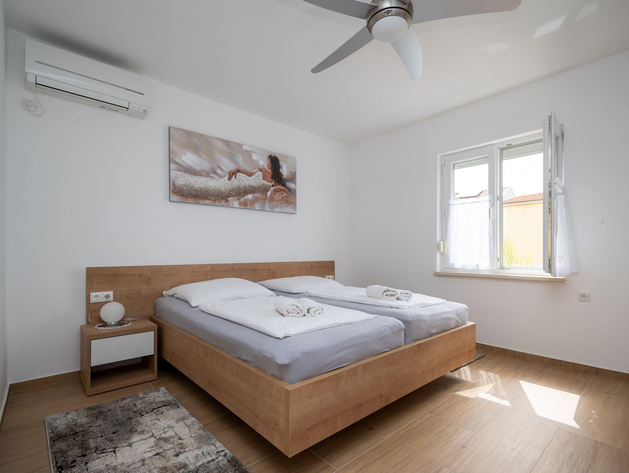 Ferienwohnung bietet Platz für 5 Gäste. Die Betten sind in Schlafzimmern, die es 2 gibt, und in Wohnzimmer, innerhalb einer Gesamtfläche von 65m2, angeordnet. Die Gäste haben eine eigene Terrasse zur Verfügung, auf der sie in warmen Sommernächten genießen können. Es ist erlaubt, Speisen auf dem Gemeinschafts-Grill vorzubereiten. IM PREIS INBEGRIFFEN: Kurtaxe, Endreinigung, Klimatisierung, Parkplatz, Internet, Kinderbett, tragbarer Grill. VERBINDLICHE ZUSÄTZLICHE KOSTEN: Aufzahlung für Kurzaufenthalte (prozentualer Zuschlag pro Nächtigungsanzahl: 30% - 1, 20% - 2, 10% - 3). UNVERBINDLICHE ZUSÄTZLICHE KOSTEN: Wäschewaschen (5,00 € Waschen). Die Verfügbarkeit zusätzlicher Dienstleistungen in Ihrem reservierten Termin und die Preise derselben (falls nicht aufgeführt) müssen im Voraus überprüft werden. Zusätzliche Dienstleistungen die in der Zahlungsaufforderung nicht aufgeführt sind werden direkt beim Vermieter bezahlt, angenommen der Gast nutzt auch diese.